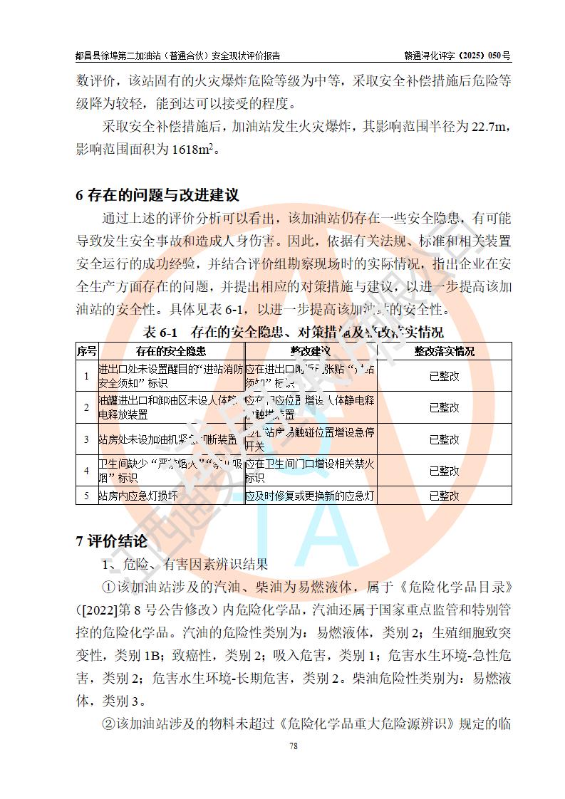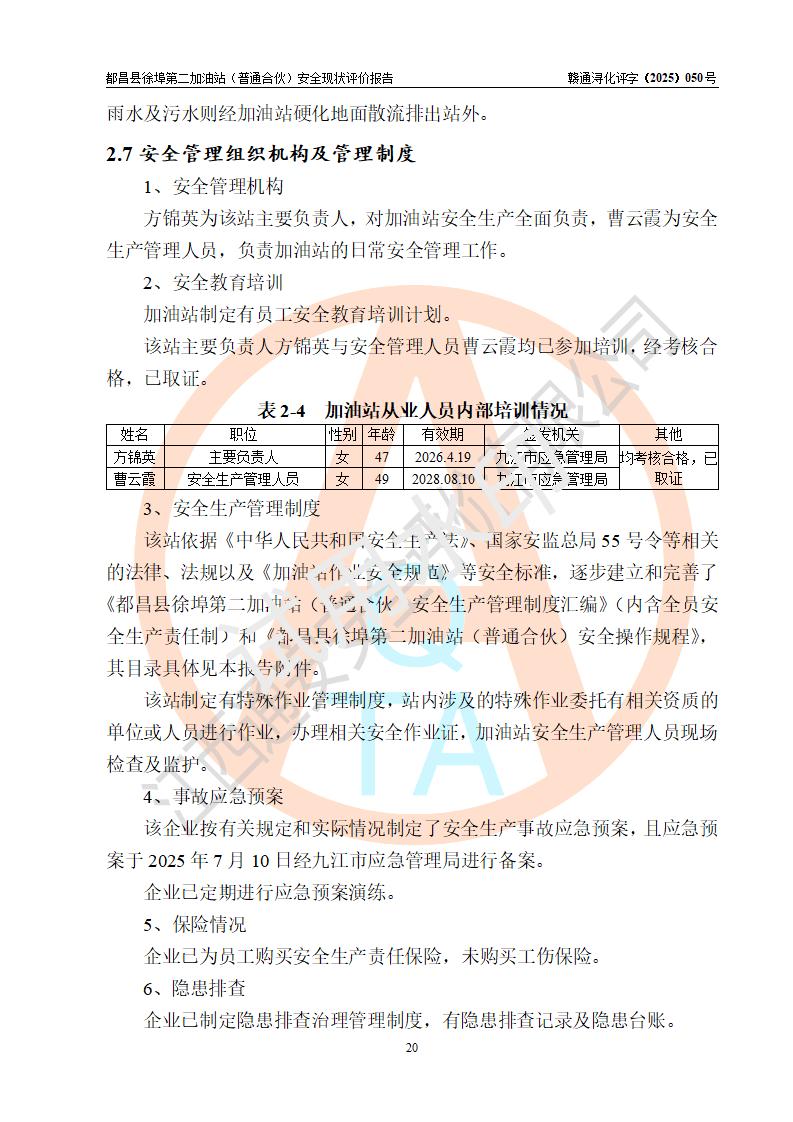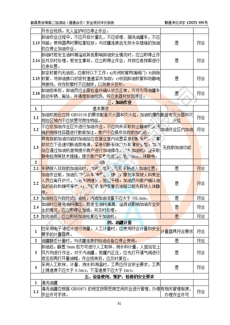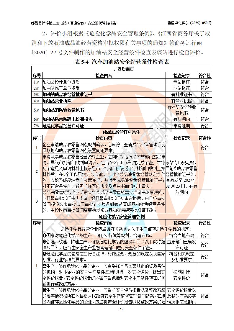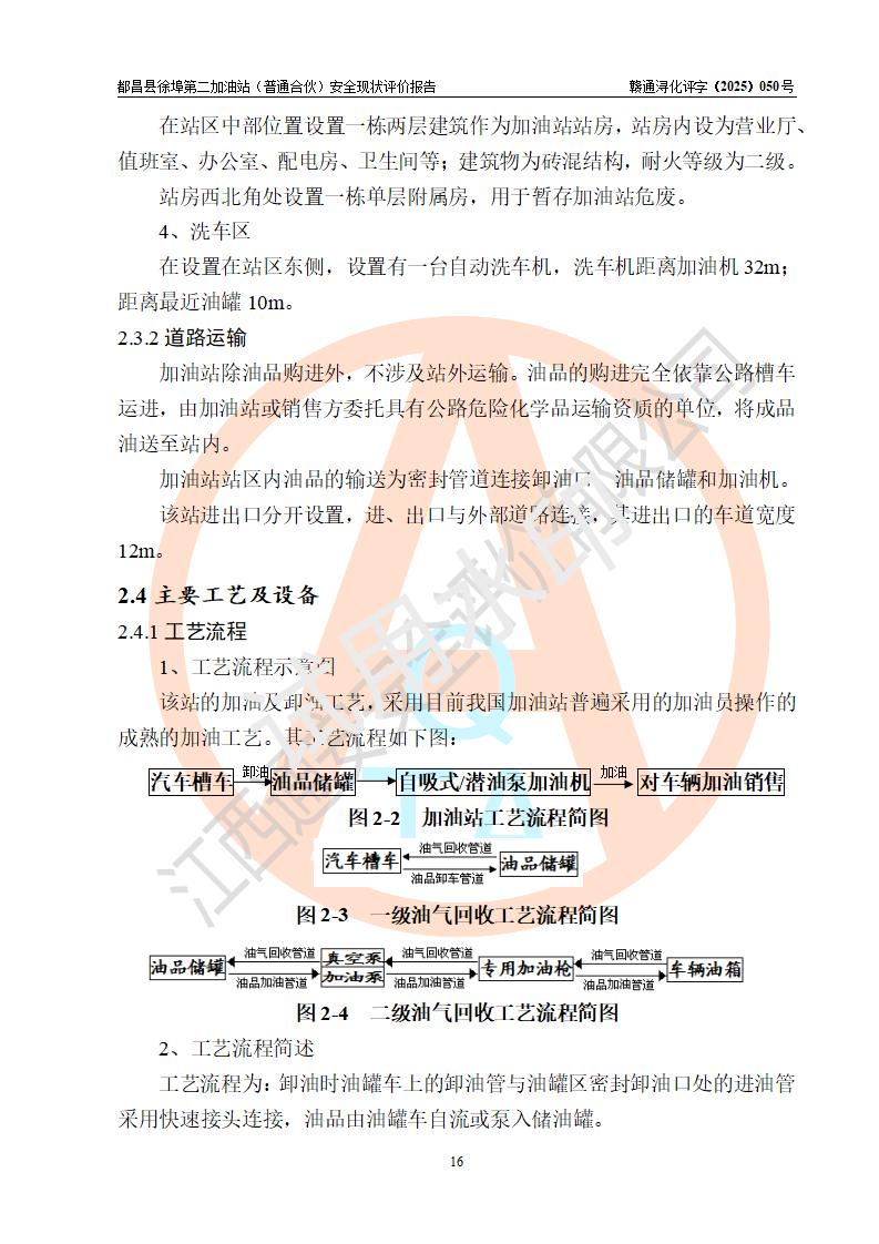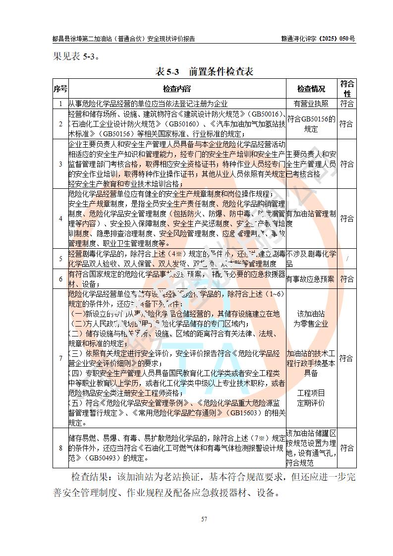 都昌縣徐埠第二加油站(普通合伙)是一家專門從事成品油零售經(jīng)營的普通合伙企業(yè),執(zhí)行事務合伙人:曹建平,經(jīng)營場所位于江西省九江市都昌縣徐埠鎮(zhèn)徐埠村委會上街七組。該加油站現(xiàn)有從業(yè)人員6人,其中安全管理人員1人,主要負責人方錦英。 該加油站站區(qū)占地面積2100m2,站區(qū)內(nèi)設(shè)置有3臺雙槍程控燃油加油機、1臺單槍程控燃油加油機及配套的工藝管線、30m3雙層0#柴油儲罐1臺、30m3雙層92#汽油儲罐2臺、30m3雙層95#汽油儲罐1臺,油品儲罐總?cè)莘e為120m3(折算成汽油為105m3)。按現(xiàn)行《汽車加油加氣加氫站技術(shù)標準》對加油站的等級劃分原則,該站屬于二級加油站。 該站由九江市行政審批局換發(fā)《危險化學品經(jīng)營許可證》(證號:贛九行審經(jīng)(甲)字[2022]000171號),**期限2022年10月18日至2025年10月17日。 |