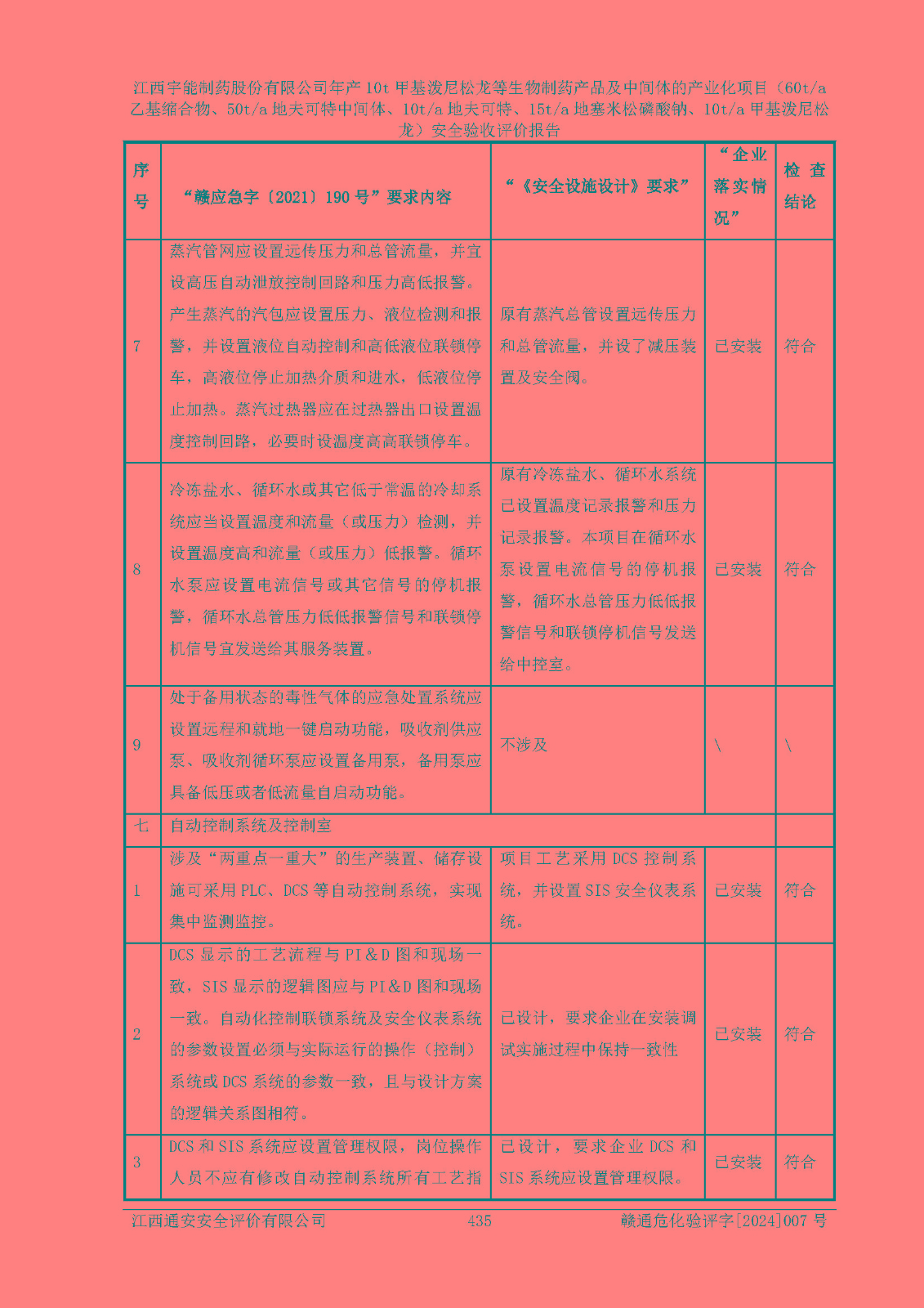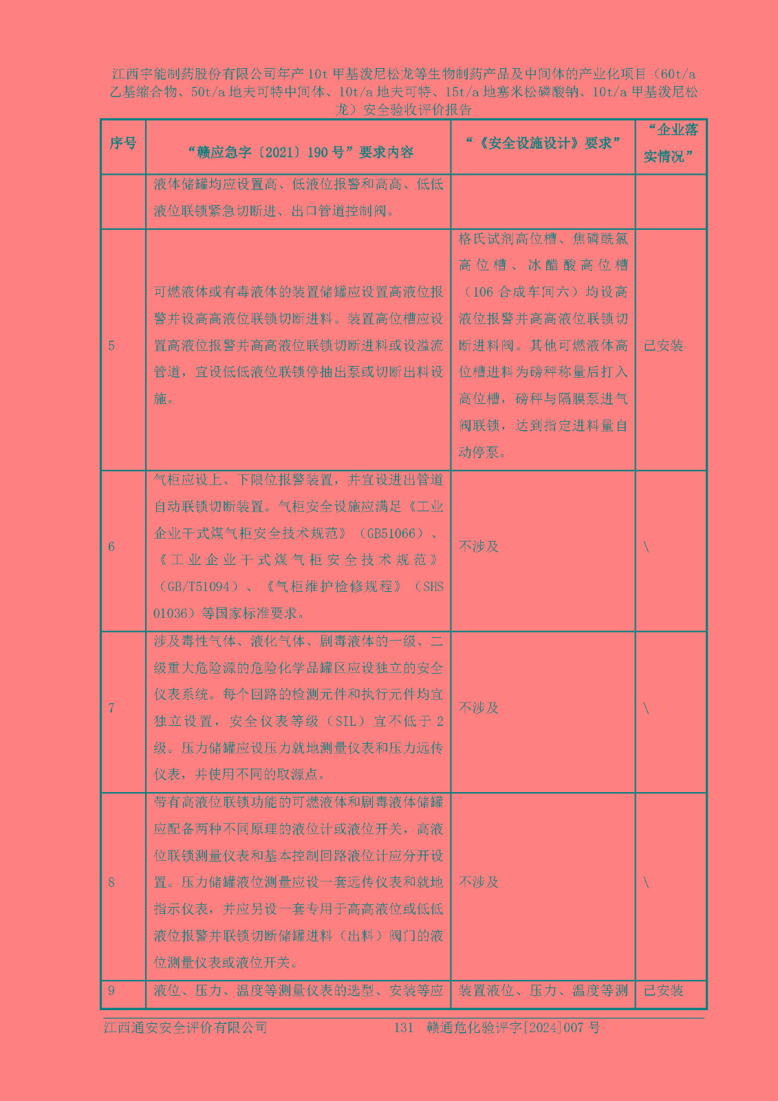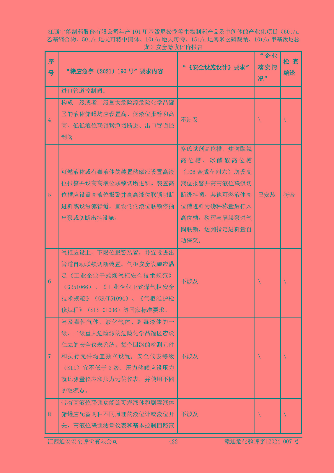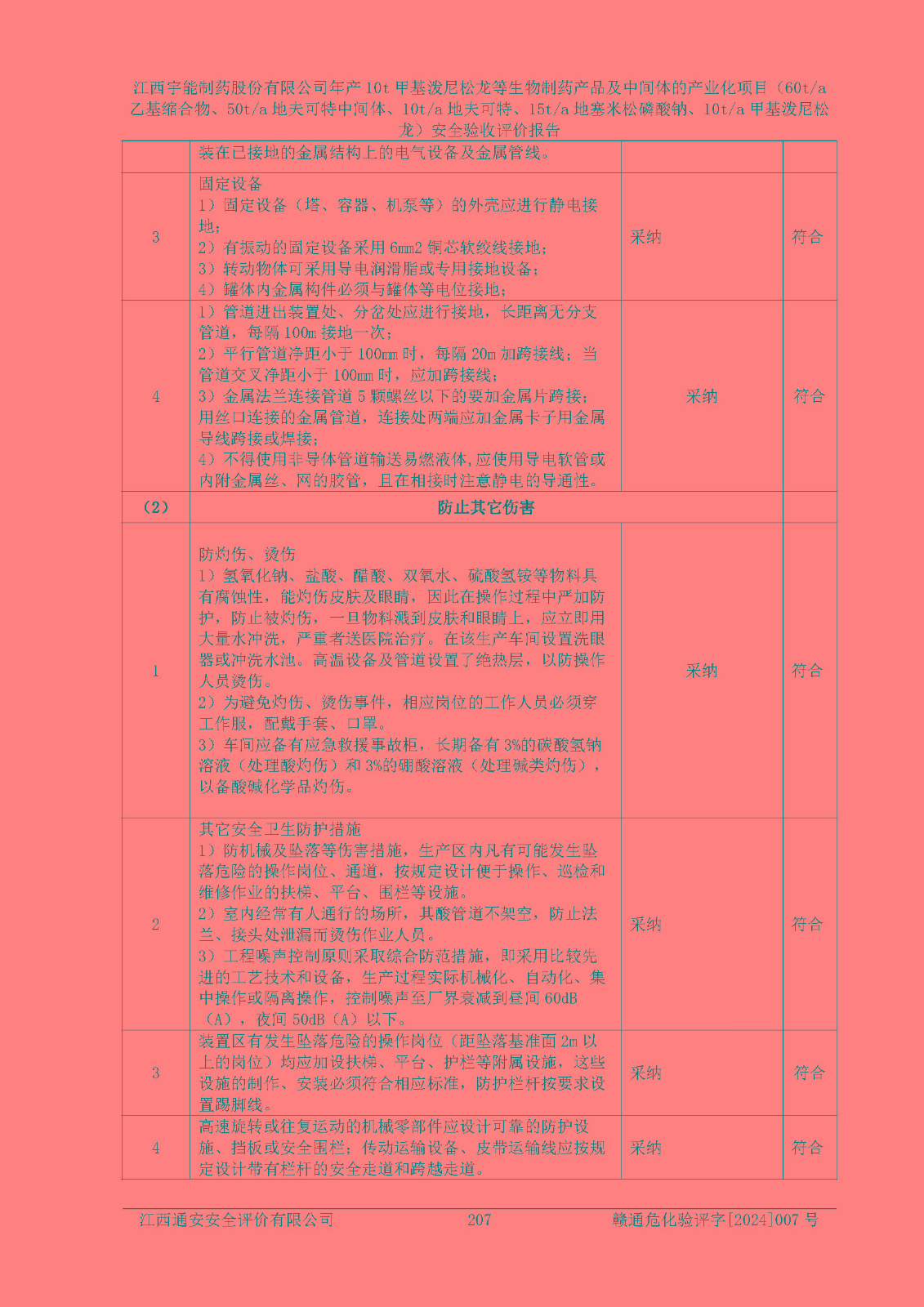 評(píng)價(jià)結(jié)論 | 評(píng)價(jià)結(jié)論:本評(píng)價(jià)認(rèn)為,江西宇能制藥股份有限公司年產(chǎn)10t甲基潑尼松龍等生物制藥產(chǎn)品及中間體的產(chǎn)業(yè)化項(xiàng)目(60t/a乙基縮合物、50t/a地夫可特中間體、10t/a地夫可特、15t/a地塞米松磷酸鈉、10t/a甲基潑尼松龍)工藝設(shè)備和安全設(shè)施運(yùn)行正常,該公司安全管理機(jī)制運(yùn)行正常,安全設(shè)施、措施達(dá)到設(shè)計(jì)要求和預(yù)期結(jié)果,可以滿足建設(shè)項(xiàng)目安全生產(chǎn)的要求,安全生產(chǎn)管理**,符合**有關(guān)安全生產(chǎn)法律、法規(guī)和有關(guān)標(biāo)準(zhǔn)、規(guī)范的要求,工程潛在的危險(xiǎn)、有害因素可得到**控制,風(fēng)險(xiǎn)在**控制和可接受范圍內(nèi)。具備安全設(shè)施竣工驗(yàn)收條件。 | |||