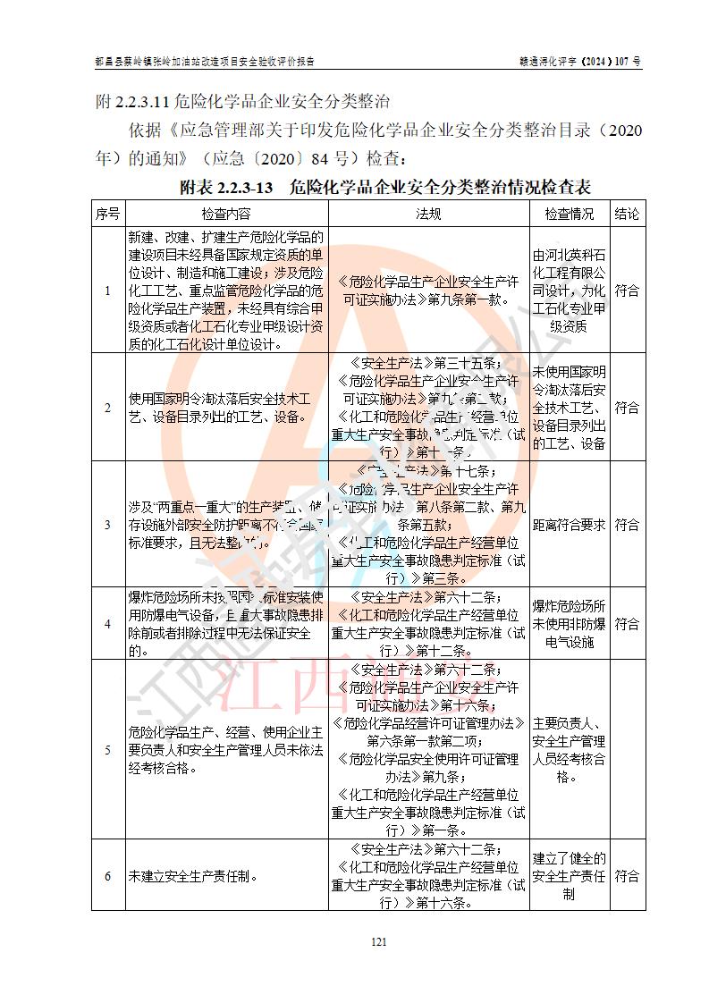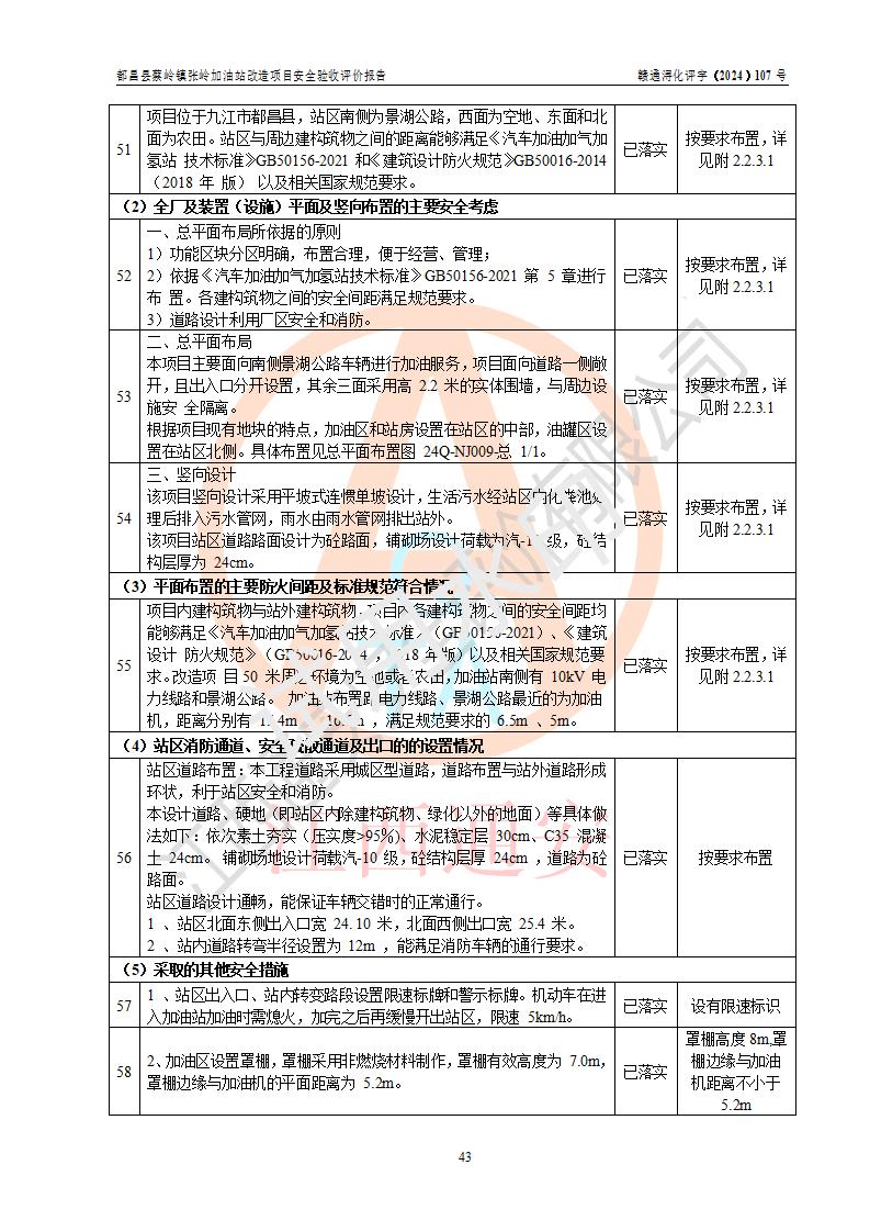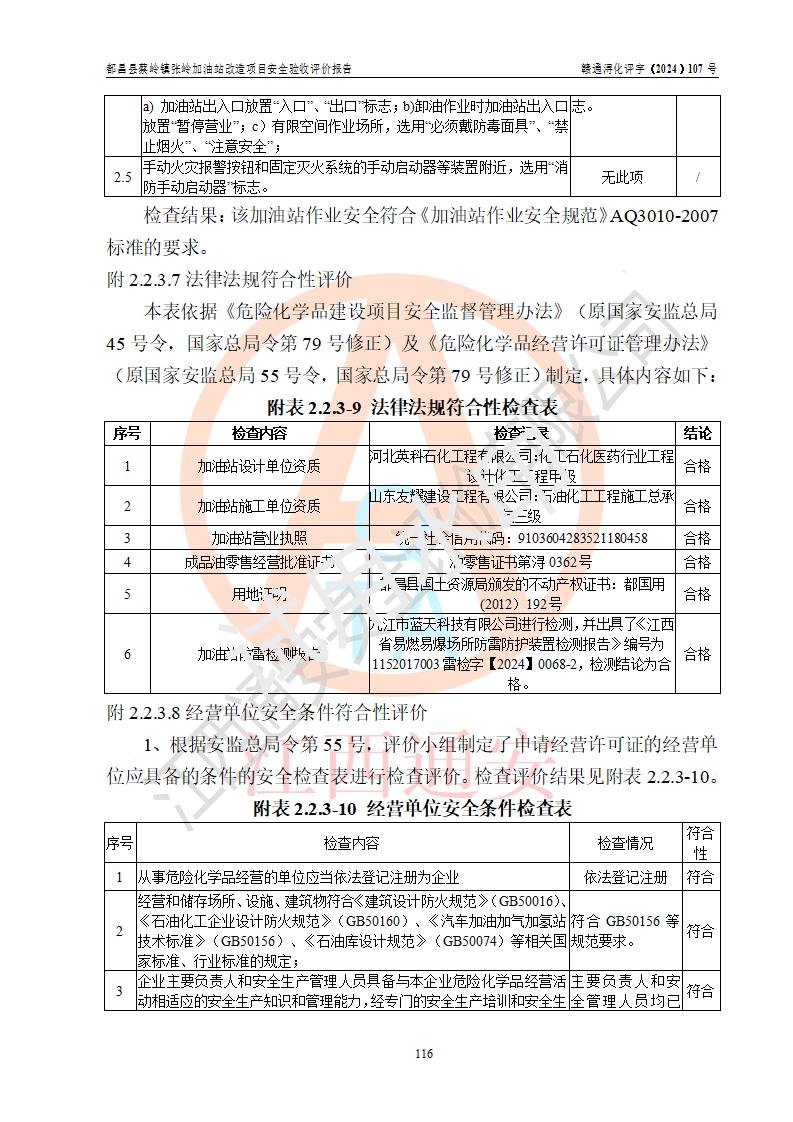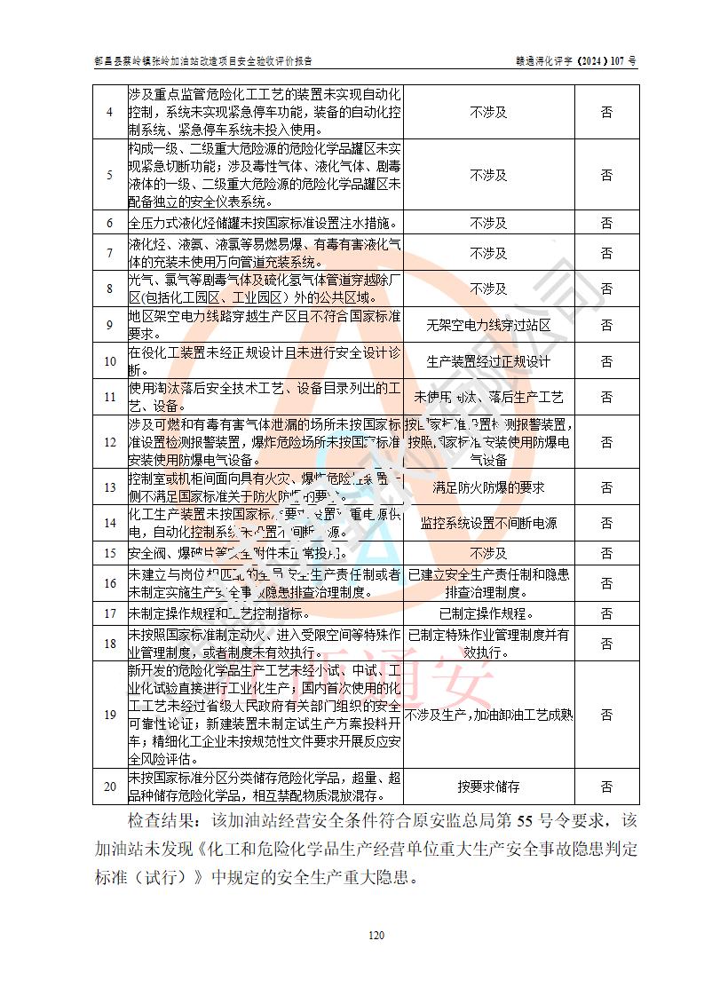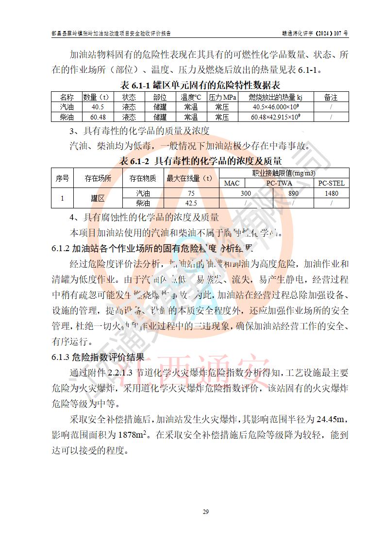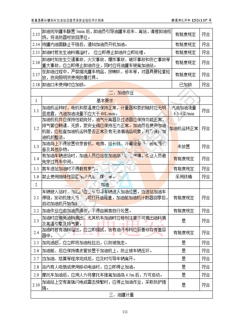 評價結論 | 都昌縣蔡嶺鎮(zhèn)張嶺加油站改造項目涉及的安全條件、安全生產(chǎn)條件、安全生產(chǎn)管理符合《危險化學品經(jīng)營許可證管理辦法》、《汽車加油加氣加氫站技術標準》等**有關法規(guī)、標準、規(guī)范要求,能滿足成品油零售經(jīng)營單位的安全條件,具備項目竣工驗收的條件。 | |||