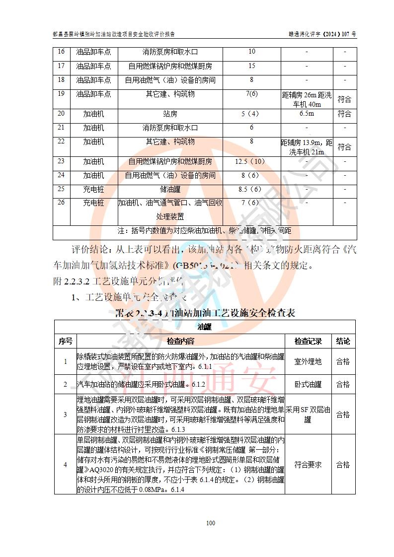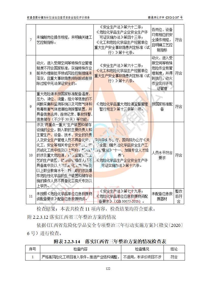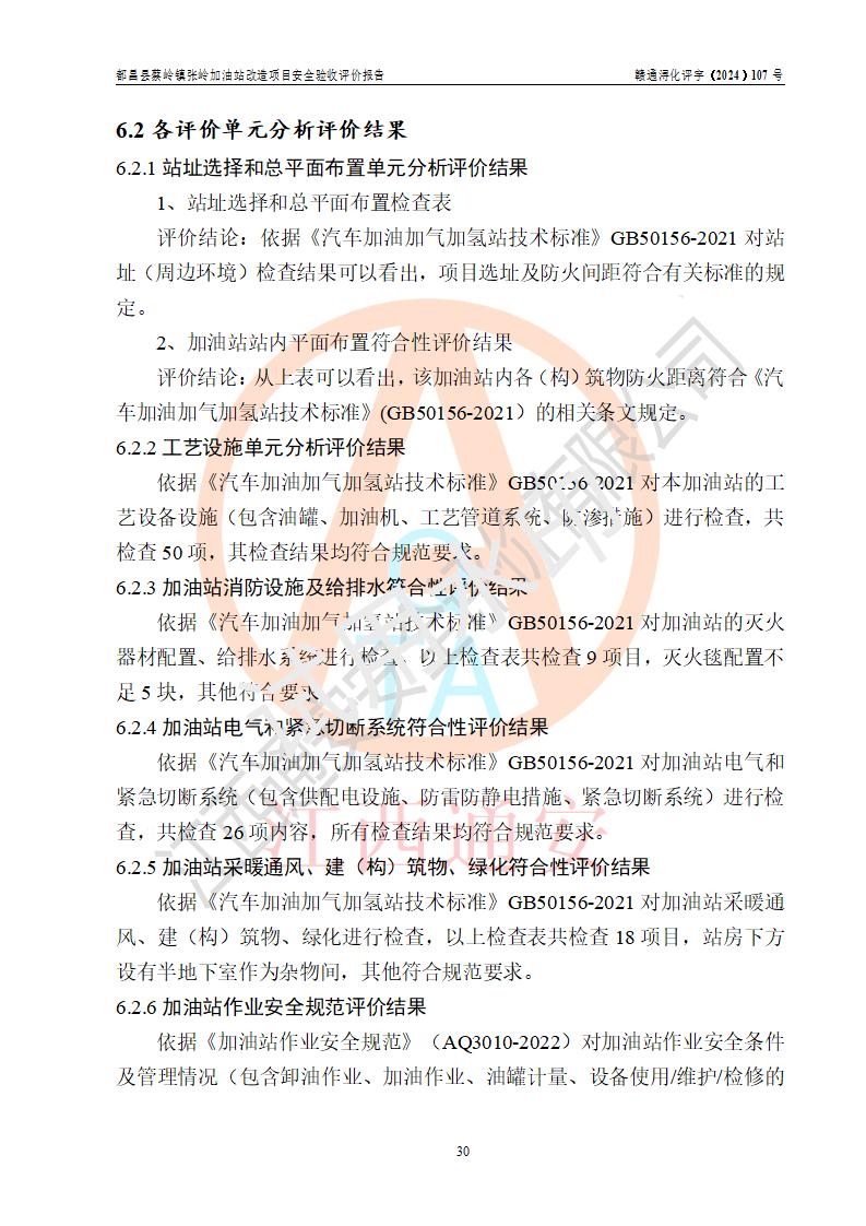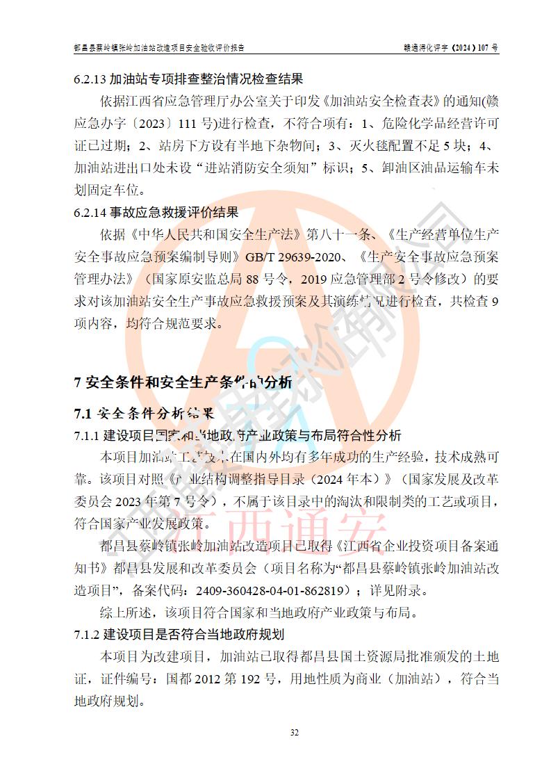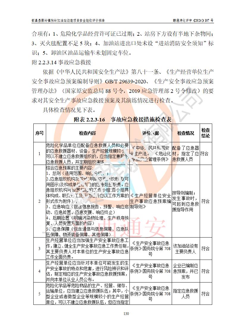 評價結論 | 都昌縣蔡嶺鎮(zhèn)張嶺加油站改造項目涉及的安全條件、安全生產(chǎn)條件、安全生產(chǎn)管理符合《危險化學品經(jīng)營許可證管理辦法》、《汽車加油加氣加氫站技術標準》等**有關法規(guī)、標準、規(guī)范要求,能滿足成品油零售經(jīng)營單位的安全條件,具備項目竣工驗收的條件。 | |||