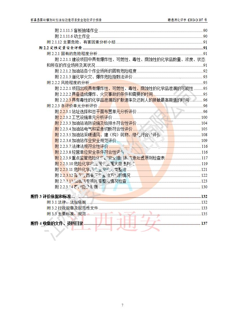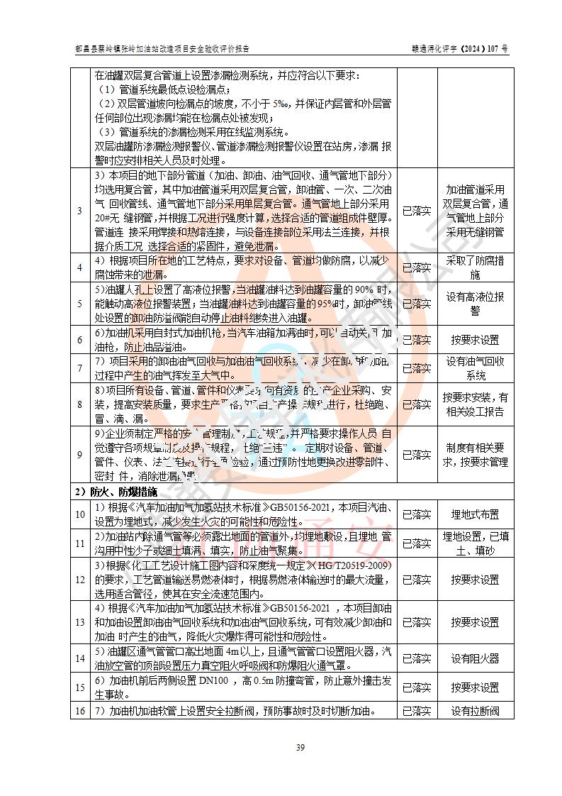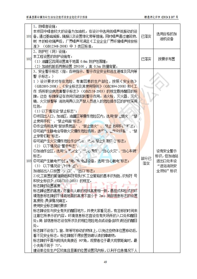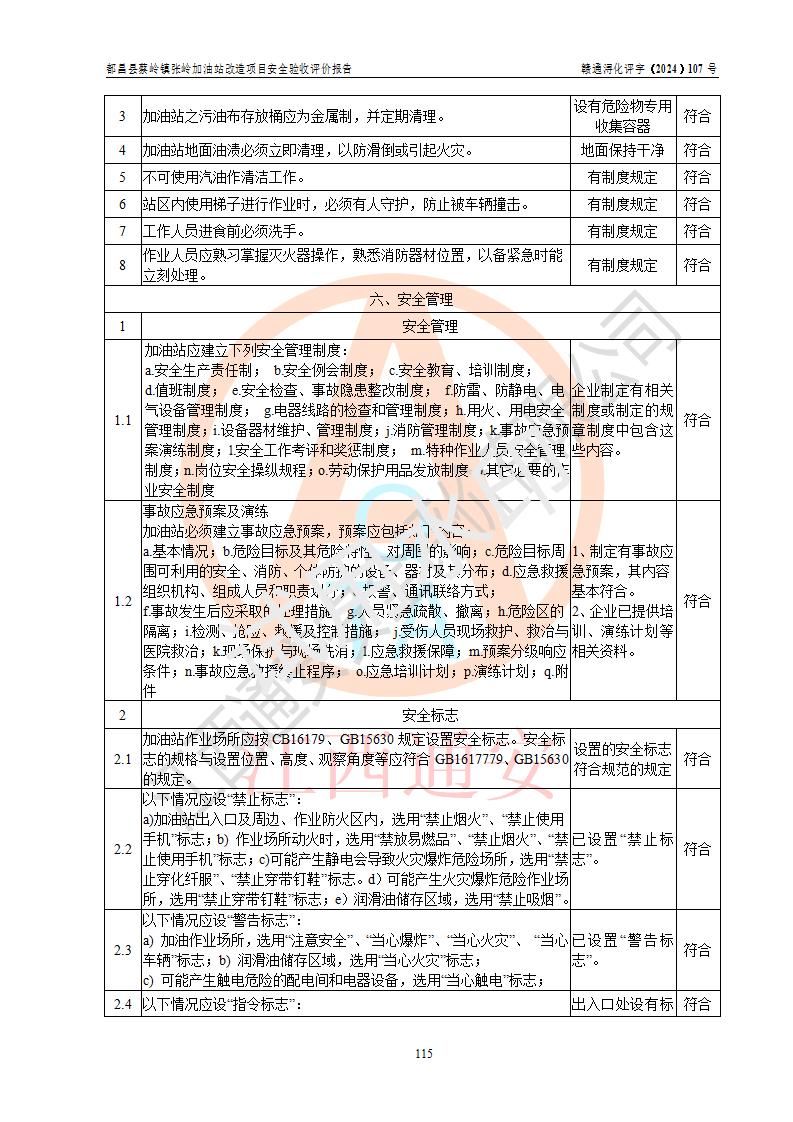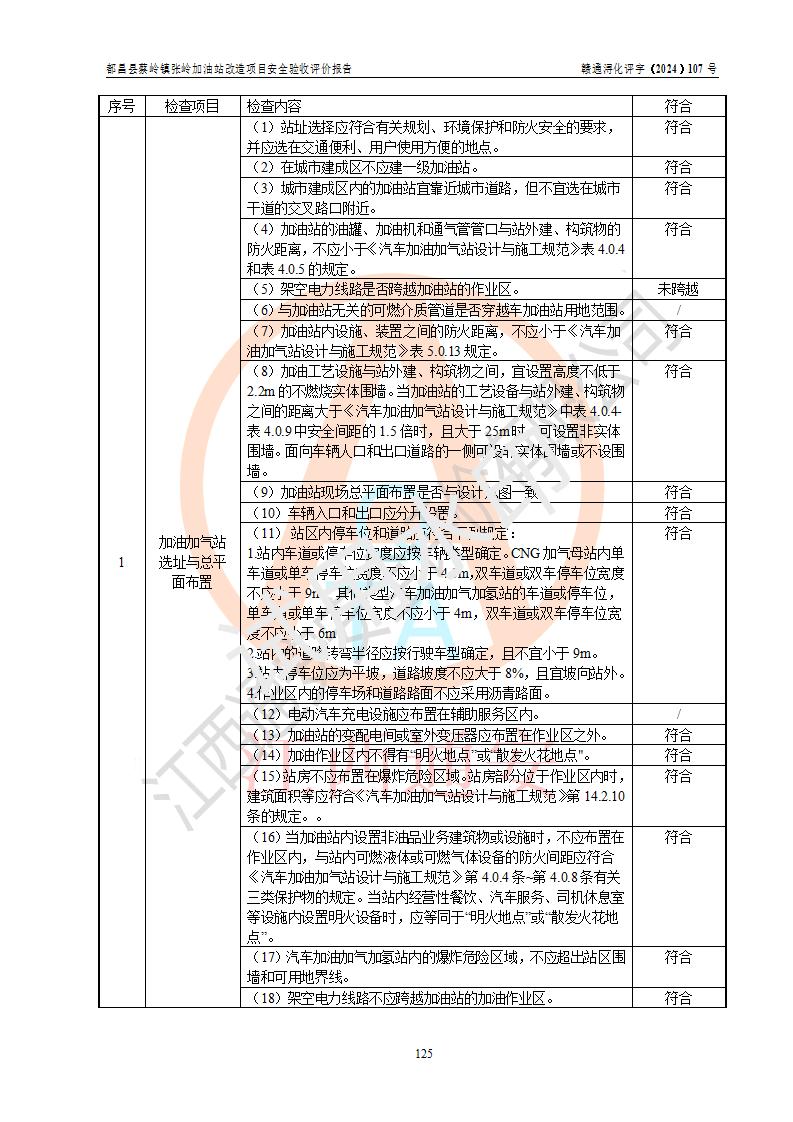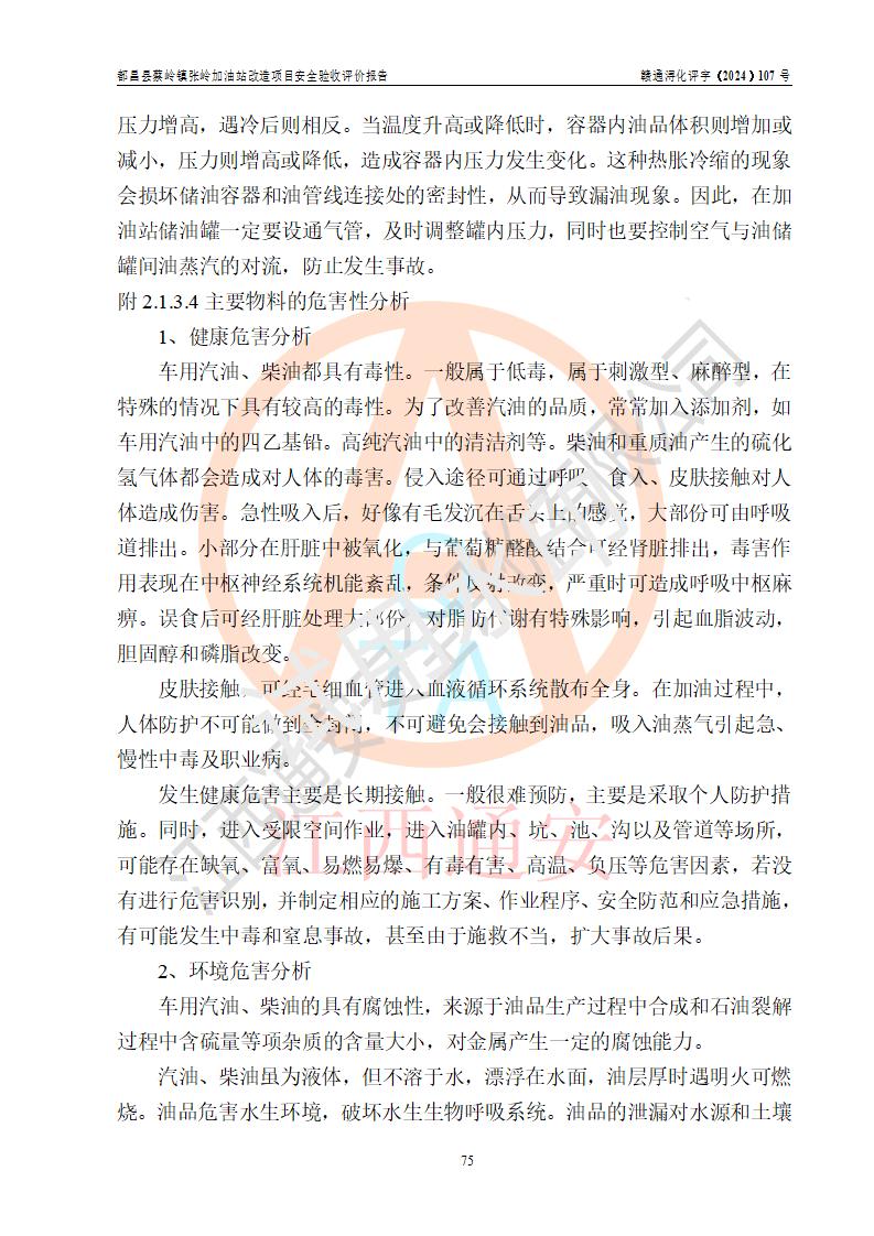 評價結論 | 都昌縣蔡嶺鎮(zhèn)張嶺加油站改造項目涉及的安全條件、安全生產(chǎn)條件、安全生產(chǎn)管理符合《危險化學品經(jīng)營許可證管理辦法》、《汽車加油加氣加氫站技術標準》等**有關法規(guī)、標準、規(guī)范要求,能滿足成品油零售經(jīng)營單位的安全條件,具備項目竣工驗收的條件。 | |||