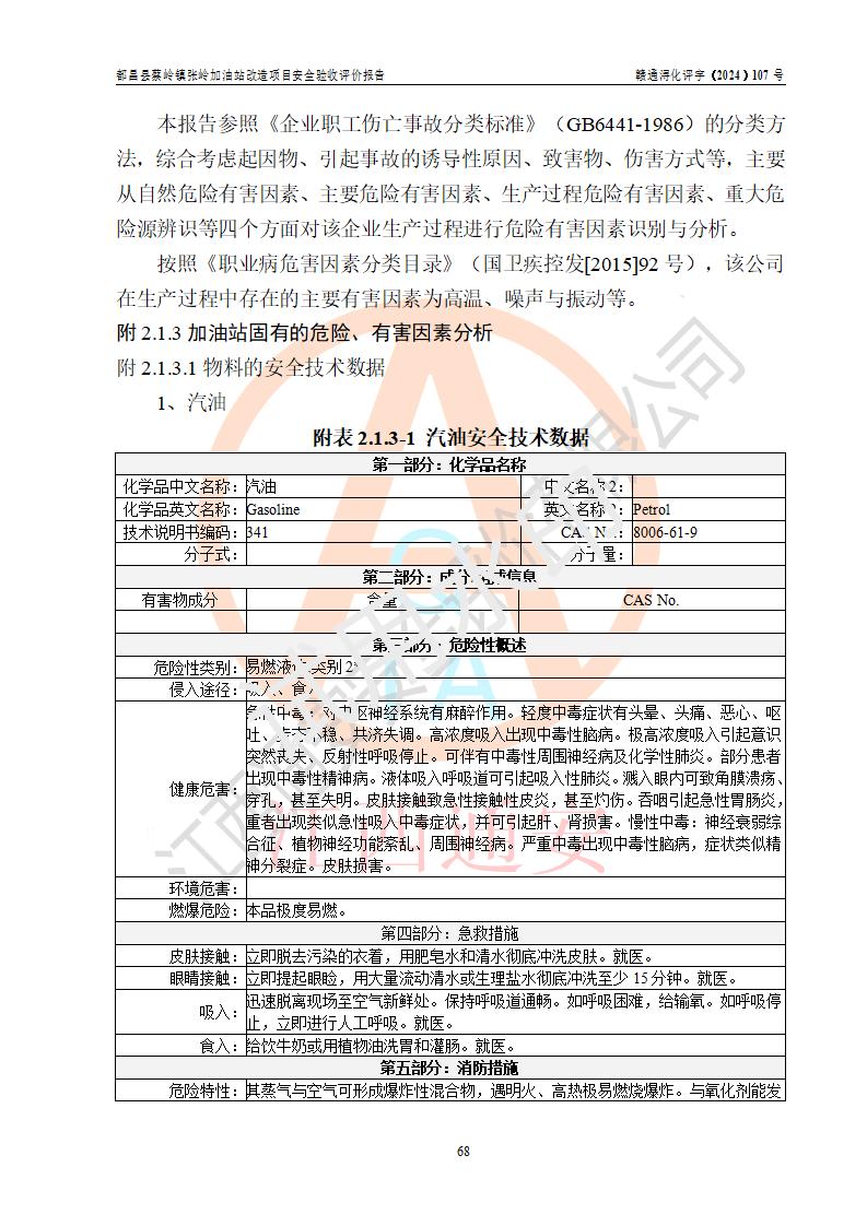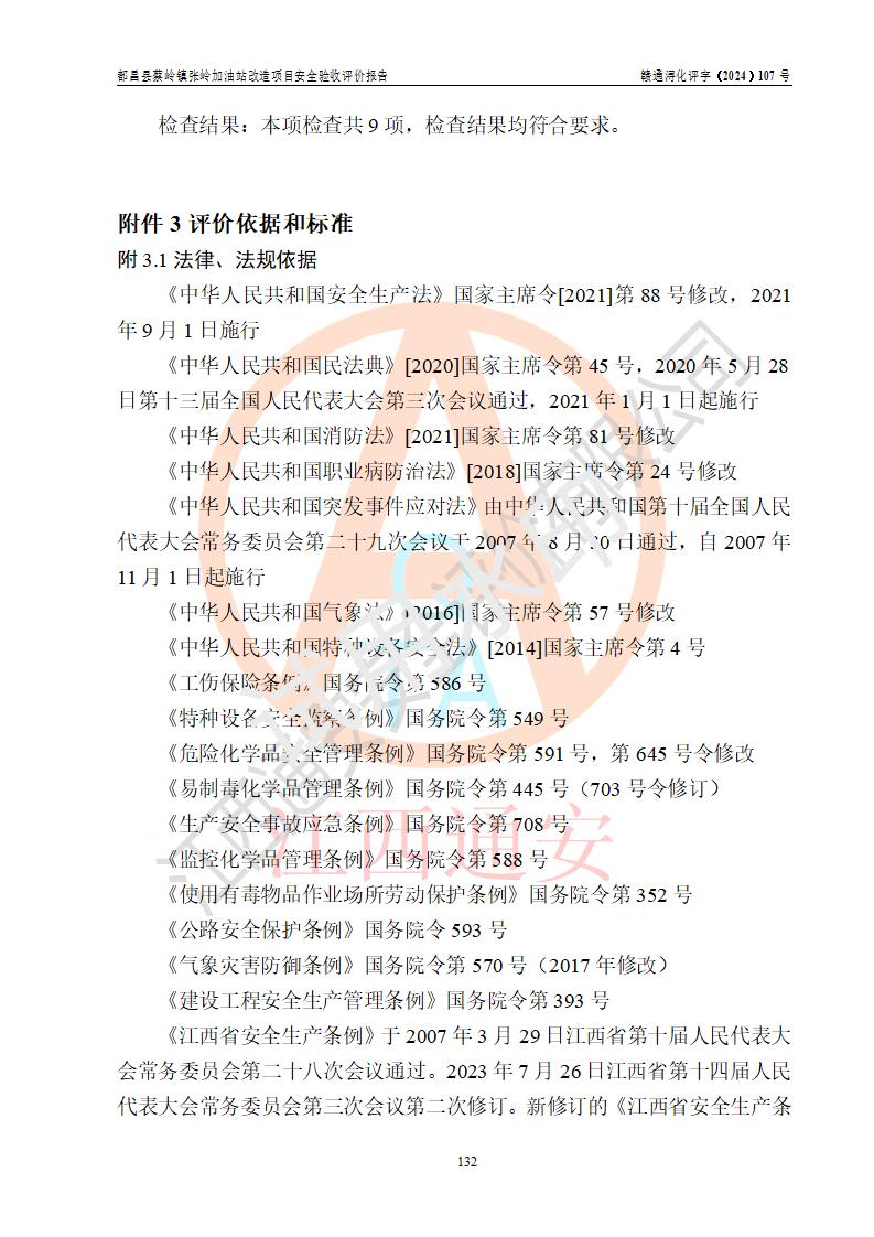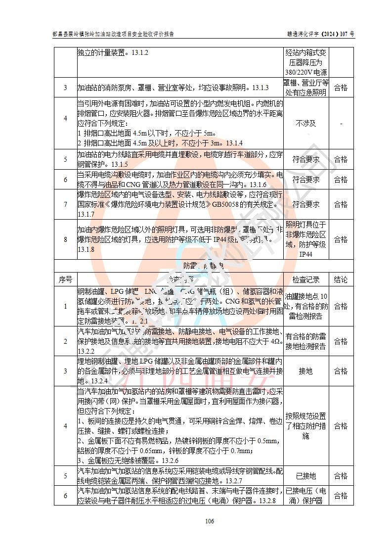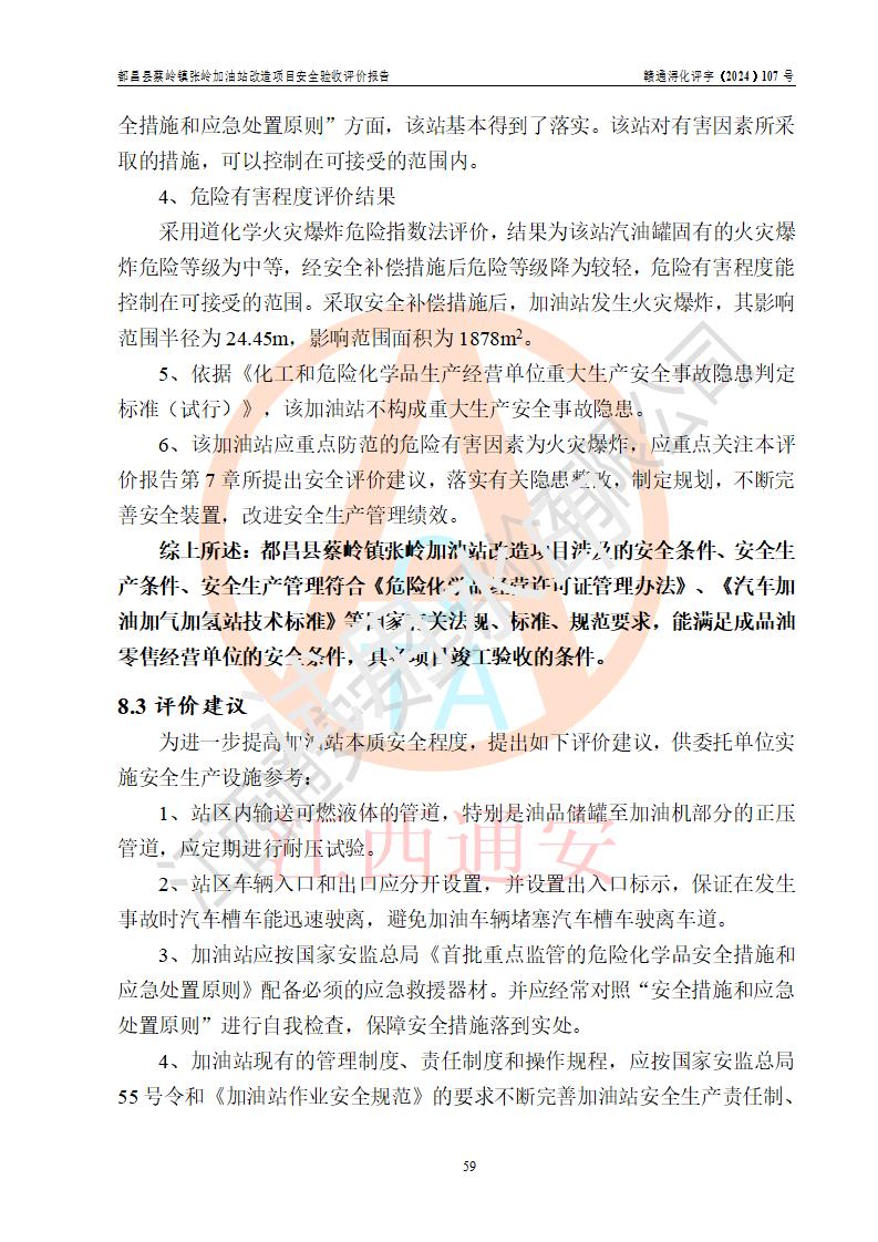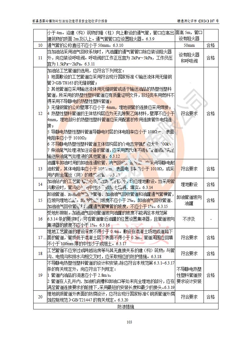 評價結論 | 都昌縣蔡嶺鎮(zhèn)張嶺加油站改造項目涉及的安全條件、安全生產(chǎn)條件、安全生產(chǎn)管理符合《危險化學品經(jīng)營許可證管理辦法》、《汽車加油加氣加氫站技術標準》等**有關法規(guī)、標準、規(guī)范要求,能滿足成品油零售經(jīng)營單位的安全條件,具備項目竣工驗收的條件。 | |||