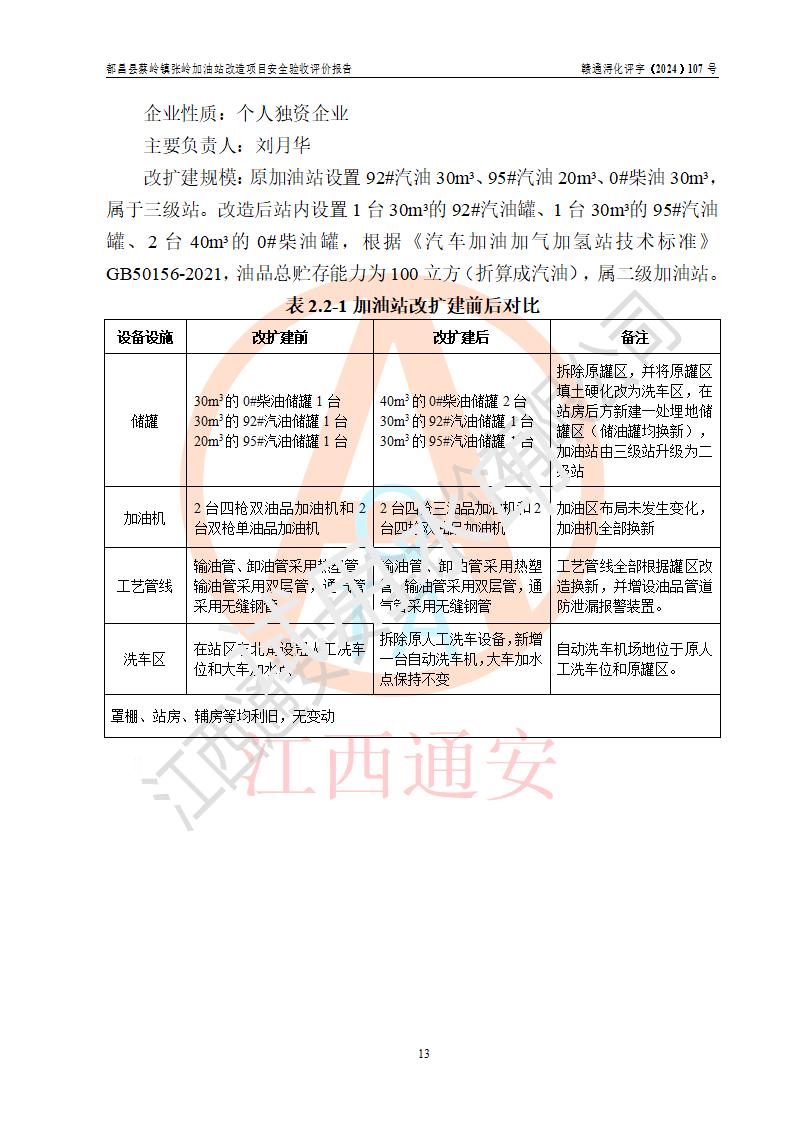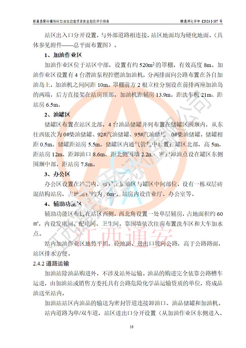 項目簡介 | 都昌縣蔡嶺鎮(zhèn)張嶺加油站是一家專門從事成品油(汽油、柴油)零售經(jīng)營的個人獨資企業(yè),注冊成立日期2014年11月05日,投資人:曾文平,主要負責人:劉月華,經(jīng)營場所位于江西省九江市都昌縣蔡嶺鎮(zhèn)張嶺曹便港橋南邊。經(jīng)營范圍:成品油(汽油、柴油等)、機油零售(依法須經(jīng)批準的項目,經(jīng)相關部門批準后方可開展經(jīng)營活動);該站屬于中化石油加盟站,對外宣傳名為“中化石油”。 該站由九江市行政審批局換發(fā)《危險化學品經(jīng)營許可證》(編號:贛九?;?jīng)字[2024]000005),**期限2021年09月05日至2024年09月04日;于2024年02月04日取得九江市商務局頒發(fā)的《成品油零售經(jīng)營批準證書》(油零售證書第潯0362號)**期至2029年02月03日。 都昌縣蔡嶺鎮(zhèn)張嶺加油站占地面積約1889.5m2,站內原設置有2臺四槍和2臺雙槍潛油泵程控燃油加油機及配套的工藝管線,原設埋地臥式雙層油罐3臺,其中30m3的0#柴油儲罐1臺、30m3的92#汽油儲罐1臺,20m3的95#汽油儲罐1臺,油品儲罐總容積為65m3(柴油折半),屬三級加油站。 因加油站經(jīng)營發(fā)展需要,都昌縣蔡嶺鎮(zhèn)張嶺加油站進行加油站罐區(qū)改造,將站內現(xiàn)有罐區(qū)及配套設施拆除,在站房后方新建一處罐區(qū),并改造相關配套設施;改造后站內設置有4臺四槍潛油泵程控燃油加油機及配套的工藝管線,設埋地臥式雙層油罐4臺,其中40m3的0#柴油儲罐2臺、30m3的92#汽油儲罐1臺,30m3的95#汽油儲罐1臺,油品儲罐總容積為100m3(柴油折半),按現(xiàn)行《汽車加油加氣加氫站技術標準》對加油站的等級劃分原則,屬二級加油站。 | |||