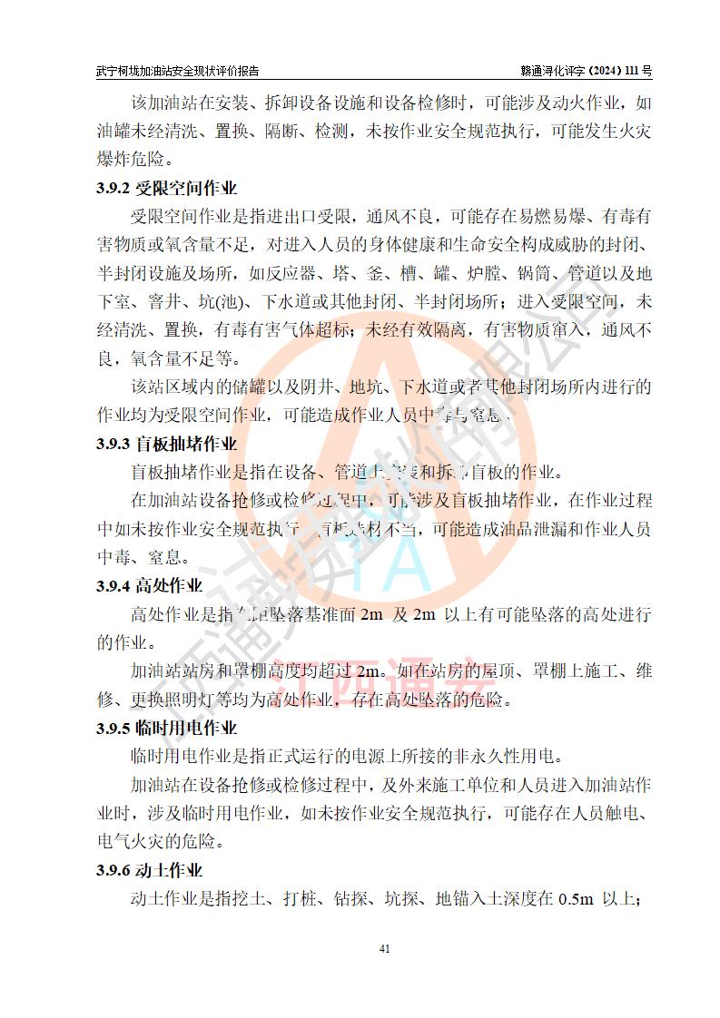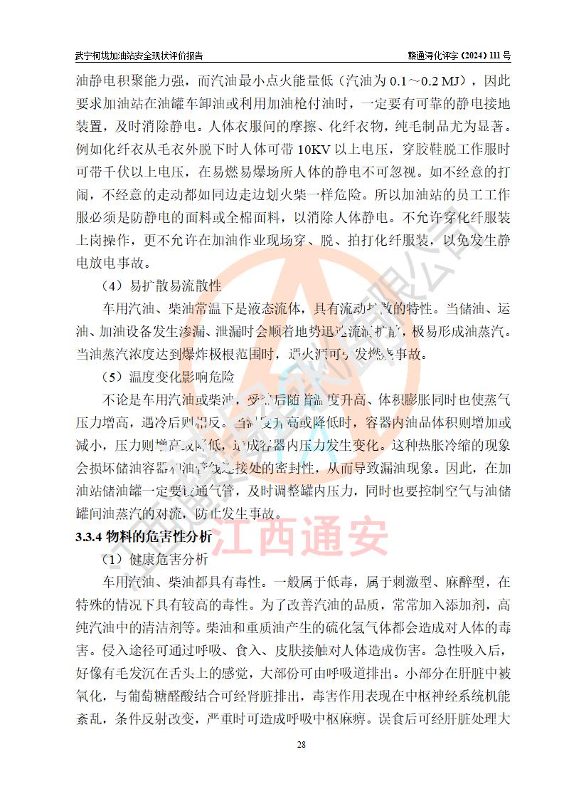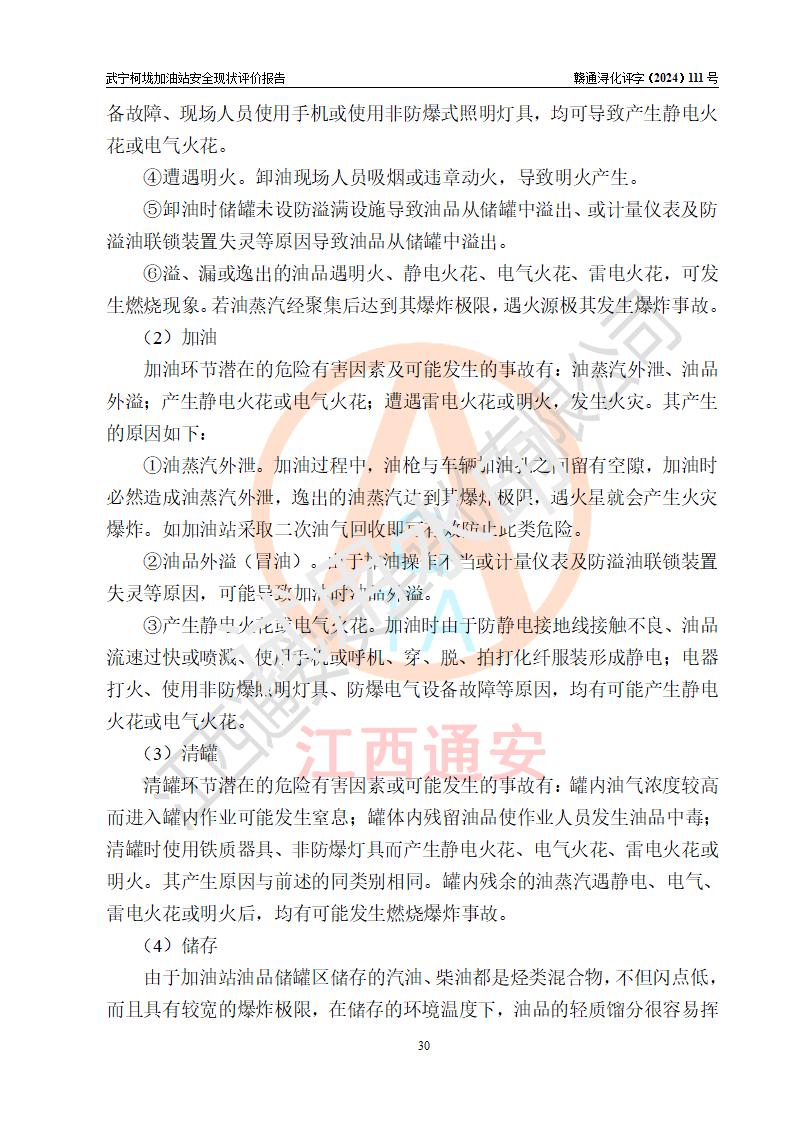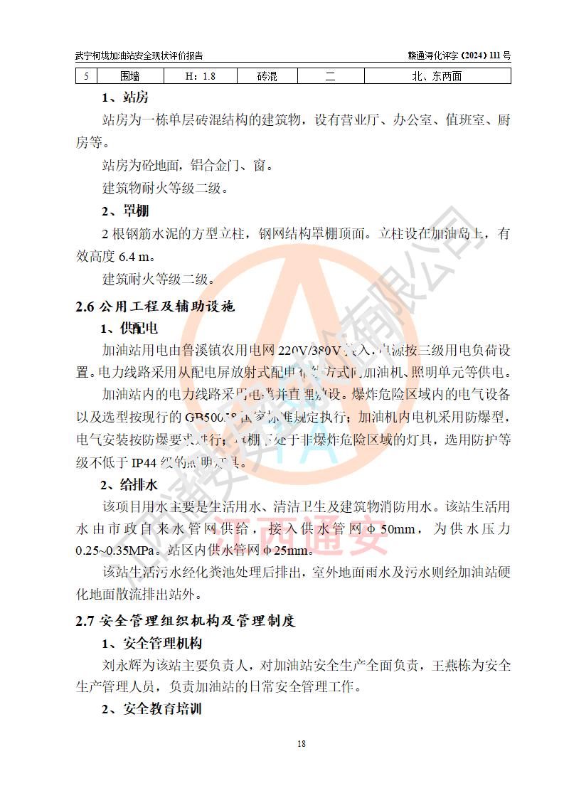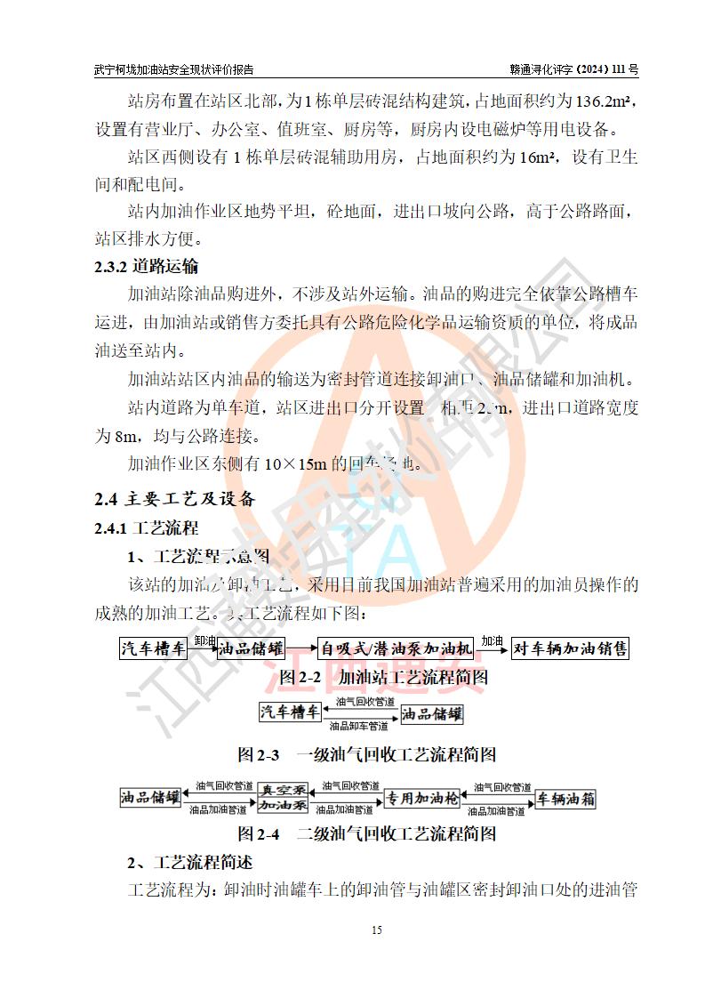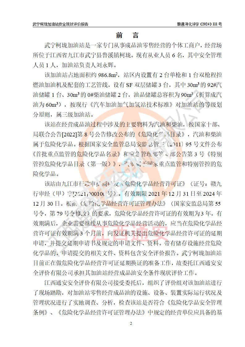 項(xiàng)目簡介 | 武寧柯垅加油站是一家專門從事成品油零售經(jīng)營的個體工商戶,經(jīng)營場所位于江西省九江市武寧縣魯溪鎮(zhèn)柯垅?,F(xiàn)有從業(yè)人員6名,其中安全管理人員1人,加油站負(fù)責(zé)人劉永輝。 該加油站占地面積約986.8m2,站區(qū)內(nèi)設(shè)置有2臺單槍和1臺雙槍程控燃油加油機(jī)及配套的工藝管線,設(shè)有SF雙層儲罐3臺,其中30m3的92#汽油儲罐1臺、30m3的0#柴油儲罐2臺,油品儲罐總?cè)莘e為90m3(折算成汽油為60m3),按現(xiàn)行《汽車加油加氣加氫站技術(shù)標(biāo)準(zhǔn)》對加油站的等級劃分原則,屬三級加油站。 該站由九江市行政審批局換發(fā)《危險化學(xué)品經(jīng)營許可證》(證號:贛九行審經(jīng)(甲)字[2021]000100號),**期限2021年12月31日至2024年12月30日。 | |||