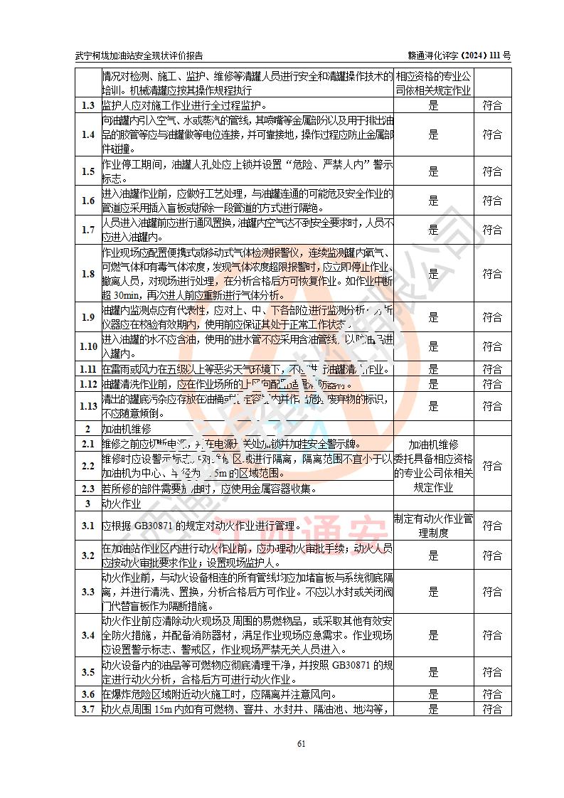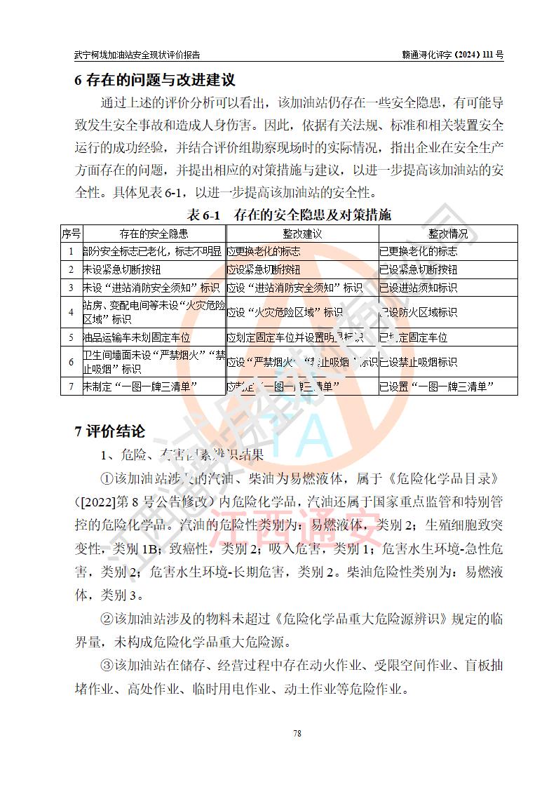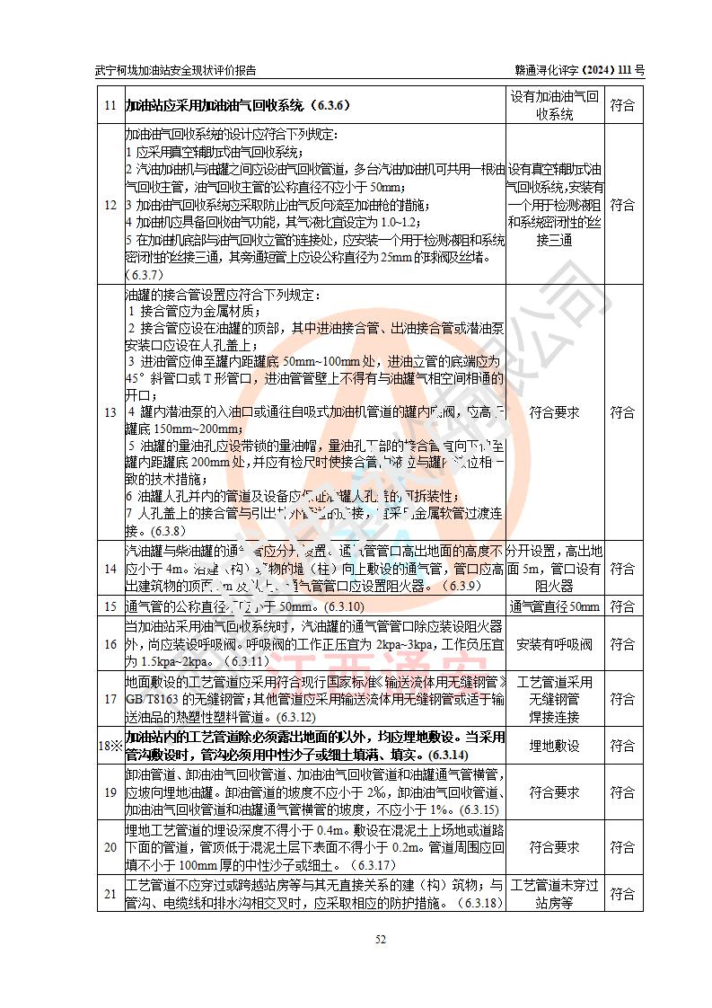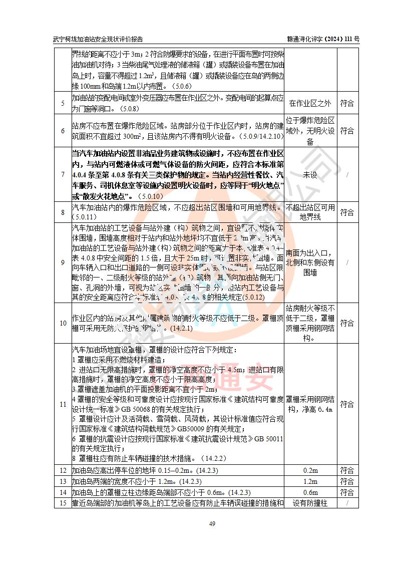 評價結(jié)論 | 武寧柯垅加油站涉及的安全條件、安全經(jīng)營條件、安全生產(chǎn)管理符合《危險化學(xué)品經(jīng)營許可證管理辦法》、《汽車加油加氣加氫站技術(shù)標(biāo)準(zhǔn)》等**有關(guān)法規(guī)、標(biāo)準(zhǔn)、規(guī)范要求,能滿足危險化學(xué)品經(jīng)營安全條件。 | |||