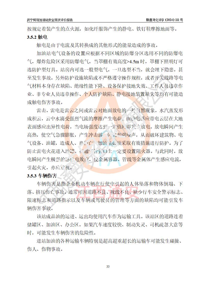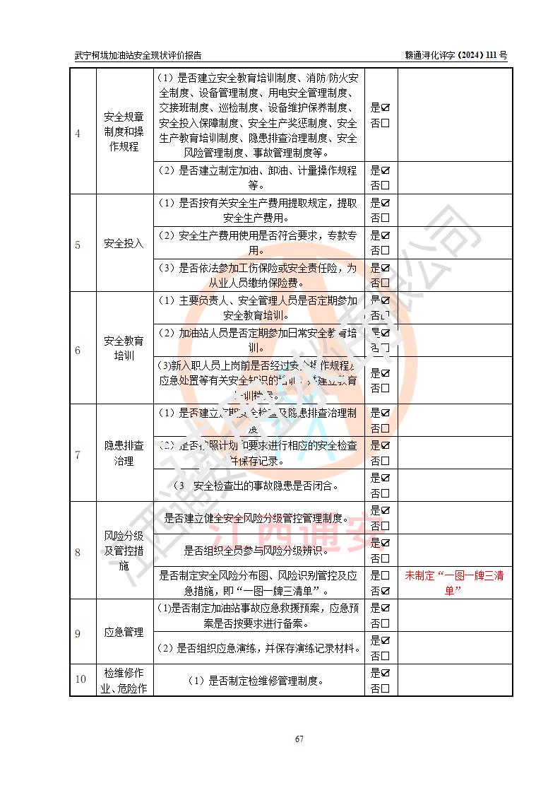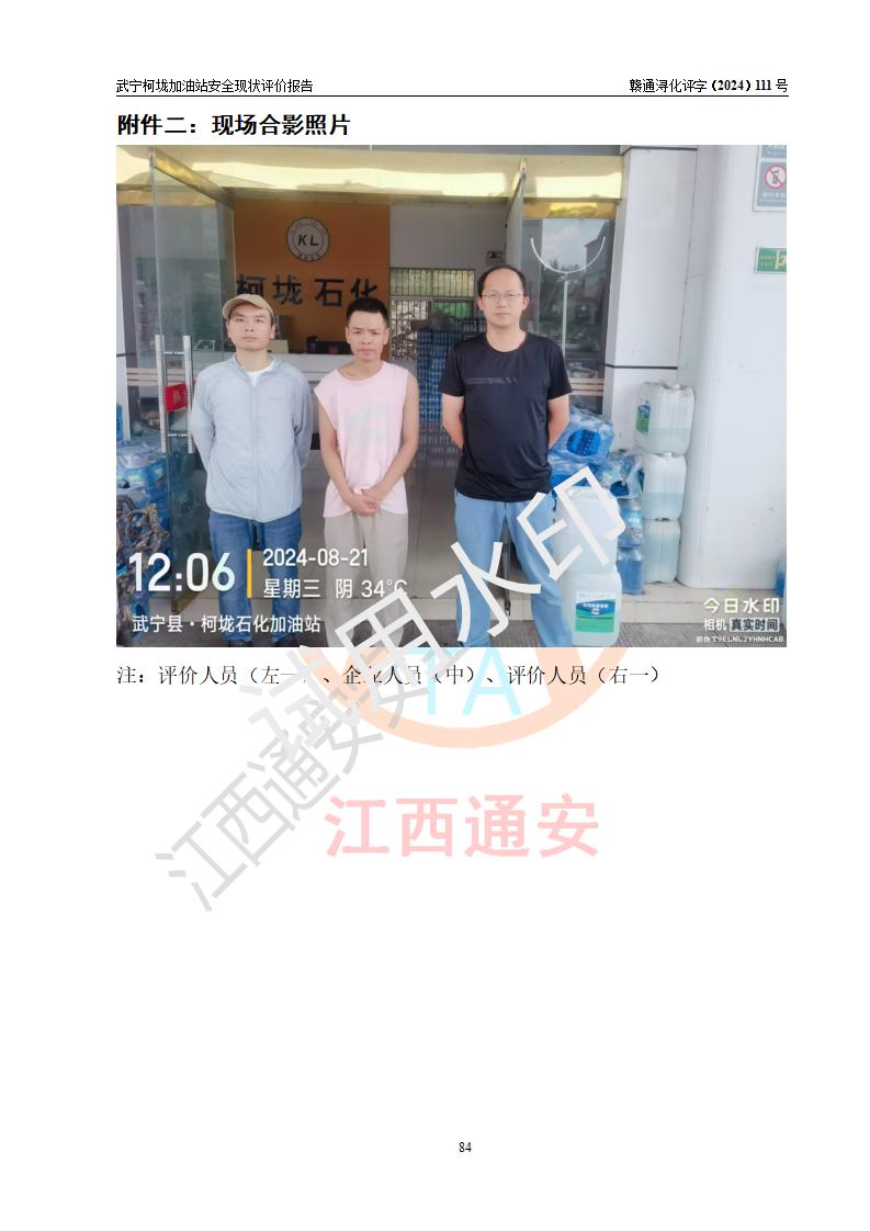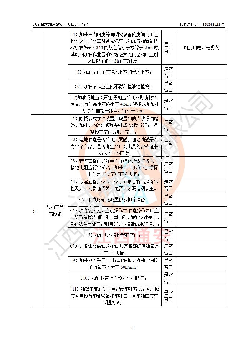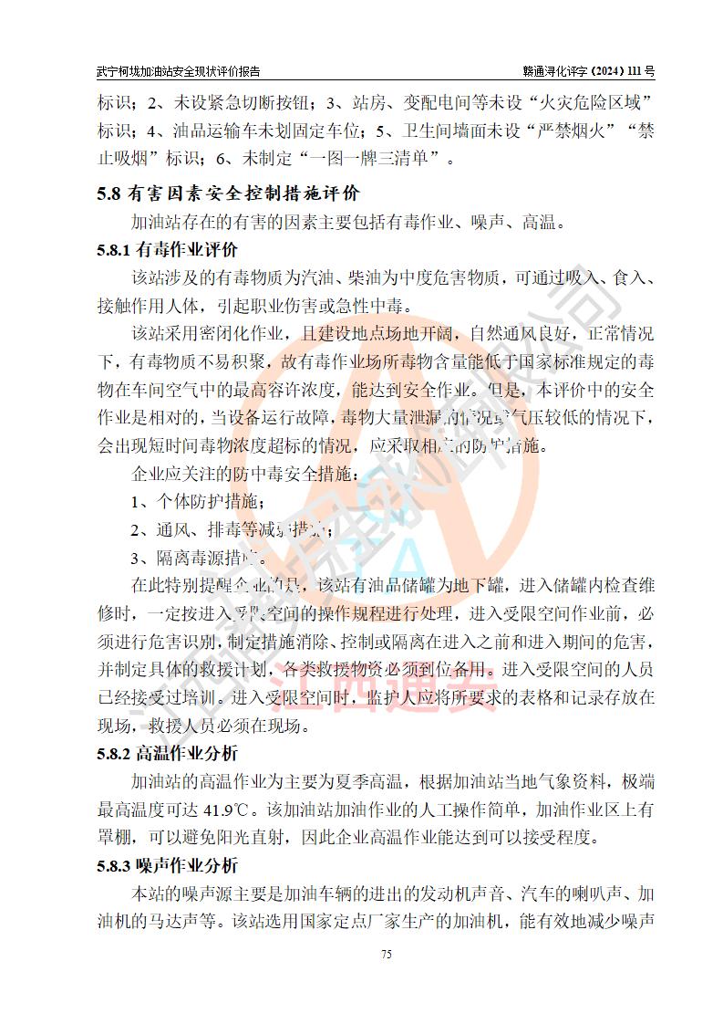 評價結(jié)論 | 武寧柯垅加油站涉及的安全條件、安全經(jīng)營條件、安全生產(chǎn)管理符合《危險化學(xué)品經(jīng)營許可證管理辦法》、《汽車加油加氣加氫站技術(shù)標(biāo)準(zhǔn)》等**有關(guān)法規(guī)、標(biāo)準(zhǔn)、規(guī)范要求,能滿足危險化學(xué)品經(jīng)營安全條件。 | |||