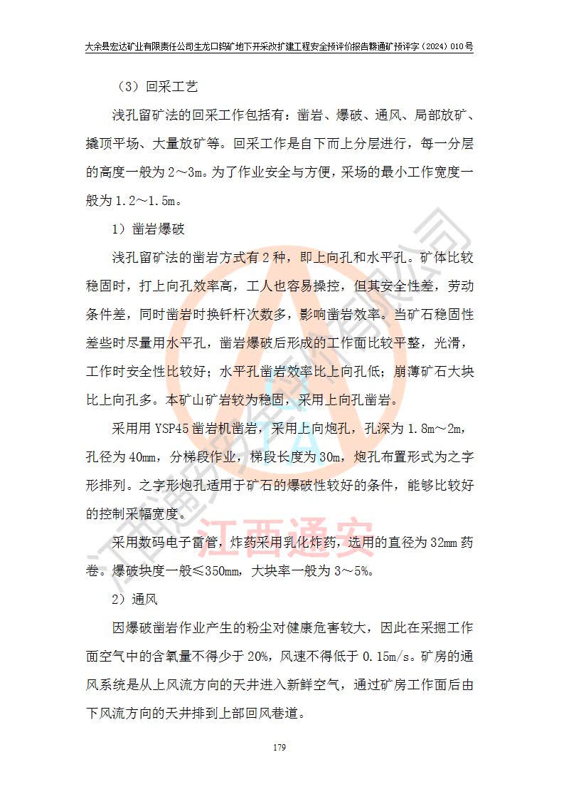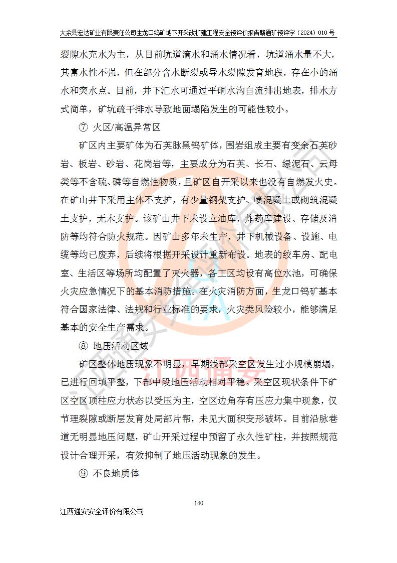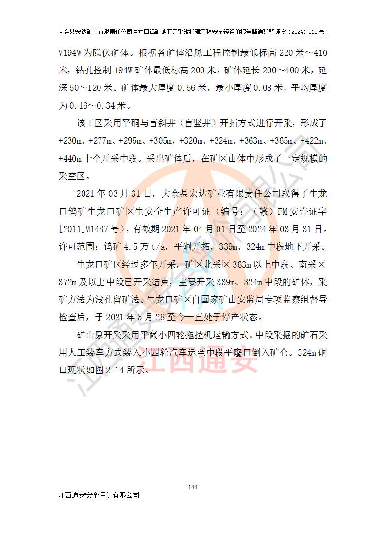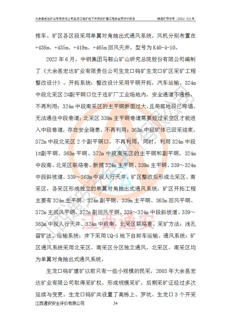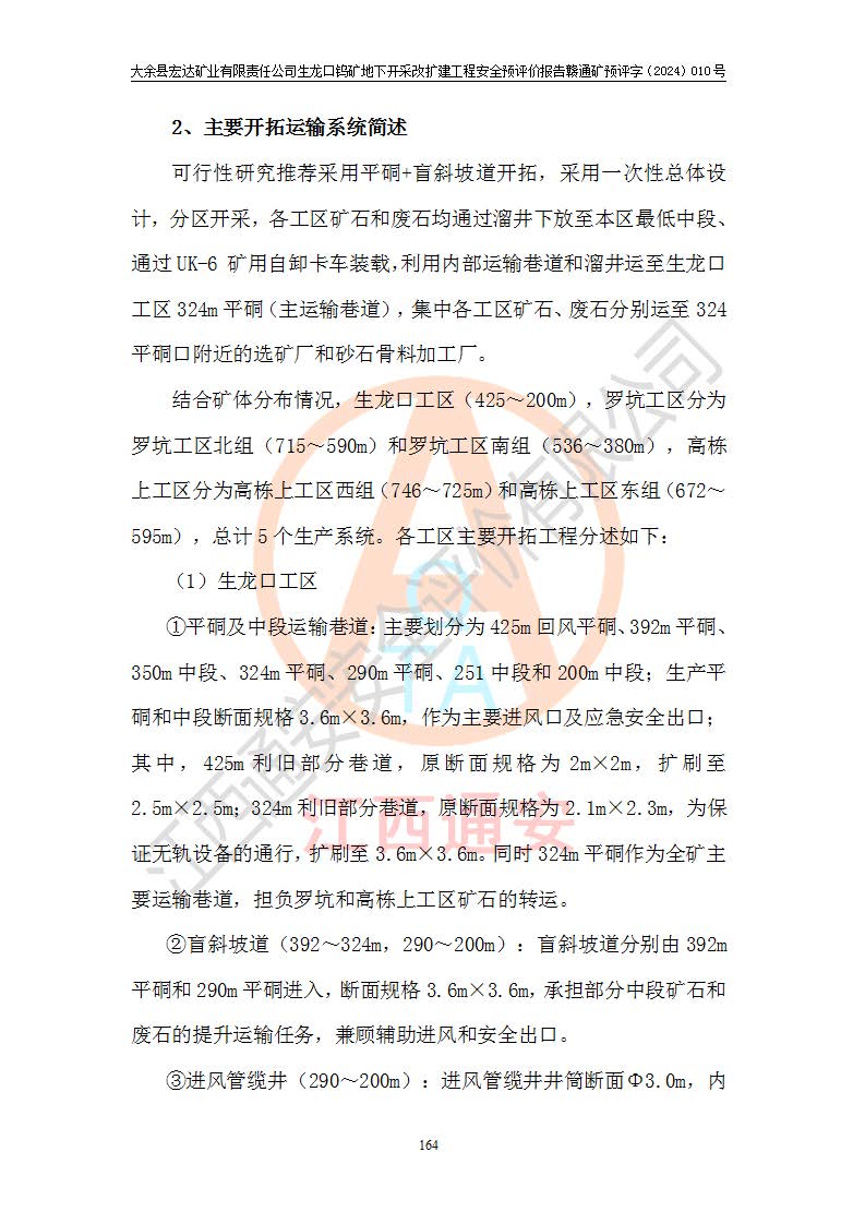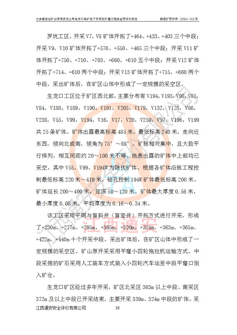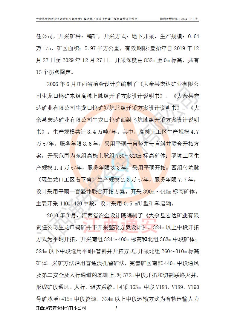 大余縣生龍口礦區(qū)鎢礦位于大余縣城北西 310°方位,距大余縣城直距 12 **,西接生龍口,北接蕩坪礦,南鄰黃木坑、西華山等礦區(qū),礦區(qū)正好是幾個(gè)礦區(qū)的銜接部位。隸屬大余縣浮江鄉(xiāng)管轄。其地理位置為:東經(jīng) 114°17′03″--114°20′11″;北緯 25°27′15″ --25 ° 28 ′ 10″ 。 礦 區(qū) 面 積 為5.97平方**。區(qū)內(nèi)交通較為方便,礦區(qū)東西兩側(cè)不遠(yuǎn)處均有公路通過(guò),西側(cè)為大余至崇義公路,東側(cè)為 大 余 至 蕩 坪 公路,通過(guò)這兩條公路均可向南與大余縣城與 323 國(guó)道相接,至贛州市區(qū)約100 **,往廣東省韶關(guān)贛韶高速約 150 **,向北達(dá)崇義縣城。 生龍口鎢礦建礦以前只有一些小規(guī)模的民采,2003年大余縣宏達(dá)礦業(yè)有限公司取得采礦權(quán),形成規(guī)模采礦,后期采礦證經(jīng)過(guò)多次延續(xù)與變更。生龍口鎢礦共設(shè)置了高棟上、羅坑、生龍口3個(gè)開(kāi)采工區(qū)。3個(gè)工區(qū)相距3**左右。 2024年9月江西晶楚工程技術(shù)有限公司編制完成了《大余縣宏達(dá)礦業(yè)有限責(zé)任公司生龍口鎢礦地下開(kāi)采改擴(kuò)建工程可行性研究報(bào)告》(以下簡(jiǎn)稱(chēng)《可研報(bào)告》)。2024年12月26日取得《江西省工業(yè)和信息化廳關(guān)于大余縣宏達(dá)礦業(yè)有限責(zé)任公司生龍口鎢礦地下開(kāi)采改擴(kuò)建工程核準(zhǔn)的批復(fù)》(贛工信有色〔2024〕49號(hào))。 根據(jù)《可研報(bào)告》,可研設(shè)計(jì)范圍為生龍口鎢礦礦區(qū)礦權(quán)范圍,平面范圍由15個(gè)拐點(diǎn)組成,開(kāi)采標(biāo)高范圍為746m~200m。本次開(kāi)采對(duì)象為開(kāi)采范圍內(nèi)的35條工業(yè)礦體,其中,大部分礦體以及接近地表處存在采空區(qū),為保護(hù)地表及井下安全作業(yè),需留設(shè)地表保安礦柱及采空區(qū)隔離礦柱;其中,高棟上工區(qū)V198、V197礦體因位于采空區(qū)后方,且資源量較少,暫不列為開(kāi)采對(duì)象;生龍口工區(qū)V98、V85、V84因利舊324m主平硐口,故作為保安礦柱,暫不予開(kāi)采??裳?*采用淺孔留礦嗣后充填法??裳?*采用平硐+盲斜坡道開(kāi)拓,一次性整體設(shè)計(jì),各工區(qū)礦石和廢石均通過(guò)溜井下放至相應(yīng)區(qū)段*低開(kāi)采中段、通過(guò)UK-6礦用自卸卡車(chē)裝載,利用內(nèi)部運(yùn)輸巷道和溜井運(yùn)至生龍口工區(qū)324m平硐(主運(yùn)輸巷道)集中出礦,各工區(qū)礦石、廢石分別運(yùn)至324平硐口附近的選礦廠和砂石骨料加工廠。井下中段**采用無(wú)軌運(yùn)輸。礦區(qū)采用分區(qū)通風(fēng)系統(tǒng)、每個(gè)工區(qū)采用單翼對(duì)角抽出機(jī)械式通風(fēng)方式;新風(fēng)主要從平硐口進(jìn)風(fēng),回風(fēng)井回風(fēng)。 本項(xiàng)目已經(jīng)符合編制安全預(yù)評(píng)價(jià)的前置條件,根據(jù)《中華人民共和國(guó)安全生產(chǎn)法》、《建設(shè)項(xiàng)目安全設(shè)施“三同時(shí)”監(jiān)督管理辦法》(**安全生產(chǎn)監(jiān)督管理局令第36號(hào))、《金屬非金屬礦山建設(shè)項(xiàng)目安全設(shè)施目錄》(**安全生產(chǎn)監(jiān)督管理總局令第75號(hào))和《**礦山安全監(jiān)察局關(guān)于進(jìn)一步加強(qiáng)非煤礦山安全生產(chǎn)行政許可工作的通知》(礦安〔2024〕70號(hào))的規(guī)定,大余縣宏達(dá)礦業(yè)有限責(zé)任公司2024年10月8日委托江西通安安全評(píng)價(jià)有限公司對(duì)其生龍口鎢礦地下開(kāi)采改擴(kuò)建工程進(jìn)行安全預(yù)評(píng)價(jià)。 |