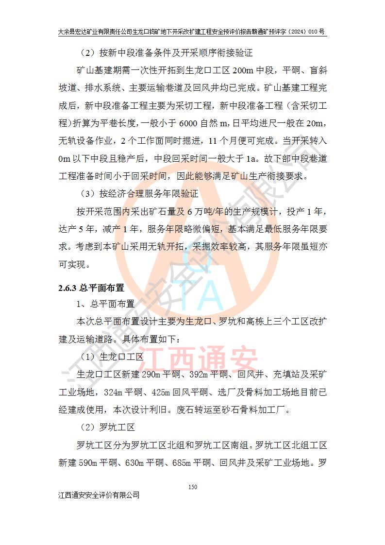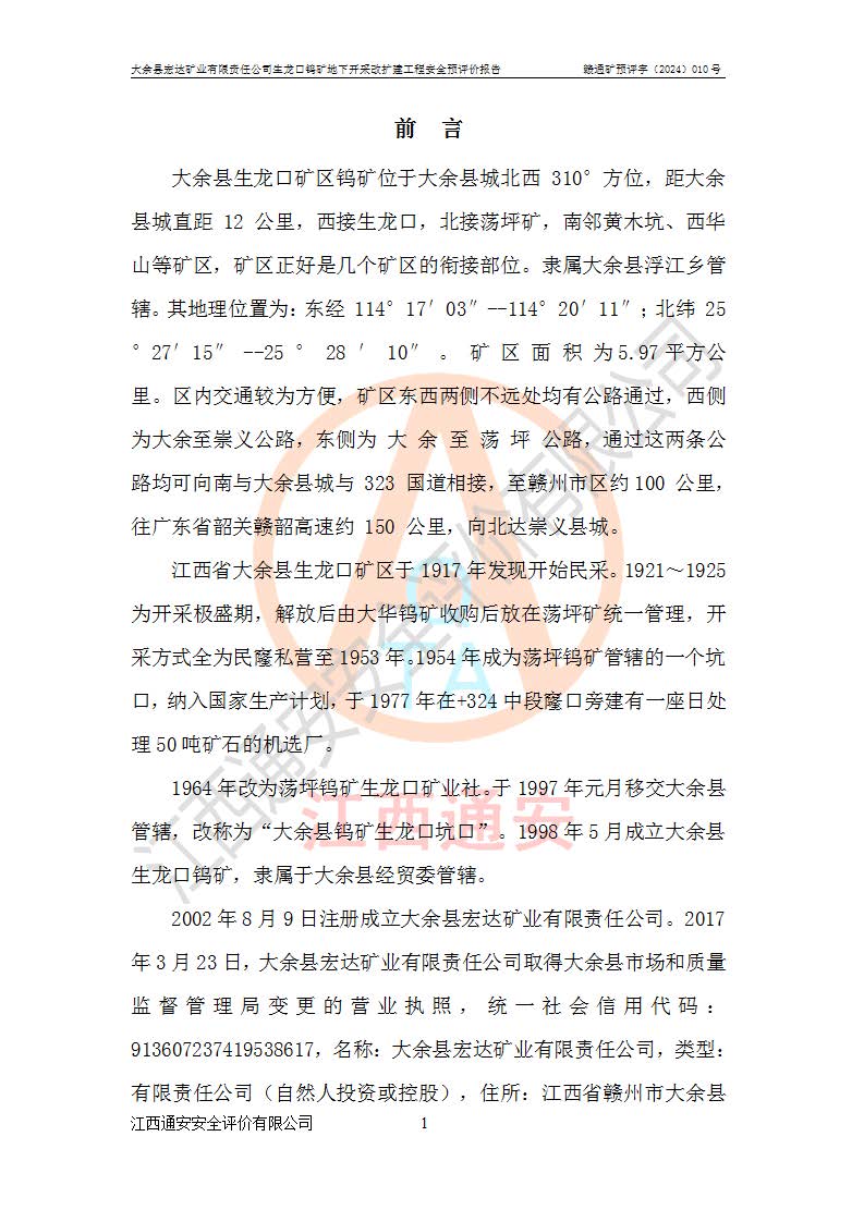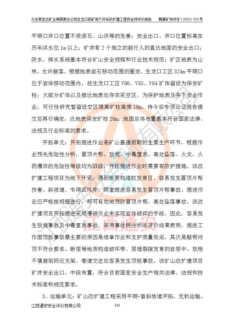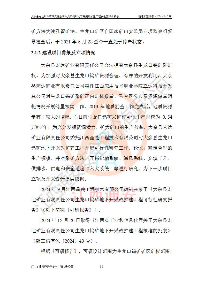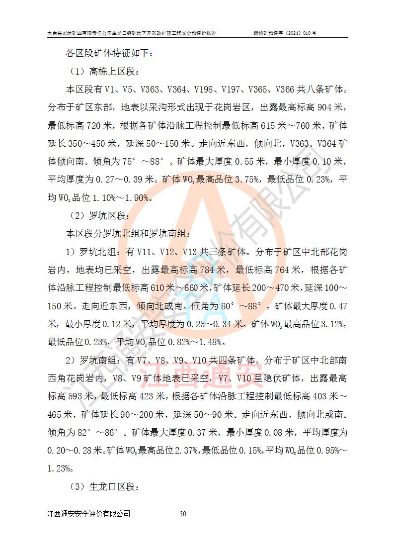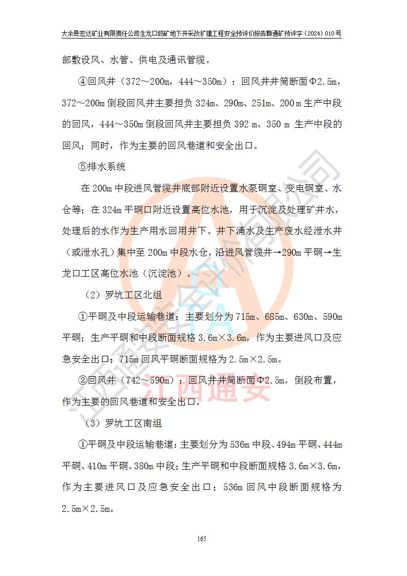 大余縣生龍口礦區(qū)鎢礦位于大余縣城北西 310°方位,距大余縣城直距 12 **,西接生龍口,北接蕩坪礦,南鄰黃木坑、西華山等礦區(qū),礦區(qū)正好是幾個(gè)礦區(qū)的銜接部位。隸屬大余縣浮江鄉(xiāng)管轄。其地理位置為:東經(jīng) 114°17′03″--114°20′11″;北緯 25°27′15″ --25 ° 28 ′ 10″ 。 礦 區(qū) 面 積 為5.97平方**。區(qū)內(nèi)交通較為方便,礦區(qū)東西兩側(cè)不遠(yuǎn)處均有公路通過(guò),西側(cè)為大余至崇義公路,東側(cè)為 大 余 至 蕩 坪 公路,通過(guò)這兩條公路均可向南與大余縣城與 323 國(guó)道相接,至贛州市區(qū)約100 **,往廣東省韶關(guān)贛韶高速約 150 **,向北達(dá)崇義縣城。 生龍口鎢礦建礦以前只有一些小規(guī)模的民采,2003年大余縣宏達(dá)礦業(yè)有限公司取得采礦權(quán),形成規(guī)模采礦,后期采礦證經(jīng)過(guò)多次延續(xù)與變更。生龍口鎢礦共設(shè)置了高棟上、羅坑、生龍口3個(gè)開(kāi)采工區(qū)。3個(gè)工區(qū)相距3**左右。 2024年9月江西晶楚工程技術(shù)有限公司編制完成了《大余縣宏達(dá)礦業(yè)有限責(zé)任公司生龍口鎢礦地下開(kāi)采改擴(kuò)建工程可行性研究報(bào)告》(以下簡(jiǎn)稱(chēng)《可研報(bào)告》)。2024年12月26日取得《江西省工業(yè)和信息化廳關(guān)于大余縣宏達(dá)礦業(yè)有限責(zé)任公司生龍口鎢礦地下開(kāi)采改擴(kuò)建工程核準(zhǔn)的批復(fù)》(贛工信有色〔2024〕49號(hào))。 根據(jù)《可研報(bào)告》,可研設(shè)計(jì)范圍為生龍口鎢礦礦區(qū)礦權(quán)范圍,平面范圍由15個(gè)拐點(diǎn)組成,開(kāi)采標(biāo)高范圍為746m~200m。本次開(kāi)采對(duì)象為開(kāi)采范圍內(nèi)的35條工業(yè)礦體,其中,大部分礦體以及接近地表處存在采空區(qū),為保護(hù)地表及井下安全作業(yè),需留設(shè)地表保安礦柱及采空區(qū)隔離礦柱;其中,高棟上工區(qū)V198、V197礦體因位于采空區(qū)后方,且資源量較少,暫不列為開(kāi)采對(duì)象;生龍口工區(qū)V98、V85、V84因利舊324m主平硐口,故作為保安礦柱,暫不予開(kāi)采??裳?*采用淺孔留礦嗣后充填法??裳?*采用平硐+盲斜坡道開(kāi)拓,一次性整體設(shè)計(jì),各工區(qū)礦石和廢石均通過(guò)溜井下放至相應(yīng)區(qū)段*低開(kāi)采中段、通過(guò)UK-6礦用自卸卡車(chē)裝載,利用內(nèi)部運(yùn)輸巷道和溜井運(yùn)至生龍口工區(qū)324m平硐(主運(yùn)輸巷道)集中出礦,各工區(qū)礦石、廢石分別運(yùn)至324平硐口附近的選礦廠和砂石骨料加工廠。井下中段**采用無(wú)軌運(yùn)輸。礦區(qū)采用分區(qū)通風(fēng)系統(tǒng)、每個(gè)工區(qū)采用單翼對(duì)角抽出機(jī)械式通風(fēng)方式;新風(fēng)主要從平硐口進(jìn)風(fēng),回風(fēng)井回風(fēng)。 本項(xiàng)目已經(jīng)符合編制安全預(yù)評(píng)價(jià)的前置條件,根據(jù)《中華人民共和國(guó)安全生產(chǎn)法》、《建設(shè)項(xiàng)目安全設(shè)施“三同時(shí)”監(jiān)督管理辦法》(**安全生產(chǎn)監(jiān)督管理局令第36號(hào))、《金屬非金屬礦山建設(shè)項(xiàng)目安全設(shè)施目錄》(**安全生產(chǎn)監(jiān)督管理總局令第75號(hào))和《**礦山安全監(jiān)察局關(guān)于進(jìn)一步加強(qiáng)非煤礦山安全生產(chǎn)行政許可工作的通知》(礦安〔2024〕70號(hào))的規(guī)定,大余縣宏達(dá)礦業(yè)有限責(zé)任公司2024年10月8日委托江西通安安全評(píng)價(jià)有限公司對(duì)其生龍口鎢礦地下開(kāi)采改擴(kuò)建工程進(jìn)行安全預(yù)評(píng)價(jià)。 |