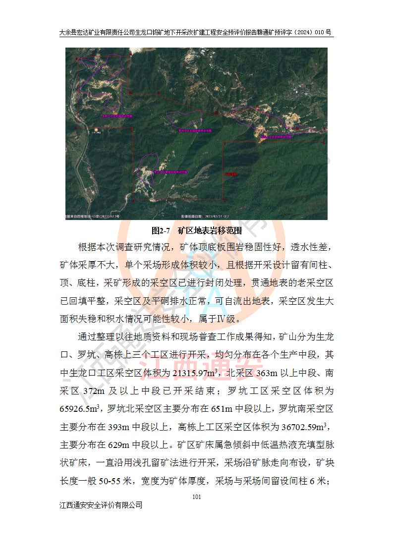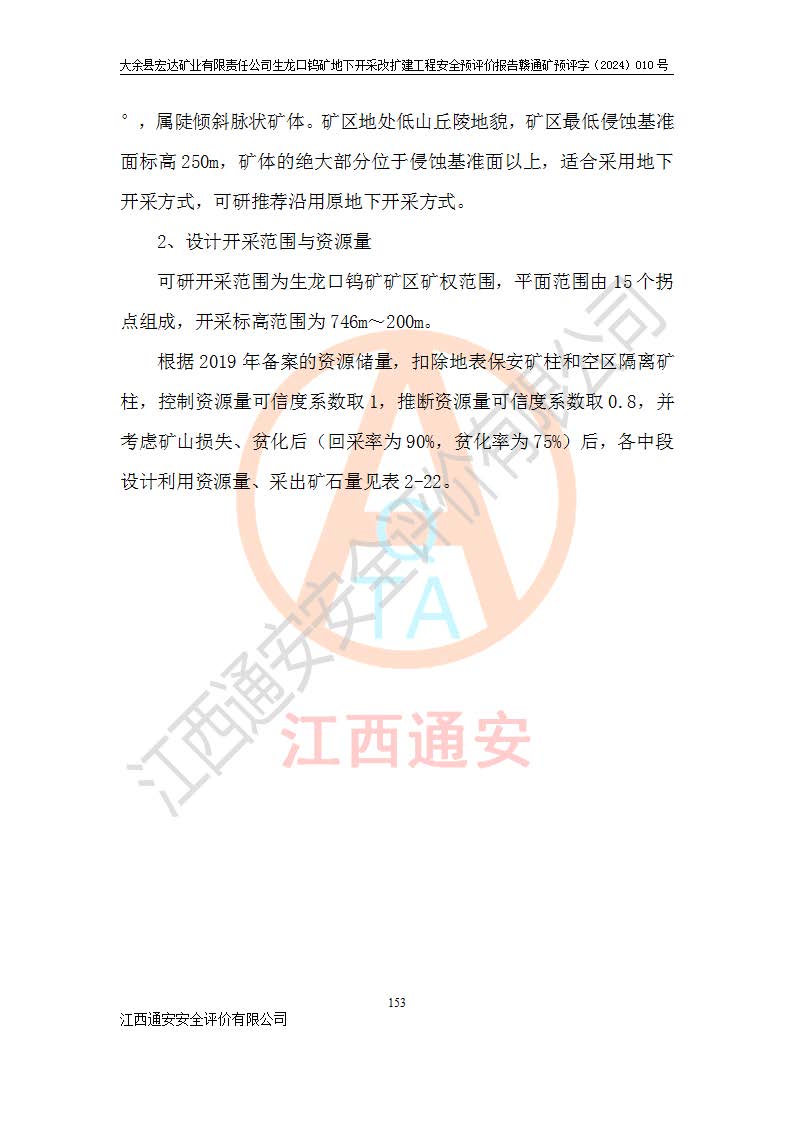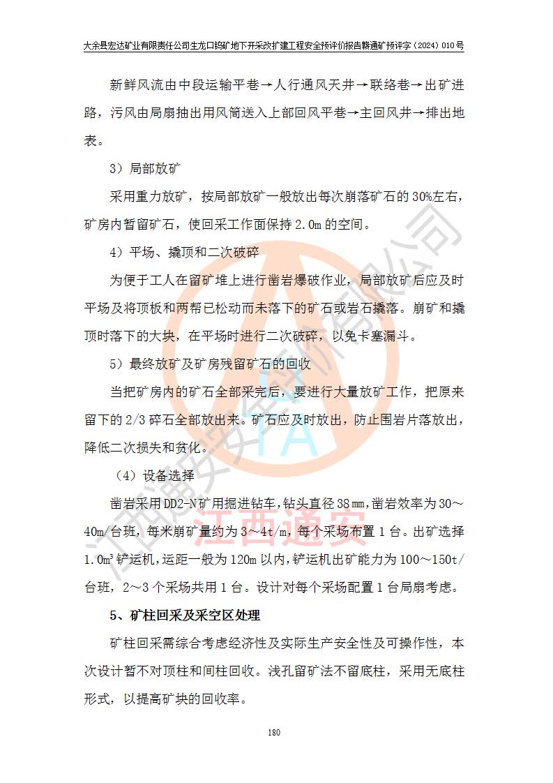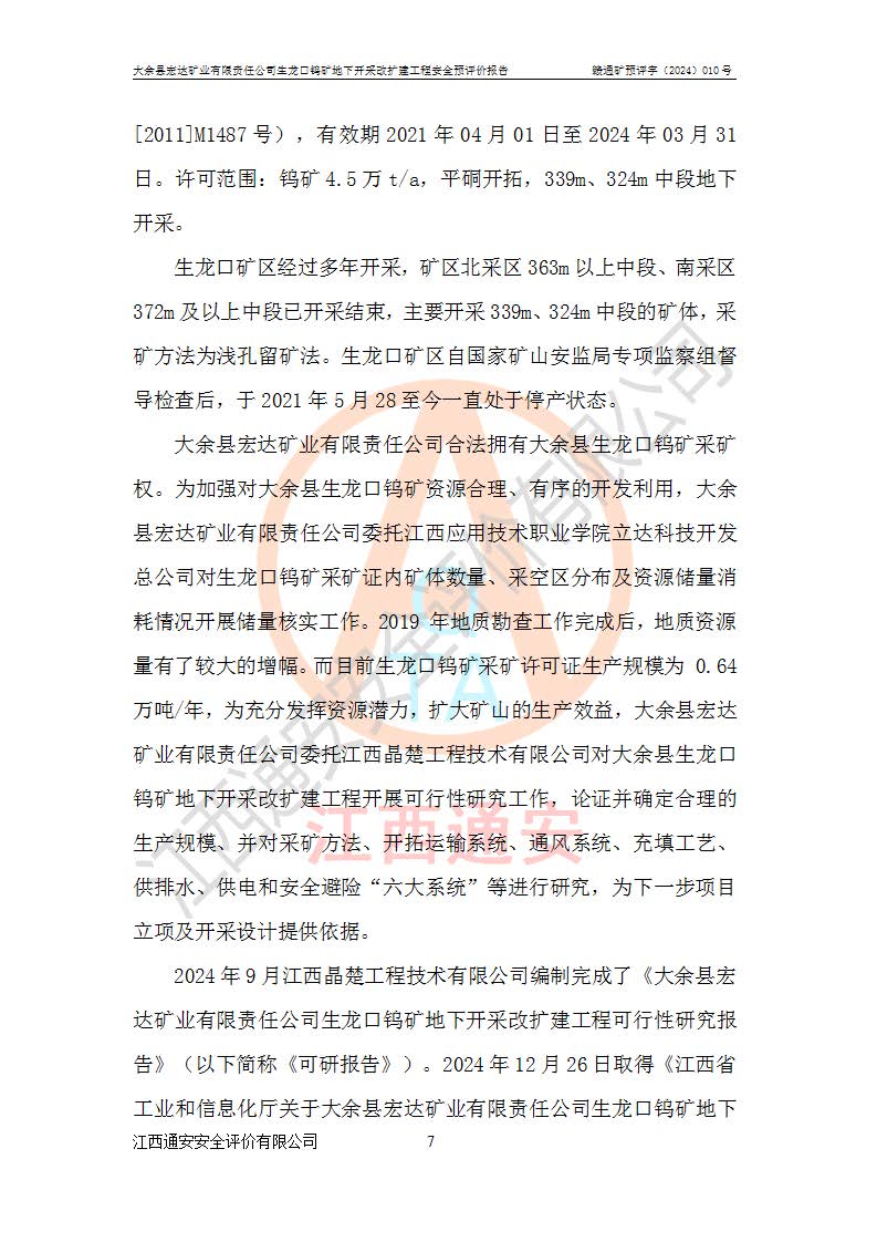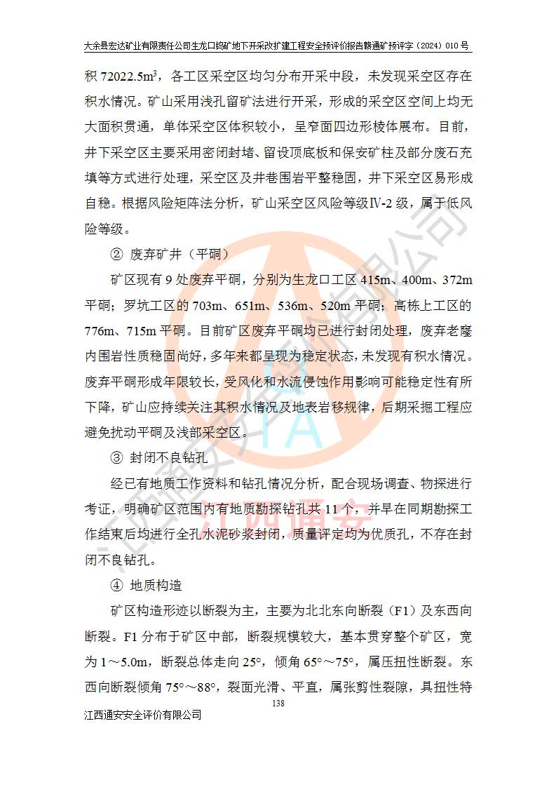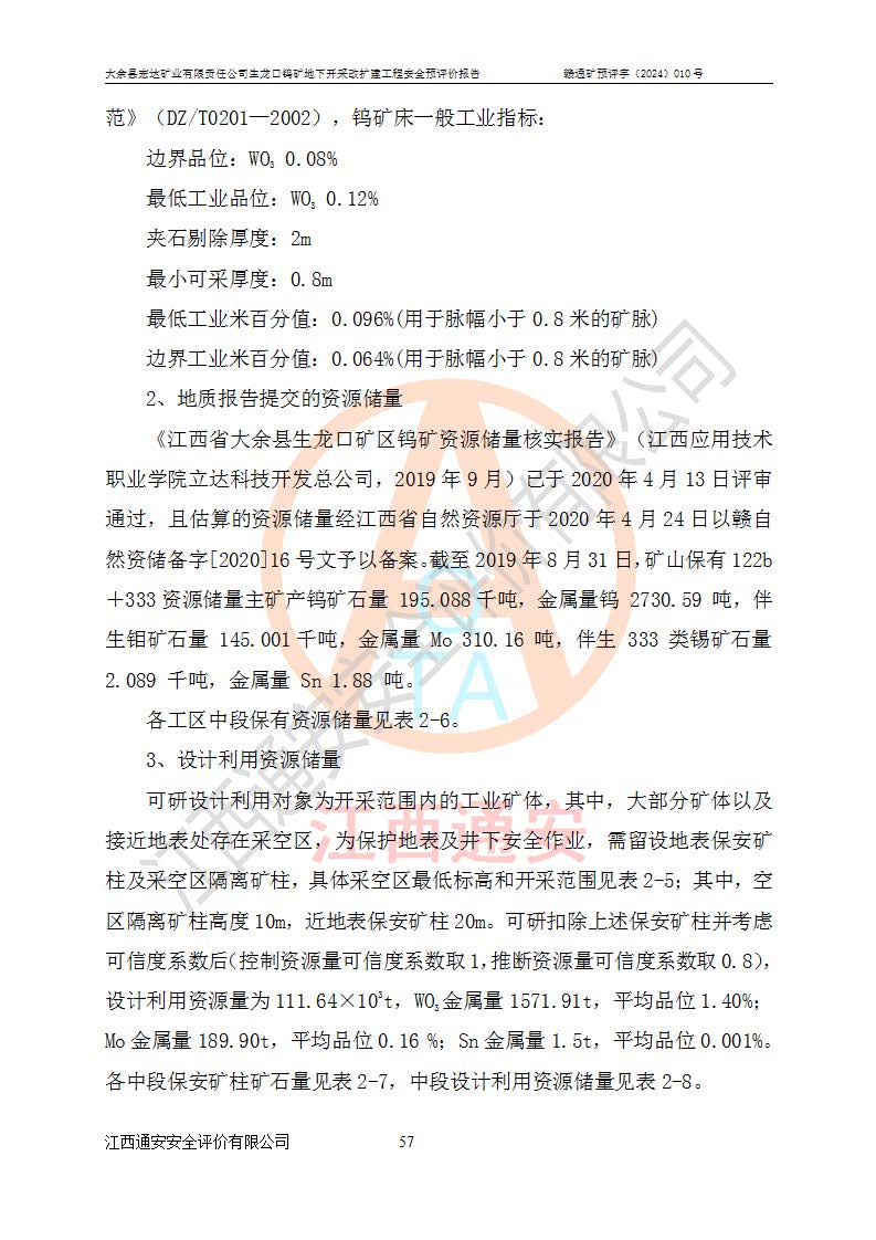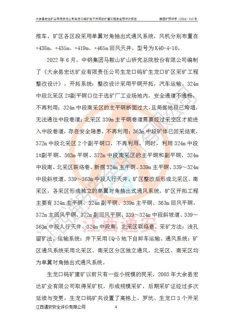 大余縣生龍口礦區(qū)鎢礦位于大余縣城北西 310°方位,距大余縣城直距 12 **,西接生龍口,北接蕩坪礦,南鄰黃木坑、西華山等礦區(qū),礦區(qū)正好是幾個(gè)礦區(qū)的銜接部位。隸屬大余縣浮江鄉(xiāng)管轄。其地理位置為:東經(jīng) 114°17′03″--114°20′11″;北緯 25°27′15″ --25 ° 28 ′ 10″ 。 礦 區(qū) 面 積 為5.97平方**。區(qū)內(nèi)交通較為方便,礦區(qū)東西兩側(cè)不遠(yuǎn)處均有公路通過(guò),西側(cè)為大余至崇義公路,東側(cè)為 大 余 至 蕩 坪 公路,通過(guò)這兩條公路均可向南與大余縣城與 323 國(guó)道相接,至贛州市區(qū)約100 **,往廣東省韶關(guān)贛韶高速約 150 **,向北達(dá)崇義縣城。 生龍口鎢礦建礦以前只有一些小規(guī)模的民采,2003年大余縣宏達(dá)礦業(yè)有限公司取得采礦權(quán),形成規(guī)模采礦,后期采礦證經(jīng)過(guò)多次延續(xù)與變更。生龍口鎢礦共設(shè)置了高棟上、羅坑、生龍口3個(gè)開(kāi)采工區(qū)。3個(gè)工區(qū)相距3**左右。 2024年9月江西晶楚工程技術(shù)有限公司編制完成了《大余縣宏達(dá)礦業(yè)有限責(zé)任公司生龍口鎢礦地下開(kāi)采改擴(kuò)建工程可行性研究報(bào)告》(以下簡(jiǎn)稱(chēng)《可研報(bào)告》)。2024年12月26日取得《江西省工業(yè)和信息化廳關(guān)于大余縣宏達(dá)礦業(yè)有限責(zé)任公司生龍口鎢礦地下開(kāi)采改擴(kuò)建工程核準(zhǔn)的批復(fù)》(贛工信有色〔2024〕49號(hào))。 根據(jù)《可研報(bào)告》,可研設(shè)計(jì)范圍為生龍口鎢礦礦區(qū)礦權(quán)范圍,平面范圍由15個(gè)拐點(diǎn)組成,開(kāi)采標(biāo)高范圍為746m~200m。本次開(kāi)采對(duì)象為開(kāi)采范圍內(nèi)的35條工業(yè)礦體,其中,大部分礦體以及接近地表處存在采空區(qū),為保護(hù)地表及井下安全作業(yè),需留設(shè)地表保安礦柱及采空區(qū)隔離礦柱;其中,高棟上工區(qū)V198、V197礦體因位于采空區(qū)后方,且資源量較少,暫不列為開(kāi)采對(duì)象;生龍口工區(qū)V98、V85、V84因利舊324m主平硐口,故作為保安礦柱,暫不予開(kāi)采??裳?*采用淺孔留礦嗣后充填法??裳?*采用平硐+盲斜坡道開(kāi)拓,一次性整體設(shè)計(jì),各工區(qū)礦石和廢石均通過(guò)溜井下放至相應(yīng)區(qū)段*低開(kāi)采中段、通過(guò)UK-6礦用自卸卡車(chē)裝載,利用內(nèi)部運(yùn)輸巷道和溜井運(yùn)至生龍口工區(qū)324m平硐(主運(yùn)輸巷道)集中出礦,各工區(qū)礦石、廢石分別運(yùn)至324平硐口附近的選礦廠和砂石骨料加工廠。井下中段**采用無(wú)軌運(yùn)輸。礦區(qū)采用分區(qū)通風(fēng)系統(tǒng)、每個(gè)工區(qū)采用單翼對(duì)角抽出機(jī)械式通風(fēng)方式;新風(fēng)主要從平硐口進(jìn)風(fēng),回風(fēng)井回風(fēng)。 本項(xiàng)目已經(jīng)符合編制安全預(yù)評(píng)價(jià)的前置條件,根據(jù)《中華人民共和國(guó)安全生產(chǎn)法》、《建設(shè)項(xiàng)目安全設(shè)施“三同時(shí)”監(jiān)督管理辦法》(**安全生產(chǎn)監(jiān)督管理局令第36號(hào))、《金屬非金屬礦山建設(shè)項(xiàng)目安全設(shè)施目錄》(**安全生產(chǎn)監(jiān)督管理總局令第75號(hào))和《**礦山安全監(jiān)察局關(guān)于進(jìn)一步加強(qiáng)非煤礦山安全生產(chǎn)行政許可工作的通知》(礦安〔2024〕70號(hào))的規(guī)定,大余縣宏達(dá)礦業(yè)有限責(zé)任公司2024年10月8日委托江西通安安全評(píng)價(jià)有限公司對(duì)其生龍口鎢礦地下開(kāi)采改擴(kuò)建工程進(jìn)行安全預(yù)評(píng)價(jià)。 |