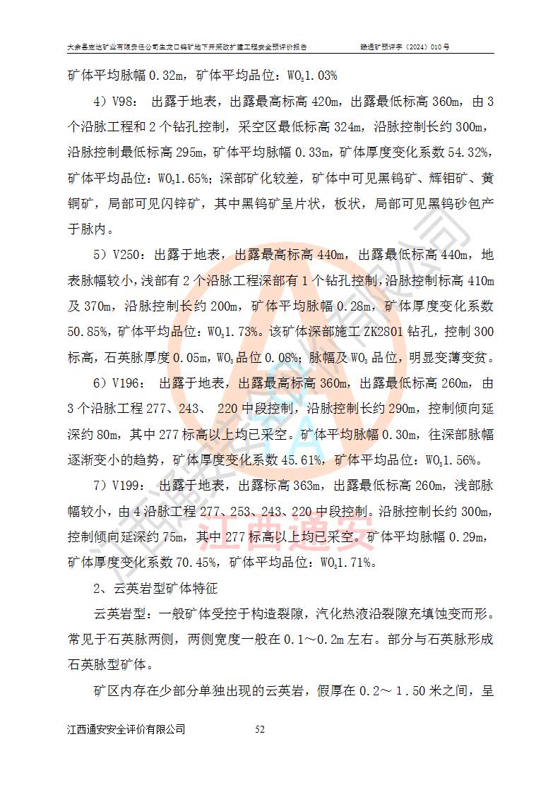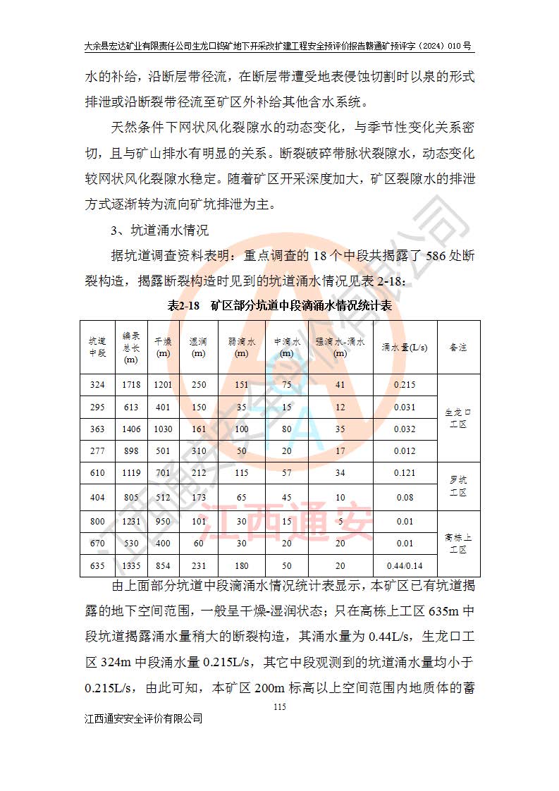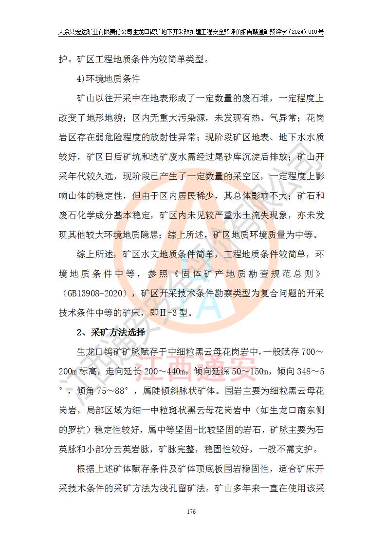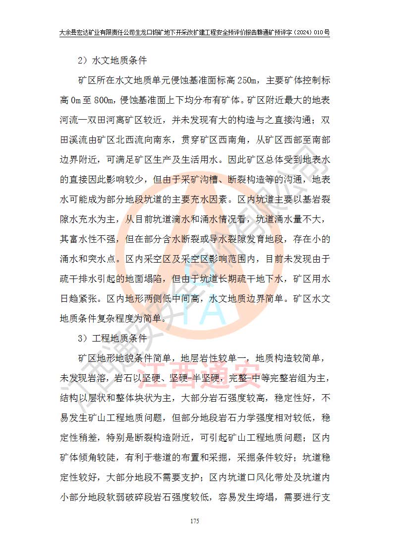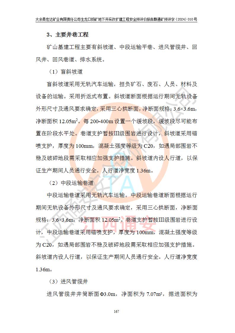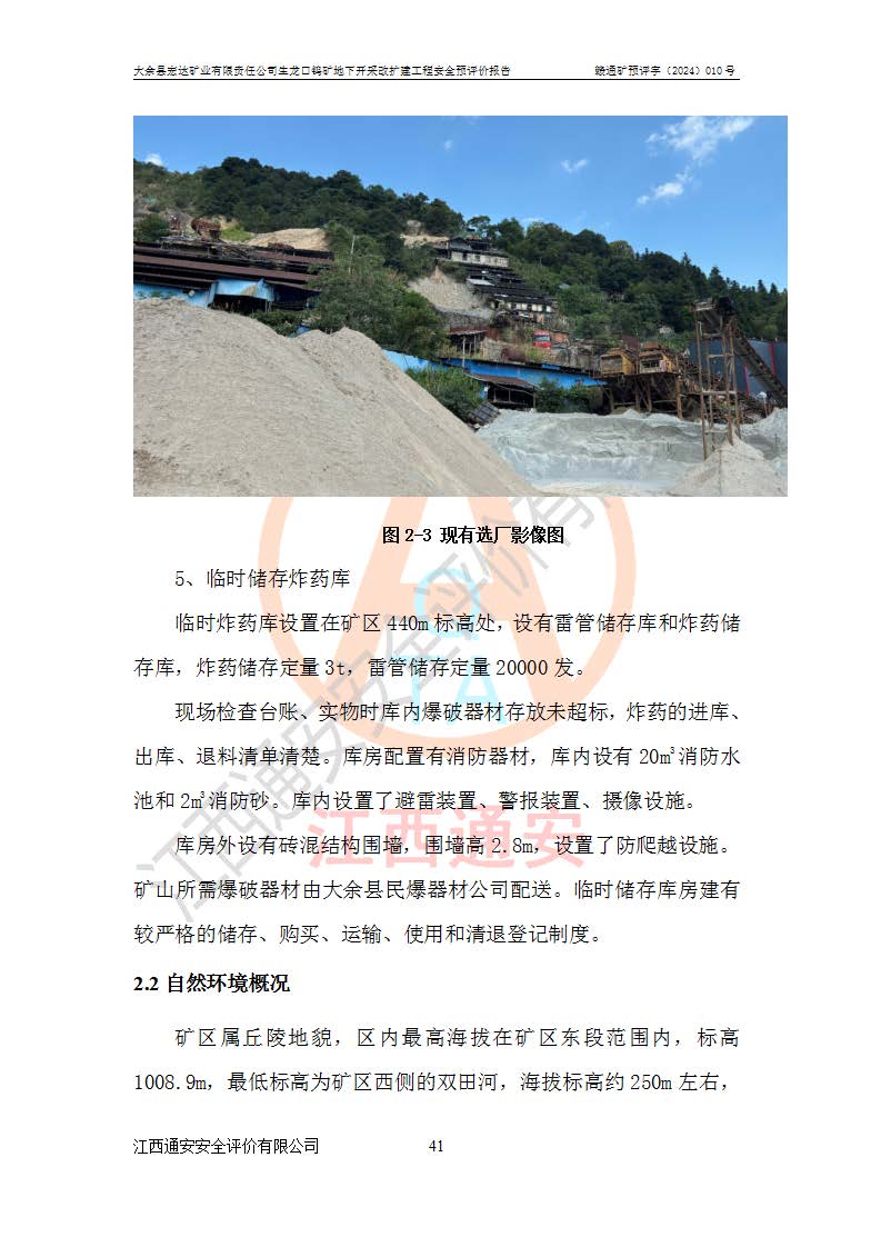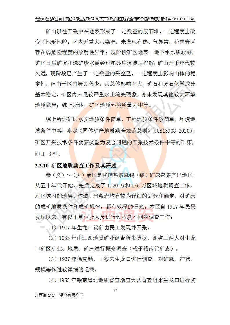大余縣生龍口礦區(qū)鎢礦位于大余縣城北西 310°方位,距大余縣城直距 12 **,西接生龍口,北接蕩坪礦,南鄰黃木坑、西華山等礦區(qū),礦區(qū)正好是幾個(gè)礦區(qū)的銜接部位。隸屬大余縣浮江鄉(xiāng)管轄。其地理位置為:東經(jīng) 114°17′03″--114°20′11″;北緯 25°27′15″ --25 ° 28 ′ 10″ 。 礦 區(qū) 面 積 為5.97平方**。區(qū)內(nèi)交通較為方便,礦區(qū)東西兩側(cè)不遠(yuǎn)處均有公路通過(guò),西側(cè)為大余至崇義公路,東側(cè)為 大 余 至 蕩 坪 公路,通過(guò)這兩條公路均可向南與大余縣城與 323 國(guó)道相接,至贛州市區(qū)約100 **,往廣東省韶關(guān)贛韶高速約 150 **,向北達(dá)崇義縣城。 生龍口鎢礦建礦以前只有一些小規(guī)模的民采,2003年大余縣宏達(dá)礦業(yè)有限公司取得采礦權(quán),形成規(guī)模采礦,后期采礦證經(jīng)過(guò)多次延續(xù)與變更。生龍口鎢礦共設(shè)置了高棟上、羅坑、生龍口3個(gè)開(kāi)采工區(qū)。3個(gè)工區(qū)相距3**左右。 2024年9月江西晶楚工程技術(shù)有限公司編制完成了《大余縣宏達(dá)礦業(yè)有限責(zé)任公司生龍口鎢礦地下開(kāi)采改擴(kuò)建工程可行性研究報(bào)告》(以下簡(jiǎn)稱(chēng)《可研報(bào)告》)。2024年12月26日取得《江西省工業(yè)和信息化廳關(guān)于大余縣宏達(dá)礦業(yè)有限責(zé)任公司生龍口鎢礦地下開(kāi)采改擴(kuò)建工程核準(zhǔn)的批復(fù)》(贛工信有色〔2024〕49號(hào))。 根據(jù)《可研報(bào)告》,可研設(shè)計(jì)范圍為生龍口鎢礦礦區(qū)礦權(quán)范圍,平面范圍由15個(gè)拐點(diǎn)組成,開(kāi)采標(biāo)高范圍為746m~200m。本次開(kāi)采對(duì)象為開(kāi)采范圍內(nèi)的35條工業(yè)礦體,其中,大部分礦體以及接近地表處存在采空區(qū),為保護(hù)地表及井下安全作業(yè),需留設(shè)地表保安礦柱及采空區(qū)隔離礦柱;其中,高棟上工區(qū)V198、V197礦體因位于采空區(qū)后方,且資源量較少,暫不列為開(kāi)采對(duì)象;生龍口工區(qū)V98、V85、V84因利舊324m主平硐口,故作為保安礦柱,暫不予開(kāi)采??裳?*采用淺孔留礦嗣后充填法??裳?*采用平硐+盲斜坡道開(kāi)拓,一次性整體設(shè)計(jì),各工區(qū)礦石和廢石均通過(guò)溜井下放至相應(yīng)區(qū)段*低開(kāi)采中段、通過(guò)UK-6礦用自卸卡車(chē)裝載,利用內(nèi)部運(yùn)輸巷道和溜井運(yùn)至生龍口工區(qū)324m平硐(主運(yùn)輸巷道)集中出礦,各工區(qū)礦石、廢石分別運(yùn)至324平硐口附近的選礦廠和砂石骨料加工廠。井下中段**采用無(wú)軌運(yùn)輸。礦區(qū)采用分區(qū)通風(fēng)系統(tǒng)、每個(gè)工區(qū)采用單翼對(duì)角抽出機(jī)械式通風(fēng)方式;新風(fēng)主要從平硐口進(jìn)風(fēng),回風(fēng)井回風(fēng)。 本項(xiàng)目已經(jīng)符合編制安全預(yù)評(píng)價(jià)的前置條件,根據(jù)《中華人民共和國(guó)安全生產(chǎn)法》、《建設(shè)項(xiàng)目安全設(shè)施“三同時(shí)”監(jiān)督管理辦法》(**安全生產(chǎn)監(jiān)督管理局令第36號(hào))、《金屬非金屬礦山建設(shè)項(xiàng)目安全設(shè)施目錄》(**安全生產(chǎn)監(jiān)督管理總局令第75號(hào))和《**礦山安全監(jiān)察局關(guān)于進(jìn)一步加強(qiáng)非煤礦山安全生產(chǎn)行政許可工作的通知》(礦安〔2024〕70號(hào))的規(guī)定,大余縣宏達(dá)礦業(yè)有限責(zé)任公司2024年10月8日委托江西通安安全評(píng)價(jià)有限公司對(duì)其生龍口鎢礦地下開(kāi)采改擴(kuò)建工程進(jìn)行安全預(yù)評(píng)價(jià)。 |