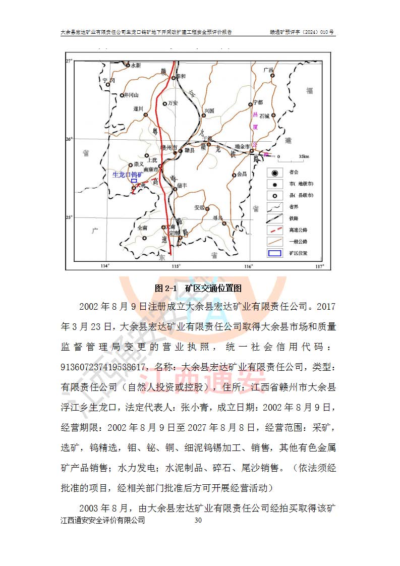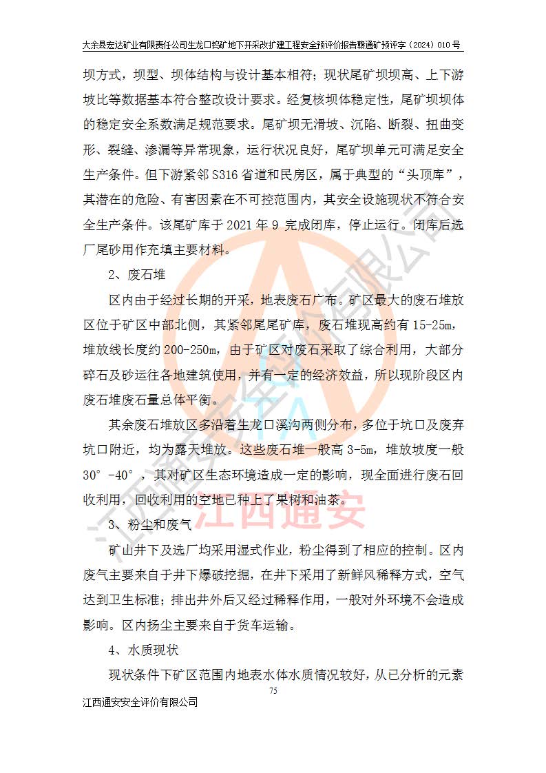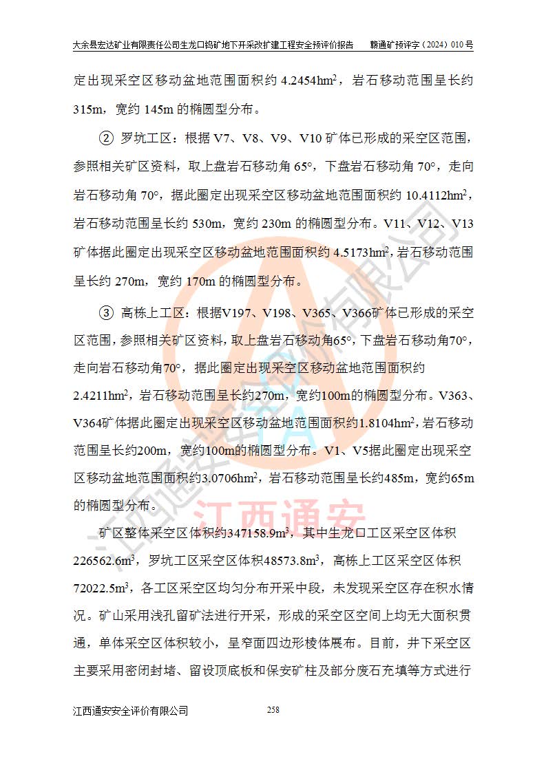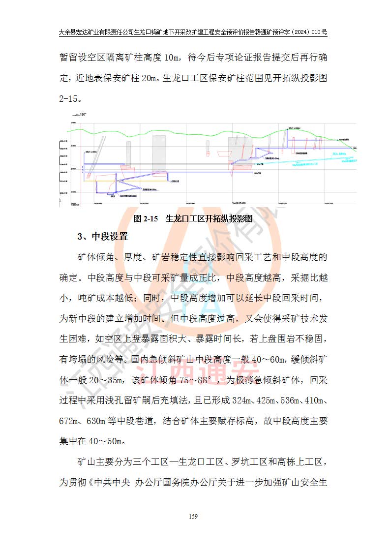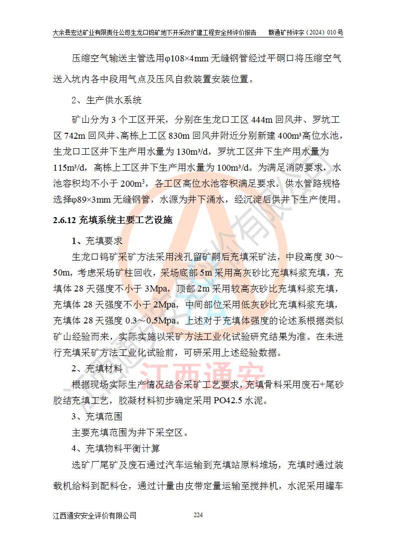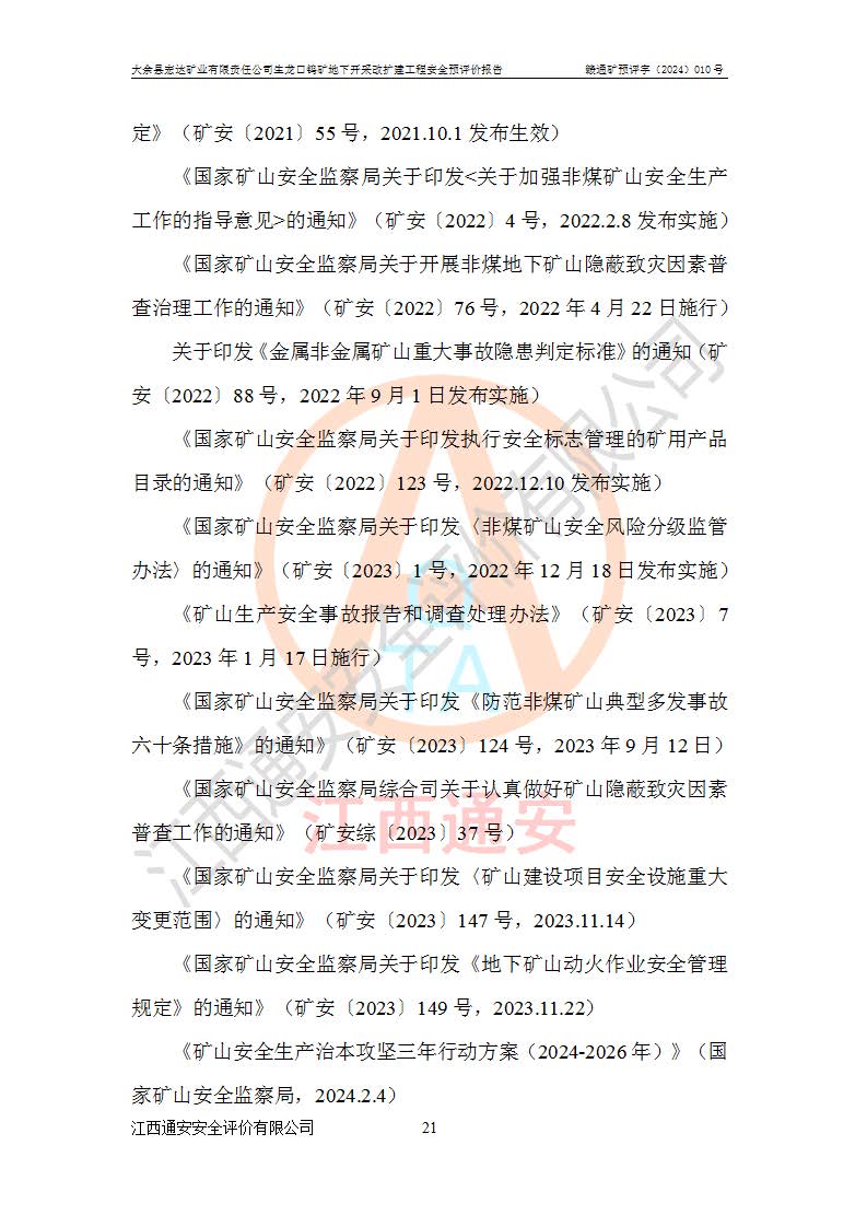 大余縣生龍口礦區(qū)鎢礦位于大余縣城北西 310°方位,距大余縣城直距 12 **,西接生龍口,北接蕩坪礦,南鄰黃木坑、西華山等礦區(qū),礦區(qū)正好是幾個(gè)礦區(qū)的銜接部位。隸屬大余縣浮江鄉(xiāng)管轄。其地理位置為:東經(jīng) 114°17′03″--114°20′11″;北緯 25°27′15″ --25 ° 28 ′ 10″ 。 礦 區(qū) 面 積 為5.97平方**。區(qū)內(nèi)交通較為方便,礦區(qū)東西兩側(cè)不遠(yuǎn)處均有公路通過(guò),西側(cè)為大余至崇義公路,東側(cè)為 大 余 至 蕩 坪 公路,通過(guò)這兩條公路均可向南與大余縣城與 323 國(guó)道相接,至贛州市區(qū)約100 **,往廣東省韶關(guān)贛韶高速約 150 **,向北達(dá)崇義縣城。 生龍口鎢礦建礦以前只有一些小規(guī)模的民采,2003年大余縣宏達(dá)礦業(yè)有限公司取得采礦權(quán),形成規(guī)模采礦,后期采礦證經(jīng)過(guò)多次延續(xù)與變更。生龍口鎢礦共設(shè)置了高棟上、羅坑、生龍口3個(gè)開(kāi)采工區(qū)。3個(gè)工區(qū)相距3**左右。 2024年9月江西晶楚工程技術(shù)有限公司編制完成了《大余縣宏達(dá)礦業(yè)有限責(zé)任公司生龍口鎢礦地下開(kāi)采改擴(kuò)建工程可行性研究報(bào)告》(以下簡(jiǎn)稱(chēng)《可研報(bào)告》)。2024年12月26日取得《江西省工業(yè)和信息化廳關(guān)于大余縣宏達(dá)礦業(yè)有限責(zé)任公司生龍口鎢礦地下開(kāi)采改擴(kuò)建工程核準(zhǔn)的批復(fù)》(贛工信有色〔2024〕49號(hào))。 根據(jù)《可研報(bào)告》,可研設(shè)計(jì)范圍為生龍口鎢礦礦區(qū)礦權(quán)范圍,平面范圍由15個(gè)拐點(diǎn)組成,開(kāi)采標(biāo)高范圍為746m~200m。本次開(kāi)采對(duì)象為開(kāi)采范圍內(nèi)的35條工業(yè)礦體,其中,大部分礦體以及接近地表處存在采空區(qū),為保護(hù)地表及井下安全作業(yè),需留設(shè)地表保安礦柱及采空區(qū)隔離礦柱;其中,高棟上工區(qū)V198、V197礦體因位于采空區(qū)后方,且資源量較少,暫不列為開(kāi)采對(duì)象;生龍口工區(qū)V98、V85、V84因利舊324m主平硐口,故作為保安礦柱,暫不予開(kāi)采??裳?*采用淺孔留礦嗣后充填法??裳?*采用平硐+盲斜坡道開(kāi)拓,一次性整體設(shè)計(jì),各工區(qū)礦石和廢石均通過(guò)溜井下放至相應(yīng)區(qū)段*低開(kāi)采中段、通過(guò)UK-6礦用自卸卡車(chē)裝載,利用內(nèi)部運(yùn)輸巷道和溜井運(yùn)至生龍口工區(qū)324m平硐(主運(yùn)輸巷道)集中出礦,各工區(qū)礦石、廢石分別運(yùn)至324平硐口附近的選礦廠和砂石骨料加工廠。井下中段**采用無(wú)軌運(yùn)輸。礦區(qū)采用分區(qū)通風(fēng)系統(tǒng)、每個(gè)工區(qū)采用單翼對(duì)角抽出機(jī)械式通風(fēng)方式;新風(fēng)主要從平硐口進(jìn)風(fēng),回風(fēng)井回風(fēng)。 本項(xiàng)目已經(jīng)符合編制安全預(yù)評(píng)價(jià)的前置條件,根據(jù)《中華人民共和國(guó)安全生產(chǎn)法》、《建設(shè)項(xiàng)目安全設(shè)施“三同時(shí)”監(jiān)督管理辦法》(**安全生產(chǎn)監(jiān)督管理局令第36號(hào))、《金屬非金屬礦山建設(shè)項(xiàng)目安全設(shè)施目錄》(**安全生產(chǎn)監(jiān)督管理總局令第75號(hào))和《**礦山安全監(jiān)察局關(guān)于進(jìn)一步加強(qiáng)非煤礦山安全生產(chǎn)行政許可工作的通知》(礦安〔2024〕70號(hào))的規(guī)定,大余縣宏達(dá)礦業(yè)有限責(zé)任公司2024年10月8日委托江西通安安全評(píng)價(jià)有限公司對(duì)其生龍口鎢礦地下開(kāi)采改擴(kuò)建工程進(jìn)行安全預(yù)評(píng)價(jià)。 |