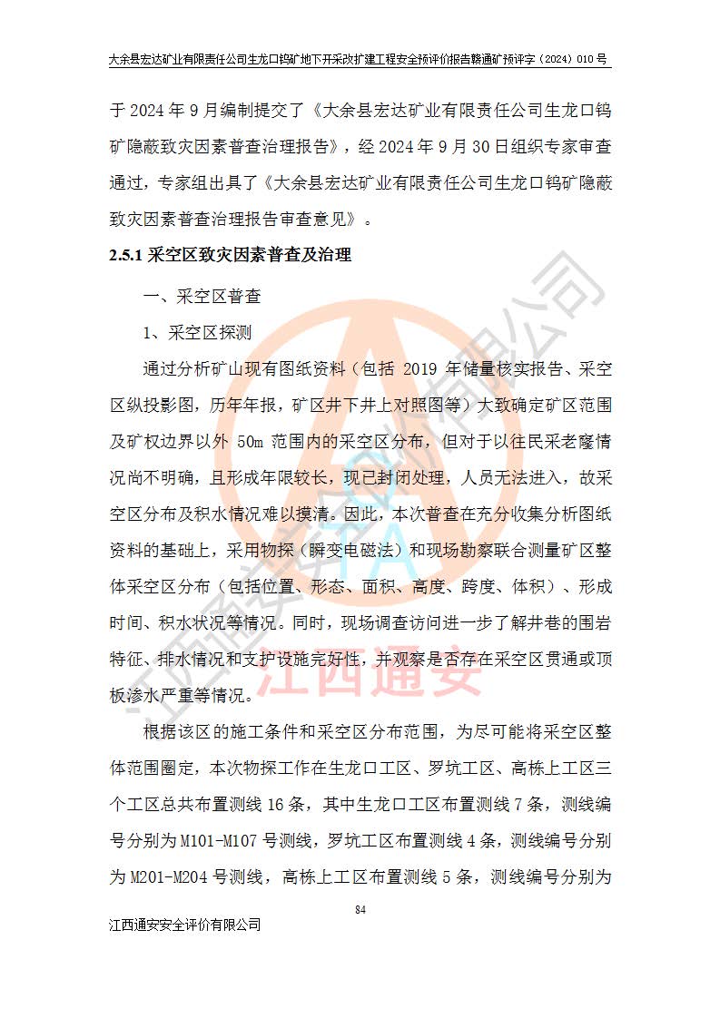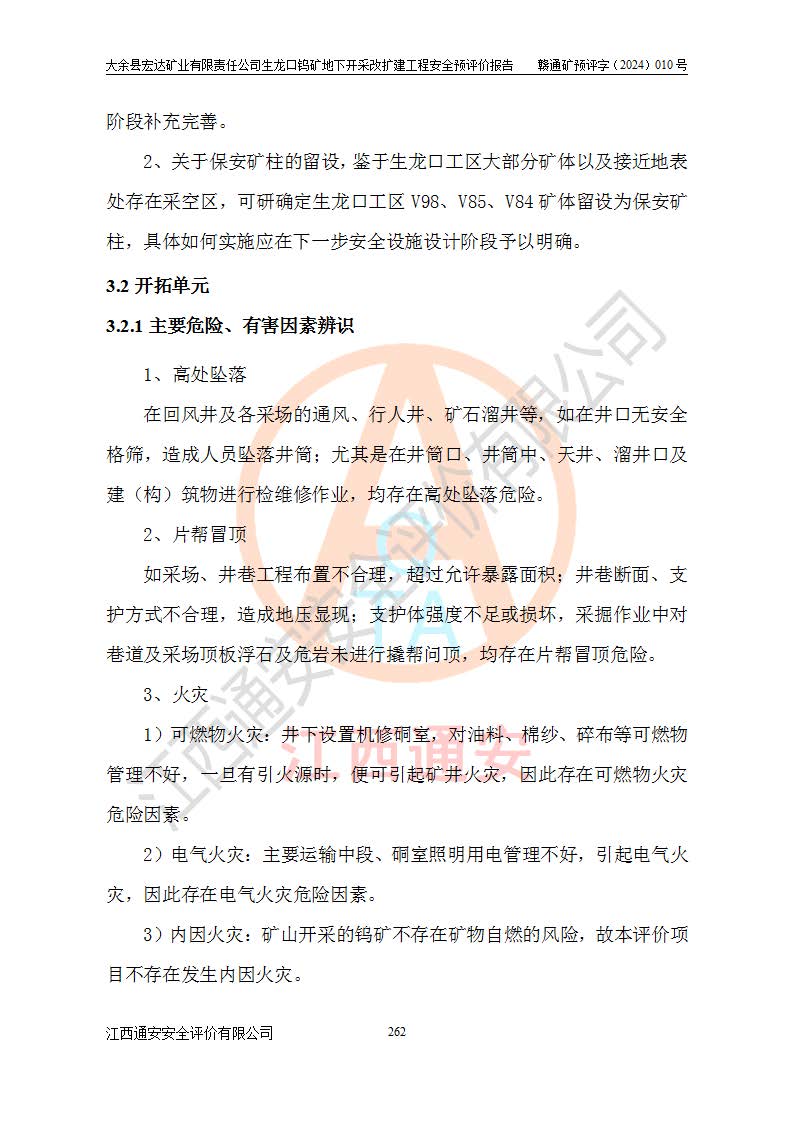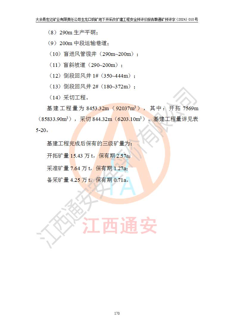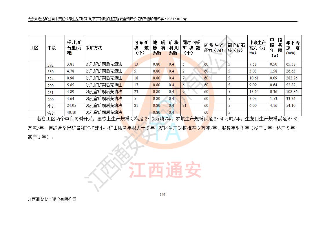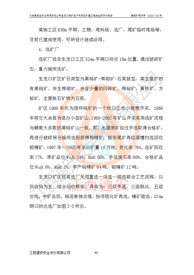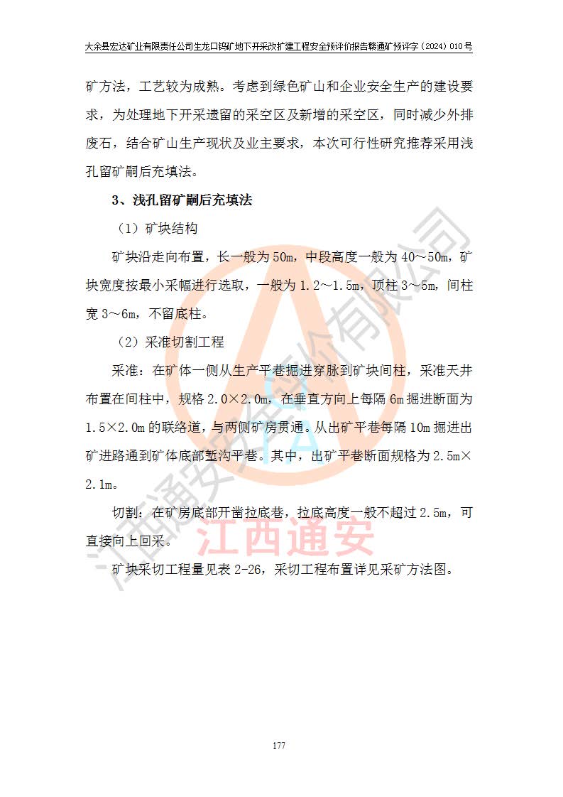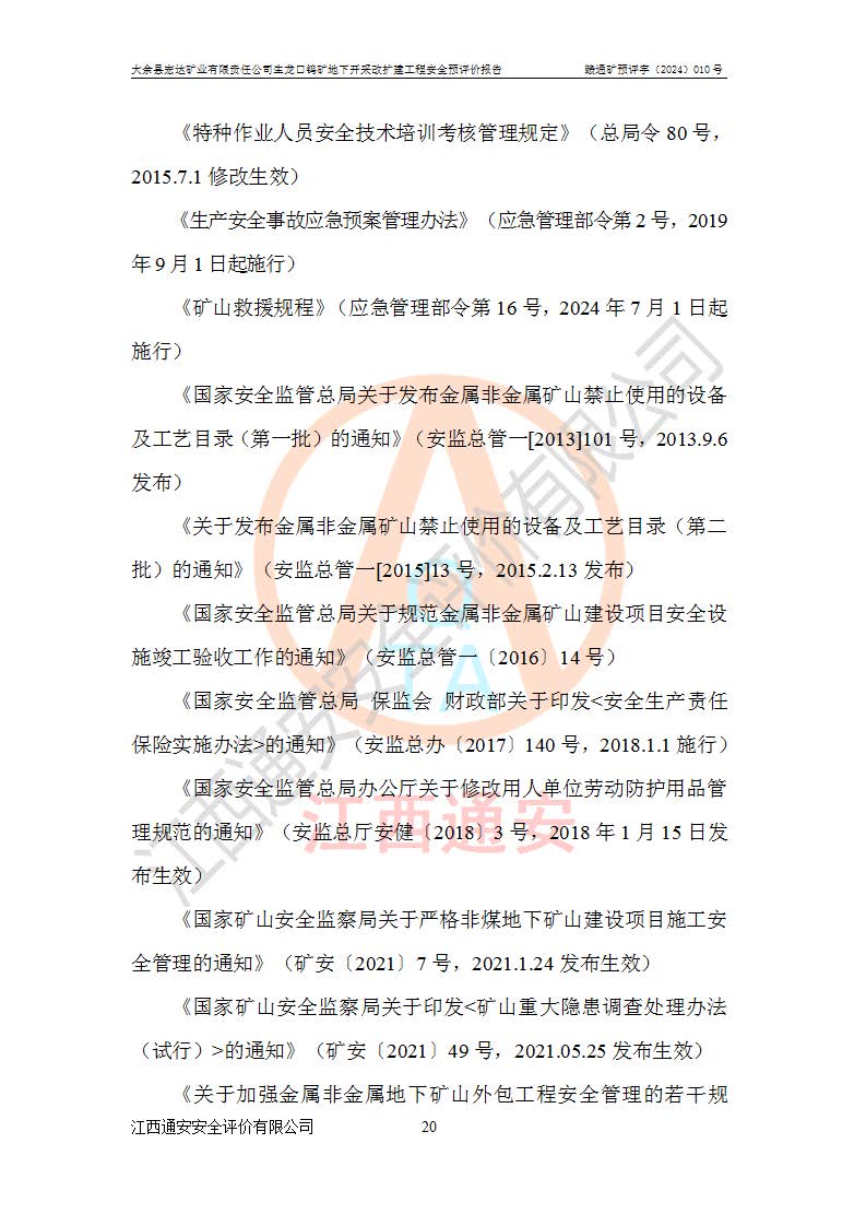 大余縣生龍口礦區(qū)鎢礦位于大余縣城北西 310°方位,距大余縣城直距 12 **,西接生龍口,北接蕩坪礦,南鄰黃木坑、西華山等礦區(qū),礦區(qū)正好是幾個(gè)礦區(qū)的銜接部位。隸屬大余縣浮江鄉(xiāng)管轄。其地理位置為:東經(jīng) 114°17′03″--114°20′11″;北緯 25°27′15″ --25 ° 28 ′ 10″ 。 礦 區(qū) 面 積 為5.97平方**。區(qū)內(nèi)交通較為方便,礦區(qū)東西兩側(cè)不遠(yuǎn)處均有公路通過(guò),西側(cè)為大余至崇義公路,東側(cè)為 大 余 至 蕩 坪 公路,通過(guò)這兩條公路均可向南與大余縣城與 323 國(guó)道相接,至贛州市區(qū)約100 **,往廣東省韶關(guān)贛韶高速約 150 **,向北達(dá)崇義縣城。 生龍口鎢礦建礦以前只有一些小規(guī)模的民采,2003年大余縣宏達(dá)礦業(yè)有限公司取得采礦權(quán),形成規(guī)模采礦,后期采礦證經(jīng)過(guò)多次延續(xù)與變更。生龍口鎢礦共設(shè)置了高棟上、羅坑、生龍口3個(gè)開(kāi)采工區(qū)。3個(gè)工區(qū)相距3**左右。 2024年9月江西晶楚工程技術(shù)有限公司編制完成了《大余縣宏達(dá)礦業(yè)有限責(zé)任公司生龍口鎢礦地下開(kāi)采改擴(kuò)建工程可行性研究報(bào)告》(以下簡(jiǎn)稱(chēng)《可研報(bào)告》)。2024年12月26日取得《江西省工業(yè)和信息化廳關(guān)于大余縣宏達(dá)礦業(yè)有限責(zé)任公司生龍口鎢礦地下開(kāi)采改擴(kuò)建工程核準(zhǔn)的批復(fù)》(贛工信有色〔2024〕49號(hào))。 根據(jù)《可研報(bào)告》,可研設(shè)計(jì)范圍為生龍口鎢礦礦區(qū)礦權(quán)范圍,平面范圍由15個(gè)拐點(diǎn)組成,開(kāi)采標(biāo)高范圍為746m~200m。本次開(kāi)采對(duì)象為開(kāi)采范圍內(nèi)的35條工業(yè)礦體,其中,大部分礦體以及接近地表處存在采空區(qū),為保護(hù)地表及井下安全作業(yè),需留設(shè)地表保安礦柱及采空區(qū)隔離礦柱;其中,高棟上工區(qū)V198、V197礦體因位于采空區(qū)后方,且資源量較少,暫不列為開(kāi)采對(duì)象;生龍口工區(qū)V98、V85、V84因利舊324m主平硐口,故作為保安礦柱,暫不予開(kāi)采??裳?*采用淺孔留礦嗣后充填法??裳?*采用平硐+盲斜坡道開(kāi)拓,一次性整體設(shè)計(jì),各工區(qū)礦石和廢石均通過(guò)溜井下放至相應(yīng)區(qū)段*低開(kāi)采中段、通過(guò)UK-6礦用自卸卡車(chē)裝載,利用內(nèi)部運(yùn)輸巷道和溜井運(yùn)至生龍口工區(qū)324m平硐(主運(yùn)輸巷道)集中出礦,各工區(qū)礦石、廢石分別運(yùn)至324平硐口附近的選礦廠和砂石骨料加工廠。井下中段**采用無(wú)軌運(yùn)輸。礦區(qū)采用分區(qū)通風(fēng)系統(tǒng)、每個(gè)工區(qū)采用單翼對(duì)角抽出機(jī)械式通風(fēng)方式;新風(fēng)主要從平硐口進(jìn)風(fēng),回風(fēng)井回風(fēng)。 本項(xiàng)目已經(jīng)符合編制安全預(yù)評(píng)價(jià)的前置條件,根據(jù)《中華人民共和國(guó)安全生產(chǎn)法》、《建設(shè)項(xiàng)目安全設(shè)施“三同時(shí)”監(jiān)督管理辦法》(**安全生產(chǎn)監(jiān)督管理局令第36號(hào))、《金屬非金屬礦山建設(shè)項(xiàng)目安全設(shè)施目錄》(**安全生產(chǎn)監(jiān)督管理總局令第75號(hào))和《**礦山安全監(jiān)察局關(guān)于進(jìn)一步加強(qiáng)非煤礦山安全生產(chǎn)行政許可工作的通知》(礦安〔2024〕70號(hào))的規(guī)定,大余縣宏達(dá)礦業(yè)有限責(zé)任公司2024年10月8日委托江西通安安全評(píng)價(jià)有限公司對(duì)其生龍口鎢礦地下開(kāi)采改擴(kuò)建工程進(jìn)行安全預(yù)評(píng)價(jià)。 |