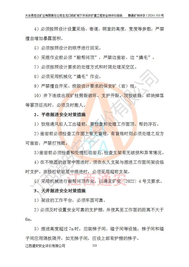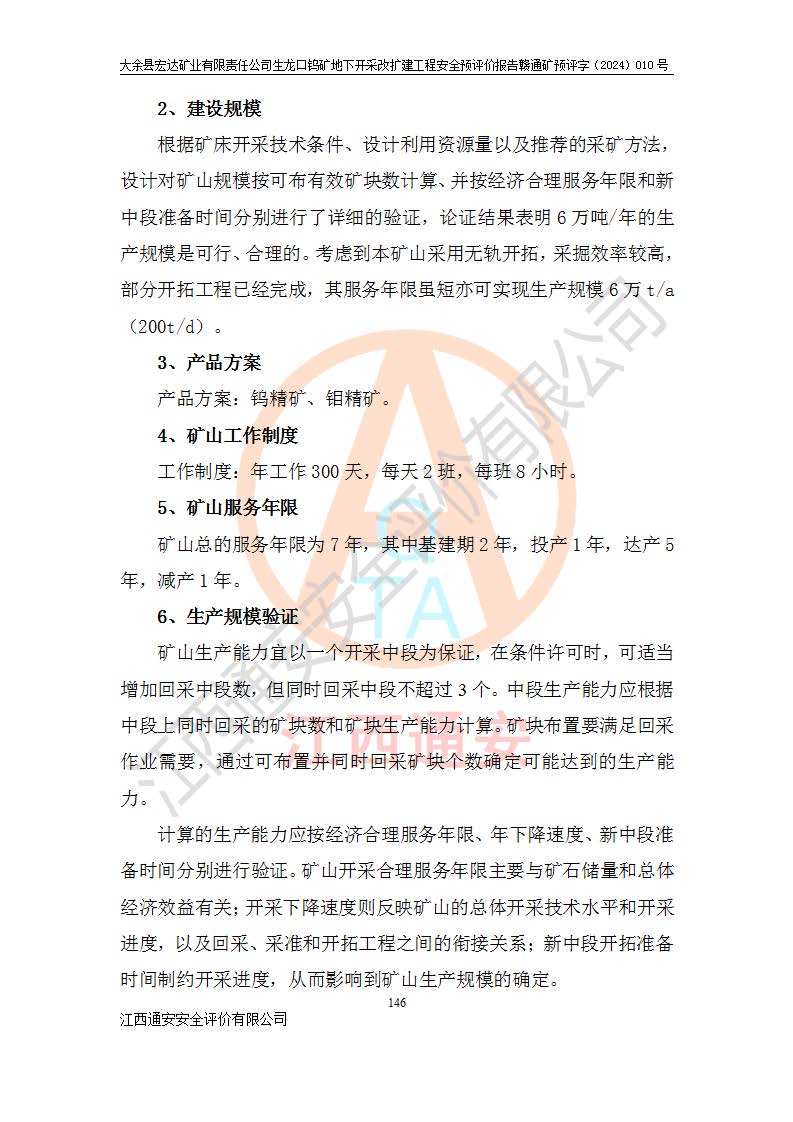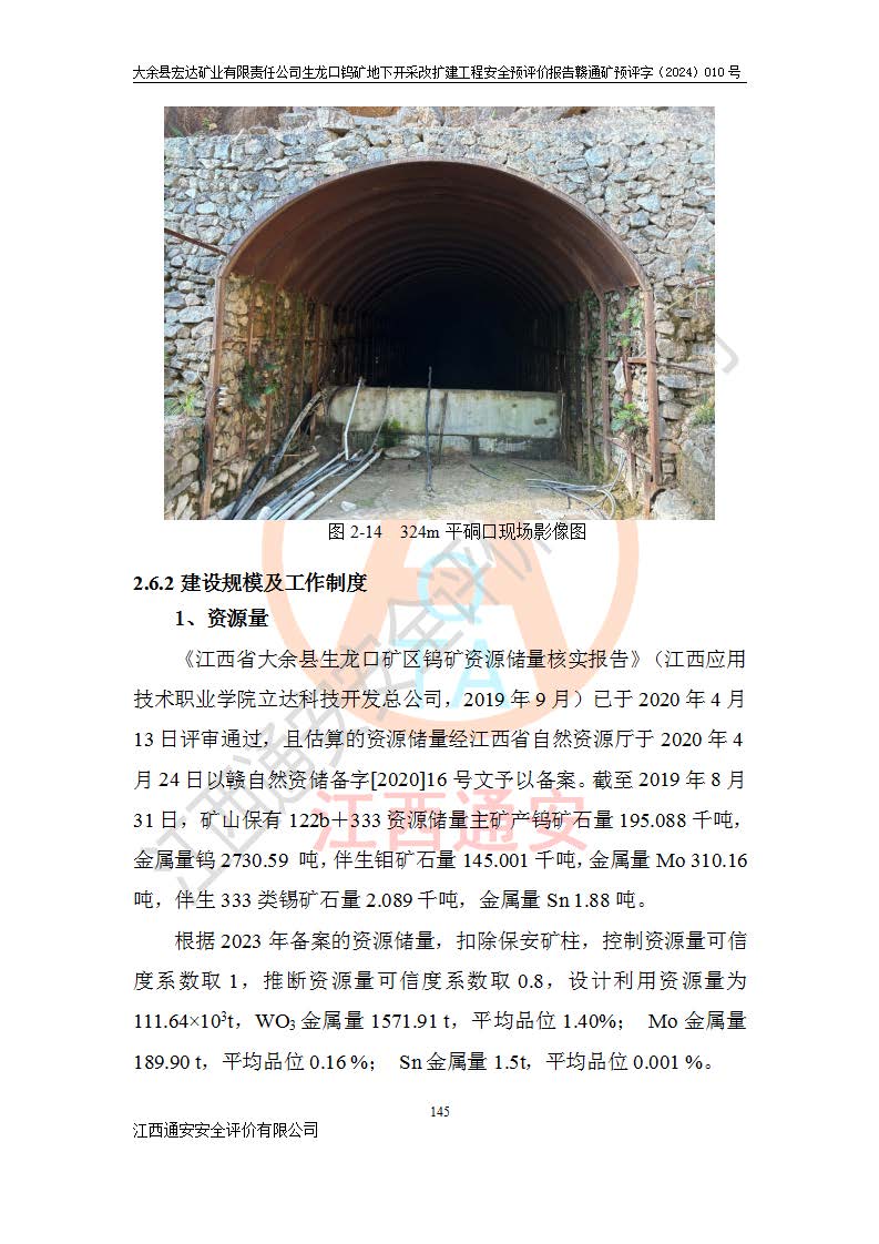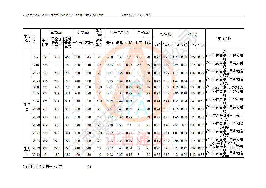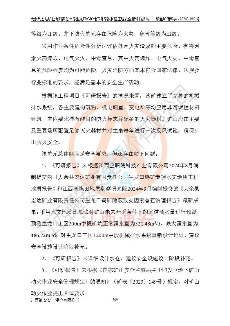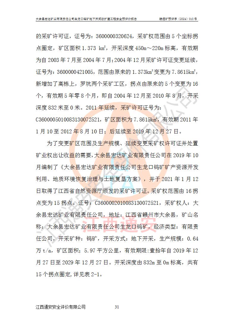 大余縣生龍口礦區(qū)鎢礦位于大余縣城北西 310°方位,距大余縣城直距 12 **,西接生龍口,北接蕩坪礦,南鄰黃木坑、西華山等礦區(qū),礦區(qū)正好是幾個(gè)礦區(qū)的銜接部位。隸屬大余縣浮江鄉(xiāng)管轄。其地理位置為:東經(jīng) 114°17′03″--114°20′11″;北緯 25°27′15″ --25 ° 28 ′ 10″ 。 礦 區(qū) 面 積 為5.97平方**。區(qū)內(nèi)交通較為方便,礦區(qū)東西兩側(cè)不遠(yuǎn)處均有公路通過(guò),西側(cè)為大余至崇義公路,東側(cè)為 大 余 至 蕩 坪 公路,通過(guò)這兩條公路均可向南與大余縣城與 323 國(guó)道相接,至贛州市區(qū)約100 **,往廣東省韶關(guān)贛韶高速約 150 **,向北達(dá)崇義縣城。 生龍口鎢礦建礦以前只有一些小規(guī)模的民采,2003年大余縣宏達(dá)礦業(yè)有限公司取得采礦權(quán),形成規(guī)模采礦,后期采礦證經(jīng)過(guò)多次延續(xù)與變更。生龍口鎢礦共設(shè)置了高棟上、羅坑、生龍口3個(gè)開(kāi)采工區(qū)。3個(gè)工區(qū)相距3**左右。 2024年9月江西晶楚工程技術(shù)有限公司編制完成了《大余縣宏達(dá)礦業(yè)有限責(zé)任公司生龍口鎢礦地下開(kāi)采改擴(kuò)建工程可行性研究報(bào)告》(以下簡(jiǎn)稱(chēng)《可研報(bào)告》)。2024年12月26日取得《江西省工業(yè)和信息化廳關(guān)于大余縣宏達(dá)礦業(yè)有限責(zé)任公司生龍口鎢礦地下開(kāi)采改擴(kuò)建工程核準(zhǔn)的批復(fù)》(贛工信有色〔2024〕49號(hào))。 根據(jù)《可研報(bào)告》,可研設(shè)計(jì)范圍為生龍口鎢礦礦區(qū)礦權(quán)范圍,平面范圍由15個(gè)拐點(diǎn)組成,開(kāi)采標(biāo)高范圍為746m~200m。本次開(kāi)采對(duì)象為開(kāi)采范圍內(nèi)的35條工業(yè)礦體,其中,大部分礦體以及接近地表處存在采空區(qū),為保護(hù)地表及井下安全作業(yè),需留設(shè)地表保安礦柱及采空區(qū)隔離礦柱;其中,高棟上工區(qū)V198、V197礦體因位于采空區(qū)后方,且資源量較少,暫不列為開(kāi)采對(duì)象;生龍口工區(qū)V98、V85、V84因利舊324m主平硐口,故作為保安礦柱,暫不予開(kāi)采??裳?*采用淺孔留礦嗣后充填法??裳?*采用平硐+盲斜坡道開(kāi)拓,一次性整體設(shè)計(jì),各工區(qū)礦石和廢石均通過(guò)溜井下放至相應(yīng)區(qū)段*低開(kāi)采中段、通過(guò)UK-6礦用自卸卡車(chē)裝載,利用內(nèi)部運(yùn)輸巷道和溜井運(yùn)至生龍口工區(qū)324m平硐(主運(yùn)輸巷道)集中出礦,各工區(qū)礦石、廢石分別運(yùn)至324平硐口附近的選礦廠和砂石骨料加工廠。井下中段**采用無(wú)軌運(yùn)輸。礦區(qū)采用分區(qū)通風(fēng)系統(tǒng)、每個(gè)工區(qū)采用單翼對(duì)角抽出機(jī)械式通風(fēng)方式;新風(fēng)主要從平硐口進(jìn)風(fēng),回風(fēng)井回風(fēng)。 本項(xiàng)目已經(jīng)符合編制安全預(yù)評(píng)價(jià)的前置條件,根據(jù)《中華人民共和國(guó)安全生產(chǎn)法》、《建設(shè)項(xiàng)目安全設(shè)施“三同時(shí)”監(jiān)督管理辦法》(**安全生產(chǎn)監(jiān)督管理局令第36號(hào))、《金屬非金屬礦山建設(shè)項(xiàng)目安全設(shè)施目錄》(**安全生產(chǎn)監(jiān)督管理總局令第75號(hào))和《**礦山安全監(jiān)察局關(guān)于進(jìn)一步加強(qiáng)非煤礦山安全生產(chǎn)行政許可工作的通知》(礦安〔2024〕70號(hào))的規(guī)定,大余縣宏達(dá)礦業(yè)有限責(zé)任公司2024年10月8日委托江西通安安全評(píng)價(jià)有限公司對(duì)其生龍口鎢礦地下開(kāi)采改擴(kuò)建工程進(jìn)行安全預(yù)評(píng)價(jià)。 |