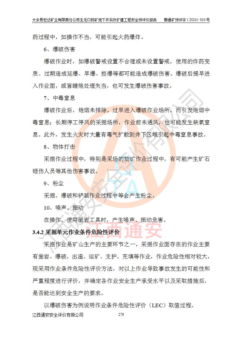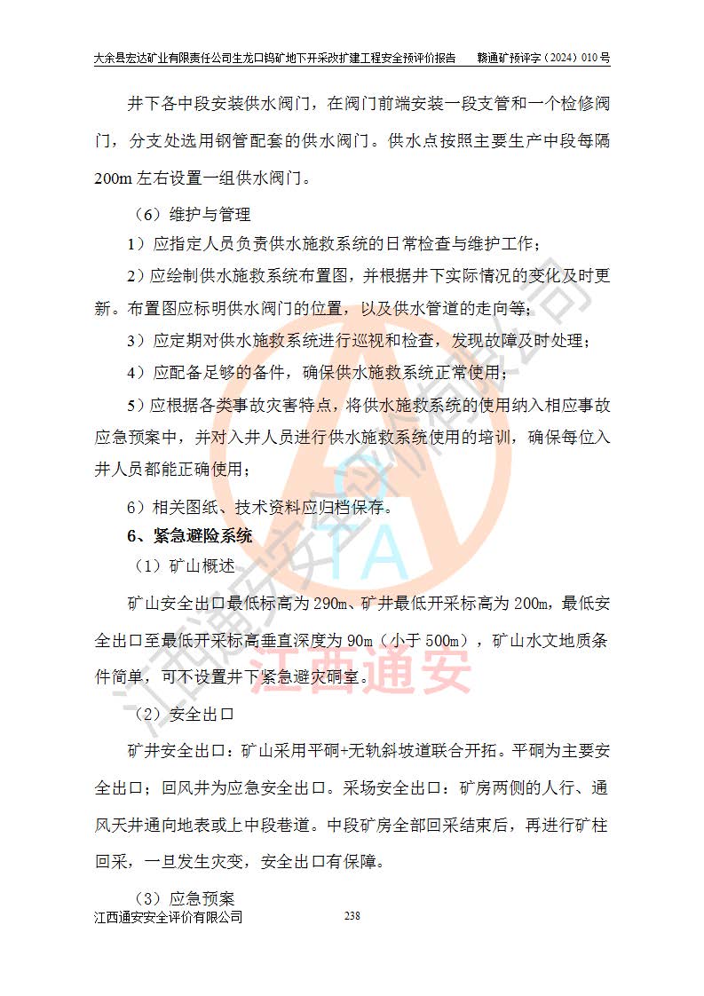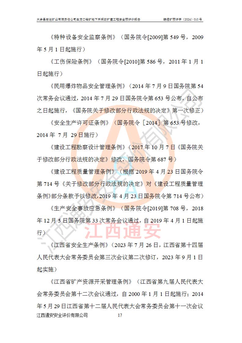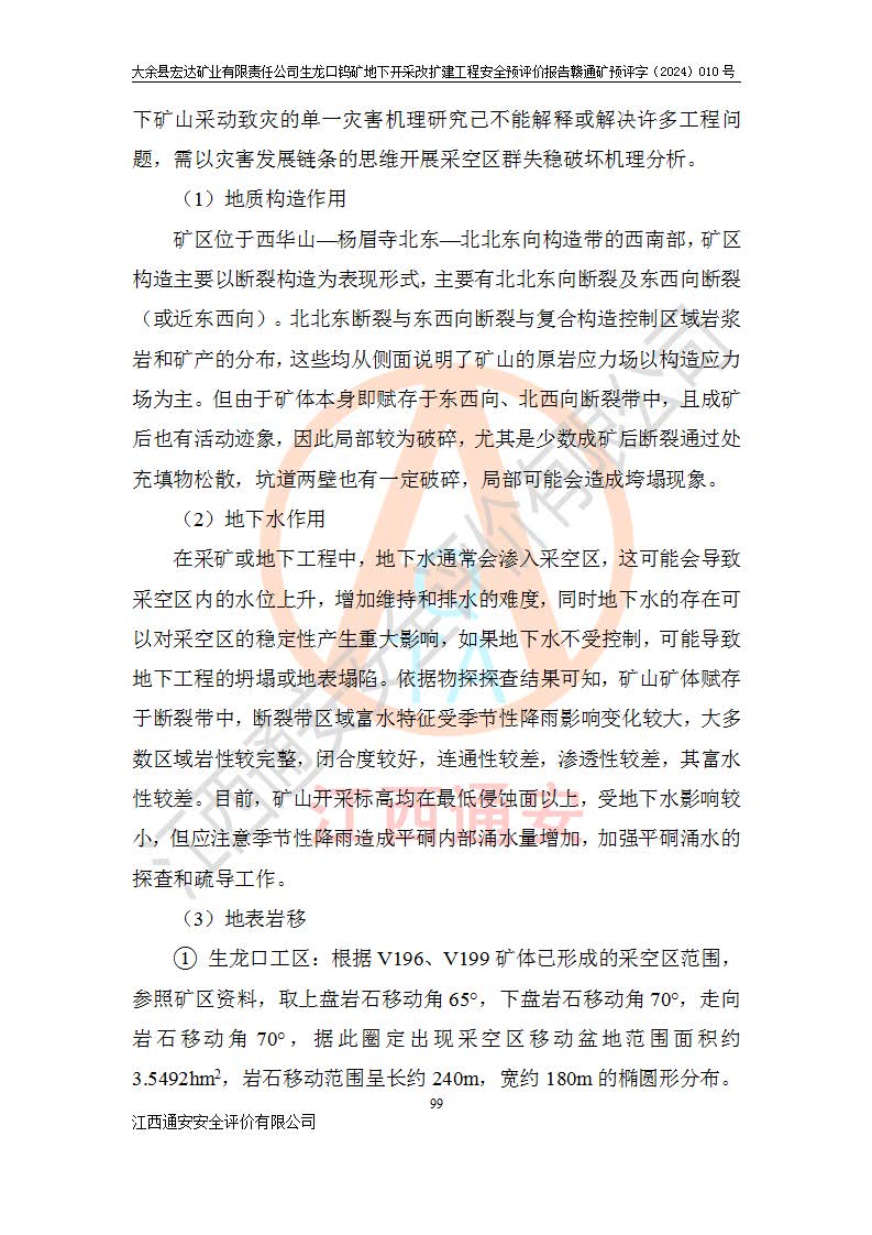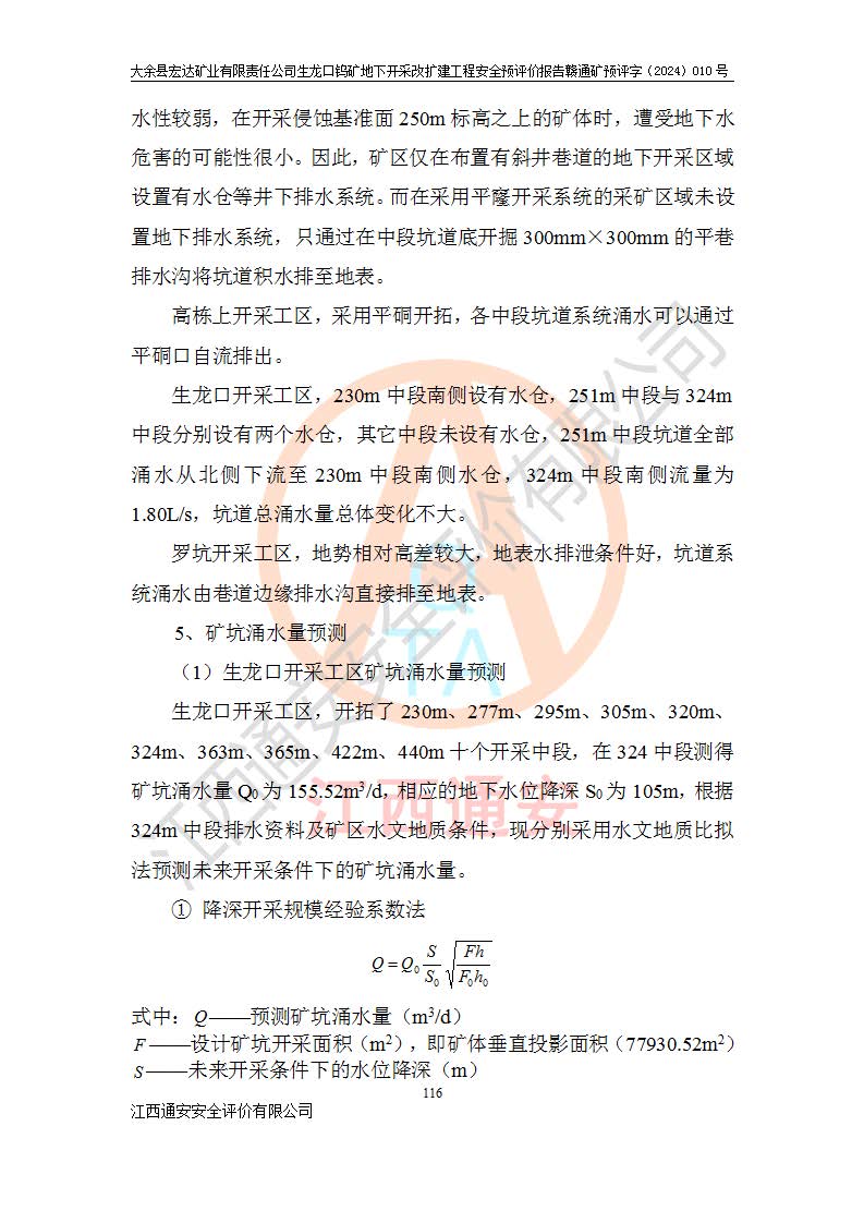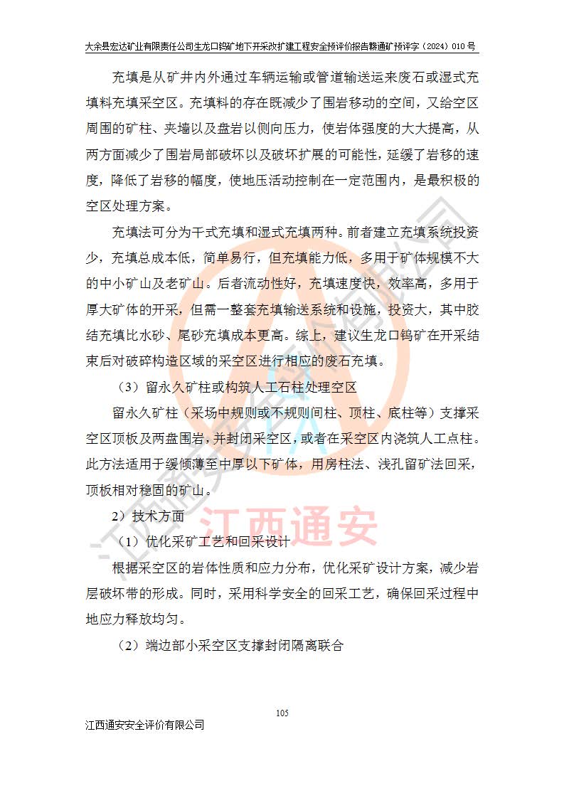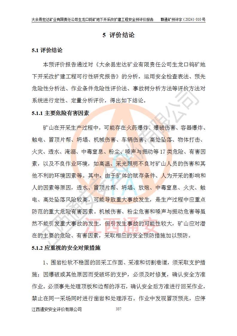 大余縣生龍口礦區(qū)鎢礦位于大余縣城北西 310°方位,距大余縣城直距 12 **,西接生龍口,北接蕩坪礦,南鄰黃木坑、西華山等礦區(qū),礦區(qū)正好是幾個(gè)礦區(qū)的銜接部位。隸屬大余縣浮江鄉(xiāng)管轄。其地理位置為:東經(jīng) 114°17′03″--114°20′11″;北緯 25°27′15″ --25 ° 28 ′ 10″ 。 礦 區(qū) 面 積 為5.97平方**。區(qū)內(nèi)交通較為方便,礦區(qū)東西兩側(cè)不遠(yuǎn)處均有公路通過(guò),西側(cè)為大余至崇義公路,東側(cè)為 大 余 至 蕩 坪 公路,通過(guò)這兩條公路均可向南與大余縣城與 323 國(guó)道相接,至贛州市區(qū)約100 **,往廣東省韶關(guān)贛韶高速約 150 **,向北達(dá)崇義縣城。 生龍口鎢礦建礦以前只有一些小規(guī)模的民采,2003年大余縣宏達(dá)礦業(yè)有限公司取得采礦權(quán),形成規(guī)模采礦,后期采礦證經(jīng)過(guò)多次延續(xù)與變更。生龍口鎢礦共設(shè)置了高棟上、羅坑、生龍口3個(gè)開(kāi)采工區(qū)。3個(gè)工區(qū)相距3**左右。 2024年9月江西晶楚工程技術(shù)有限公司編制完成了《大余縣宏達(dá)礦業(yè)有限責(zé)任公司生龍口鎢礦地下開(kāi)采改擴(kuò)建工程可行性研究報(bào)告》(以下簡(jiǎn)稱(chēng)《可研報(bào)告》)。2024年12月26日取得《江西省工業(yè)和信息化廳關(guān)于大余縣宏達(dá)礦業(yè)有限責(zé)任公司生龍口鎢礦地下開(kāi)采改擴(kuò)建工程核準(zhǔn)的批復(fù)》(贛工信有色〔2024〕49號(hào))。 根據(jù)《可研報(bào)告》,可研設(shè)計(jì)范圍為生龍口鎢礦礦區(qū)礦權(quán)范圍,平面范圍由15個(gè)拐點(diǎn)組成,開(kāi)采標(biāo)高范圍為746m~200m。本次開(kāi)采對(duì)象為開(kāi)采范圍內(nèi)的35條工業(yè)礦體,其中,大部分礦體以及接近地表處存在采空區(qū),為保護(hù)地表及井下安全作業(yè),需留設(shè)地表保安礦柱及采空區(qū)隔離礦柱;其中,高棟上工區(qū)V198、V197礦體因位于采空區(qū)后方,且資源量較少,暫不列為開(kāi)采對(duì)象;生龍口工區(qū)V98、V85、V84因利舊324m主平硐口,故作為保安礦柱,暫不予開(kāi)采??裳?*采用淺孔留礦嗣后充填法??裳?*采用平硐+盲斜坡道開(kāi)拓,一次性整體設(shè)計(jì),各工區(qū)礦石和廢石均通過(guò)溜井下放至相應(yīng)區(qū)段*低開(kāi)采中段、通過(guò)UK-6礦用自卸卡車(chē)裝載,利用內(nèi)部運(yùn)輸巷道和溜井運(yùn)至生龍口工區(qū)324m平硐(主運(yùn)輸巷道)集中出礦,各工區(qū)礦石、廢石分別運(yùn)至324平硐口附近的選礦廠和砂石骨料加工廠。井下中段**采用無(wú)軌運(yùn)輸。礦區(qū)采用分區(qū)通風(fēng)系統(tǒng)、每個(gè)工區(qū)采用單翼對(duì)角抽出機(jī)械式通風(fēng)方式;新風(fēng)主要從平硐口進(jìn)風(fēng),回風(fēng)井回風(fēng)。 本項(xiàng)目已經(jīng)符合編制安全預(yù)評(píng)價(jià)的前置條件,根據(jù)《中華人民共和國(guó)安全生產(chǎn)法》、《建設(shè)項(xiàng)目安全設(shè)施“三同時(shí)”監(jiān)督管理辦法》(**安全生產(chǎn)監(jiān)督管理局令第36號(hào))、《金屬非金屬礦山建設(shè)項(xiàng)目安全設(shè)施目錄》(**安全生產(chǎn)監(jiān)督管理總局令第75號(hào))和《**礦山安全監(jiān)察局關(guān)于進(jìn)一步加強(qiáng)非煤礦山安全生產(chǎn)行政許可工作的通知》(礦安〔2024〕70號(hào))的規(guī)定,大余縣宏達(dá)礦業(yè)有限責(zé)任公司2024年10月8日委托江西通安安全評(píng)價(jià)有限公司對(duì)其生龍口鎢礦地下開(kāi)采改擴(kuò)建工程進(jìn)行安全預(yù)評(píng)價(jià)。 |