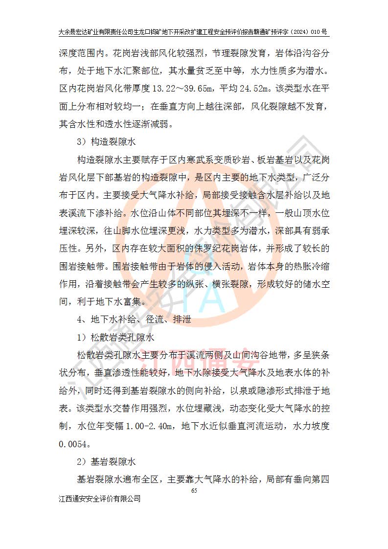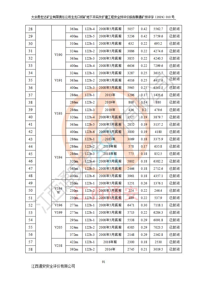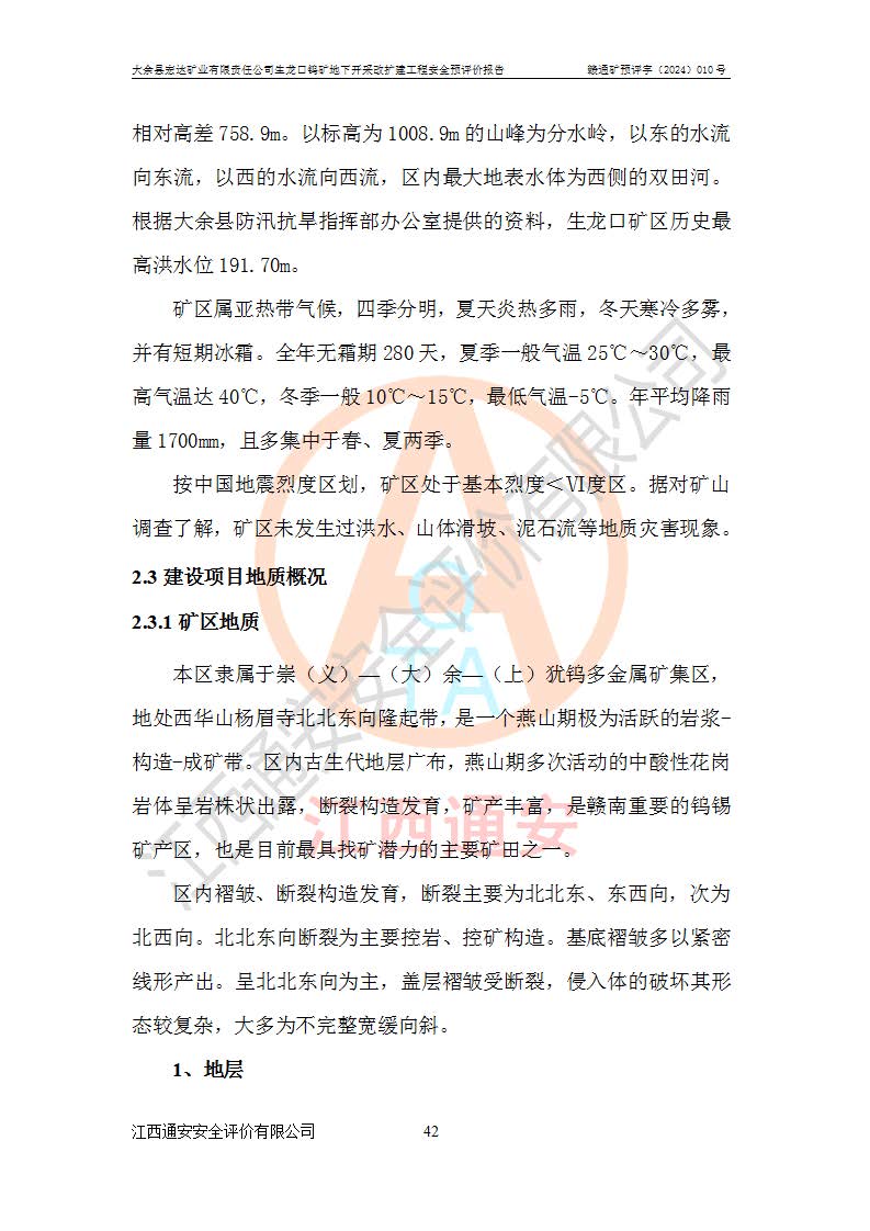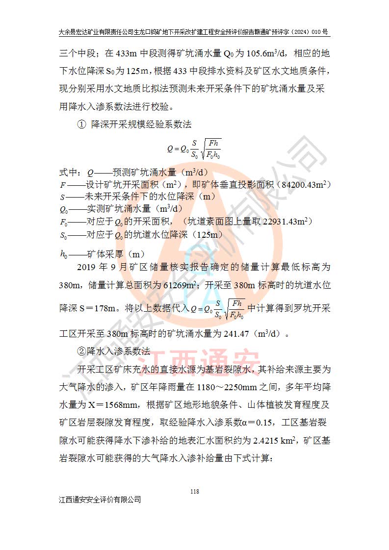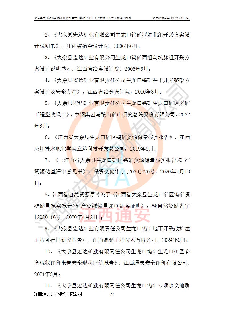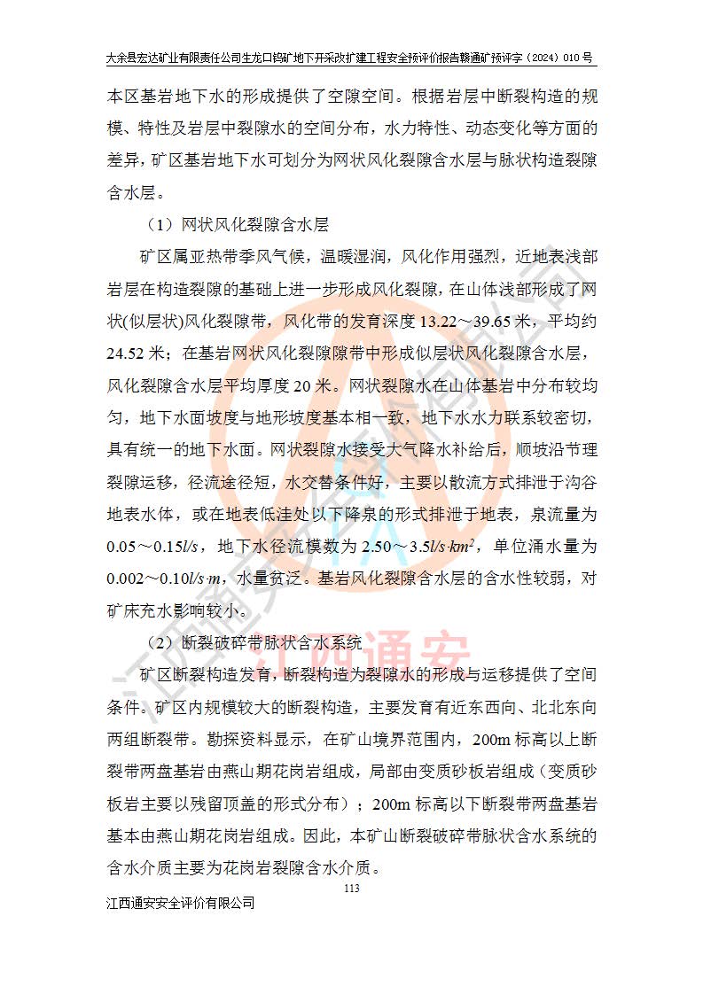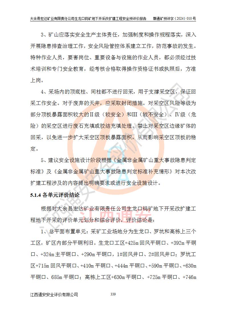 大余縣生龍口礦區(qū)鎢礦位于大余縣城北西 310°方位,距大余縣城直距 12 **,西接生龍口,北接蕩坪礦,南鄰黃木坑、西華山等礦區(qū),礦區(qū)正好是幾個(gè)礦區(qū)的銜接部位。隸屬大余縣浮江鄉(xiāng)管轄。其地理位置為:東經(jīng) 114°17′03″--114°20′11″;北緯 25°27′15″ --25 ° 28 ′ 10″ 。 礦 區(qū) 面 積 為5.97平方**。區(qū)內(nèi)交通較為方便,礦區(qū)東西兩側(cè)不遠(yuǎn)處均有公路通過(guò),西側(cè)為大余至崇義公路,東側(cè)為 大 余 至 蕩 坪 公路,通過(guò)這兩條公路均可向南與大余縣城與 323 國(guó)道相接,至贛州市區(qū)約100 **,往廣東省韶關(guān)贛韶高速約 150 **,向北達(dá)崇義縣城。 生龍口鎢礦建礦以前只有一些小規(guī)模的民采,2003年大余縣宏達(dá)礦業(yè)有限公司取得采礦權(quán),形成規(guī)模采礦,后期采礦證經(jīng)過(guò)多次延續(xù)與變更。生龍口鎢礦共設(shè)置了高棟上、羅坑、生龍口3個(gè)開(kāi)采工區(qū)。3個(gè)工區(qū)相距3**左右。 2024年9月江西晶楚工程技術(shù)有限公司編制完成了《大余縣宏達(dá)礦業(yè)有限責(zé)任公司生龍口鎢礦地下開(kāi)采改擴(kuò)建工程可行性研究報(bào)告》(以下簡(jiǎn)稱(chēng)《可研報(bào)告》)。2024年12月26日取得《江西省工業(yè)和信息化廳關(guān)于大余縣宏達(dá)礦業(yè)有限責(zé)任公司生龍口鎢礦地下開(kāi)采改擴(kuò)建工程核準(zhǔn)的批復(fù)》(贛工信有色〔2024〕49號(hào))。 根據(jù)《可研報(bào)告》,可研設(shè)計(jì)范圍為生龍口鎢礦礦區(qū)礦權(quán)范圍,平面范圍由15個(gè)拐點(diǎn)組成,開(kāi)采標(biāo)高范圍為746m~200m。本次開(kāi)采對(duì)象為開(kāi)采范圍內(nèi)的35條工業(yè)礦體,其中,大部分礦體以及接近地表處存在采空區(qū),為保護(hù)地表及井下安全作業(yè),需留設(shè)地表保安礦柱及采空區(qū)隔離礦柱;其中,高棟上工區(qū)V198、V197礦體因位于采空區(qū)后方,且資源量較少,暫不列為開(kāi)采對(duì)象;生龍口工區(qū)V98、V85、V84因利舊324m主平硐口,故作為保安礦柱,暫不予開(kāi)采??裳?*采用淺孔留礦嗣后充填法??裳?*采用平硐+盲斜坡道開(kāi)拓,一次性整體設(shè)計(jì),各工區(qū)礦石和廢石均通過(guò)溜井下放至相應(yīng)區(qū)段*低開(kāi)采中段、通過(guò)UK-6礦用自卸卡車(chē)裝載,利用內(nèi)部運(yùn)輸巷道和溜井運(yùn)至生龍口工區(qū)324m平硐(主運(yùn)輸巷道)集中出礦,各工區(qū)礦石、廢石分別運(yùn)至324平硐口附近的選礦廠和砂石骨料加工廠。井下中段**采用無(wú)軌運(yùn)輸。礦區(qū)采用分區(qū)通風(fēng)系統(tǒng)、每個(gè)工區(qū)采用單翼對(duì)角抽出機(jī)械式通風(fēng)方式;新風(fēng)主要從平硐口進(jìn)風(fēng),回風(fēng)井回風(fēng)。 本項(xiàng)目已經(jīng)符合編制安全預(yù)評(píng)價(jià)的前置條件,根據(jù)《中華人民共和國(guó)安全生產(chǎn)法》、《建設(shè)項(xiàng)目安全設(shè)施“三同時(shí)”監(jiān)督管理辦法》(**安全生產(chǎn)監(jiān)督管理局令第36號(hào))、《金屬非金屬礦山建設(shè)項(xiàng)目安全設(shè)施目錄》(**安全生產(chǎn)監(jiān)督管理總局令第75號(hào))和《**礦山安全監(jiān)察局關(guān)于進(jìn)一步加強(qiáng)非煤礦山安全生產(chǎn)行政許可工作的通知》(礦安〔2024〕70號(hào))的規(guī)定,大余縣宏達(dá)礦業(yè)有限責(zé)任公司2024年10月8日委托江西通安安全評(píng)價(jià)有限公司對(duì)其生龍口鎢礦地下開(kāi)采改擴(kuò)建工程進(jìn)行安全預(yù)評(píng)價(jià)。 |