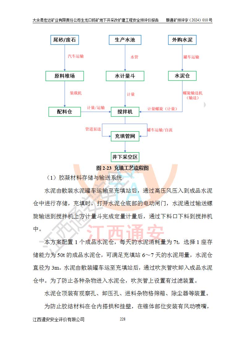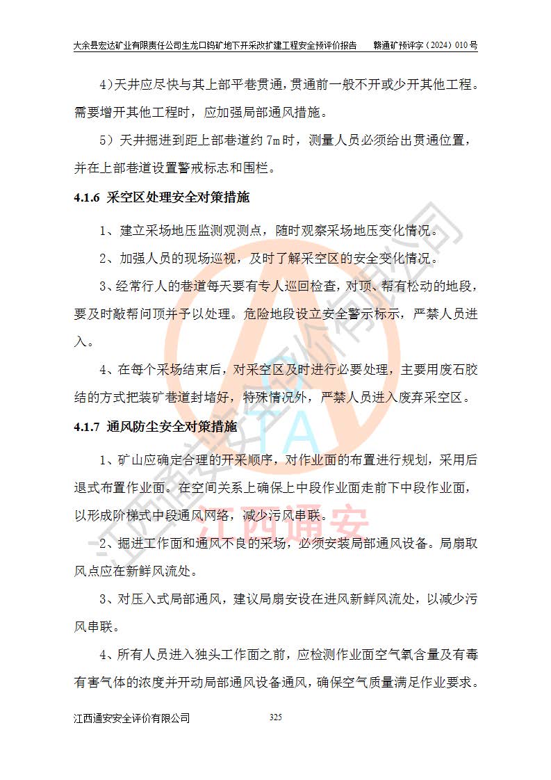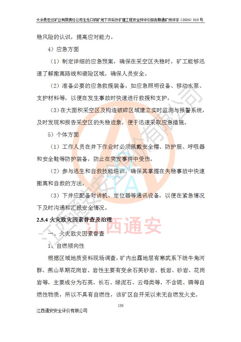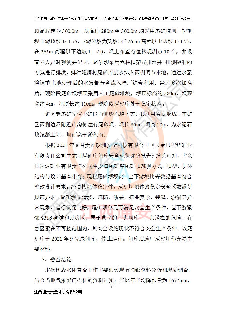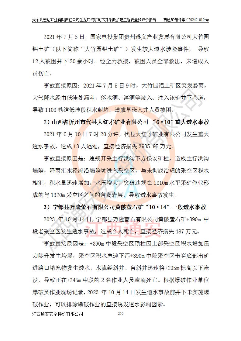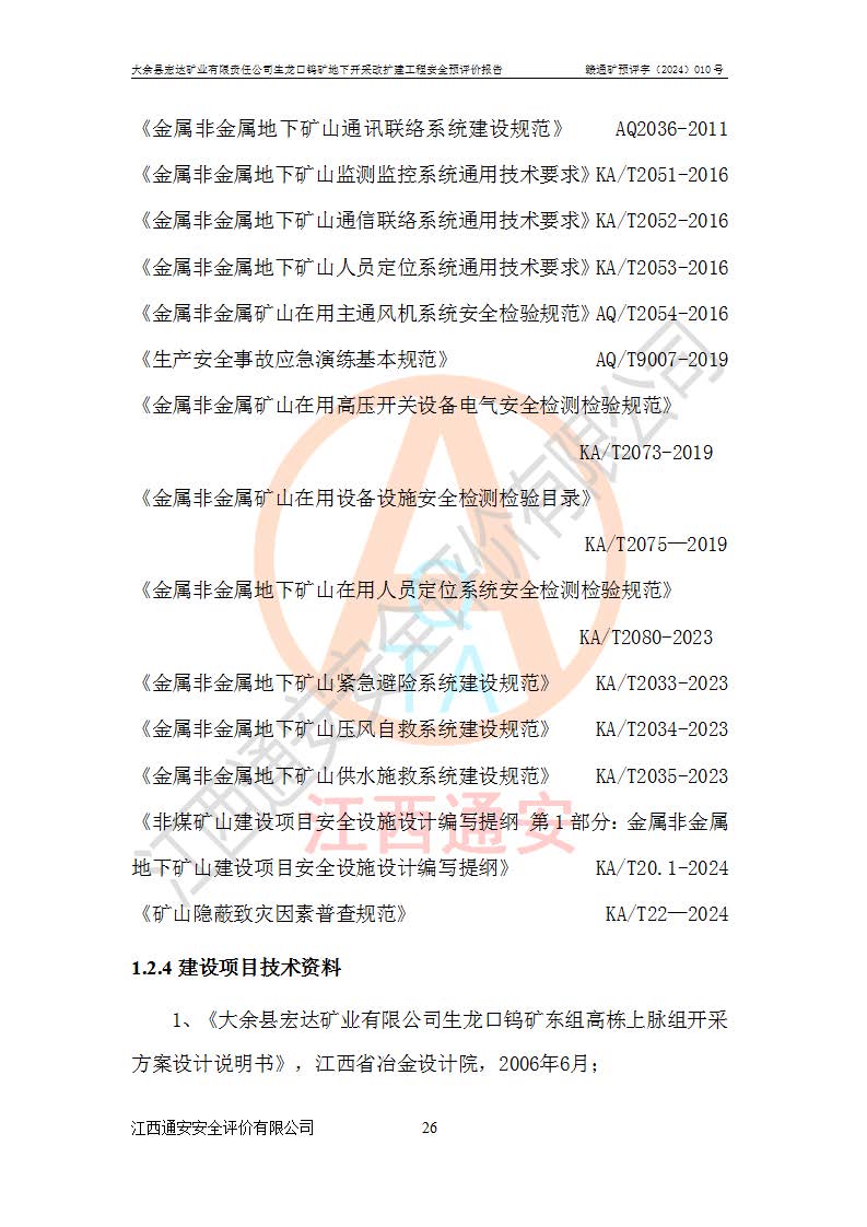 大余縣生龍口礦區(qū)鎢礦位于大余縣城北西 310°方位,距大余縣城直距 12 **,西接生龍口,北接蕩坪礦,南鄰黃木坑、西華山等礦區(qū),礦區(qū)正好是幾個(gè)礦區(qū)的銜接部位。隸屬大余縣浮江鄉(xiāng)管轄。其地理位置為:東經(jīng) 114°17′03″--114°20′11″;北緯 25°27′15″ --25 ° 28 ′ 10″ 。 礦 區(qū) 面 積 為5.97平方**。區(qū)內(nèi)交通較為方便,礦區(qū)東西兩側(cè)不遠(yuǎn)處均有公路通過(guò),西側(cè)為大余至崇義公路,東側(cè)為 大 余 至 蕩 坪 公路,通過(guò)這兩條公路均可向南與大余縣城與 323 國(guó)道相接,至贛州市區(qū)約100 **,往廣東省韶關(guān)贛韶高速約 150 **,向北達(dá)崇義縣城。 生龍口鎢礦建礦以前只有一些小規(guī)模的民采,2003年大余縣宏達(dá)礦業(yè)有限公司取得采礦權(quán),形成規(guī)模采礦,后期采礦證經(jīng)過(guò)多次延續(xù)與變更。生龍口鎢礦共設(shè)置了高棟上、羅坑、生龍口3個(gè)開(kāi)采工區(qū)。3個(gè)工區(qū)相距3**左右。 2024年9月江西晶楚工程技術(shù)有限公司編制完成了《大余縣宏達(dá)礦業(yè)有限責(zé)任公司生龍口鎢礦地下開(kāi)采改擴(kuò)建工程可行性研究報(bào)告》(以下簡(jiǎn)稱(chēng)《可研報(bào)告》)。2024年12月26日取得《江西省工業(yè)和信息化廳關(guān)于大余縣宏達(dá)礦業(yè)有限責(zé)任公司生龍口鎢礦地下開(kāi)采改擴(kuò)建工程核準(zhǔn)的批復(fù)》(贛工信有色〔2024〕49號(hào))。 根據(jù)《可研報(bào)告》,可研設(shè)計(jì)范圍為生龍口鎢礦礦區(qū)礦權(quán)范圍,平面范圍由15個(gè)拐點(diǎn)組成,開(kāi)采標(biāo)高范圍為746m~200m。本次開(kāi)采對(duì)象為開(kāi)采范圍內(nèi)的35條工業(yè)礦體,其中,大部分礦體以及接近地表處存在采空區(qū),為保護(hù)地表及井下安全作業(yè),需留設(shè)地表保安礦柱及采空區(qū)隔離礦柱;其中,高棟上工區(qū)V198、V197礦體因位于采空區(qū)后方,且資源量較少,暫不列為開(kāi)采對(duì)象;生龍口工區(qū)V98、V85、V84因利舊324m主平硐口,故作為保安礦柱,暫不予開(kāi)采??裳?*采用淺孔留礦嗣后充填法??裳?*采用平硐+盲斜坡道開(kāi)拓,一次性整體設(shè)計(jì),各工區(qū)礦石和廢石均通過(guò)溜井下放至相應(yīng)區(qū)段*低開(kāi)采中段、通過(guò)UK-6礦用自卸卡車(chē)裝載,利用內(nèi)部運(yùn)輸巷道和溜井運(yùn)至生龍口工區(qū)324m平硐(主運(yùn)輸巷道)集中出礦,各工區(qū)礦石、廢石分別運(yùn)至324平硐口附近的選礦廠和砂石骨料加工廠。井下中段**采用無(wú)軌運(yùn)輸。礦區(qū)采用分區(qū)通風(fēng)系統(tǒng)、每個(gè)工區(qū)采用單翼對(duì)角抽出機(jī)械式通風(fēng)方式;新風(fēng)主要從平硐口進(jìn)風(fēng),回風(fēng)井回風(fēng)。 本項(xiàng)目已經(jīng)符合編制安全預(yù)評(píng)價(jià)的前置條件,根據(jù)《中華人民共和國(guó)安全生產(chǎn)法》、《建設(shè)項(xiàng)目安全設(shè)施“三同時(shí)”監(jiān)督管理辦法》(**安全生產(chǎn)監(jiān)督管理局令第36號(hào))、《金屬非金屬礦山建設(shè)項(xiàng)目安全設(shè)施目錄》(**安全生產(chǎn)監(jiān)督管理總局令第75號(hào))和《**礦山安全監(jiān)察局關(guān)于進(jìn)一步加強(qiáng)非煤礦山安全生產(chǎn)行政許可工作的通知》(礦安〔2024〕70號(hào))的規(guī)定,大余縣宏達(dá)礦業(yè)有限責(zé)任公司2024年10月8日委托江西通安安全評(píng)價(jià)有限公司對(duì)其生龍口鎢礦地下開(kāi)采改擴(kuò)建工程進(jìn)行安全預(yù)評(píng)價(jià)。 |