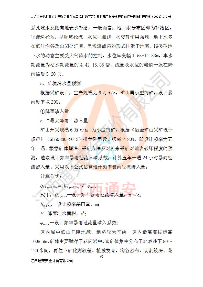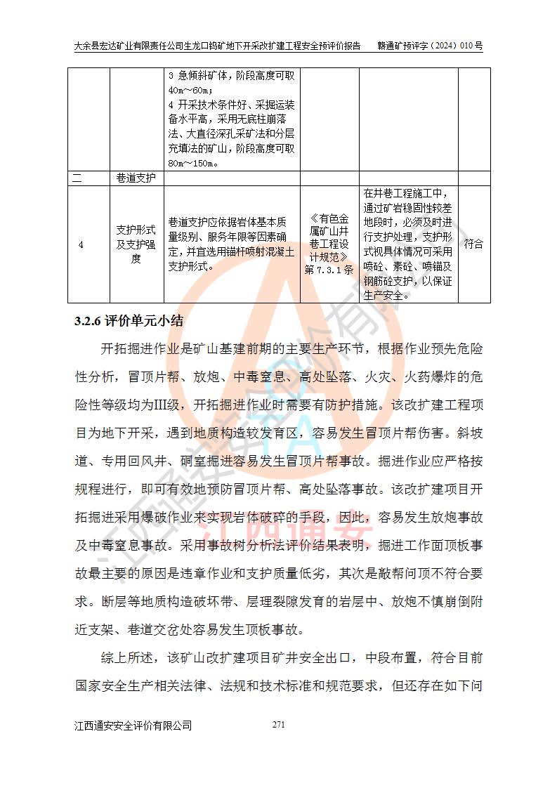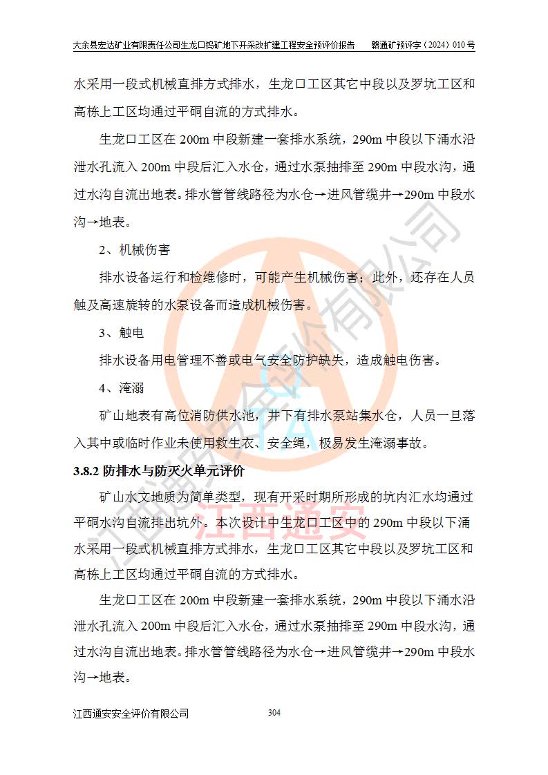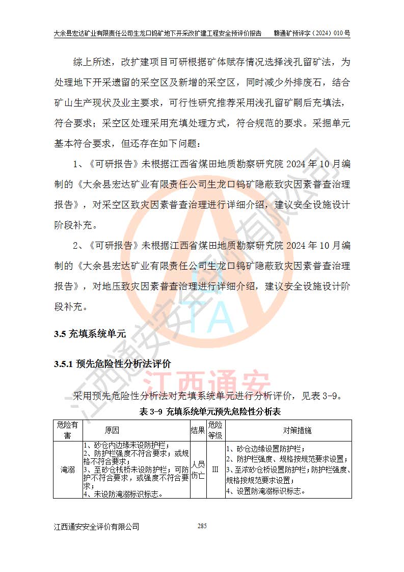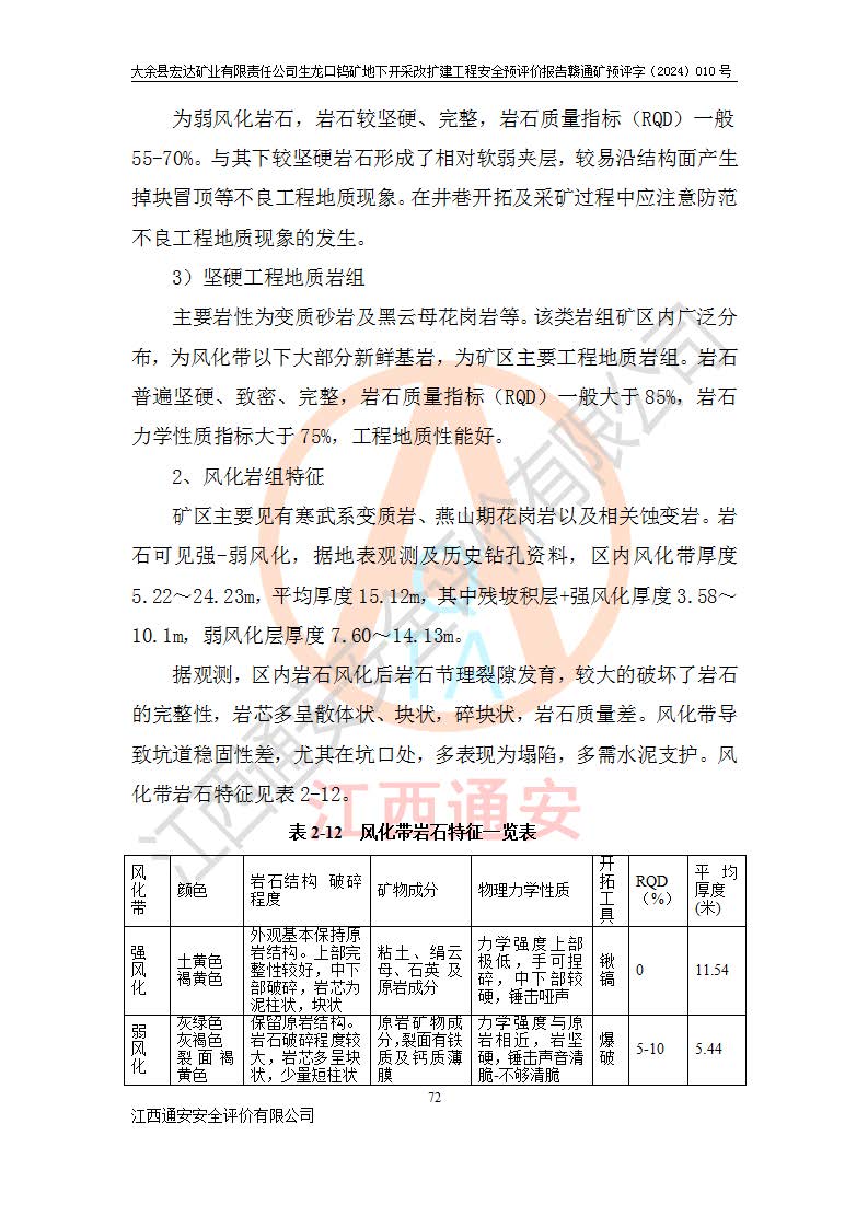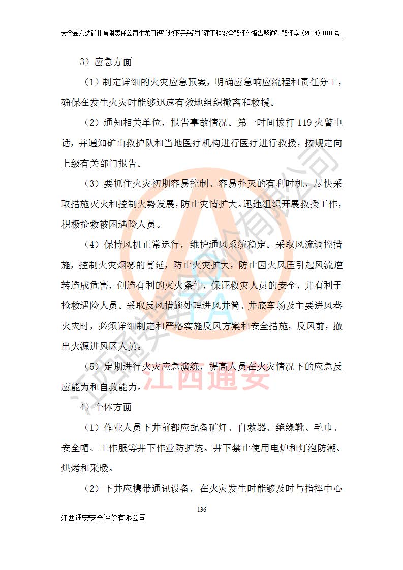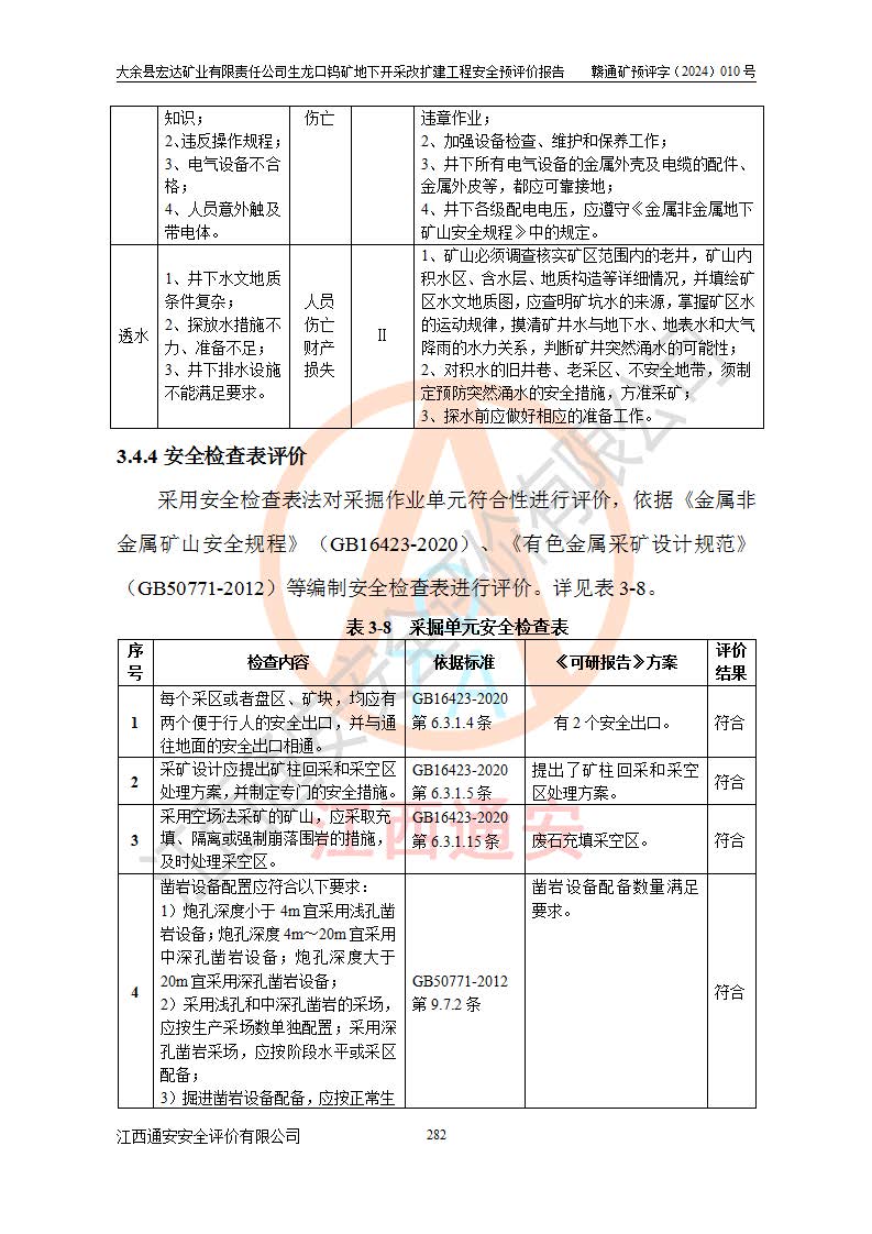 大余縣生龍口礦區(qū)鎢礦位于大余縣城北西 310°方位,距大余縣城直距 12 **,西接生龍口,北接蕩坪礦,南鄰黃木坑、西華山等礦區(qū),礦區(qū)正好是幾個(gè)礦區(qū)的銜接部位。隸屬大余縣浮江鄉(xiāng)管轄。其地理位置為:東經(jīng) 114°17′03″--114°20′11″;北緯 25°27′15″ --25 ° 28 ′ 10″ 。 礦 區(qū) 面 積 為5.97平方**。區(qū)內(nèi)交通較為方便,礦區(qū)東西兩側(cè)不遠(yuǎn)處均有公路通過(guò),西側(cè)為大余至崇義公路,東側(cè)為 大 余 至 蕩 坪 公路,通過(guò)這兩條公路均可向南與大余縣城與 323 國(guó)道相接,至贛州市區(qū)約100 **,往廣東省韶關(guān)贛韶高速約 150 **,向北達(dá)崇義縣城。 生龍口鎢礦建礦以前只有一些小規(guī)模的民采,2003年大余縣宏達(dá)礦業(yè)有限公司取得采礦權(quán),形成規(guī)模采礦,后期采礦證經(jīng)過(guò)多次延續(xù)與變更。生龍口鎢礦共設(shè)置了高棟上、羅坑、生龍口3個(gè)開(kāi)采工區(qū)。3個(gè)工區(qū)相距3**左右。 2024年9月江西晶楚工程技術(shù)有限公司編制完成了《大余縣宏達(dá)礦業(yè)有限責(zé)任公司生龍口鎢礦地下開(kāi)采改擴(kuò)建工程可行性研究報(bào)告》(以下簡(jiǎn)稱(chēng)《可研報(bào)告》)。2024年12月26日取得《江西省工業(yè)和信息化廳關(guān)于大余縣宏達(dá)礦業(yè)有限責(zé)任公司生龍口鎢礦地下開(kāi)采改擴(kuò)建工程核準(zhǔn)的批復(fù)》(贛工信有色〔2024〕49號(hào))。 根據(jù)《可研報(bào)告》,可研設(shè)計(jì)范圍為生龍口鎢礦礦區(qū)礦權(quán)范圍,平面范圍由15個(gè)拐點(diǎn)組成,開(kāi)采標(biāo)高范圍為746m~200m。本次開(kāi)采對(duì)象為開(kāi)采范圍內(nèi)的35條工業(yè)礦體,其中,大部分礦體以及接近地表處存在采空區(qū),為保護(hù)地表及井下安全作業(yè),需留設(shè)地表保安礦柱及采空區(qū)隔離礦柱;其中,高棟上工區(qū)V198、V197礦體因位于采空區(qū)后方,且資源量較少,暫不列為開(kāi)采對(duì)象;生龍口工區(qū)V98、V85、V84因利舊324m主平硐口,故作為保安礦柱,暫不予開(kāi)采??裳?*采用淺孔留礦嗣后充填法??裳?*采用平硐+盲斜坡道開(kāi)拓,一次性整體設(shè)計(jì),各工區(qū)礦石和廢石均通過(guò)溜井下放至相應(yīng)區(qū)段*低開(kāi)采中段、通過(guò)UK-6礦用自卸卡車(chē)裝載,利用內(nèi)部運(yùn)輸巷道和溜井運(yùn)至生龍口工區(qū)324m平硐(主運(yùn)輸巷道)集中出礦,各工區(qū)礦石、廢石分別運(yùn)至324平硐口附近的選礦廠和砂石骨料加工廠。井下中段**采用無(wú)軌運(yùn)輸。礦區(qū)采用分區(qū)通風(fēng)系統(tǒng)、每個(gè)工區(qū)采用單翼對(duì)角抽出機(jī)械式通風(fēng)方式;新風(fēng)主要從平硐口進(jìn)風(fēng),回風(fēng)井回風(fēng)。 本項(xiàng)目已經(jīng)符合編制安全預(yù)評(píng)價(jià)的前置條件,根據(jù)《中華人民共和國(guó)安全生產(chǎn)法》、《建設(shè)項(xiàng)目安全設(shè)施“三同時(shí)”監(jiān)督管理辦法》(**安全生產(chǎn)監(jiān)督管理局令第36號(hào))、《金屬非金屬礦山建設(shè)項(xiàng)目安全設(shè)施目錄》(**安全生產(chǎn)監(jiān)督管理總局令第75號(hào))和《**礦山安全監(jiān)察局關(guān)于進(jìn)一步加強(qiáng)非煤礦山安全生產(chǎn)行政許可工作的通知》(礦安〔2024〕70號(hào))的規(guī)定,大余縣宏達(dá)礦業(yè)有限責(zé)任公司2024年10月8日委托江西通安安全評(píng)價(jià)有限公司對(duì)其生龍口鎢礦地下開(kāi)采改擴(kuò)建工程進(jìn)行安全預(yù)評(píng)價(jià)。 |