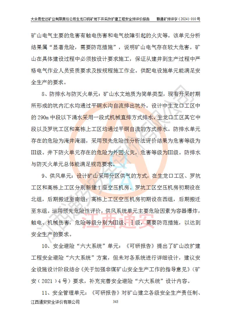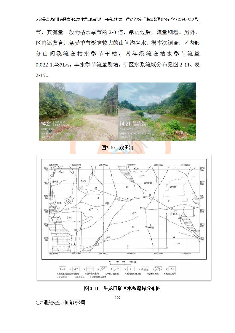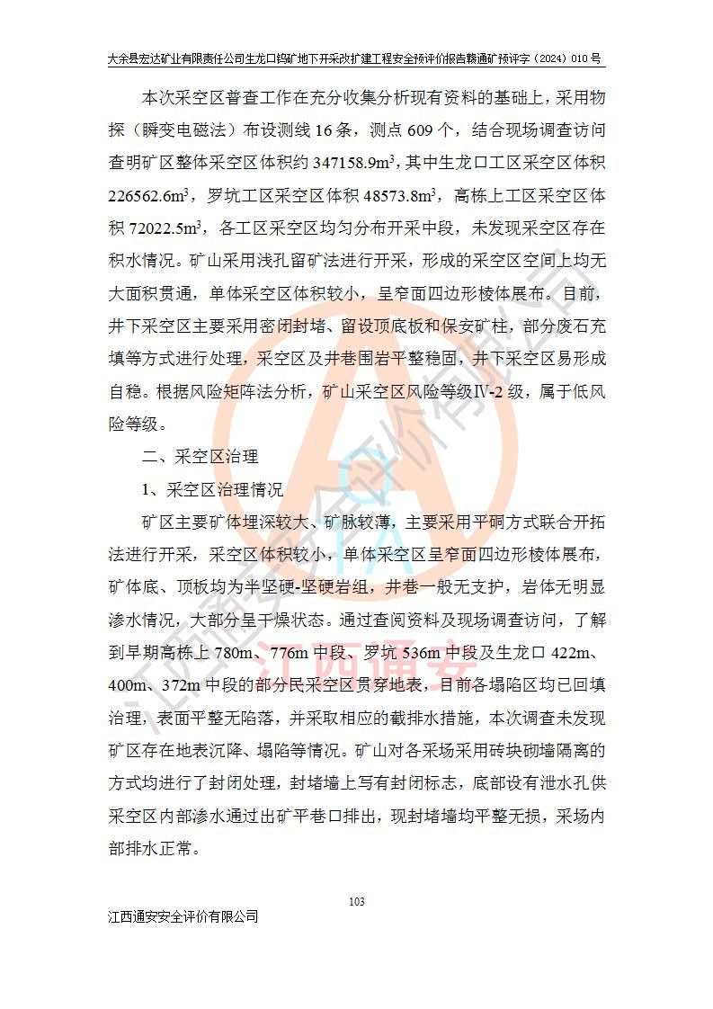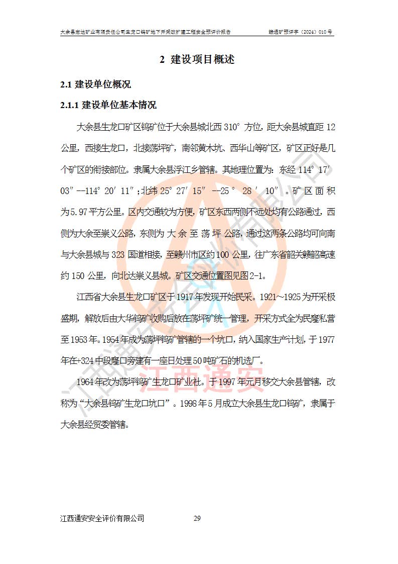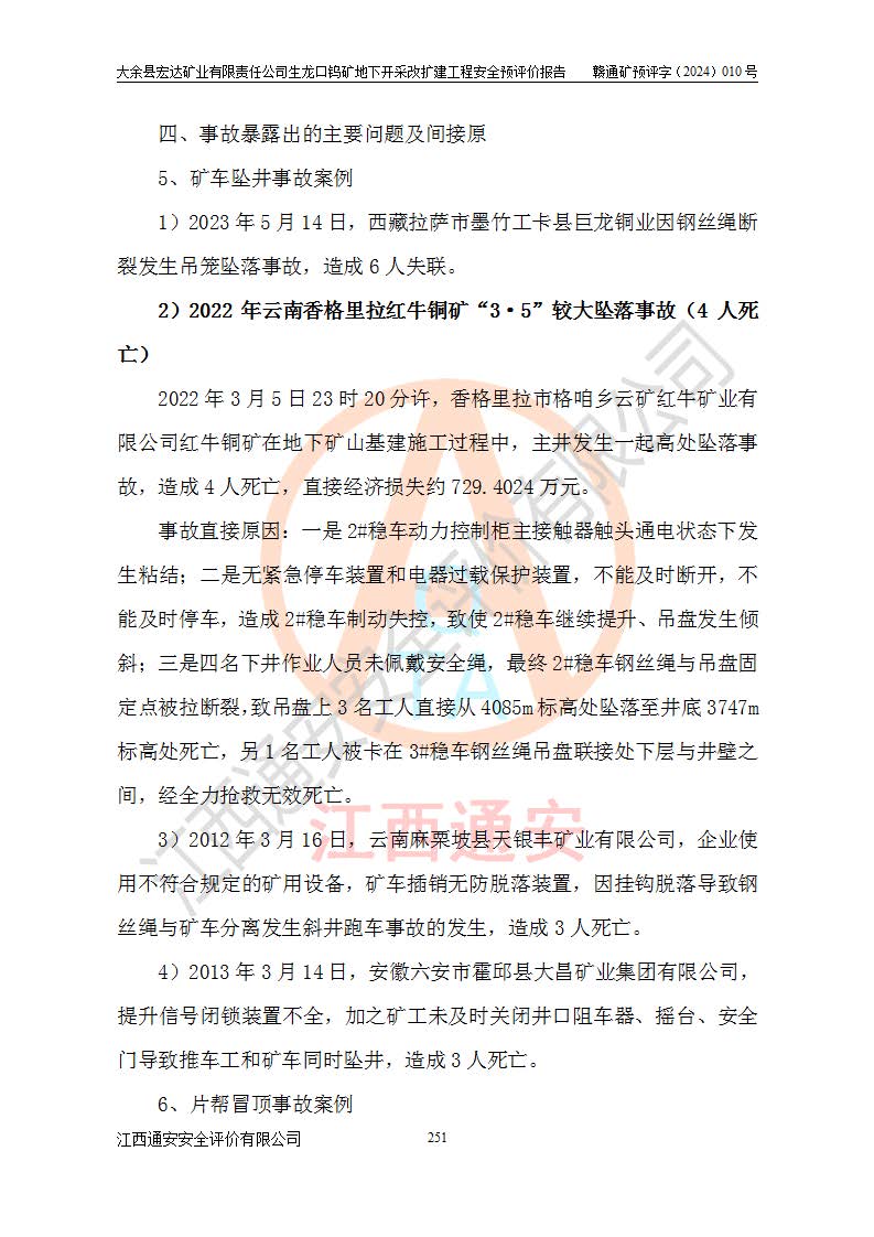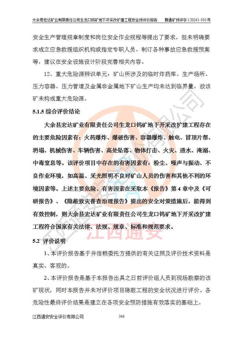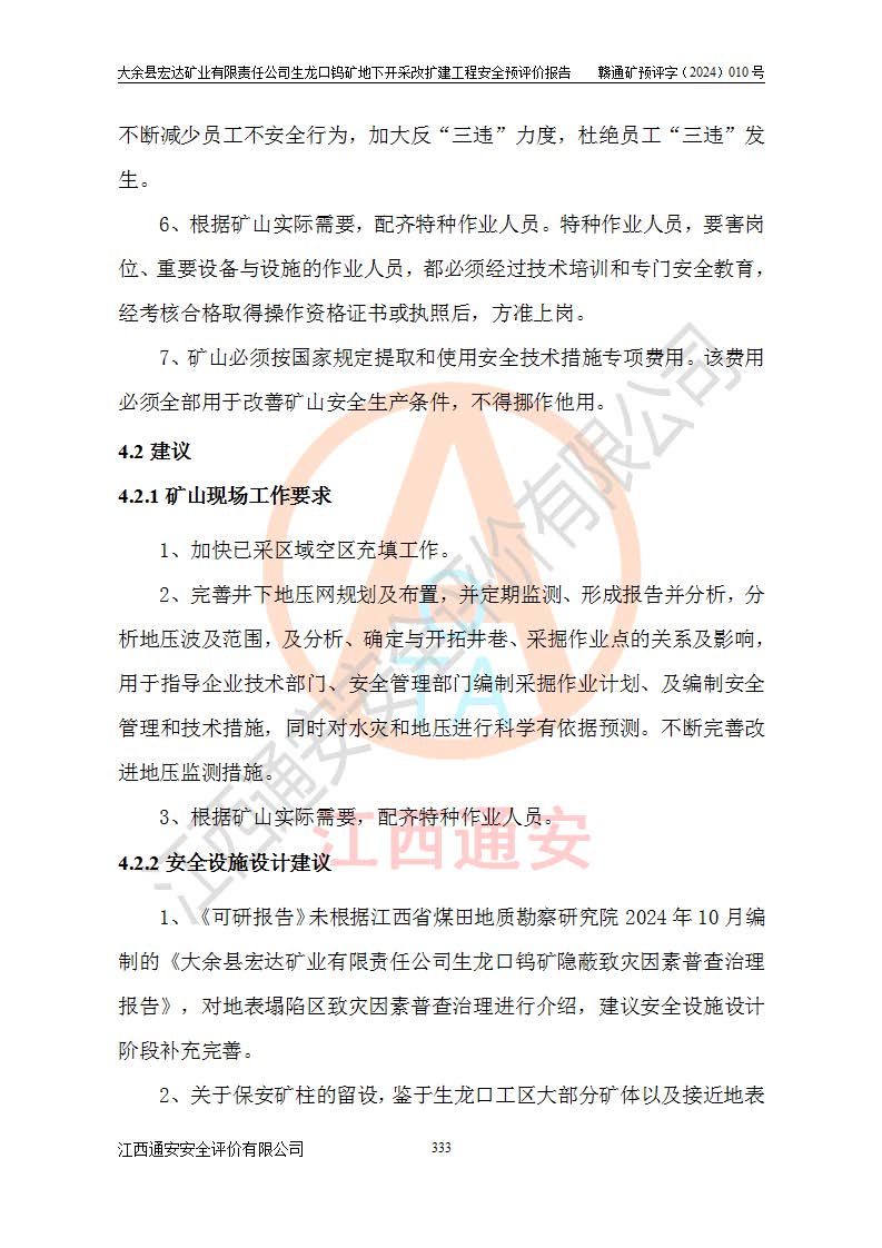 大余縣生龍口礦區(qū)鎢礦位于大余縣城北西 310°方位,距大余縣城直距 12 **,西接生龍口,北接蕩坪礦,南鄰黃木坑、西華山等礦區(qū),礦區(qū)正好是幾個(gè)礦區(qū)的銜接部位。隸屬大余縣浮江鄉(xiāng)管轄。其地理位置為:東經(jīng) 114°17′03″--114°20′11″;北緯 25°27′15″ --25 ° 28 ′ 10″ 。 礦 區(qū) 面 積 為5.97平方**。區(qū)內(nèi)交通較為方便,礦區(qū)東西兩側(cè)不遠(yuǎn)處均有公路通過(guò),西側(cè)為大余至崇義公路,東側(cè)為 大 余 至 蕩 坪 公路,通過(guò)這兩條公路均可向南與大余縣城與 323 國(guó)道相接,至贛州市區(qū)約100 **,往廣東省韶關(guān)贛韶高速約 150 **,向北達(dá)崇義縣城。 生龍口鎢礦建礦以前只有一些小規(guī)模的民采,2003年大余縣宏達(dá)礦業(yè)有限公司取得采礦權(quán),形成規(guī)模采礦,后期采礦證經(jīng)過(guò)多次延續(xù)與變更。生龍口鎢礦共設(shè)置了高棟上、羅坑、生龍口3個(gè)開(kāi)采工區(qū)。3個(gè)工區(qū)相距3**左右。 2024年9月江西晶楚工程技術(shù)有限公司編制完成了《大余縣宏達(dá)礦業(yè)有限責(zé)任公司生龍口鎢礦地下開(kāi)采改擴(kuò)建工程可行性研究報(bào)告》(以下簡(jiǎn)稱(chēng)《可研報(bào)告》)。2024年12月26日取得《江西省工業(yè)和信息化廳關(guān)于大余縣宏達(dá)礦業(yè)有限責(zé)任公司生龍口鎢礦地下開(kāi)采改擴(kuò)建工程核準(zhǔn)的批復(fù)》(贛工信有色〔2024〕49號(hào))。 根據(jù)《可研報(bào)告》,可研設(shè)計(jì)范圍為生龍口鎢礦礦區(qū)礦權(quán)范圍,平面范圍由15個(gè)拐點(diǎn)組成,開(kāi)采標(biāo)高范圍為746m~200m。本次開(kāi)采對(duì)象為開(kāi)采范圍內(nèi)的35條工業(yè)礦體,其中,大部分礦體以及接近地表處存在采空區(qū),為保護(hù)地表及井下安全作業(yè),需留設(shè)地表保安礦柱及采空區(qū)隔離礦柱;其中,高棟上工區(qū)V198、V197礦體因位于采空區(qū)后方,且資源量較少,暫不列為開(kāi)采對(duì)象;生龍口工區(qū)V98、V85、V84因利舊324m主平硐口,故作為保安礦柱,暫不予開(kāi)采??裳?*采用淺孔留礦嗣后充填法??裳?*采用平硐+盲斜坡道開(kāi)拓,一次性整體設(shè)計(jì),各工區(qū)礦石和廢石均通過(guò)溜井下放至相應(yīng)區(qū)段*低開(kāi)采中段、通過(guò)UK-6礦用自卸卡車(chē)裝載,利用內(nèi)部運(yùn)輸巷道和溜井運(yùn)至生龍口工區(qū)324m平硐(主運(yùn)輸巷道)集中出礦,各工區(qū)礦石、廢石分別運(yùn)至324平硐口附近的選礦廠和砂石骨料加工廠。井下中段**采用無(wú)軌運(yùn)輸。礦區(qū)采用分區(qū)通風(fēng)系統(tǒng)、每個(gè)工區(qū)采用單翼對(duì)角抽出機(jī)械式通風(fēng)方式;新風(fēng)主要從平硐口進(jìn)風(fēng),回風(fēng)井回風(fēng)。 本項(xiàng)目已經(jīng)符合編制安全預(yù)評(píng)價(jià)的前置條件,根據(jù)《中華人民共和國(guó)安全生產(chǎn)法》、《建設(shè)項(xiàng)目安全設(shè)施“三同時(shí)”監(jiān)督管理辦法》(**安全生產(chǎn)監(jiān)督管理局令第36號(hào))、《金屬非金屬礦山建設(shè)項(xiàng)目安全設(shè)施目錄》(**安全生產(chǎn)監(jiān)督管理總局令第75號(hào))和《**礦山安全監(jiān)察局關(guān)于進(jìn)一步加強(qiáng)非煤礦山安全生產(chǎn)行政許可工作的通知》(礦安〔2024〕70號(hào))的規(guī)定,大余縣宏達(dá)礦業(yè)有限責(zé)任公司2024年10月8日委托江西通安安全評(píng)價(jià)有限公司對(duì)其生龍口鎢礦地下開(kāi)采改擴(kuò)建工程進(jìn)行安全預(yù)評(píng)價(jià)。 |