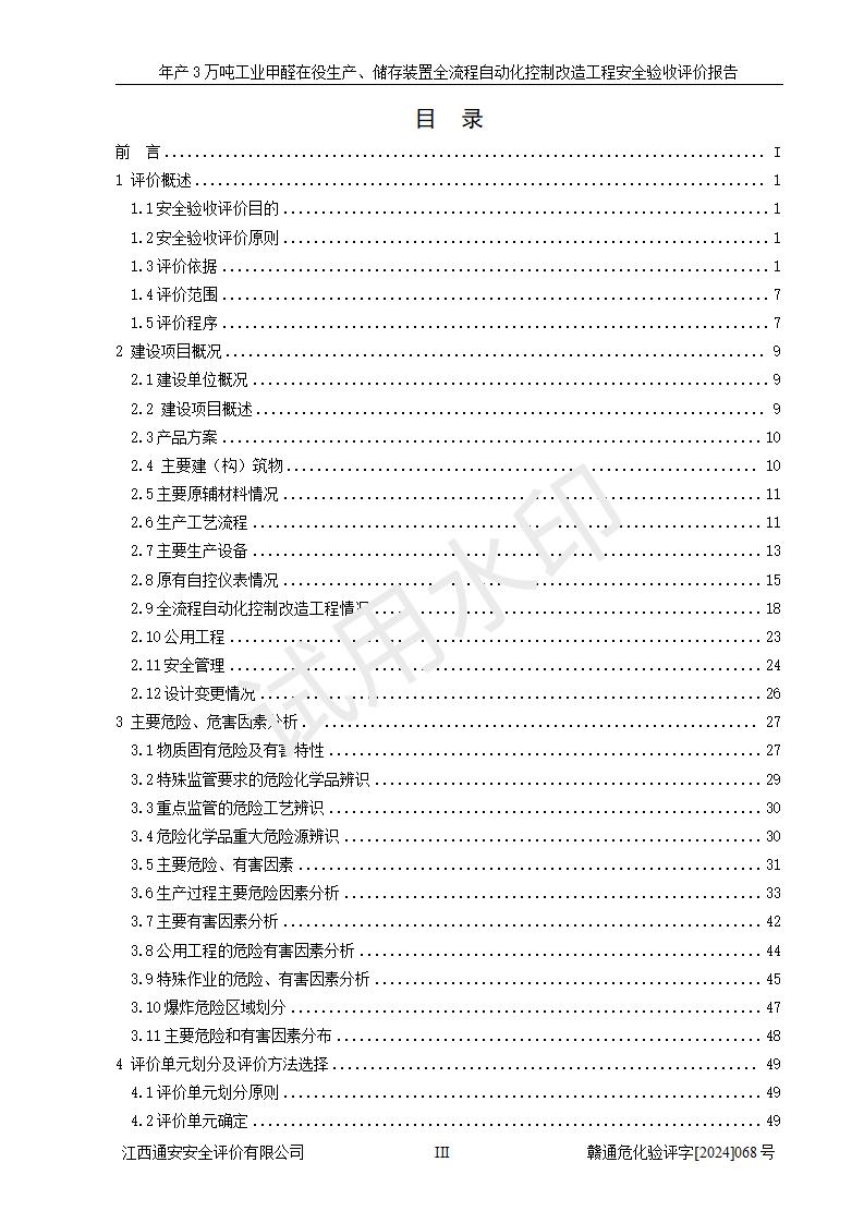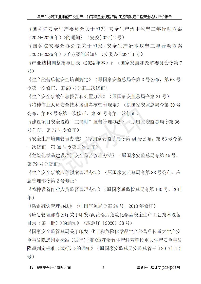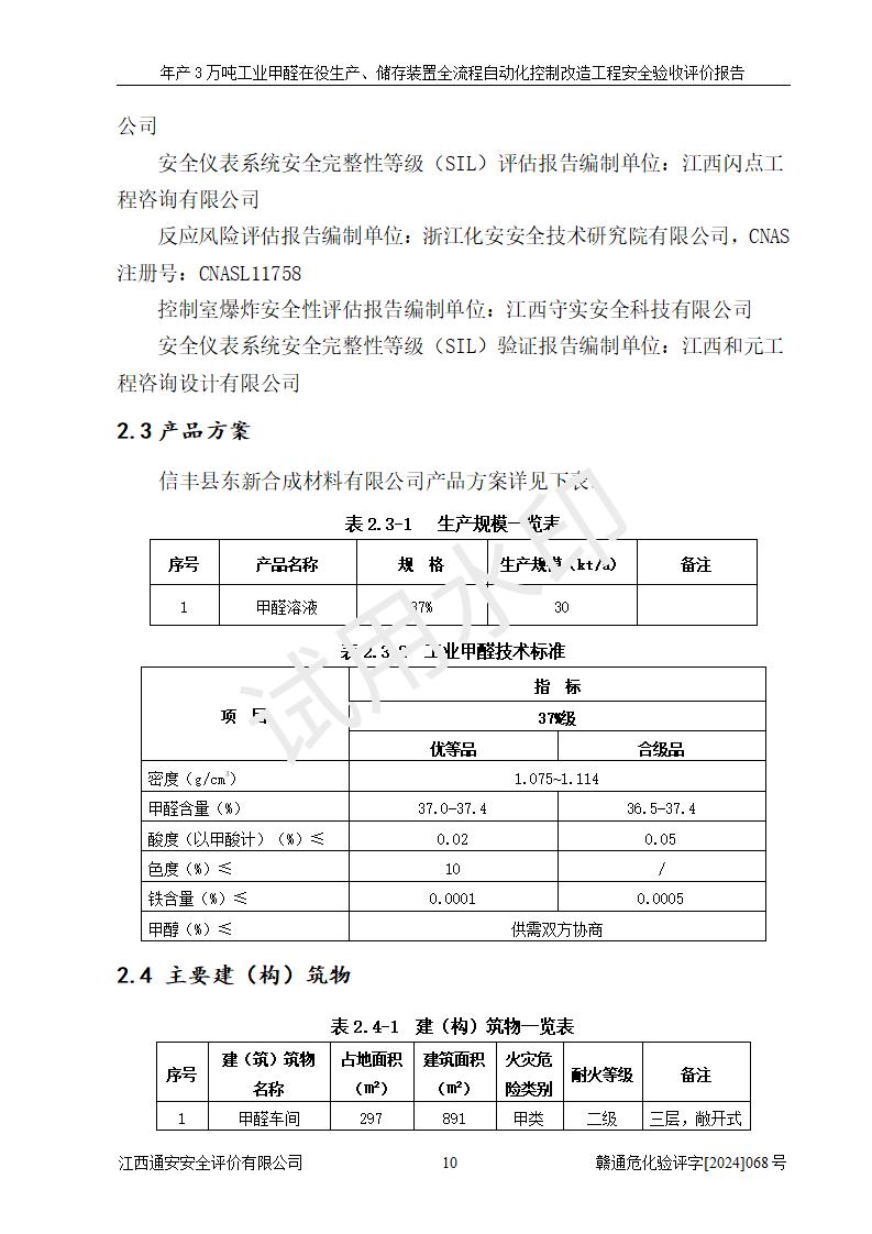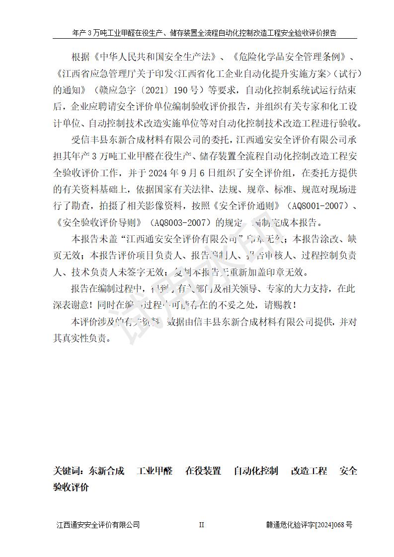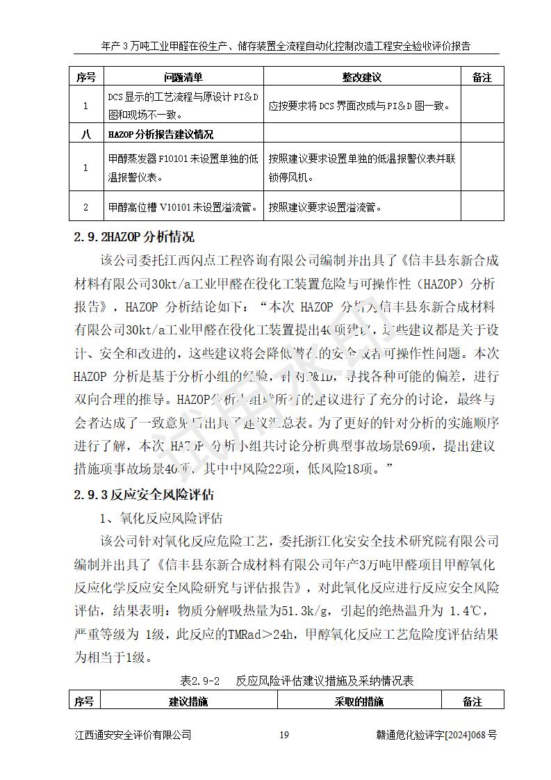 評(píng)價(jià)報(bào)告名稱 | 信豐縣東新合成材料有限公司年產(chǎn)3萬噸工業(yè)甲醛在役生產(chǎn)、儲(chǔ)存裝置全流程自動(dòng)化控制改造工程安全驗(yàn)收評(píng)價(jià)報(bào)告 | ||||||