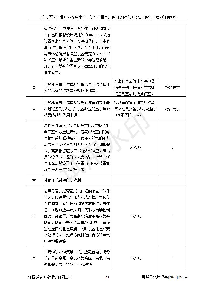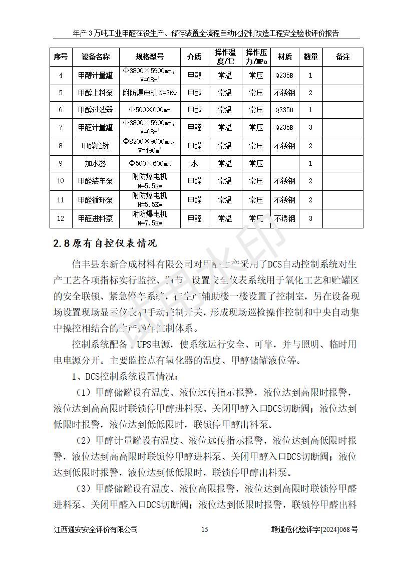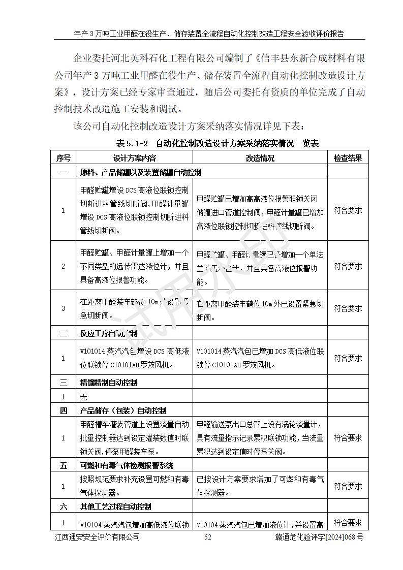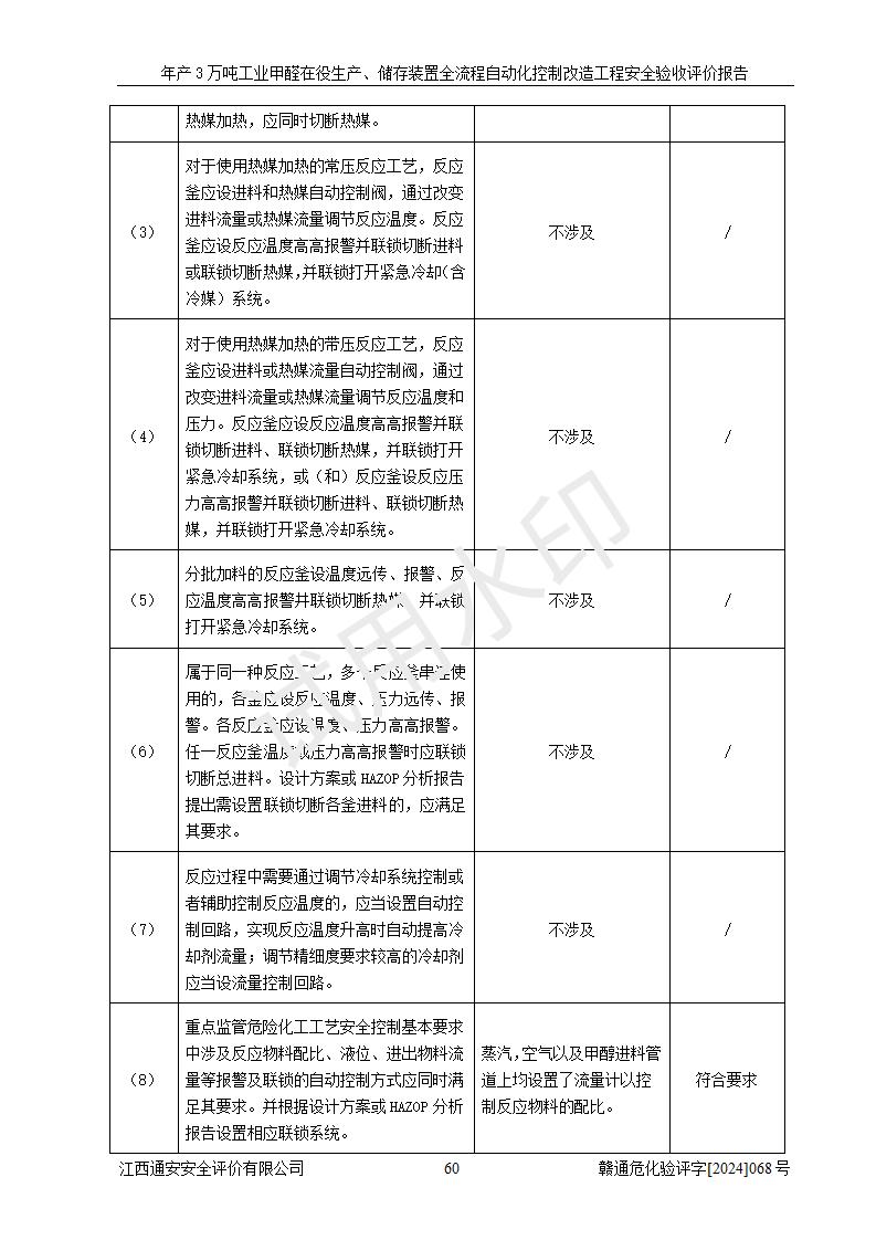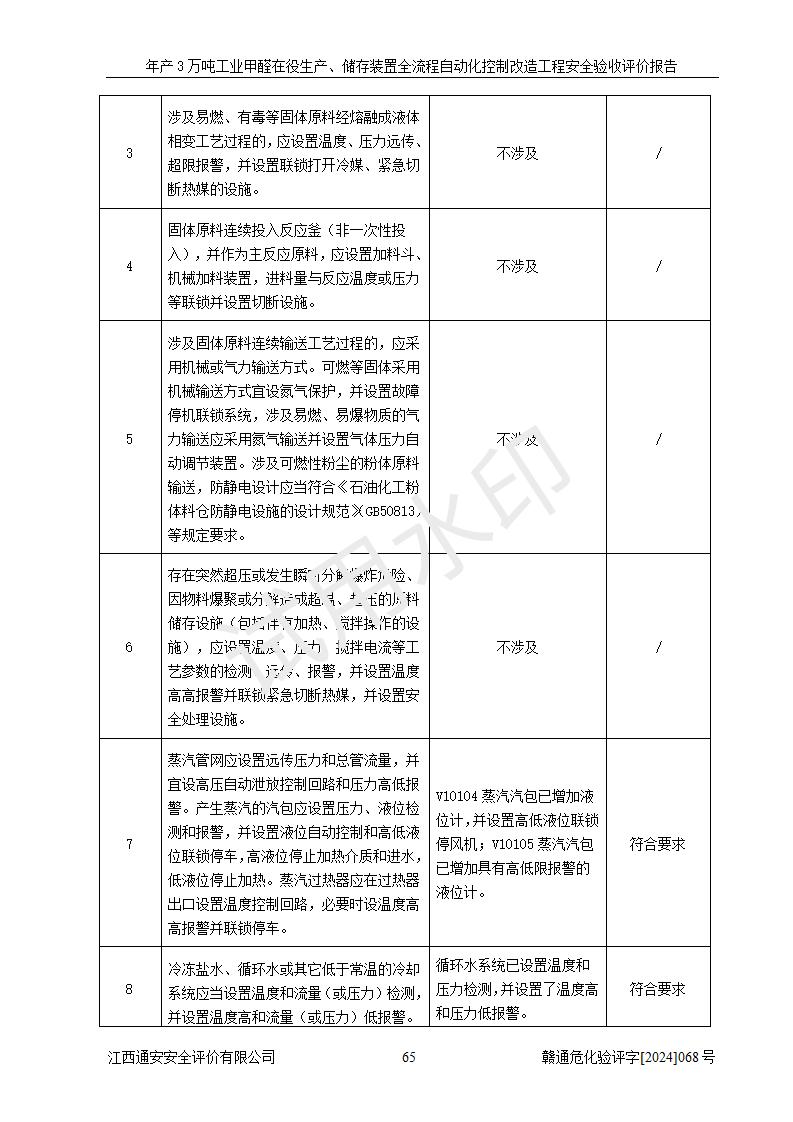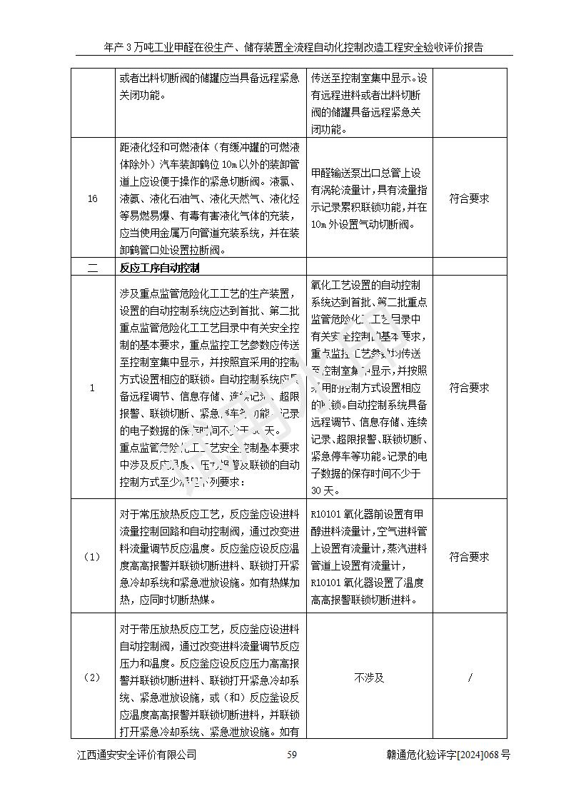 評(píng)價(jià)結(jié)論 | 信豐縣東新合成材料有限公司年產(chǎn)3萬噸工業(yè)甲醛在役生產(chǎn)、儲(chǔ)存裝置全流程自動(dòng)化控制改造設(shè)計(jì)方案中提出的控制措施已得到落實(shí),自動(dòng)化控制系統(tǒng)設(shè)置情況與設(shè)計(jì)方案一致,滿足《江西省應(yīng)急管理廳關(guān)于印發(fā)<江西省化工企業(yè)自動(dòng)化提升實(shí)施方案>(試行)的通知》(贛應(yīng)急字〔2021〕190號(hào))的要求,具備自動(dòng)化控制改造工程竣工驗(yàn)收條件。 | ||||||