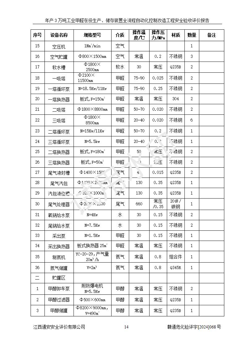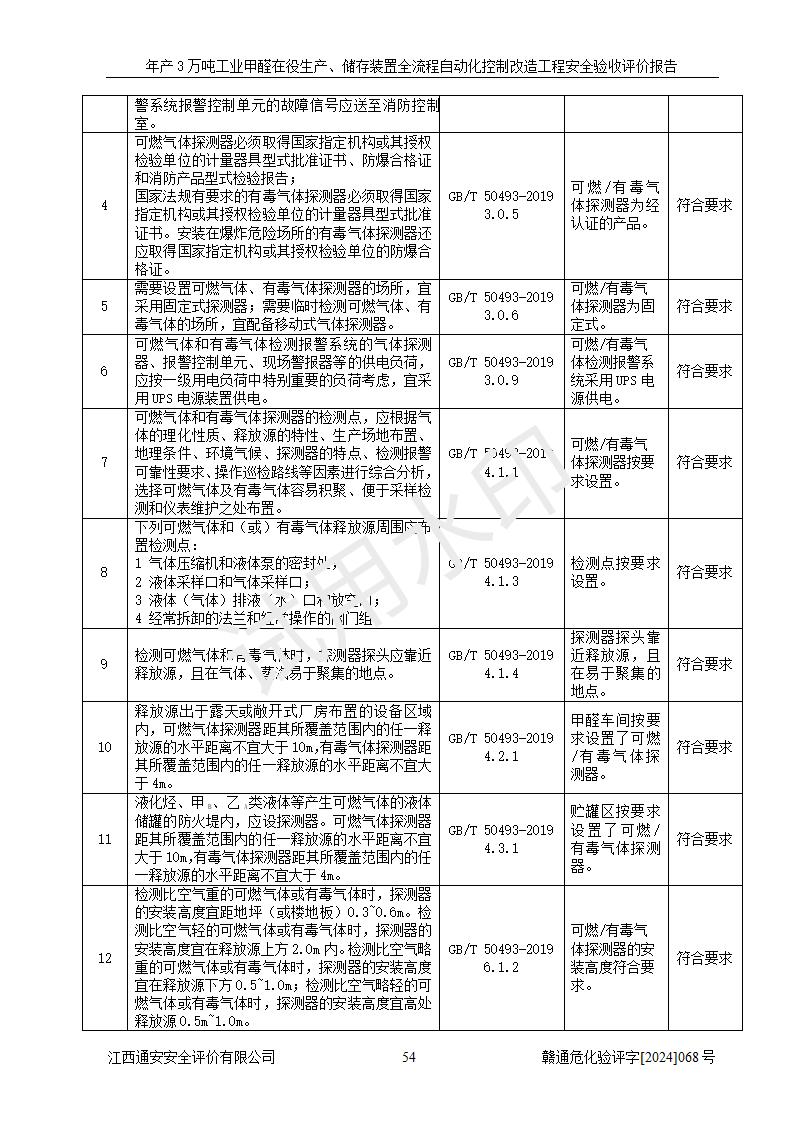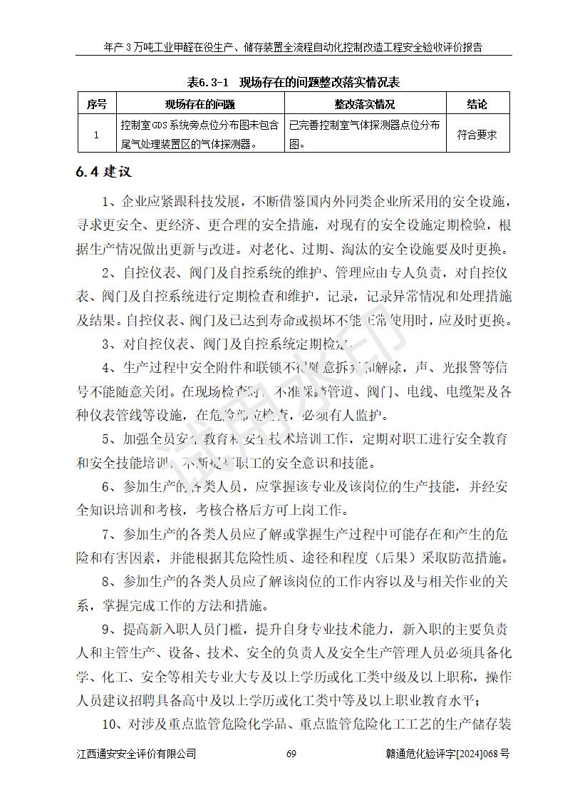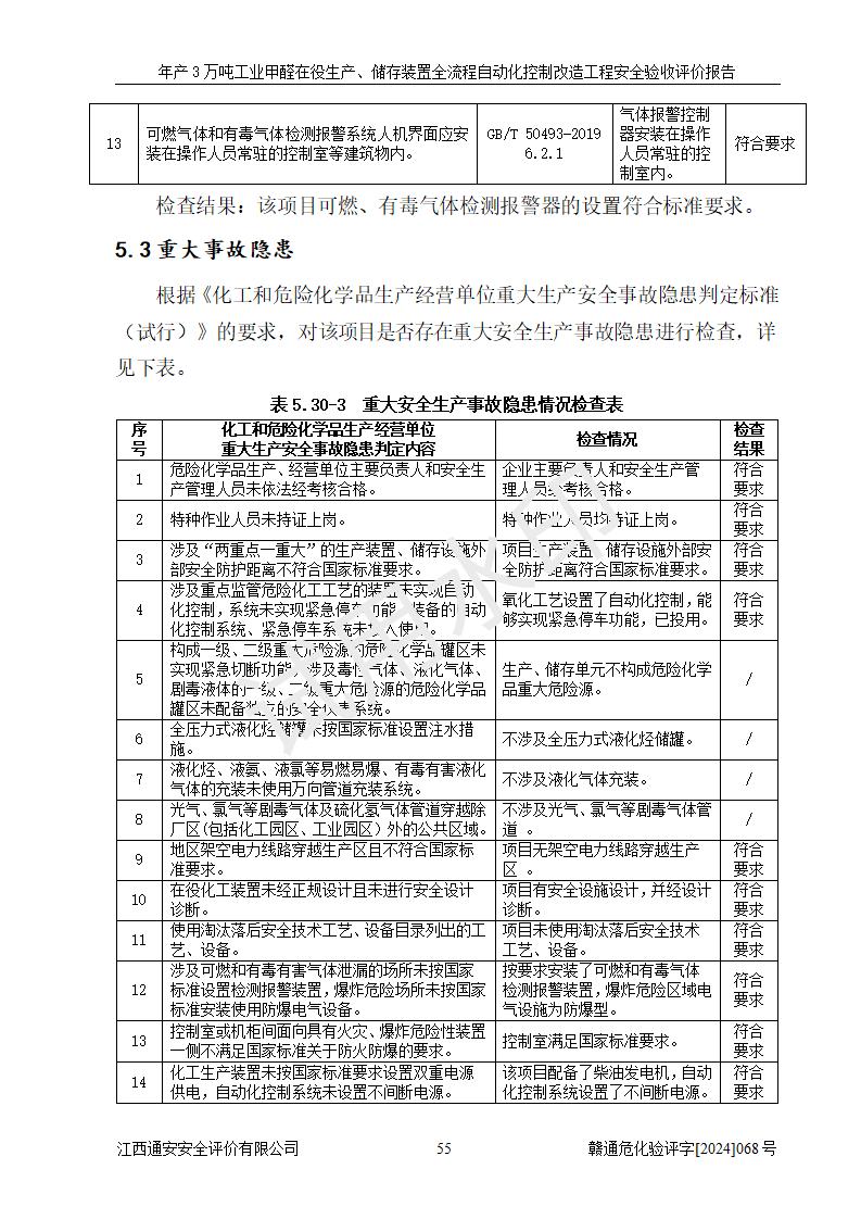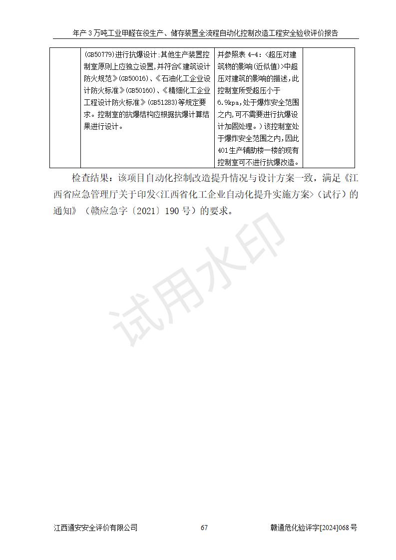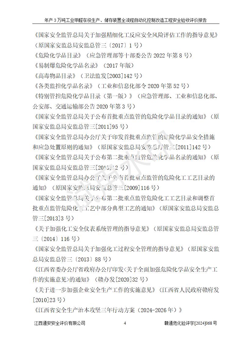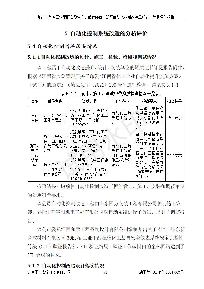 評(píng)價(jià)結(jié)論 | 信豐縣東新合成材料有限公司年產(chǎn)3萬噸工業(yè)甲醛在役生產(chǎn)、儲(chǔ)存裝置全流程自動(dòng)化控制改造設(shè)計(jì)方案中提出的控制措施已得到落實(shí),自動(dòng)化控制系統(tǒng)設(shè)置情況與設(shè)計(jì)方案一致,滿足《江西省應(yīng)急管理廳關(guān)于印發(fā)<江西省化工企業(yè)自動(dòng)化提升實(shí)施方案>(試行)的通知》(贛應(yīng)急字〔2021〕190號(hào))的要求,具備自動(dòng)化控制改造工程竣工驗(yàn)收條件。 | ||||||