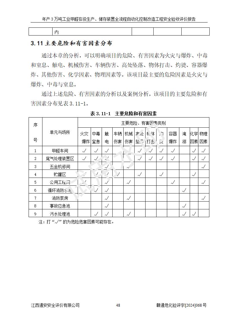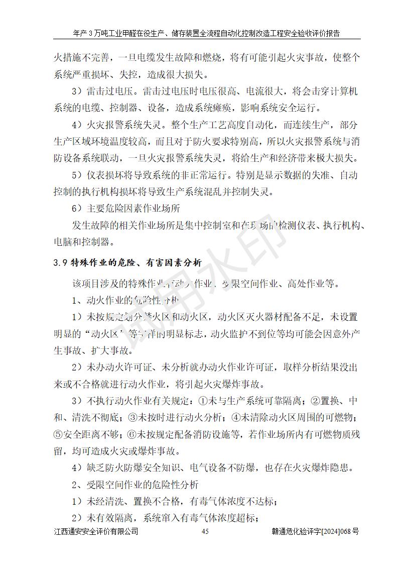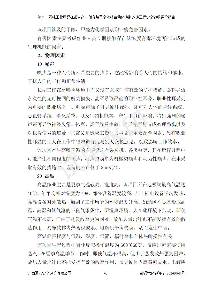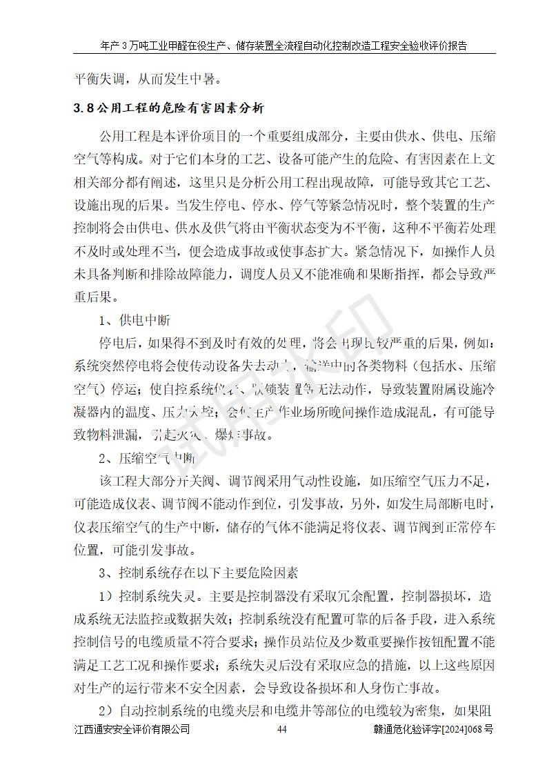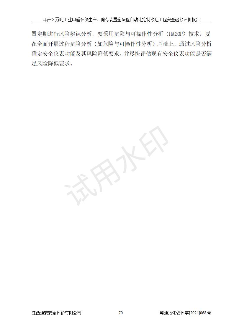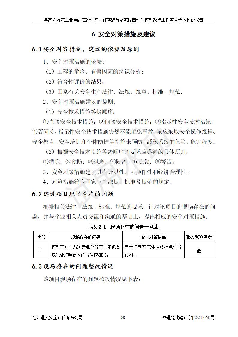 評(píng)價(jià)結(jié)論 | 信豐縣東新合成材料有限公司年產(chǎn)3萬噸工業(yè)甲醛在役生產(chǎn)、儲(chǔ)存裝置全流程自動(dòng)化控制改造設(shè)計(jì)方案中提出的控制措施已得到落實(shí),自動(dòng)化控制系統(tǒng)設(shè)置情況與設(shè)計(jì)方案一致,滿足《江西省應(yīng)急管理廳關(guān)于印發(fā)<江西省化工企業(yè)自動(dòng)化提升實(shí)施方案>(試行)的通知》(贛應(yīng)急字〔2021〕190號(hào))的要求,具備自動(dòng)化控制改造工程竣工驗(yàn)收條件。 | ||||||