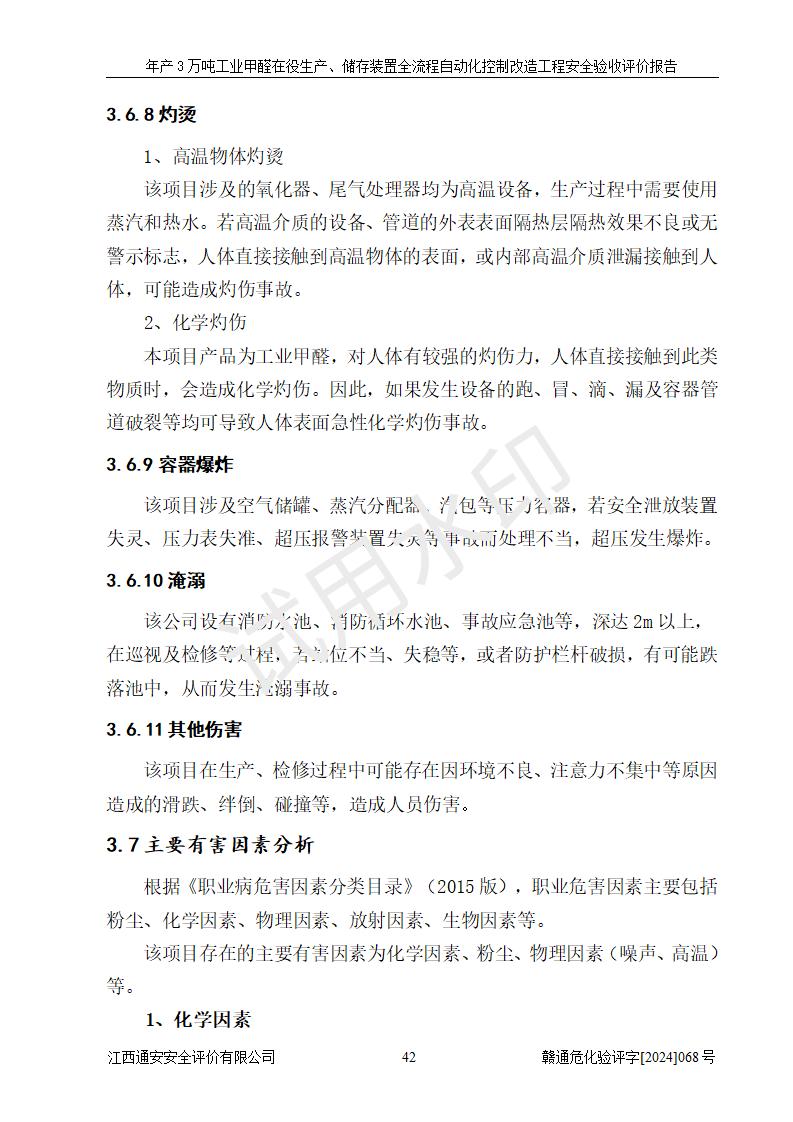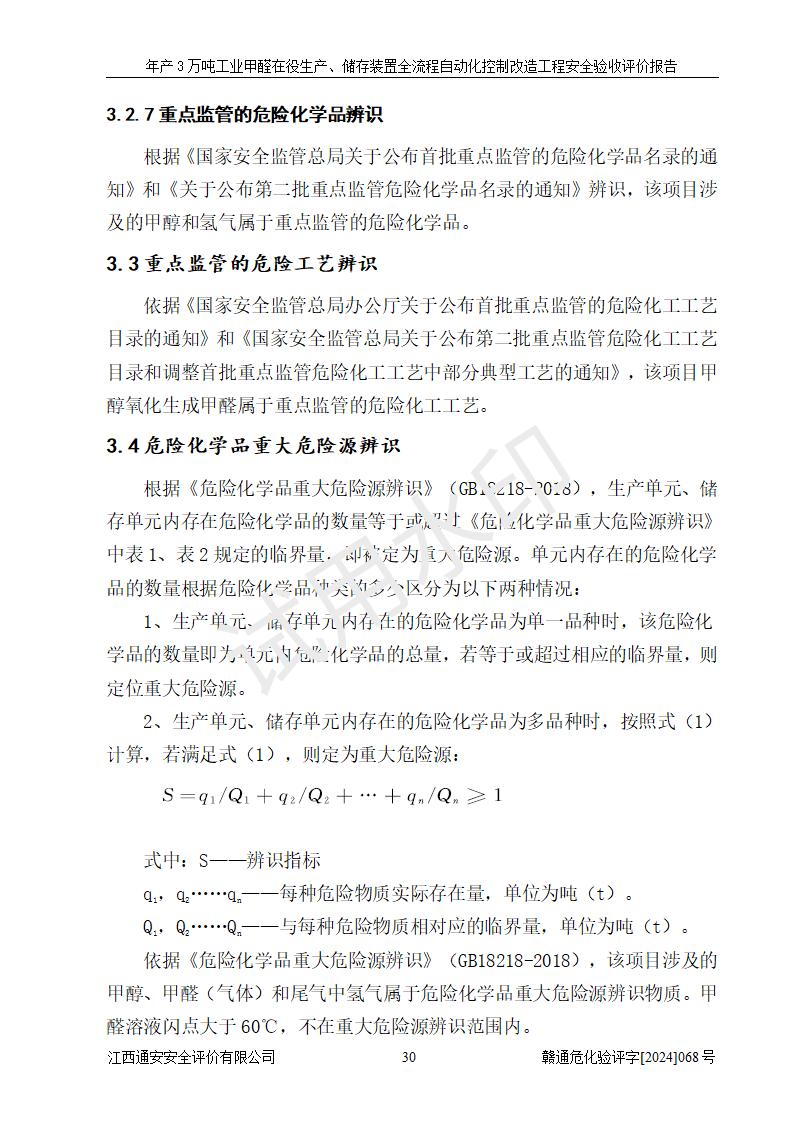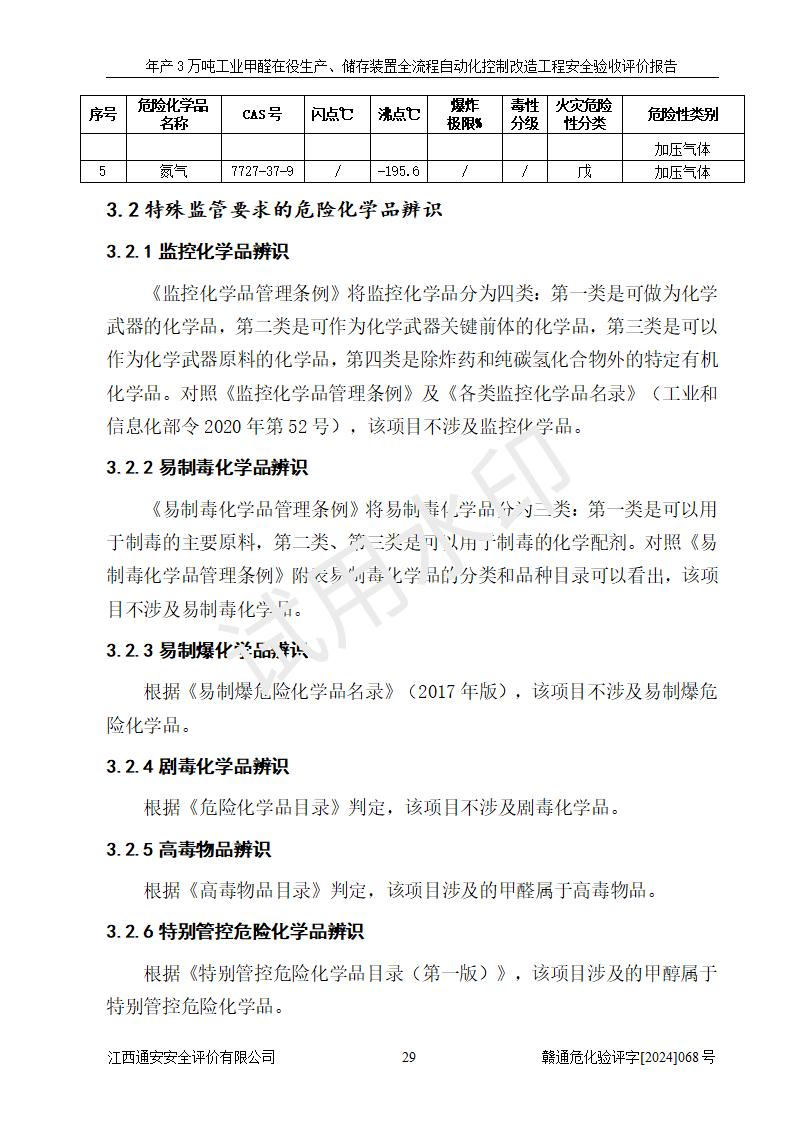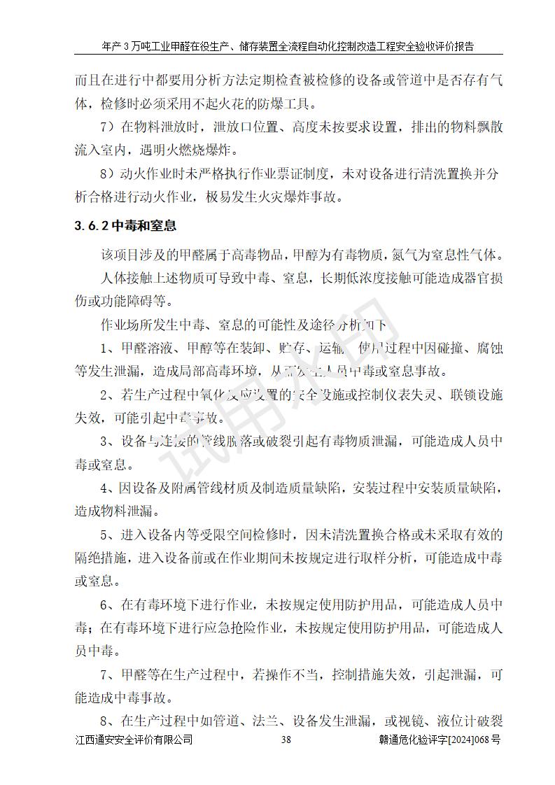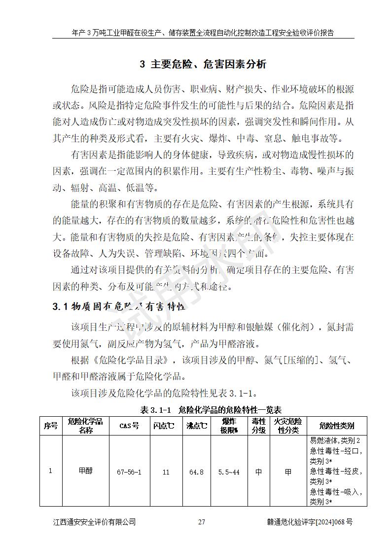 項(xiàng)目簡(jiǎn)介 | 信豐縣東新合成材料有限公司位于江西省贛州市信豐縣工業(yè)園工業(yè)大道10號(hào),法定**人為劉秀賢,成立于2010年12月20日,注冊(cè)資本壹仟萬元整,經(jīng)營范圍為甲醛生產(chǎn)、銷售等。 信豐縣東新合成材料有限公司2022年04月08日取得了《安全生產(chǎn)許可證》,許可證編號(hào):(贛)WH安許證字[2013]0741號(hào),許可范圍為甲醛(30kt/a),**期為2022年04月23日至2025年04月22日。根據(jù)《江西省應(yīng)急管理廳關(guān)于印發(fā)<江西省企業(yè)安全生產(chǎn)標(biāo)準(zhǔn)化建設(shè)定級(jí)實(shí)施辦法(試行)的通知>》(贛應(yīng)急字[2022]49號(hào))等有關(guān)規(guī)定,經(jīng)過企業(yè)自評(píng)、申請(qǐng)、評(píng)審、公示,該公司2023年5月17日確定為危險(xiǎn)化學(xué)品安全生產(chǎn)標(biāo)準(zhǔn)化二級(jí)企業(yè)。該公司現(xiàn)有員工16人,其中安全管理人員1人。 企業(yè)裝置設(shè)施原有**的自動(dòng)化水平,配備有DCS系統(tǒng)和SIS系統(tǒng),廠區(qū)綜合辦公樓一樓設(shè)置了控制室。根據(jù)《江西省應(yīng)急管理廳關(guān)于印發(fā)<江西省化工企業(yè)自動(dòng)化提升實(shí)施方案>(試行)的通知》(贛應(yīng)急字〔2021〕190號(hào)),企業(yè)委托河北英科石化工程有限公司編制了《信豐縣東新合成材料有限公司年產(chǎn)3萬噸工業(yè)甲醛在役生產(chǎn)、儲(chǔ)存裝置全流程自動(dòng)化控制改造設(shè)計(jì)方案》,且通過了專家評(píng)審。該自動(dòng)化改造工程由山東四方安裝工程有限公司負(fù)責(zé)施工、安裝,由江蘇宇陽機(jī)電工程有限公司負(fù)責(zé)調(diào)試,并出具了調(diào)試報(bào)告。 信豐縣東新合成材料有限公司年產(chǎn)3萬噸工業(yè)甲醛項(xiàng)目生產(chǎn)過程中涉及的原輔材料為甲醇和銀觸媒(催化劑),氮封需要使用氮?dú)?,副反?yīng)產(chǎn)物為氫氣,產(chǎn)品為甲醛溶液。根據(jù)《危險(xiǎn)化學(xué)品目錄》,該項(xiàng)目涉及的甲醇、氮?dú)?、氫氣、甲醛和甲醛溶液屬?/span>危險(xiǎn)化學(xué)品。經(jīng)辨識(shí),甲醇和氫氣屬于重點(diǎn)監(jiān)管的危險(xiǎn)化學(xué)品,甲醛屬于高毒物品,甲醇屬于特別管控的危險(xiǎn)化學(xué)品,不涉及監(jiān)控化學(xué)品、易制毒化學(xué)品、易制爆危險(xiǎn)化學(xué)品和劇毒化學(xué)品,生產(chǎn)、儲(chǔ)存單元不構(gòu)成危險(xiǎn)化學(xué)品重大危險(xiǎn)源,涉及的氧化反應(yīng)屬于重點(diǎn)監(jiān)管的危險(xiǎn)化工工藝。 | ||||||
