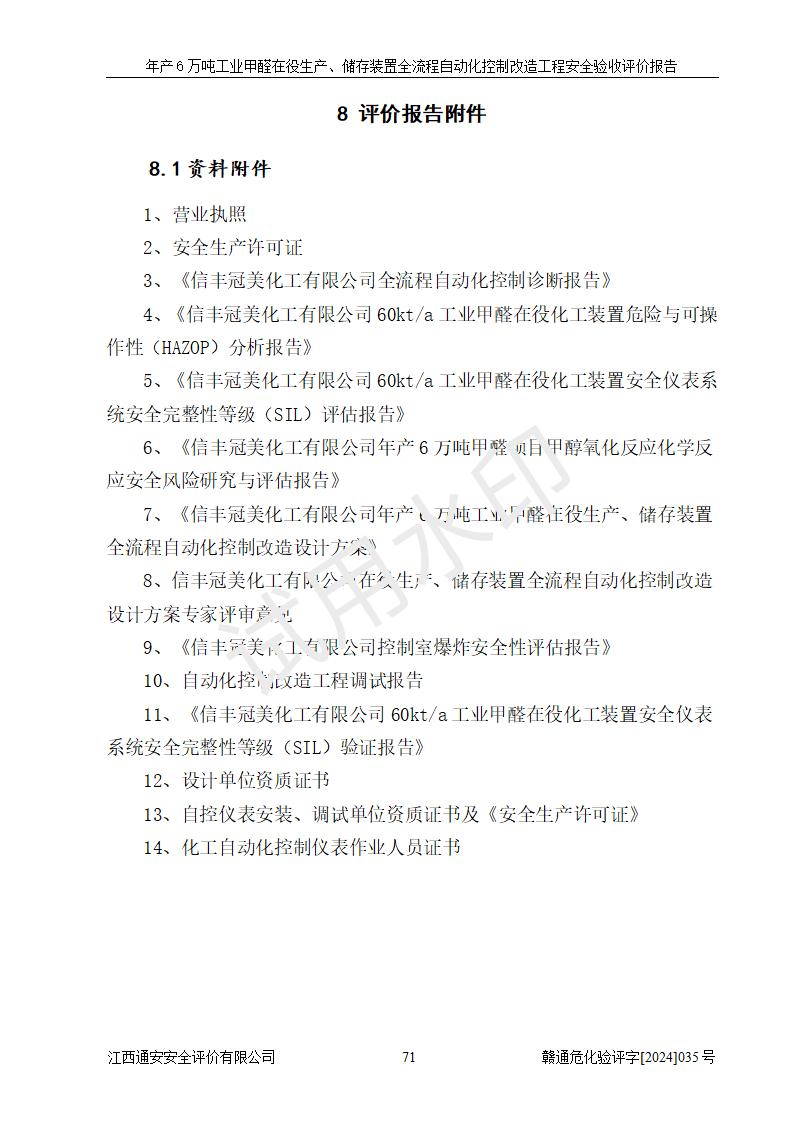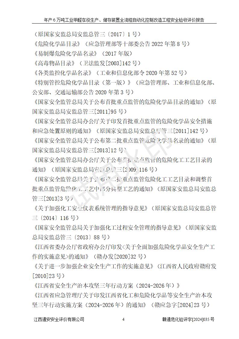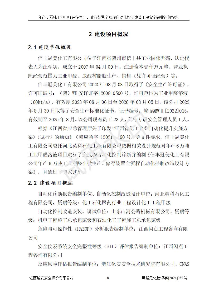 評(píng)價(jià)報(bào)告名稱 | 信豐冠美化工有限公司年產(chǎn)6萬(wàn)噸工業(yè)甲醛在役生產(chǎn)、儲(chǔ)存裝置全流程自動(dòng)化控制改造工程安全驗(yàn)收評(píng)價(jià)報(bào)告 | ||||||
