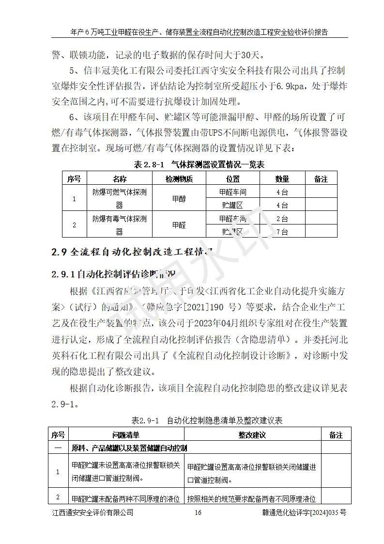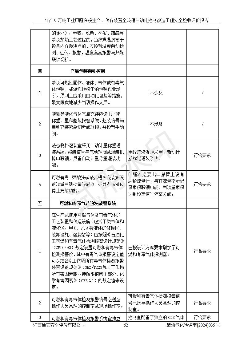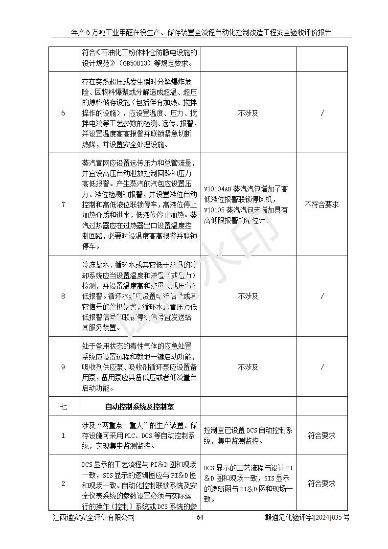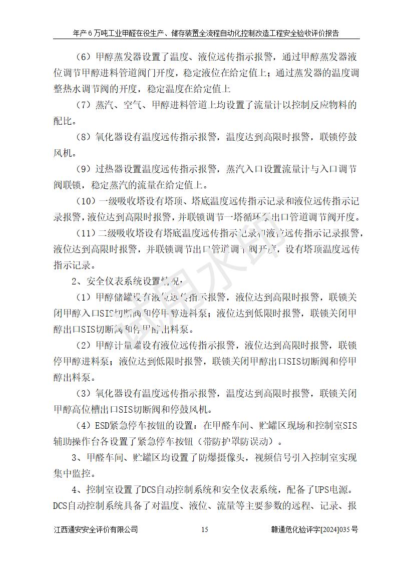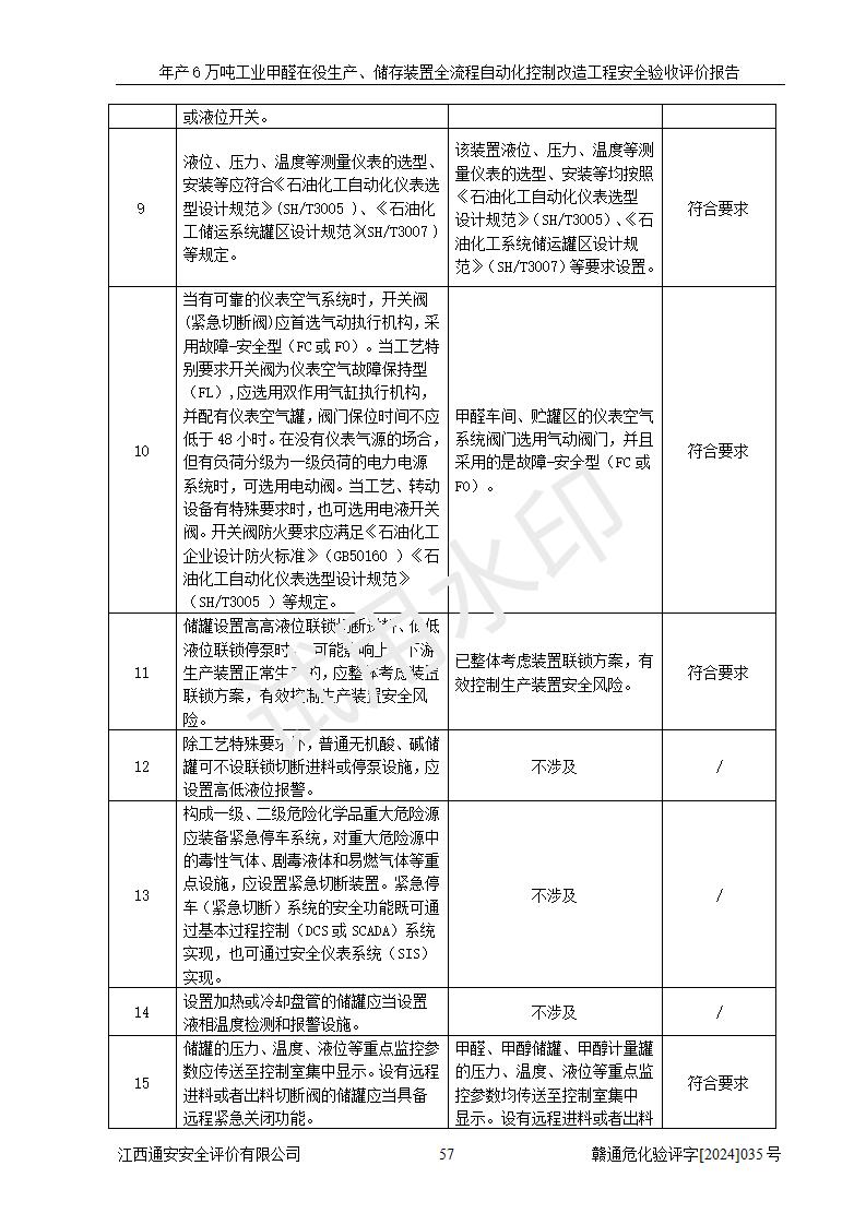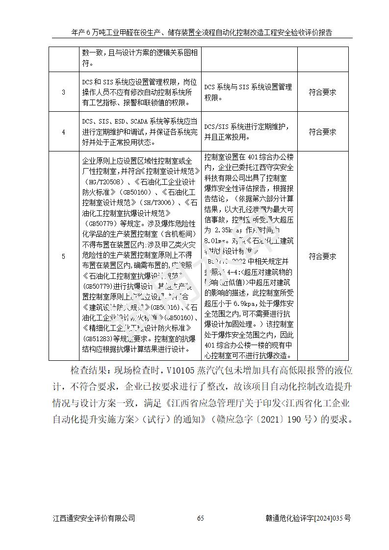 評(píng)價(jià)結(jié)論 | 信豐冠美化工有限公司年產(chǎn)6萬(wàn)噸工業(yè)甲醛在役生產(chǎn)、儲(chǔ)存裝置全流程自動(dòng)化控制改造設(shè)計(jì)方案中提出的控制措施已得到落實(shí),自動(dòng)化控制系統(tǒng)設(shè)置情況與設(shè)計(jì)方案一致,滿足《江西省應(yīng)急管理廳關(guān)于印發(fā)<江西省化工企業(yè)自動(dòng)化提升實(shí)施方案>(試行)的通知》(贛應(yīng)急字〔2021〕190號(hào))的要求,具備自動(dòng)化控制改造工程竣工驗(yàn)收條件。 | ||||||