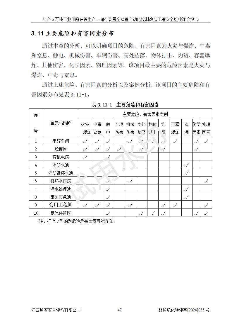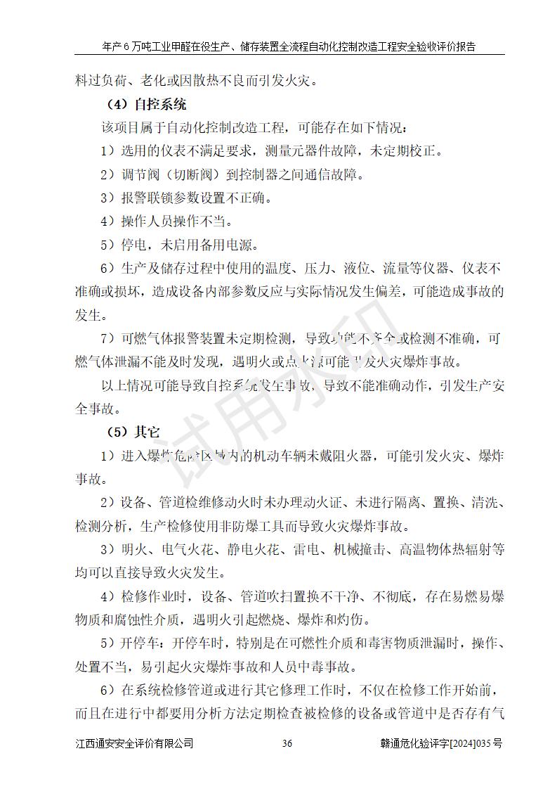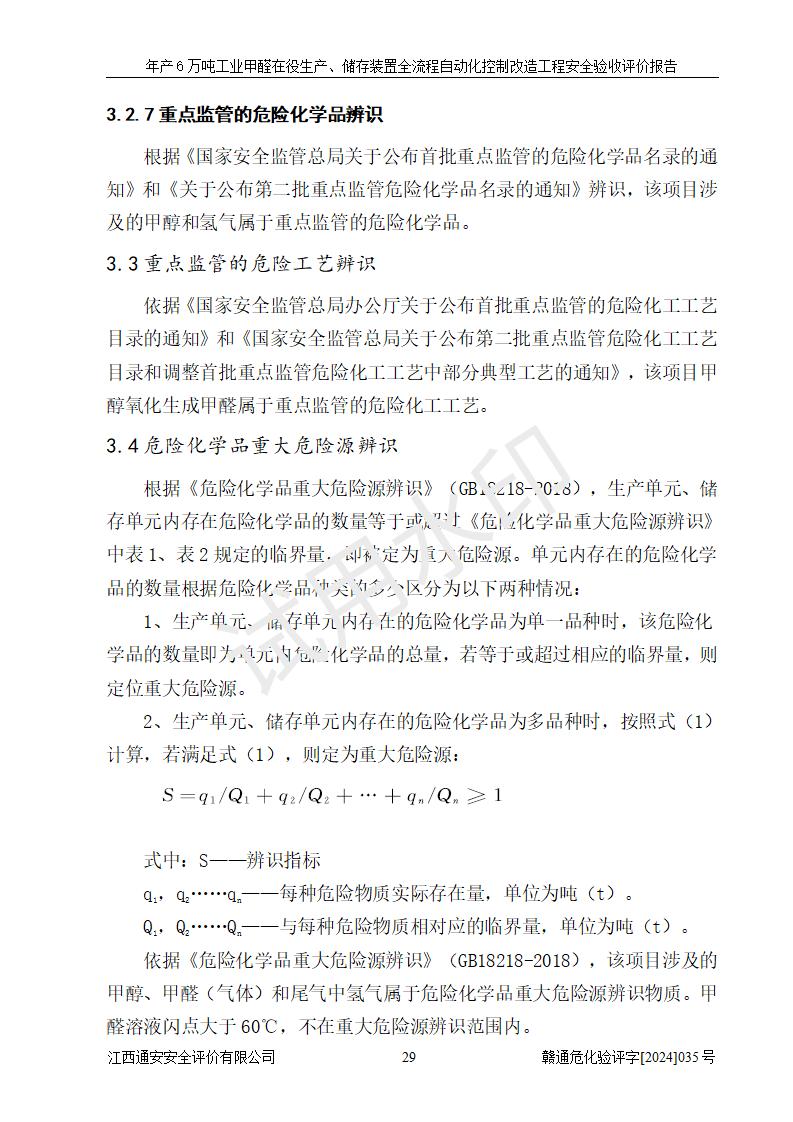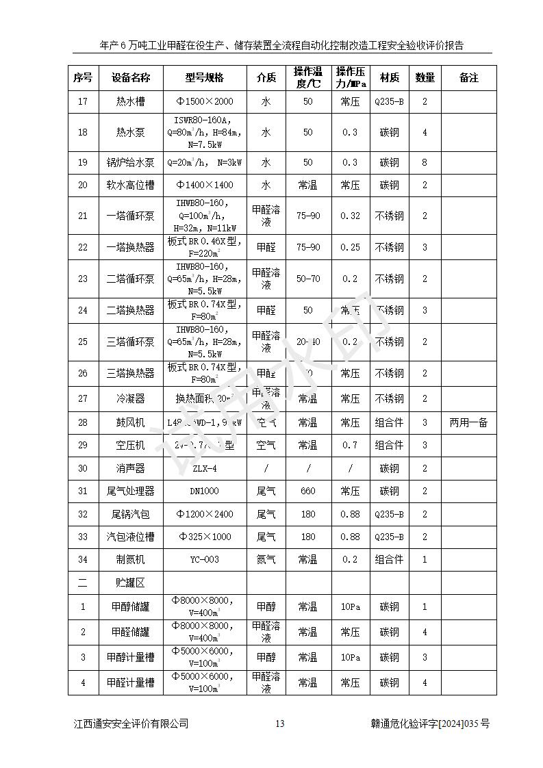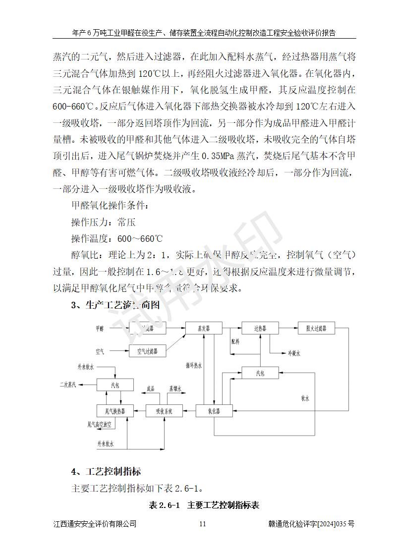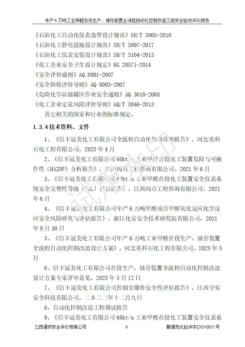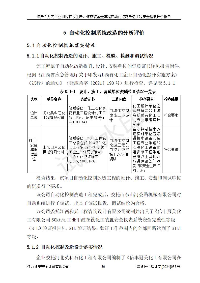 評(píng)價(jià)結(jié)論 | 信豐冠美化工有限公司年產(chǎn)6萬(wàn)噸工業(yè)甲醛在役生產(chǎn)、儲(chǔ)存裝置全流程自動(dòng)化控制改造設(shè)計(jì)方案中提出的控制措施已得到落實(shí),自動(dòng)化控制系統(tǒng)設(shè)置情況與設(shè)計(jì)方案一致,滿足《江西省應(yīng)急管理廳關(guān)于印發(fā)<江西省化工企業(yè)自動(dòng)化提升實(shí)施方案>(試行)的通知》(贛應(yīng)急字〔2021〕190號(hào))的要求,具備自動(dòng)化控制改造工程竣工驗(yàn)收條件。 | ||||||