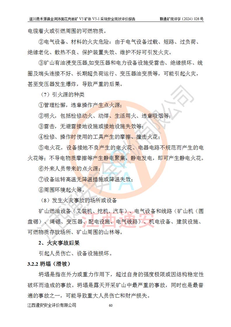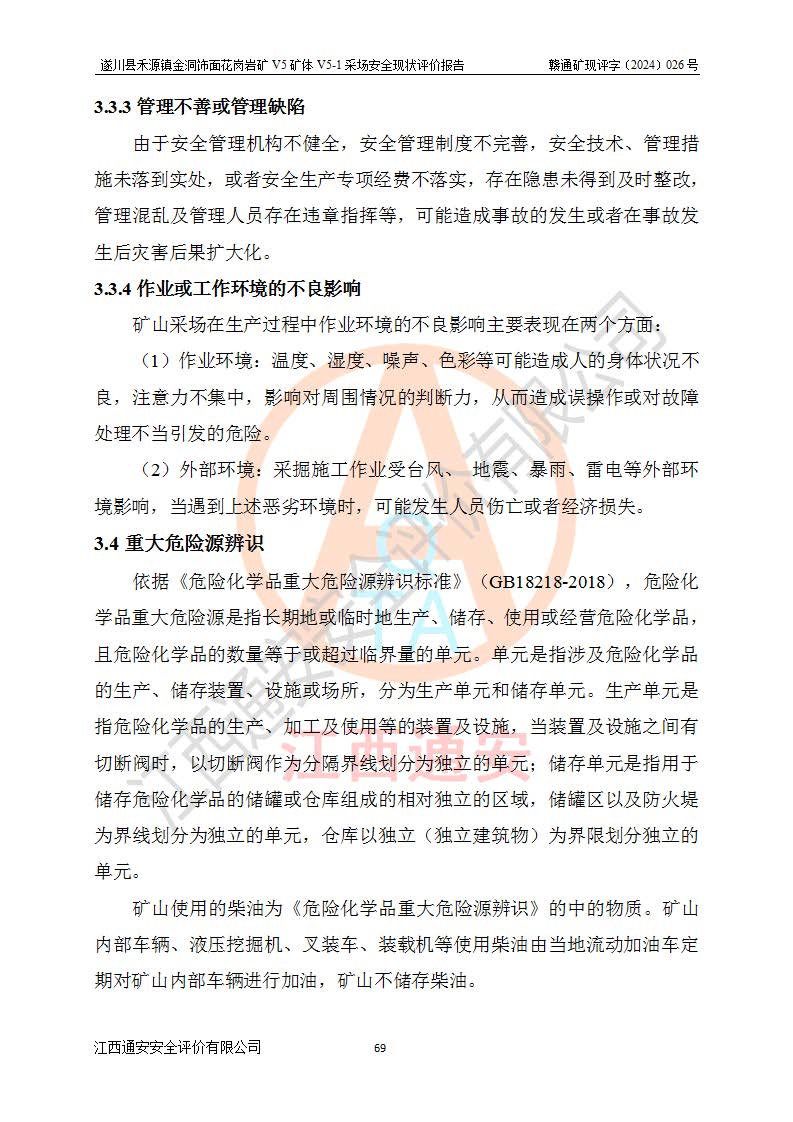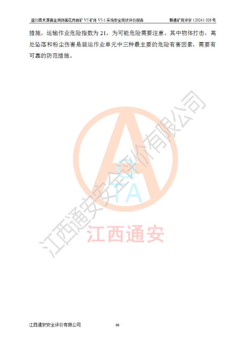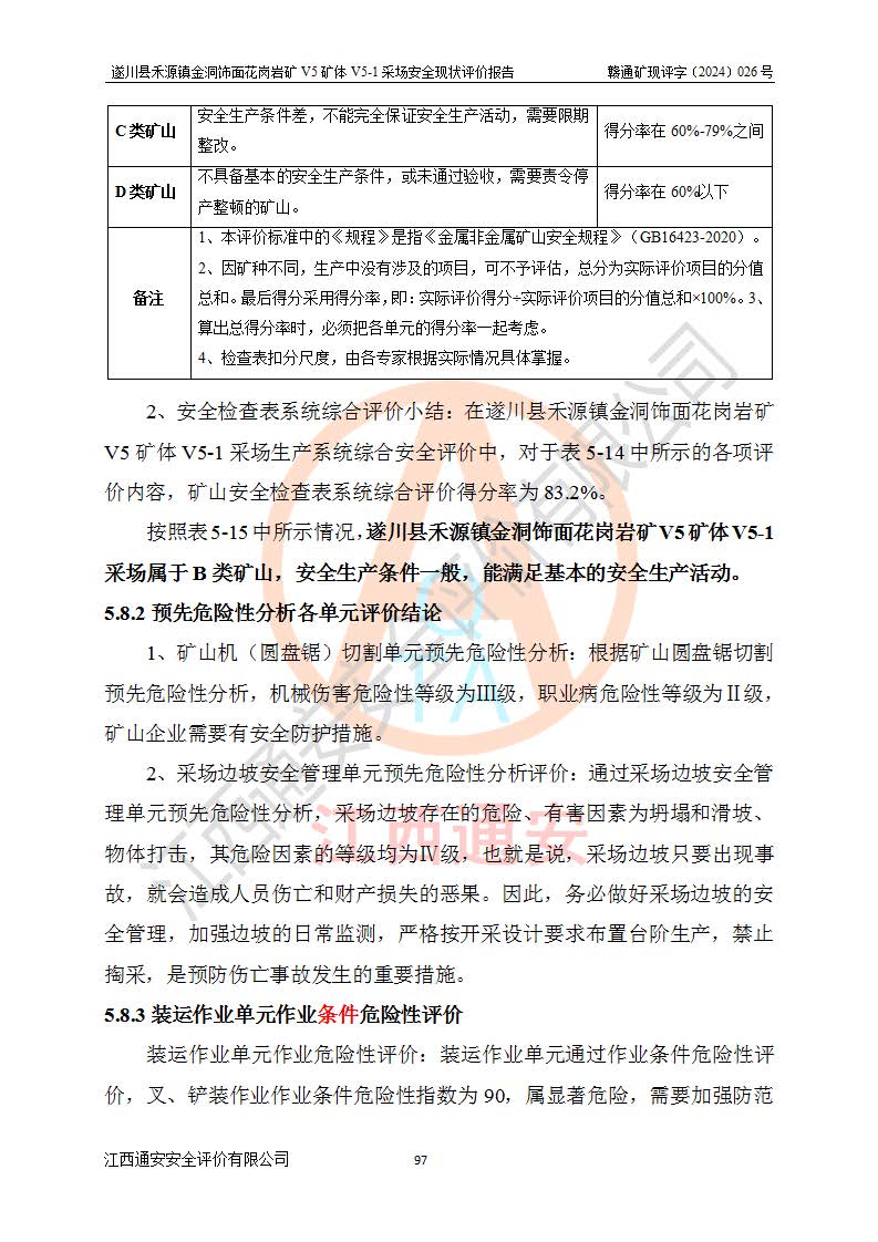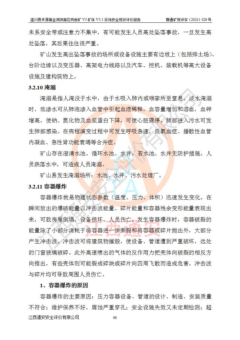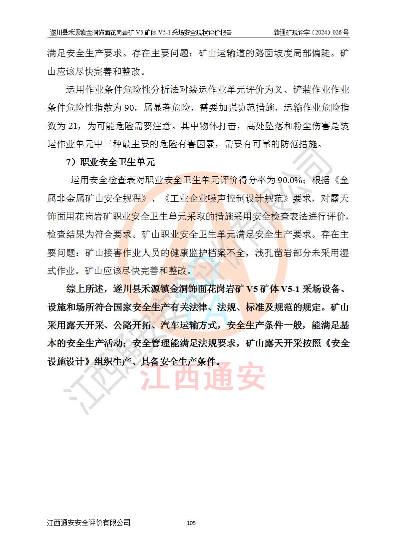 1、該評(píng)價(jià)項(xiàng)目中存在的主要危險(xiǎn)因素:火災(zāi),坍塌(滑坡),**傷害,機(jī)械傷害,觸電與雷擊,物體打擊,泥石流,起重傷害,高處墜落,淹溺,容器爆炸等危險(xiǎn)有害因素。 2、該評(píng)價(jià)項(xiàng)目中存在的有害因素包括:粉塵、噪聲與振動(dòng)、不良作業(yè)環(huán)境,如高溫、雷擊對(duì)礦山人員的傷害和其他不利的環(huán)境因素等。 3、該評(píng)價(jià)項(xiàng)目為非金屬露天礦山,無瓦斯和自燃發(fā)火危險(xiǎn),礦區(qū)范圍內(nèi)及周邊無較大水系,礦區(qū)水文地質(zhì)條件簡單。該礦山只是對(duì)飾面用石料進(jìn)行機(jī)械開采,不使用有毒有害危險(xiǎn)化學(xué)品藥劑。該評(píng)價(jià)項(xiàng)目使用的壓力容器為空壓機(jī)儲(chǔ)氣罐,其工作介質(zhì)為空氣,屬**性、非易燃介質(zhì)。綜合上述分析,本評(píng)價(jià)項(xiàng)目不存在重大危險(xiǎn)源。 上述主要危險(xiǎn)、有害因素在采取本報(bào)告第六章中提出的安全對(duì)策措施及建議后,能得到**控制。遂川縣禾源鎮(zhèn)金洞飾面花崗巖礦V5礦體V5-1采場(chǎng)設(shè)備、設(shè)施和場(chǎng)所符合**安全生產(chǎn)有關(guān)法律、法規(guī)、標(biāo)準(zhǔn)及規(guī)范的規(guī)定。礦山采用露天開采、公路開拓、汽車運(yùn)輸方式,安全生產(chǎn)條件一般,能滿足基本的安全生產(chǎn)活動(dòng);安全管理能滿足法規(guī)要求,礦山露天開采按照《安全設(shè)施設(shè)計(jì)》組織生產(chǎn)、具備安全生產(chǎn)條件。 |