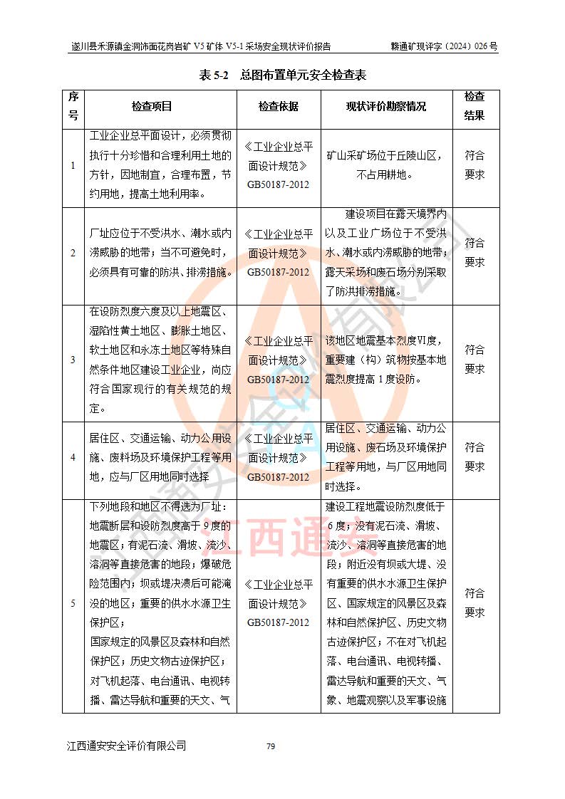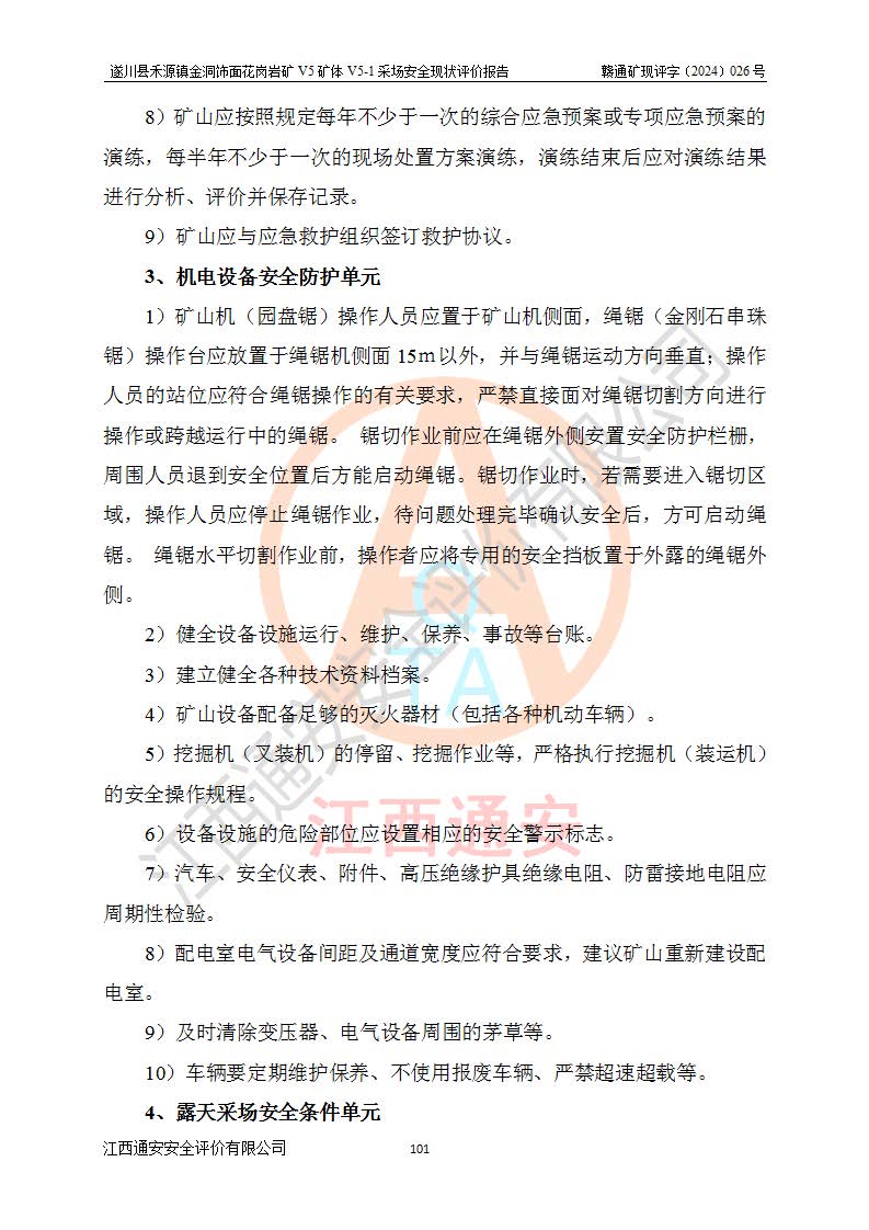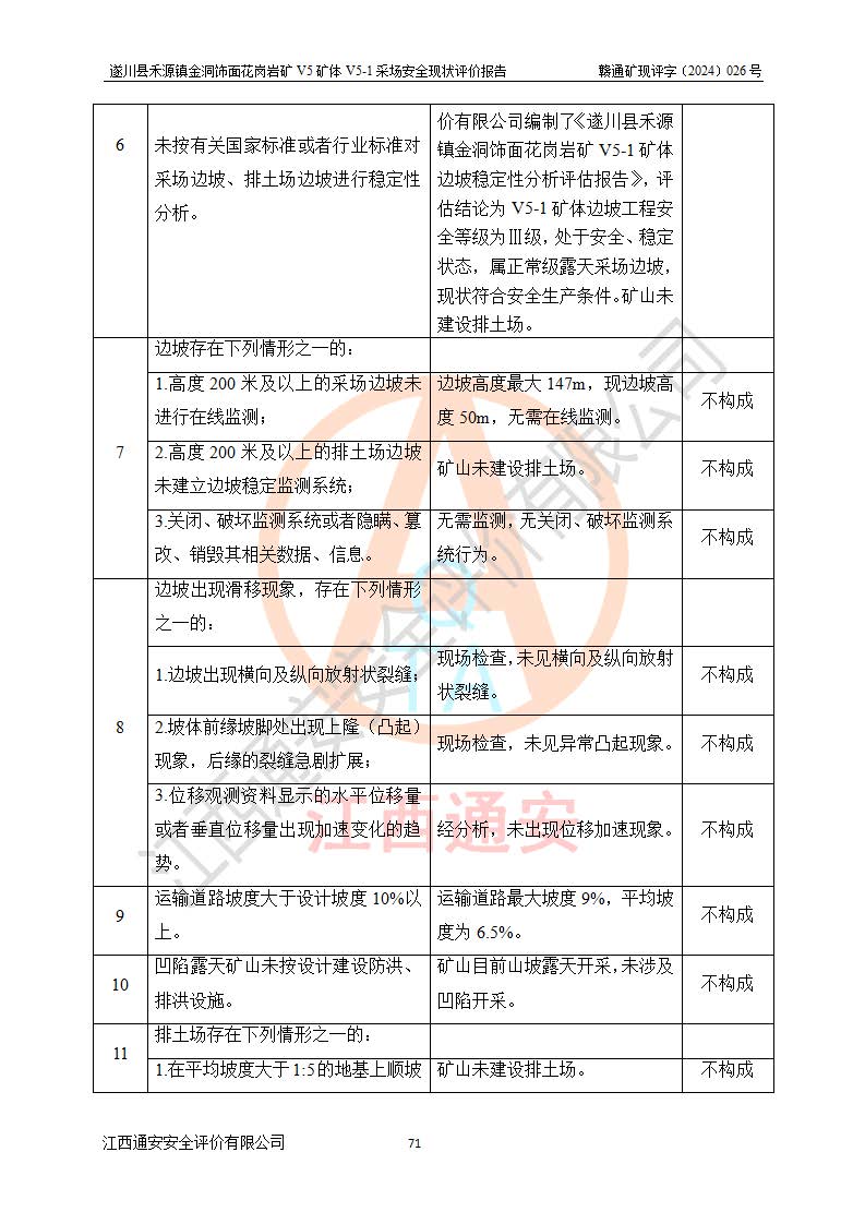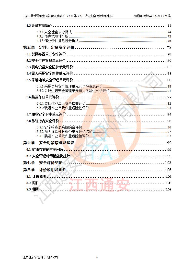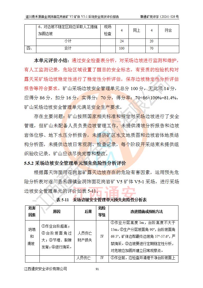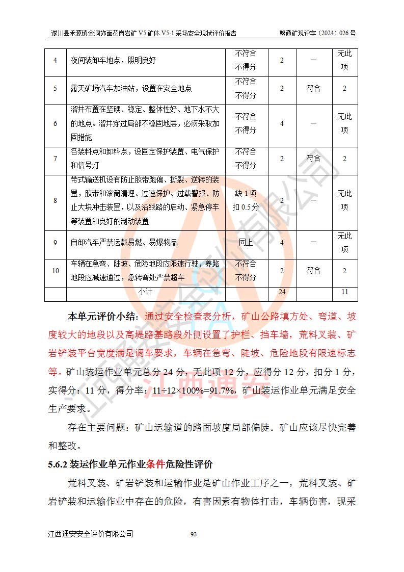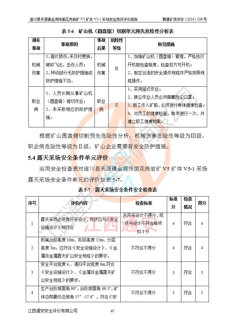 1、該評(píng)價(jià)項(xiàng)目中存在的主要危險(xiǎn)因素:火災(zāi),坍塌(滑坡),**傷害,機(jī)械傷害,觸電與雷擊,物體打擊,泥石流,起重傷害,高處墜落,淹溺,容器爆炸等危險(xiǎn)有害因素。 2、該評(píng)價(jià)項(xiàng)目中存在的有害因素包括:粉塵、噪聲與振動(dòng)、不良作業(yè)環(huán)境,如高溫、雷擊對(duì)礦山人員的傷害和其他不利的環(huán)境因素等。 3、該評(píng)價(jià)項(xiàng)目為非金屬露天礦山,無瓦斯和自燃發(fā)火危險(xiǎn),礦區(qū)范圍內(nèi)及周邊無較大水系,礦區(qū)水文地質(zhì)條件簡單。該礦山只是對(duì)飾面用石料進(jìn)行機(jī)械開采,不使用有毒有害危險(xiǎn)化學(xué)品藥劑。該評(píng)價(jià)項(xiàng)目使用的壓力容器為空壓機(jī)儲(chǔ)氣罐,其工作介質(zhì)為空氣,屬**性、非易燃介質(zhì)。綜合上述分析,本評(píng)價(jià)項(xiàng)目不存在重大危險(xiǎn)源。 上述主要危險(xiǎn)、有害因素在采取本報(bào)告第六章中提出的安全對(duì)策措施及建議后,能得到**控制。遂川縣禾源鎮(zhèn)金洞飾面花崗巖礦V5礦體V5-1采場(chǎng)設(shè)備、設(shè)施和場(chǎng)所符合**安全生產(chǎn)有關(guān)法律、法規(guī)、標(biāo)準(zhǔn)及規(guī)范的規(guī)定。礦山采用露天開采、公路開拓、汽車運(yùn)輸方式,安全生產(chǎn)條件一般,能滿足基本的安全生產(chǎn)活動(dòng);安全管理能滿足法規(guī)要求,礦山露天開采按照《安全設(shè)施設(shè)計(jì)》組織生產(chǎn)、具備安全生產(chǎn)條件。 |