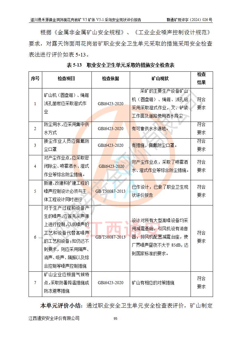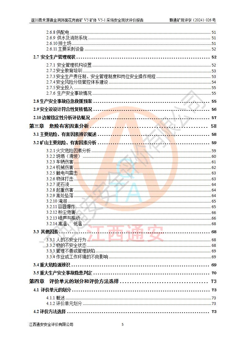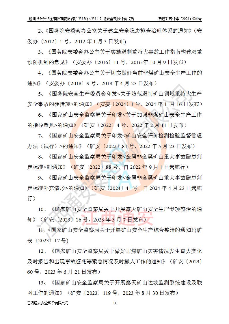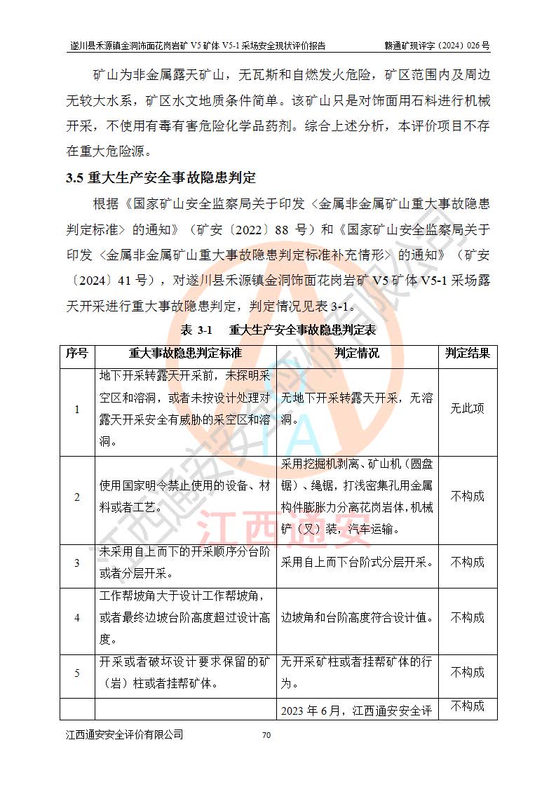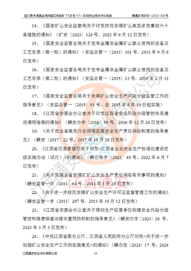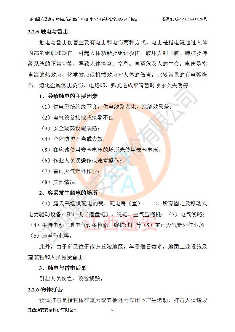 1、該評(píng)價(jià)項(xiàng)目中存在的主要危險(xiǎn)因素:火災(zāi),坍塌(滑坡),**傷害,機(jī)械傷害,觸電與雷擊,物體打擊,泥石流,起重傷害,高處墜落,淹溺,容器爆炸等危險(xiǎn)有害因素。 2、該評(píng)價(jià)項(xiàng)目中存在的有害因素包括:粉塵、噪聲與振動(dòng)、不良作業(yè)環(huán)境,如高溫、雷擊對(duì)礦山人員的傷害和其他不利的環(huán)境因素等。 3、該評(píng)價(jià)項(xiàng)目為非金屬露天礦山,無瓦斯和自燃發(fā)火危險(xiǎn),礦區(qū)范圍內(nèi)及周邊無較大水系,礦區(qū)水文地質(zhì)條件簡單。該礦山只是對(duì)飾面用石料進(jìn)行機(jī)械開采,不使用有毒有害危險(xiǎn)化學(xué)品藥劑。該評(píng)價(jià)項(xiàng)目使用的壓力容器為空壓機(jī)儲(chǔ)氣罐,其工作介質(zhì)為空氣,屬**性、非易燃介質(zhì)。綜合上述分析,本評(píng)價(jià)項(xiàng)目不存在重大危險(xiǎn)源。 上述主要危險(xiǎn)、有害因素在采取本報(bào)告第六章中提出的安全對(duì)策措施及建議后,能得到**控制。遂川縣禾源鎮(zhèn)金洞飾面花崗巖礦V5礦體V5-1采場(chǎng)設(shè)備、設(shè)施和場(chǎng)所符合**安全生產(chǎn)有關(guān)法律、法規(guī)、標(biāo)準(zhǔn)及規(guī)范的規(guī)定。礦山采用露天開采、公路開拓、汽車運(yùn)輸方式,安全生產(chǎn)條件一般,能滿足基本的安全生產(chǎn)活動(dòng);安全管理能滿足法規(guī)要求,礦山露天開采按照《安全設(shè)施設(shè)計(jì)》組織生產(chǎn)、具備安全生產(chǎn)條件。 |
