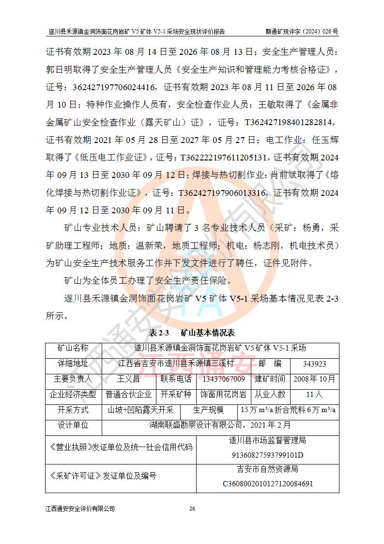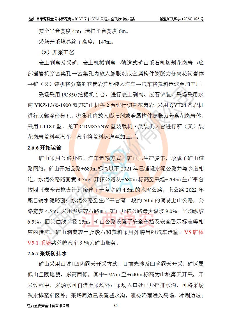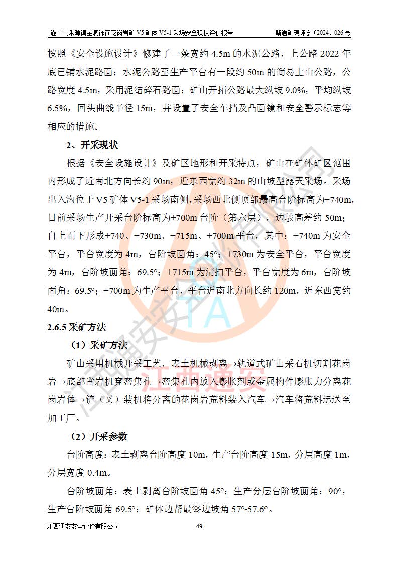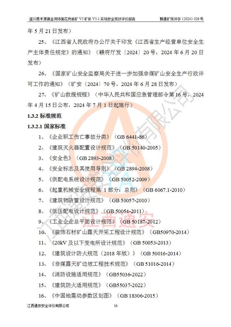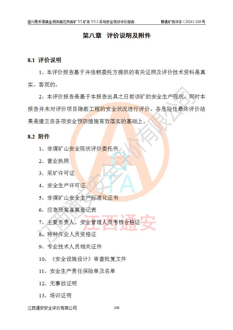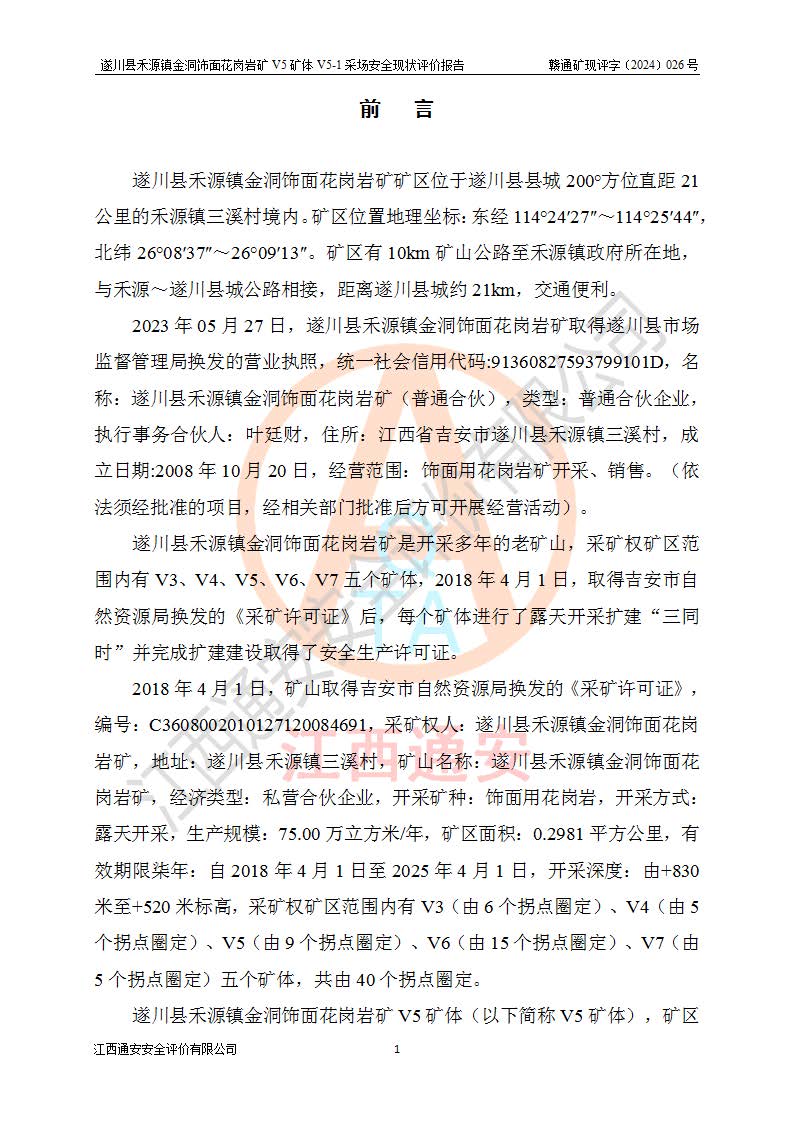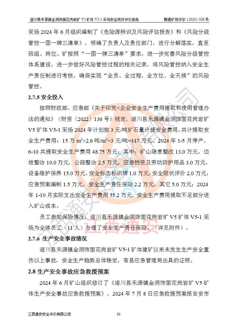 1、該評(píng)價(jià)項(xiàng)目中存在的主要危險(xiǎn)因素:火災(zāi),坍塌(滑坡),**傷害,機(jī)械傷害,觸電與雷擊,物體打擊,泥石流,起重傷害,高處墜落,淹溺,容器爆炸等危險(xiǎn)有害因素。 2、該評(píng)價(jià)項(xiàng)目中存在的有害因素包括:粉塵、噪聲與振動(dòng)、不良作業(yè)環(huán)境,如高溫、雷擊對(duì)礦山人員的傷害和其他不利的環(huán)境因素等。 3、該評(píng)價(jià)項(xiàng)目為非金屬露天礦山,無瓦斯和自燃發(fā)火危險(xiǎn),礦區(qū)范圍內(nèi)及周邊無較大水系,礦區(qū)水文地質(zhì)條件簡單。該礦山只是對(duì)飾面用石料進(jìn)行機(jī)械開采,不使用有毒有害危險(xiǎn)化學(xué)品藥劑。該評(píng)價(jià)項(xiàng)目使用的壓力容器為空壓機(jī)儲(chǔ)氣罐,其工作介質(zhì)為空氣,屬**性、非易燃介質(zhì)。綜合上述分析,本評(píng)價(jià)項(xiàng)目不存在重大危險(xiǎn)源。 上述主要危險(xiǎn)、有害因素在采取本報(bào)告第六章中提出的安全對(duì)策措施及建議后,能得到**控制。遂川縣禾源鎮(zhèn)金洞飾面花崗巖礦V5礦體V5-1采場(chǎng)設(shè)備、設(shè)施和場(chǎng)所符合**安全生產(chǎn)有關(guān)法律、法規(guī)、標(biāo)準(zhǔn)及規(guī)范的規(guī)定。礦山采用露天開采、公路開拓、汽車運(yùn)輸方式,安全生產(chǎn)條件一般,能滿足基本的安全生產(chǎn)活動(dòng);安全管理能滿足法規(guī)要求,礦山露天開采按照《安全設(shè)施設(shè)計(jì)》組織生產(chǎn)、具備安全生產(chǎn)條件。 |