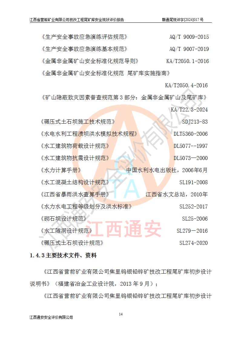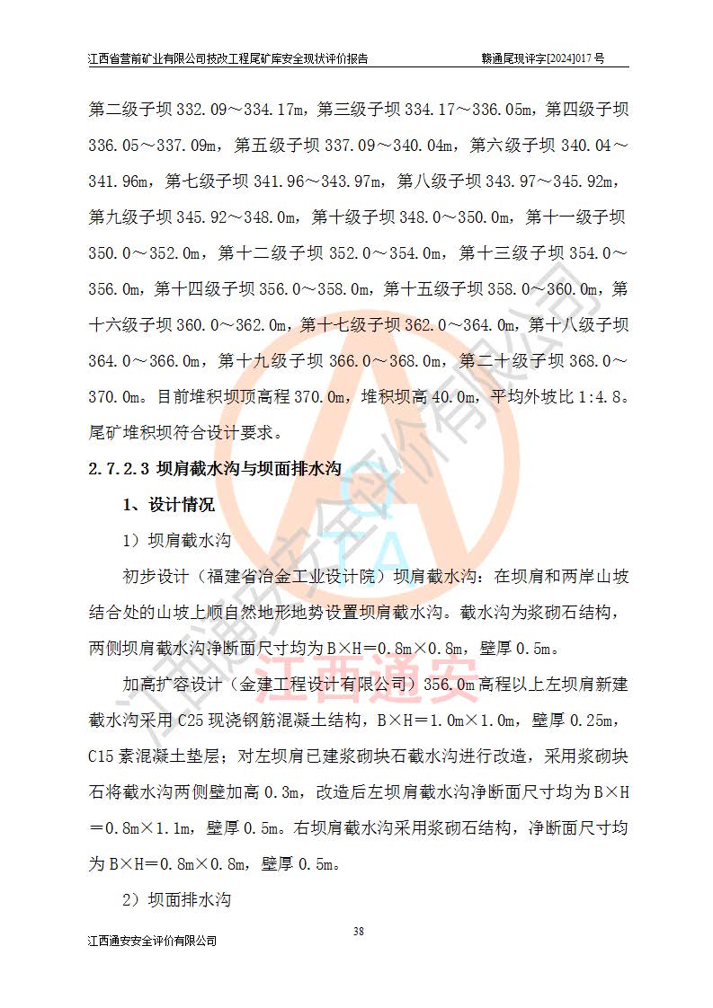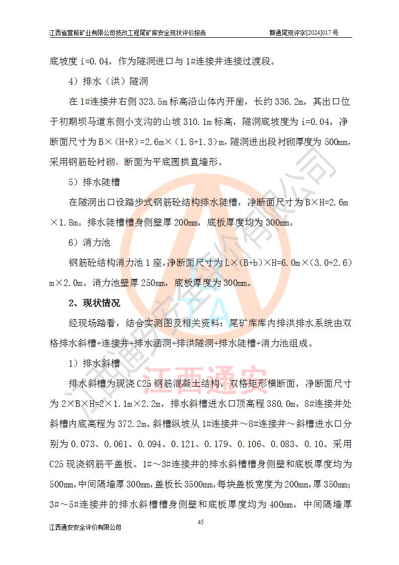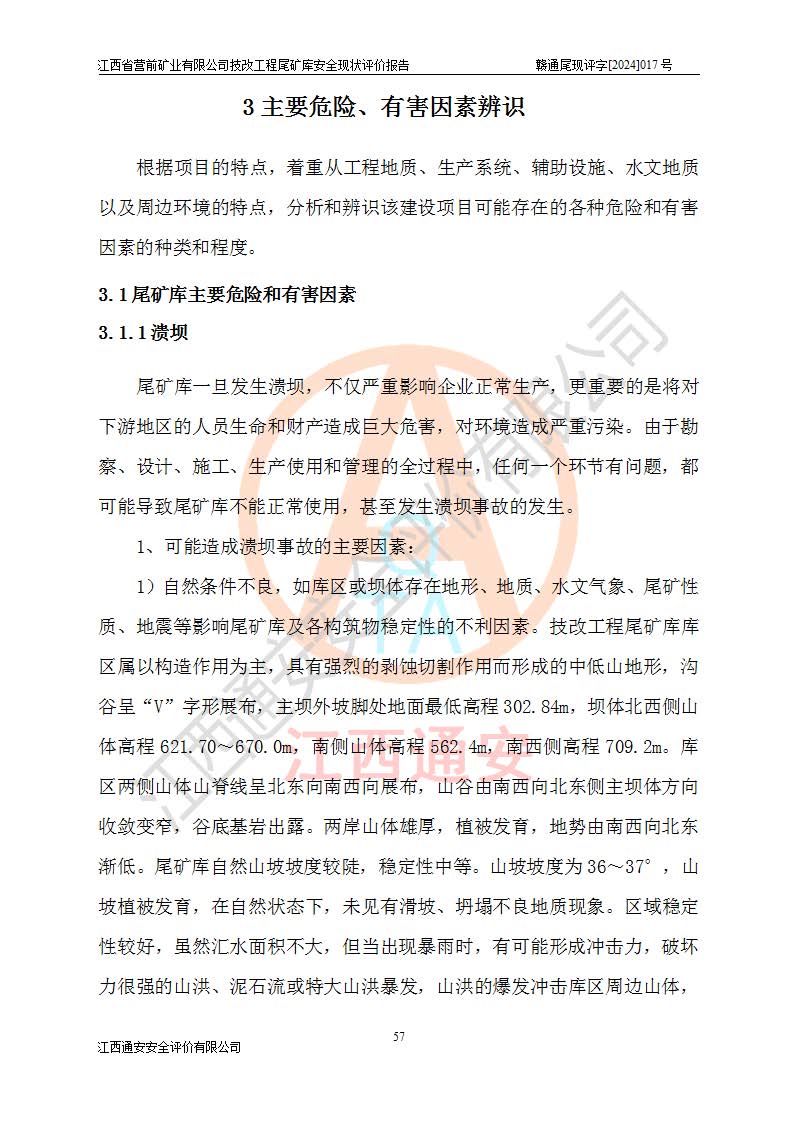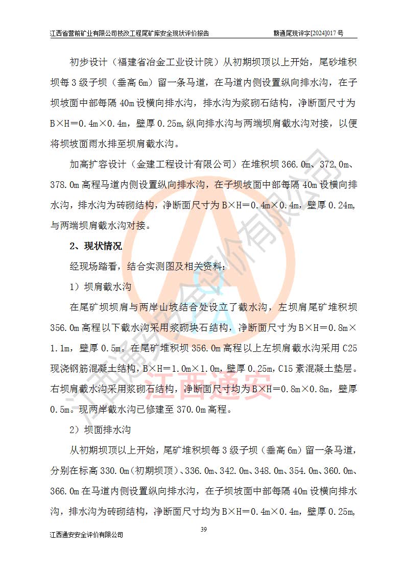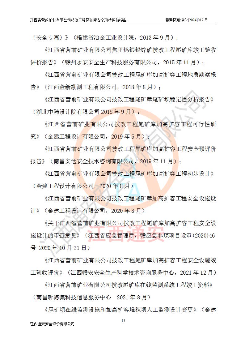 江西省營(yíng)前礦業(yè)有限公司于2003年12月16日成立,位于贛州市上猶縣營(yíng)前鎮(zhèn)焦里村境內(nèi),公司注冊(cè)資本10000萬(wàn)元,法定**人陳雅博,礦區(qū)地理坐標(biāo):東經(jīng)114°18′30″~114°19′00″,北緯25°52′35″~25°53′47″。公司經(jīng)營(yíng)范圍包括:鉛礦、鋅、鎢、銀地下開(kāi)采、銷(xiāo)售。 江西省營(yíng)前礦業(yè)有限公司技改工程尾礦庫(kù)位于焦里鎢銀鉛鋅礦區(qū),處于上猶縣水巖鄉(xiāng)井子村坑尾自然村境內(nèi),山谷型尾礦庫(kù),溝谷呈“V”字形展布,技改工程尾礦庫(kù)原由福建省冶金工業(yè)設(shè)計(jì)院設(shè)計(jì),后由金建工程設(shè)計(jì)有限公司對(duì)該尾礦庫(kù)進(jìn)行了加高擴(kuò)容設(shè)計(jì),加高擴(kuò)容后總庫(kù)容503.14萬(wàn)m3,壩高75.0m,為三等庫(kù)。尾礦庫(kù)主要由尾礦壩、庫(kù)外分洪系統(tǒng)(1#攔洪壩--1#分洪隧洞和2#攔洪壩--2#分洪隧洞--排水陡槽--消力池),庫(kù)內(nèi)排洪排水系統(tǒng)(排水斜槽—連接井—排水涵洞—排水隧洞—排水陡槽—消力池)等組成,尾礦壩壩型為初期壩+上游式堆積壩。 江西省營(yíng)前礦業(yè)有限公司技改工程尾礦庫(kù)于2021年12月30日取得江西省應(yīng)急管理廳版發(fā)的安全生產(chǎn)許可證,證書(shū)編號(hào)(贛)FM安許證字(2016)M1692號(hào),有限期從2022年1月18日到2025年1月17日,為三年期。依照《非煤礦礦山企業(yè)安全生產(chǎn)許可證延期換證工作》的通知,根據(jù)***《安全生產(chǎn)許可證條例》、《江西省安全生產(chǎn)條例》、《非煤礦山安全生產(chǎn)許可證實(shí)施辦法》、《江西省非煤礦礦山企業(yè)安全生產(chǎn)許可證辦法》規(guī)定的要求,受江西省營(yíng)前礦業(yè)有限公司委托,我公司承擔(dān)了技改工程尾礦庫(kù)延期換證安全現(xiàn)狀評(píng)價(jià)工作。 |