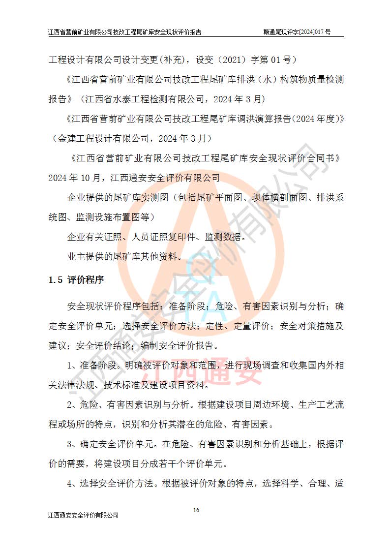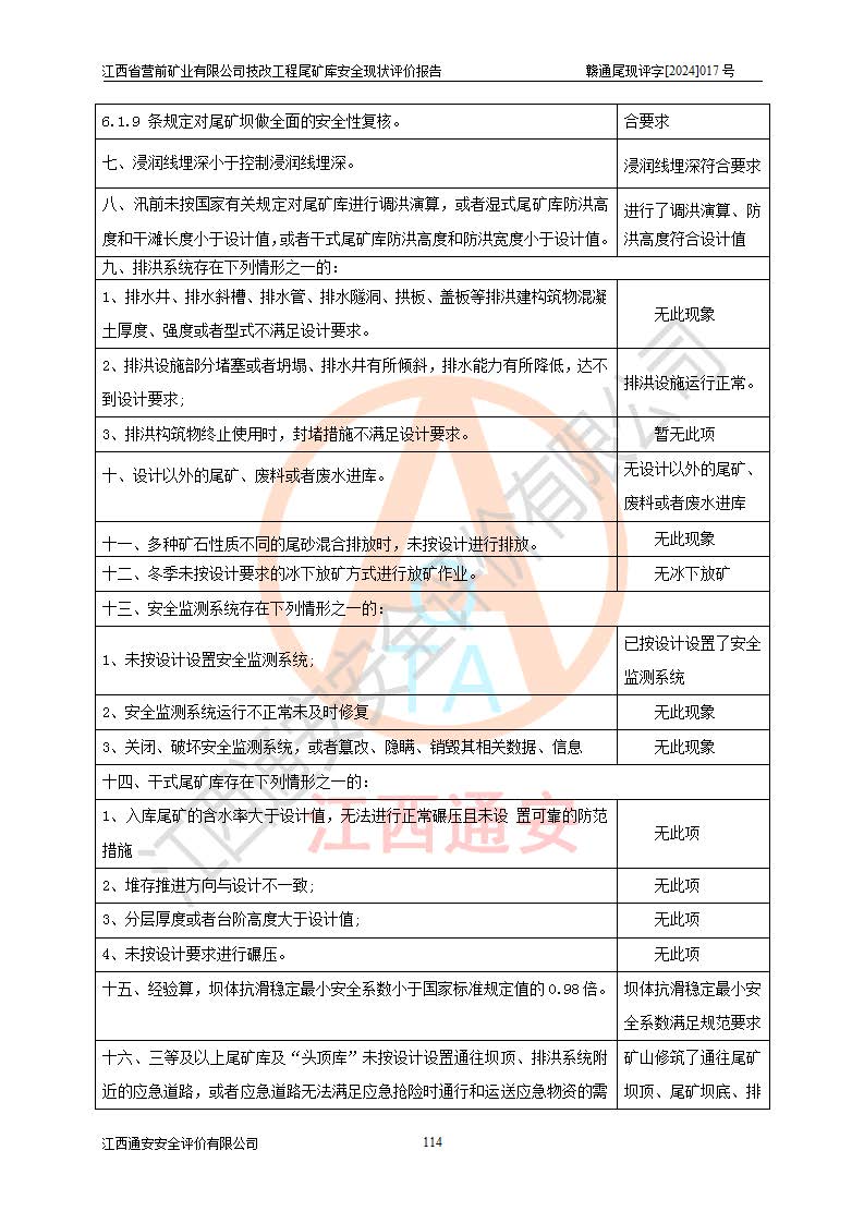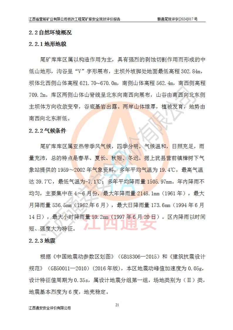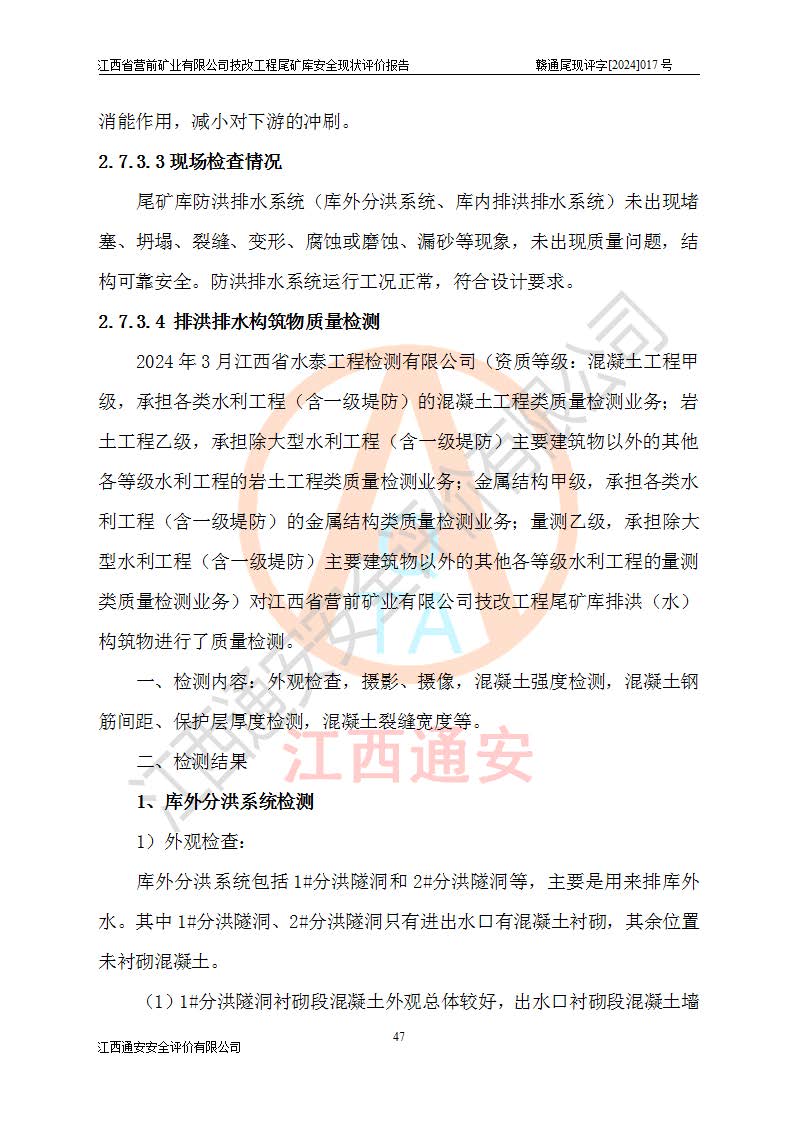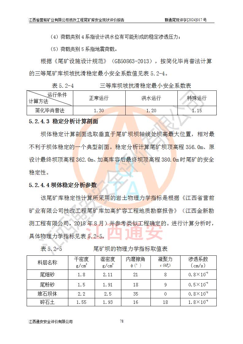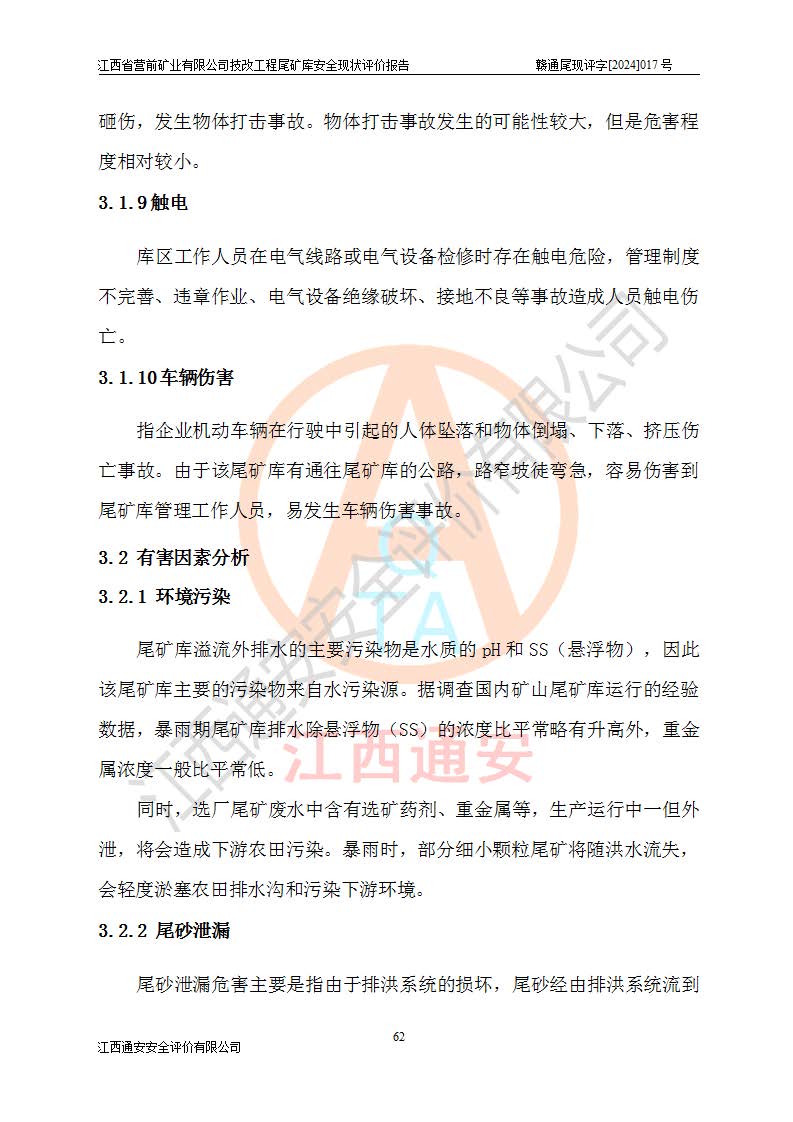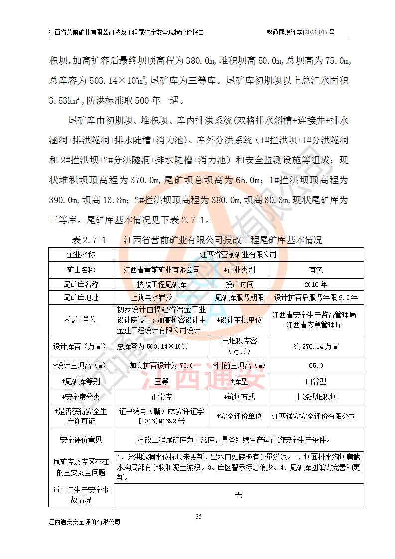 江西省營(yíng)前礦業(yè)有限公司于2003年12月16日成立,位于贛州市上猶縣營(yíng)前鎮(zhèn)焦里村境內(nèi),公司注冊(cè)資本10000萬(wàn)元,法定**人陳雅博,礦區(qū)地理坐標(biāo):東經(jīng)114°18′30″~114°19′00″,北緯25°52′35″~25°53′47″。公司經(jīng)營(yíng)范圍包括:鉛礦、鋅、鎢、銀地下開(kāi)采、銷(xiāo)售。 江西省營(yíng)前礦業(yè)有限公司技改工程尾礦庫(kù)位于焦里鎢銀鉛鋅礦區(qū),處于上猶縣水巖鄉(xiāng)井子村坑尾自然村境內(nèi),山谷型尾礦庫(kù),溝谷呈“V”字形展布,技改工程尾礦庫(kù)原由福建省冶金工業(yè)設(shè)計(jì)院設(shè)計(jì),后由金建工程設(shè)計(jì)有限公司對(duì)該尾礦庫(kù)進(jìn)行了加高擴(kuò)容設(shè)計(jì),加高擴(kuò)容后總庫(kù)容503.14萬(wàn)m3,壩高75.0m,為三等庫(kù)。尾礦庫(kù)主要由尾礦壩、庫(kù)外分洪系統(tǒng)(1#攔洪壩--1#分洪隧洞和2#攔洪壩--2#分洪隧洞--排水陡槽--消力池),庫(kù)內(nèi)排洪排水系統(tǒng)(排水斜槽—連接井—排水涵洞—排水隧洞—排水陡槽—消力池)等組成,尾礦壩壩型為初期壩+上游式堆積壩。 江西省營(yíng)前礦業(yè)有限公司技改工程尾礦庫(kù)于2021年12月30日取得江西省應(yīng)急管理廳版發(fā)的安全生產(chǎn)許可證,證書(shū)編號(hào)(贛)FM安許證字(2016)M1692號(hào),有限期從2022年1月18日到2025年1月17日,為三年期。依照《非煤礦礦山企業(yè)安全生產(chǎn)許可證延期換證工作》的通知,根據(jù)***《安全生產(chǎn)許可證條例》、《江西省安全生產(chǎn)條例》、《非煤礦山安全生產(chǎn)許可證實(shí)施辦法》、《江西省非煤礦礦山企業(yè)安全生產(chǎn)許可證辦法》規(guī)定的要求,受江西省營(yíng)前礦業(yè)有限公司委托,我公司承擔(dān)了技改工程尾礦庫(kù)延期換證安全現(xiàn)狀評(píng)價(jià)工作。 |