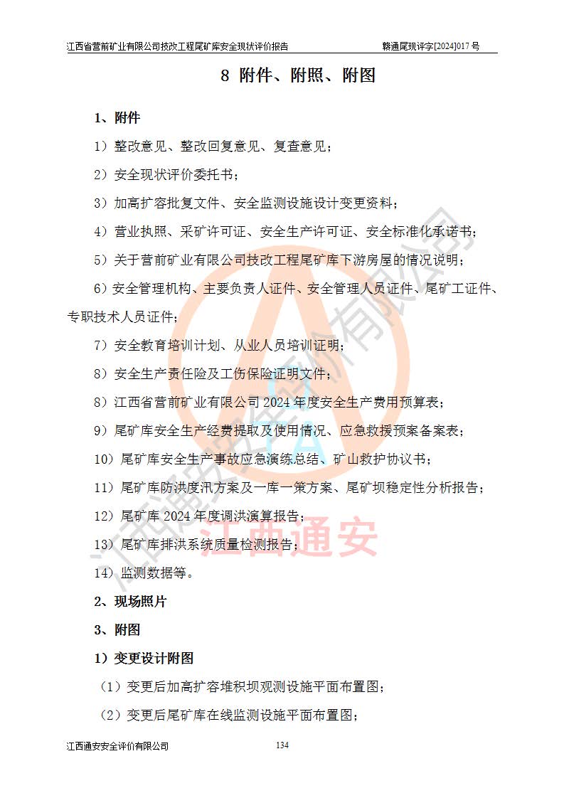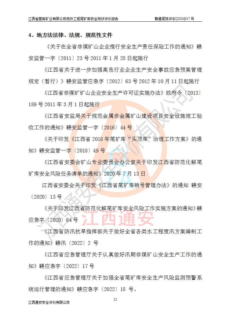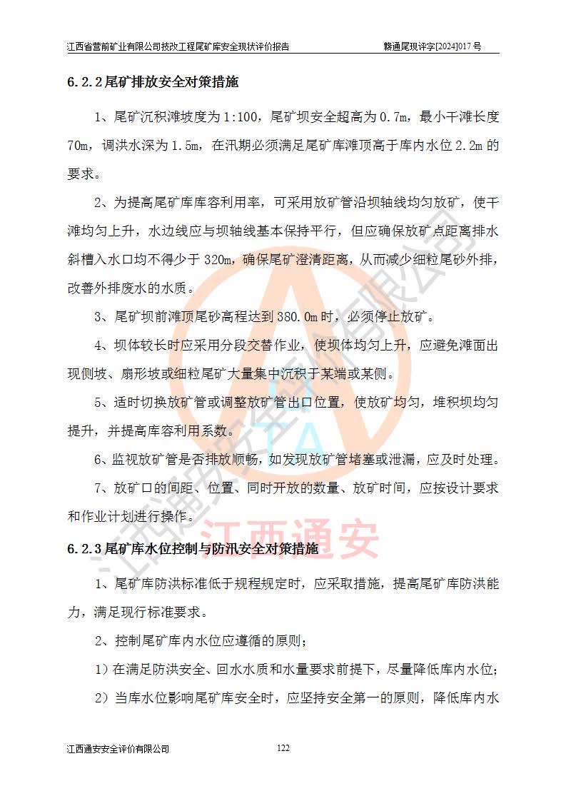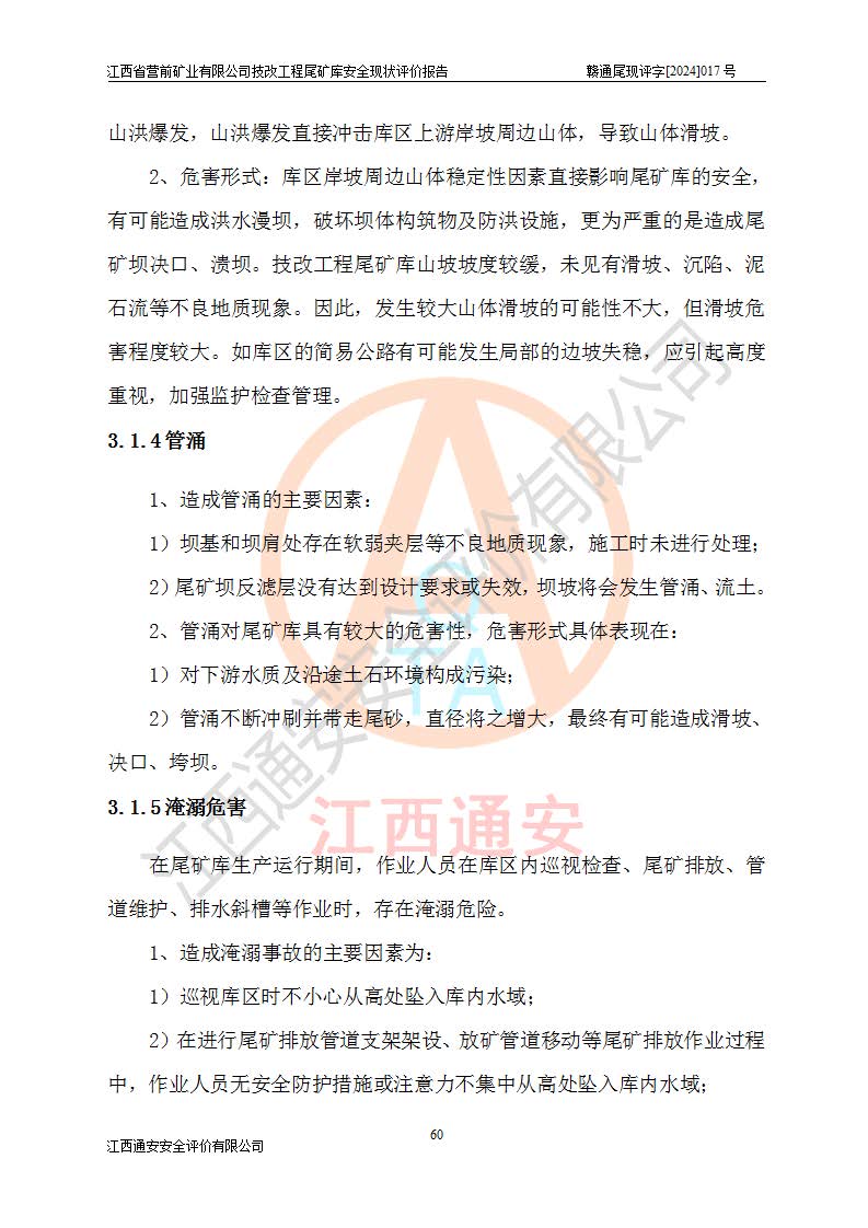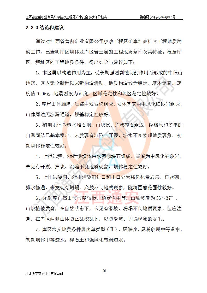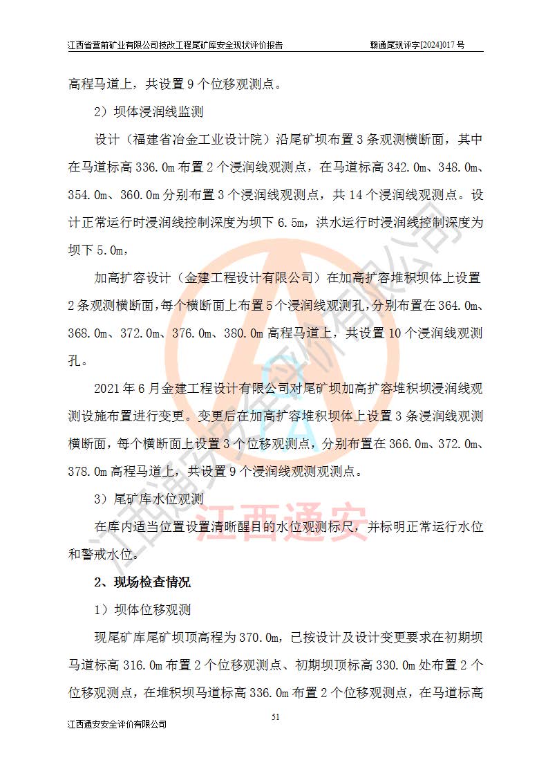 江西省營(yíng)前礦業(yè)有限公司于2003年12月16日成立,位于贛州市上猶縣營(yíng)前鎮(zhèn)焦里村境內(nèi),公司注冊(cè)資本10000萬(wàn)元,法定**人陳雅博,礦區(qū)地理坐標(biāo):東經(jīng)114°18′30″~114°19′00″,北緯25°52′35″~25°53′47″。公司經(jīng)營(yíng)范圍包括:鉛礦、鋅、鎢、銀地下開(kāi)采、銷(xiāo)售。 江西省營(yíng)前礦業(yè)有限公司技改工程尾礦庫(kù)位于焦里鎢銀鉛鋅礦區(qū),處于上猶縣水巖鄉(xiāng)井子村坑尾自然村境內(nèi),山谷型尾礦庫(kù),溝谷呈“V”字形展布,技改工程尾礦庫(kù)原由福建省冶金工業(yè)設(shè)計(jì)院設(shè)計(jì),后由金建工程設(shè)計(jì)有限公司對(duì)該尾礦庫(kù)進(jìn)行了加高擴(kuò)容設(shè)計(jì),加高擴(kuò)容后總庫(kù)容503.14萬(wàn)m3,壩高75.0m,為三等庫(kù)。尾礦庫(kù)主要由尾礦壩、庫(kù)外分洪系統(tǒng)(1#攔洪壩--1#分洪隧洞和2#攔洪壩--2#分洪隧洞--排水陡槽--消力池),庫(kù)內(nèi)排洪排水系統(tǒng)(排水斜槽—連接井—排水涵洞—排水隧洞—排水陡槽—消力池)等組成,尾礦壩壩型為初期壩+上游式堆積壩。 江西省營(yíng)前礦業(yè)有限公司技改工程尾礦庫(kù)于2021年12月30日取得江西省應(yīng)急管理廳版發(fā)的安全生產(chǎn)許可證,證書(shū)編號(hào)(贛)FM安許證字(2016)M1692號(hào),有限期從2022年1月18日到2025年1月17日,為三年期。依照《非煤礦礦山企業(yè)安全生產(chǎn)許可證延期換證工作》的通知,根據(jù)***《安全生產(chǎn)許可證條例》、《江西省安全生產(chǎn)條例》、《非煤礦山安全生產(chǎn)許可證實(shí)施辦法》、《江西省非煤礦礦山企業(yè)安全生產(chǎn)許可證辦法》規(guī)定的要求,受江西省營(yíng)前礦業(yè)有限公司委托,我公司承擔(dān)了技改工程尾礦庫(kù)延期換證安全現(xiàn)狀評(píng)價(jià)工作。 |