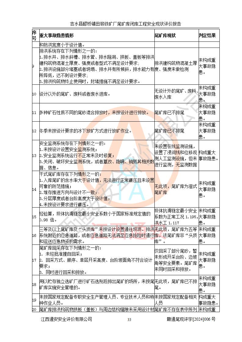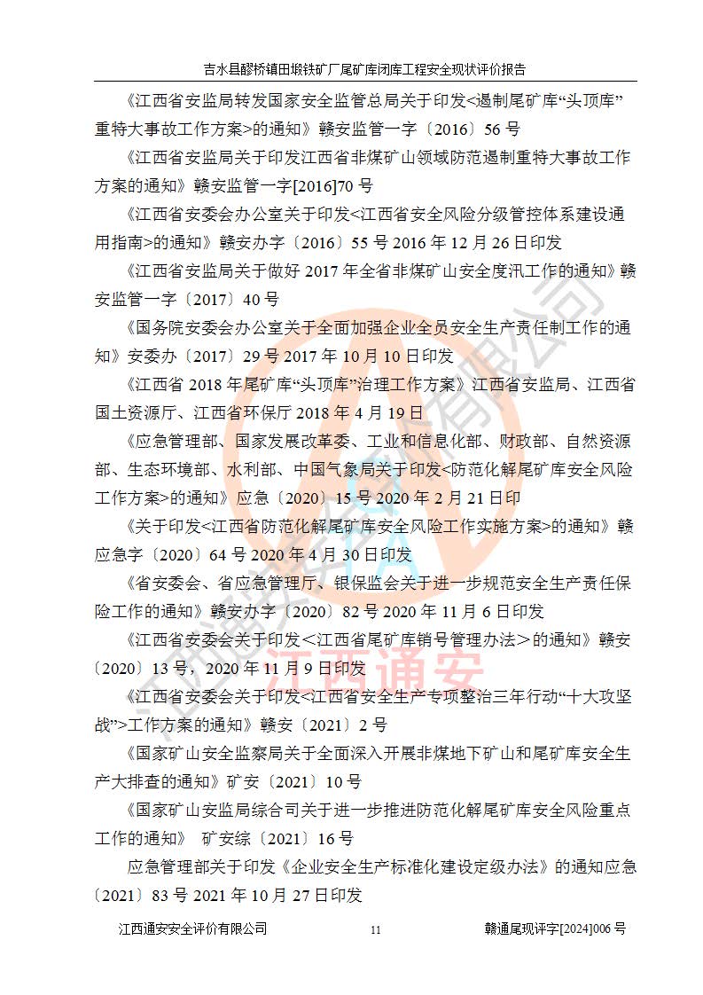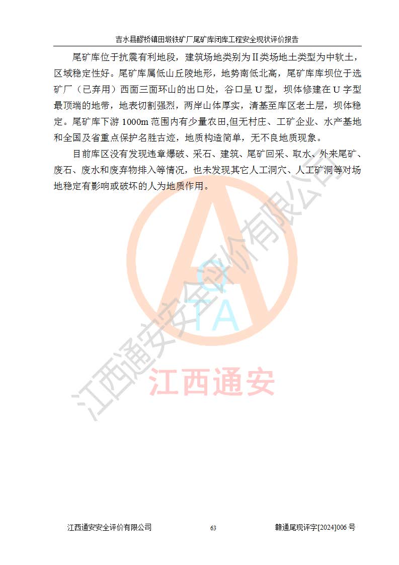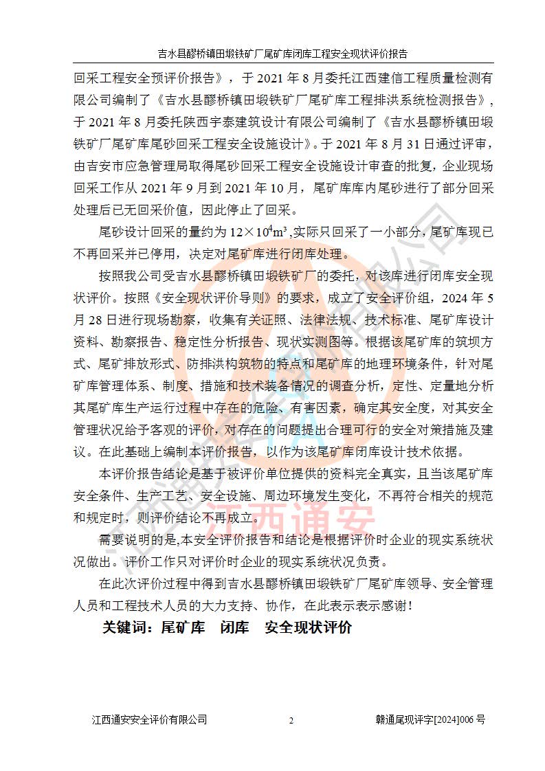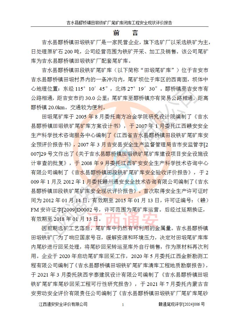 報(bào)告名稱 | 吉水縣醪橋鎮(zhèn)田塅鐵礦廠尾礦庫閉庫工程安全現(xiàn)狀評(píng)價(jià)報(bào)告 | ||||||