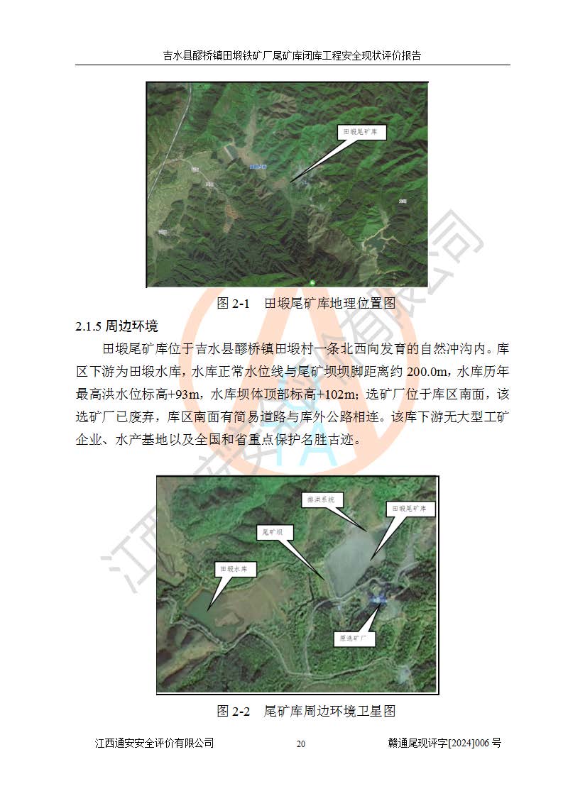 項(xiàng)目簡介 | 吉水縣醪橋鎮(zhèn)田塅鐵礦廠是一家民營企業(yè),旗下選礦廠以采選鐵礦為主,日處理原礦石200噸,公司經(jīng)營范圍為鐵礦開采、加工及銷售。該公司尾礦庫為吉水縣醪橋鎮(zhèn)田塅鐵礦廠配套尾礦庫。 吉水縣醪橋鎮(zhèn)田段鐵礦尾礦庫(以下簡稱“田塅尾礦庫”)位于吉安市吉水縣醪橋鎮(zhèn)田塅村界內(nèi)的一條沖溝內(nèi),尾礦壩位于庫區(qū)的西南面,壩體中心地理位置:東經(jīng)115°10′45″,北緯27°19′30″。醪橋鎮(zhèn)至吉安市有公路相通,距吉安市約30.0**;尾礦庫至醪橋鎮(zhèn)亦有簡易公路相通,距離醪橋鎮(zhèn)20.0km。交通較為便利。 田塅尾礦庫于2005年8月委托南方冶金學(xué)院研究設(shè)計(jì)院編制了《吉水縣醪橋鎮(zhèn)田塅鐵礦尾礦庫方案設(shè)計(jì)書》,于2007年1月由江西贛安安全生產(chǎn)科學(xué)技術(shù)咨詢服務(wù)中心編制了《江西省吉水縣醪橋鎮(zhèn)田段鐵礦尾礦庫安全預(yù)評(píng)價(jià)報(bào)告書》,2007年3月吉安縣安全生產(chǎn)監(jiān)督管理局吉市安監(jiān)管字[2007]29號(hào)文作出了《關(guān)于吉水縣醪橋鎮(zhèn)田塅鐵礦尾礦庫建設(shè)項(xiàng)目安全設(shè)施設(shè)計(jì)審查的批復(fù)》,于2008年9月由江西礦安安全生產(chǎn)科學(xué)技術(shù)咨詢中心有限公司編制了《吉水縣醪橋鎮(zhèn)田段鐵礦尾礦庫安全驗(yàn)收評(píng)價(jià)報(bào)告》,于2009年1月及2012年1月由贛州通安安全技術(shù)咨詢有限公司編制了《吉水縣醪橋鎮(zhèn)田段鐵礦尾礦庫安全現(xiàn)狀評(píng)價(jià)報(bào)告》,于2020年5月由江西金新勘測工程有限公司編制了《吉水縣醪橋鎮(zhèn)田塅鐵礦尾礦庫清庫工程地質(zhì)勘察報(bào)告》,于2021年3月由陜西宇泰建筑設(shè)計(jì)有限公司編制了《吉水縣醪橋鎮(zhèn)田塅鐵礦尾礦庫尾砂回采工程可行性研究報(bào)告》,于2021年7月由內(nèi)蒙古吉安勞動(dòng)安全評(píng)價(jià)有限責(zé)任公司編制了《吉水縣醪橋鎮(zhèn)田塅鐵礦廠尾礦庫尾砂回采工程安全預(yù)評(píng)價(jià)報(bào)告》,于2021年8月由江西建信工程質(zhì)量檢測有限公司編制了《吉水縣醪橋鎮(zhèn)田塅鐵礦廠尾礦庫工程排洪系統(tǒng)檢測報(bào)告》,于2021年8月由陜西宇泰建筑設(shè)計(jì)有限公司編制了《吉水縣醪橋鎮(zhèn)田塅鐵礦廠尾礦庫尾砂回采工程安全設(shè)施設(shè)計(jì)》。 首次取得安全生產(chǎn)許可證時(shí)間為2012年01月14日,**期至2015年01月13日,許可證編號(hào):(贛)FM安許證字[2009]D0002號(hào),許可范圍為尾礦庫運(yùn)營。