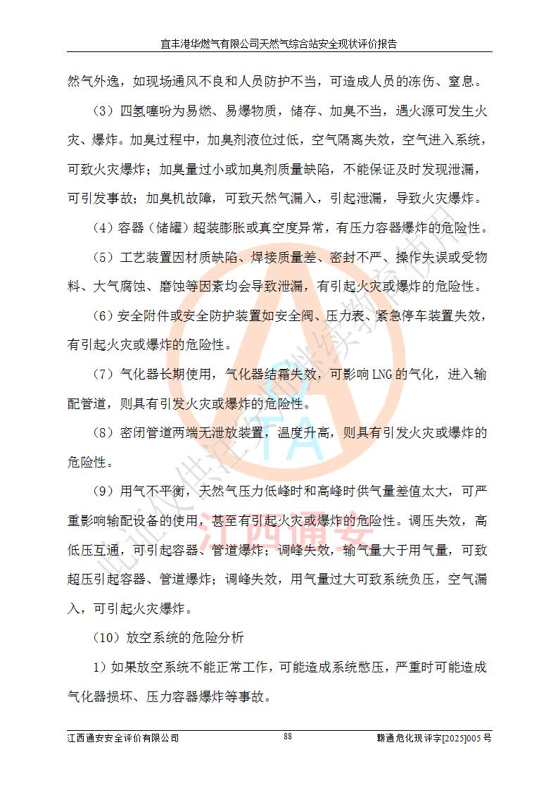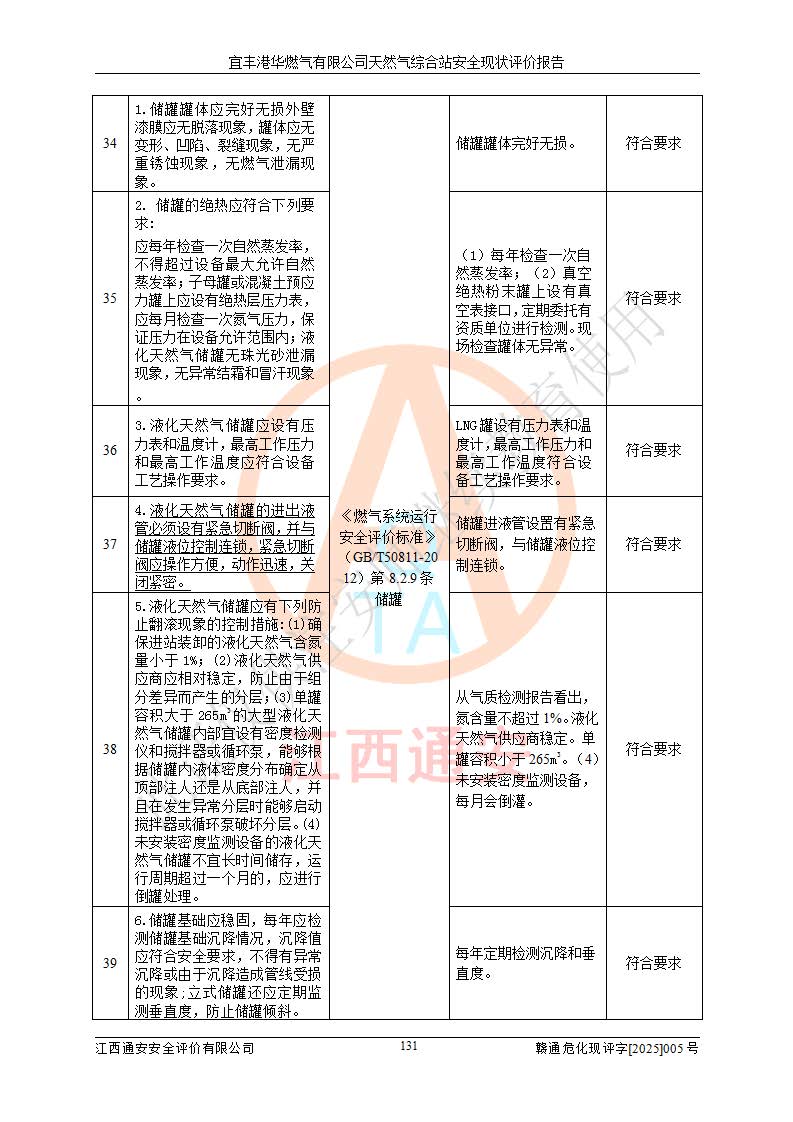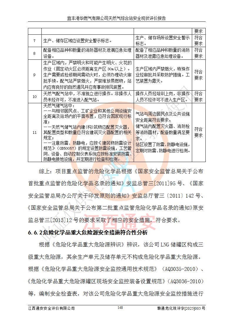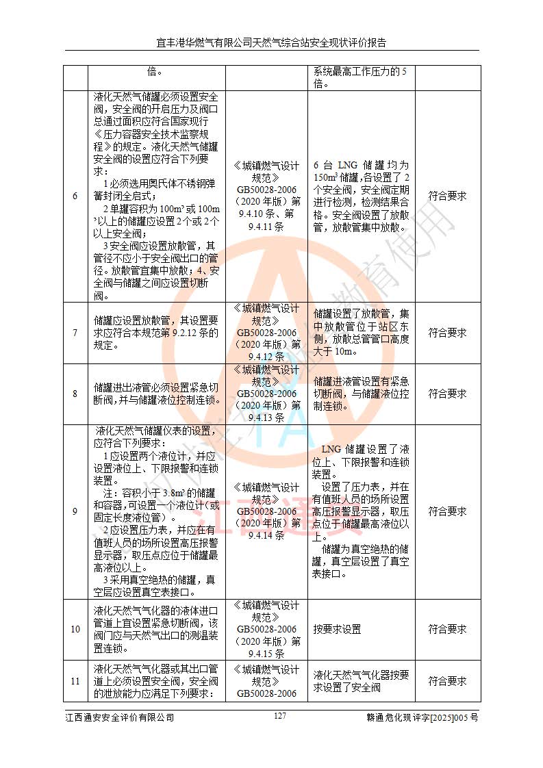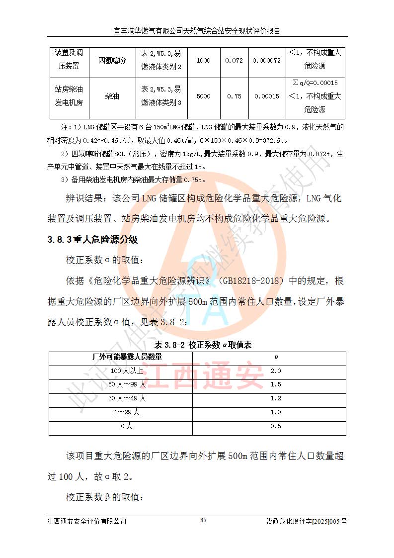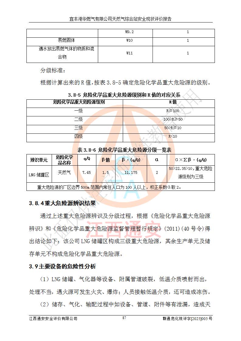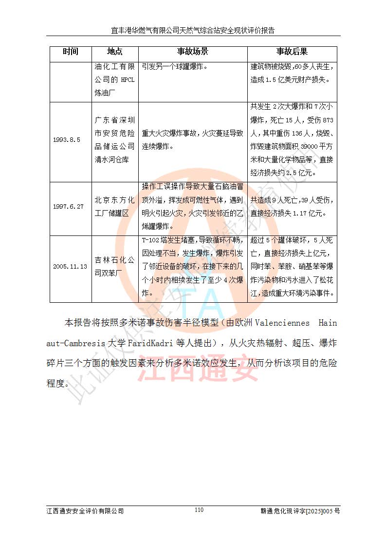 1、主要危險、危害因素辨識結(jié)果 宜豐港華燃氣有限公司天然氣綜合站在生產(chǎn)經(jīng)營過程中存在的主要危險有:火災(zāi)與爆炸、中毒窒息、觸電、機械傷害、物體打擊、**傷害、高處墜落、灼燙、低溫凍傷、容器爆炸、淹溺等,存在的主要危害因素有:化學(xué)因素、物理因素(噪聲、高溫等)等,同時存在人為失誤和管理缺陷。應(yīng)重點防范的主要危險為火災(zāi)與爆炸、容器爆炸。 2、危險化學(xué)品辨識結(jié)果 經(jīng)辨識,該儲配站涉及的天然氣、四氫噻吩及柴油屬于危險化學(xué)品,天然氣屬于重點監(jiān)管的危險化學(xué)品和特別管控危險化學(xué)品,不涉及監(jiān)控化學(xué)品、易制毒化學(xué)品、易制爆危險化學(xué)品、劇毒化學(xué)品和高毒物品等危險化學(xué)品。 3、危險化學(xué)品重大危險源辨識結(jié)果 根據(jù)《危險化學(xué)品重大危險源辨識》(GB18218-2018)和《危險化學(xué)品重大危險源監(jiān)督管理暫行規(guī)定》(2011)(40號令)(2015年 **安監(jiān)總局令第79號修訂)得出結(jié)論如下:該公司LNG儲罐區(qū)構(gòu)成三級重大危險源,其余生產(chǎn)單元及儲存單元不構(gòu)成危險化學(xué)品重大危險源。 4、重點監(jiān)管危險化工工藝辨識結(jié)果 根據(jù)《**安全監(jiān)管總局關(guān)于公布首批重點監(jiān)管的危險化學(xué)品名錄的通知》安監(jiān)總管三[2011]95號、《**安全監(jiān)管總局關(guān)于公布第二批重點監(jiān)管危險化學(xué)品名錄的通知》安監(jiān)總管三[2013]12號進行辨識,該天然氣儲配站不涉及重點監(jiān)管的危險化工工藝。 5、作業(yè)條件危險性分析結(jié)果: 液化天然氣的儲罐區(qū)、調(diào)壓計量氣化加臭區(qū)、卸車區(qū)、變配電、廠內(nèi)運輸、消防水池作業(yè)等單元。等單元危險程度均為“一般危險,需要注意”或“稍有危險,可以接受”級別。作業(yè)條件相對安全。 6、危險度評價結(jié)果:工藝裝置區(qū)等級為Ⅱ級,危險程度為中度危險。LNG儲罐區(qū)等級為Ⅰ級,危險程度為**危險。 7、事故后果預(yù)測結(jié)果:本報告采用中國安全生產(chǎn)科學(xué)研究院研發(fā)的重大危險源區(qū)域定量風(fēng)險評價(CASST-QRA)軟件對可能發(fā)生的危險化學(xué)品事故進行預(yù)測,宜豐港華燃氣有限公司天然氣綜合站LNG儲罐容器整體破裂,發(fā)生BLEVE災(zāi)害模式后果*大,*大死亡半徑為181m,重傷半徑為243m,輕傷半徑為448m。 8、多米諾效應(yīng)分析結(jié)果:該公司LNG儲罐發(fā)生容器整體破裂引發(fā)的BLEVE事故的多米諾半徑*大,為141m。 9、采用安全檢查表評價法對該儲配站周邊環(huán)境、總平面布置、站內(nèi)建構(gòu)筑物防火間距、站內(nèi)交通、LNG卸車、儲罐、氣化裝置、加臭裝置、調(diào)壓裝置、安全附件、工藝設(shè)備、管道、自動化控制等供配電、給排水、消防設(shè)施、供熱裝置、安全管理、“兩重點一重大”安全措施及安全管理進行定性評價,不符合項共2項,其他均符合**法律、法規(guī)、標準、規(guī)范的要求。 (1)企業(yè)對不符合項整改完成后,安全條件符合燃氣儲存經(jīng)營的安全要求。 (2)該儲配站涉及“兩重點一重大”,采取了首批重點監(jiān)管的危險化學(xué)品安全措施和應(yīng)急處置措施,站內(nèi)LNG罐區(qū)構(gòu)成三級重大危險源,采取的重大危險源安全技術(shù)和監(jiān)控措施符合相關(guān)要求。 (3)根據(jù)《燃氣經(jīng)營許可管理辦法》(建城〔2014〕167號發(fā)布,建城規(guī)〔2019〕2號修改)制成安全檢查表對該單位的經(jīng)營條件逐一檢查,檢查結(jié)果符合要求。 (4)根據(jù)《住房城鄉(xiāng)建設(shè)部關(guān)于印發(fā)《城鎮(zhèn)燃氣經(jīng)營安全重大隱患判定標準》的通知》(建城規(guī)[2023]4號)要求,對該項目重大隱患情況進行檢查,該站LNG罐完成整改后不涉及重大隱患。 評價結(jié)論 綜上所述,宜豐港華燃氣有限公司天然氣綜合站選址和總平面布置合理,建構(gòu)筑物間的防火間距、耐火等級等符合標準規(guī)范的要求,LNG卸車、儲存、加臭、氣化調(diào)壓計量等裝置采用成熟的工藝和設(shè)備,本質(zhì)安全程度較高;公司制定了安全管理制度和操作規(guī)程,人員經(jīng)培訓(xùn)合格后上崗,主要負責(zé)人、安全管理人員及特種作業(yè)人員均取得了相應(yīng)的考核合格資格證書,能按照法律法規(guī)要求開展安全生產(chǎn)管理工作。公司對現(xiàn)場存在事故危險的設(shè)施和場所采取了合理可行的防護措施和科學(xué)的管理,使生產(chǎn)過程中的危險有害因素能得到**控制。該項目安全設(shè)施符合**現(xiàn)行有關(guān)法律、法規(guī)、標準的要求。企業(yè)對現(xiàn)場存在的安全問題進行了整改,主要的安全缺陷消除。 綜合結(jié)論:宜豐港華燃氣有限公司天然氣綜合站的安全條件符合燃氣安全運行要求。 |