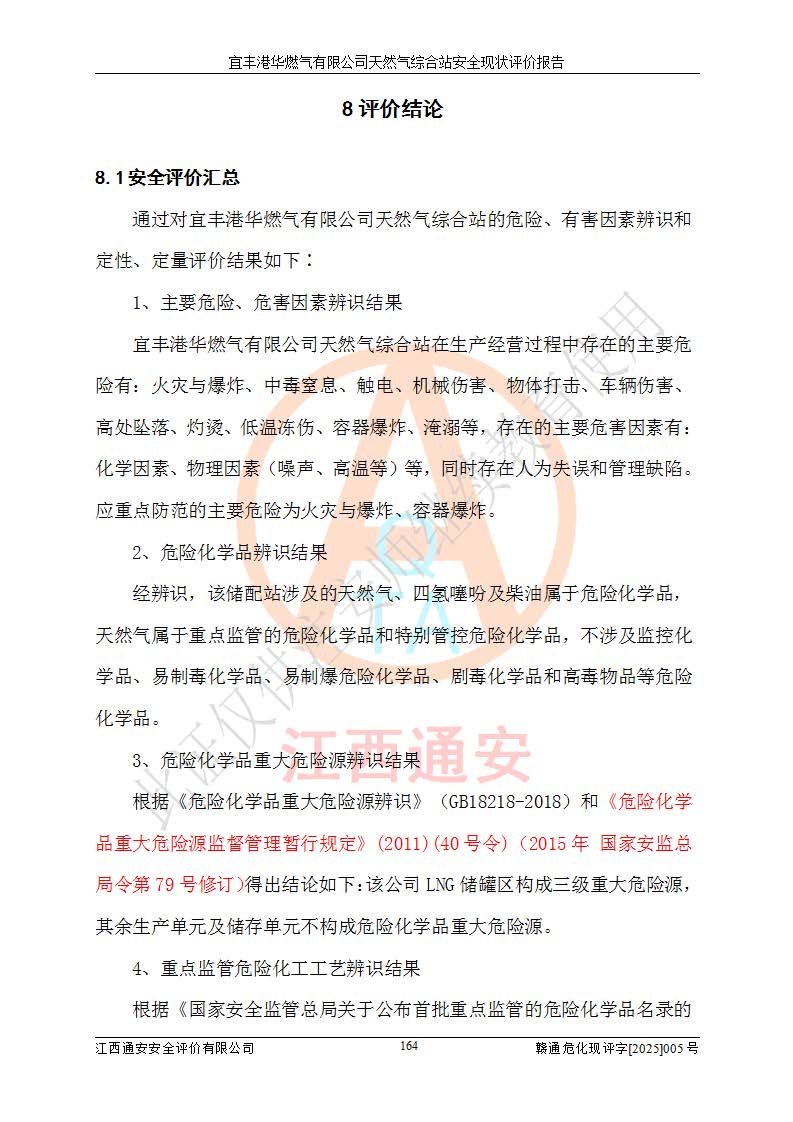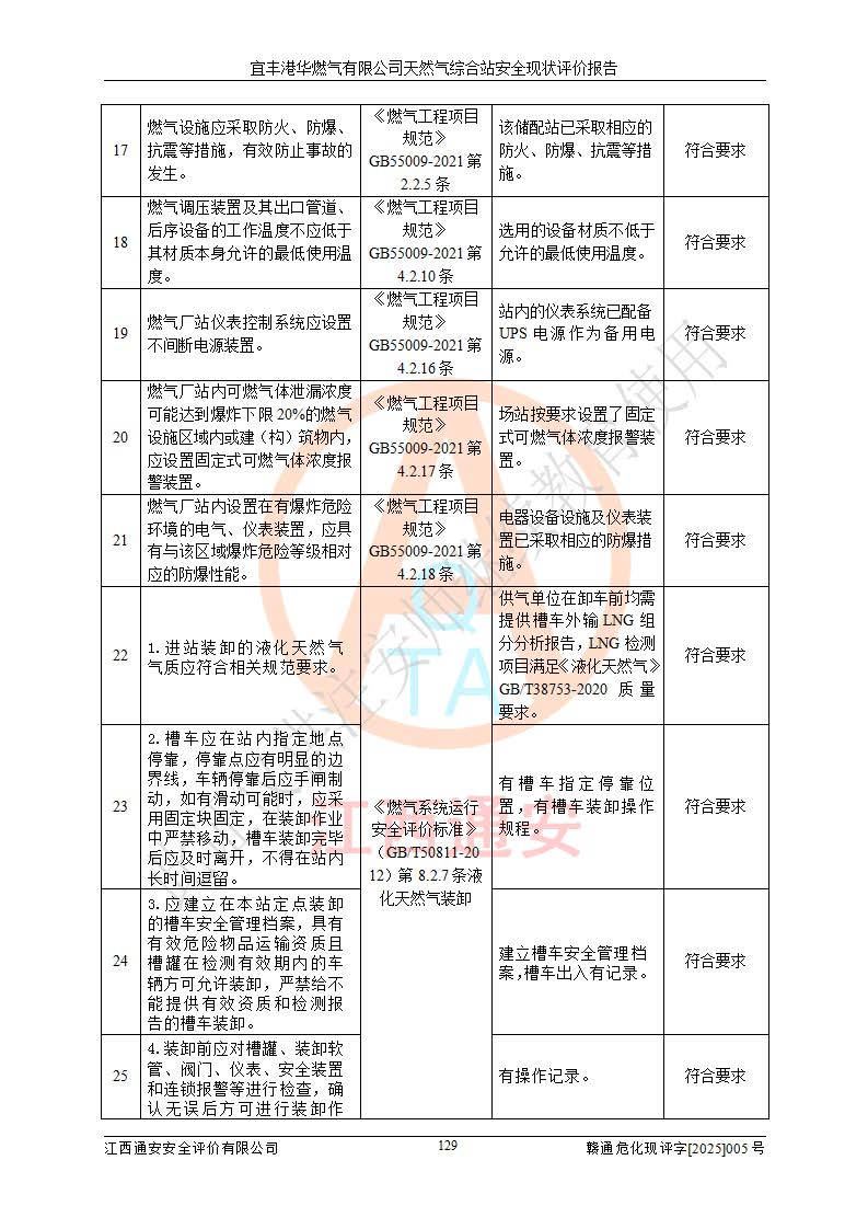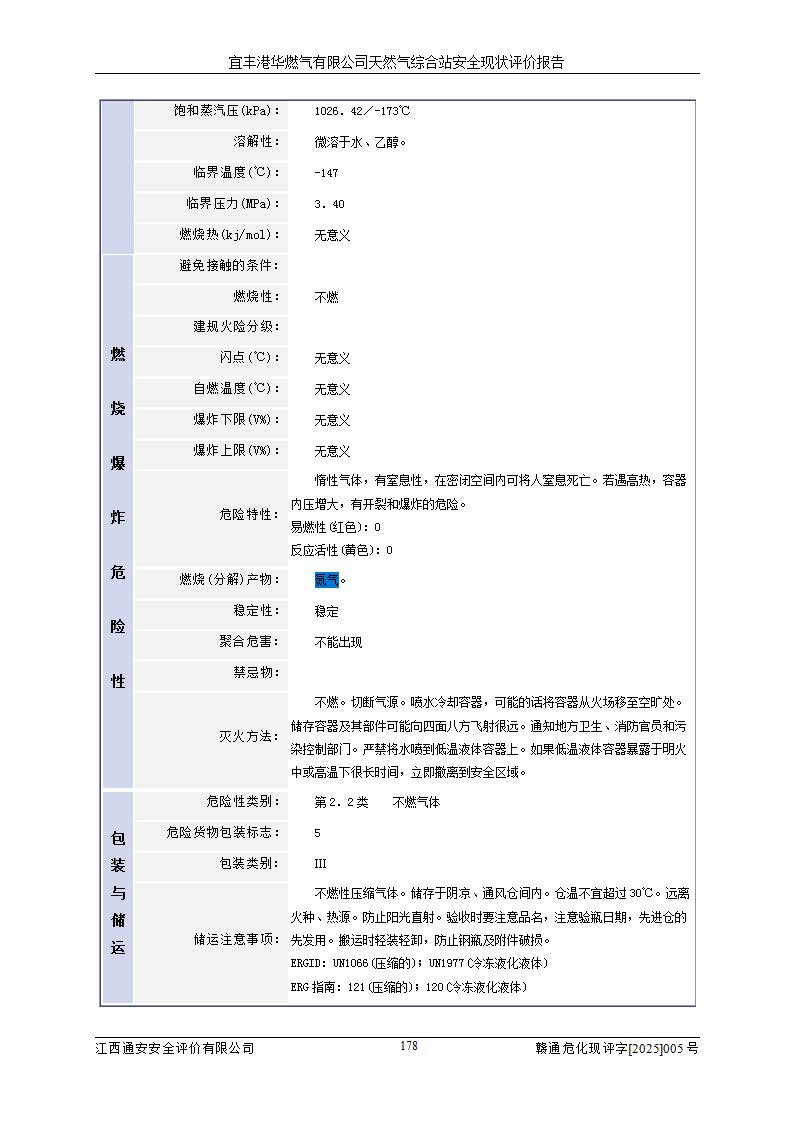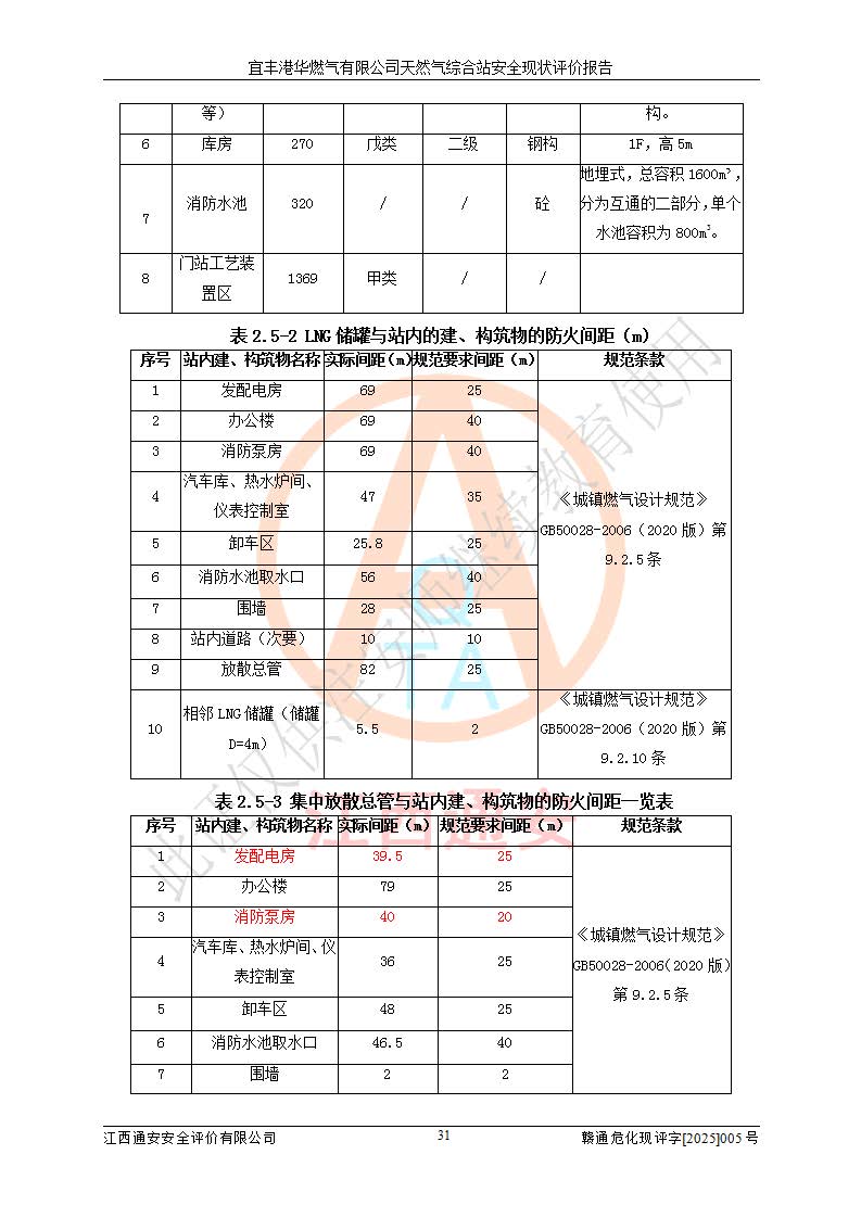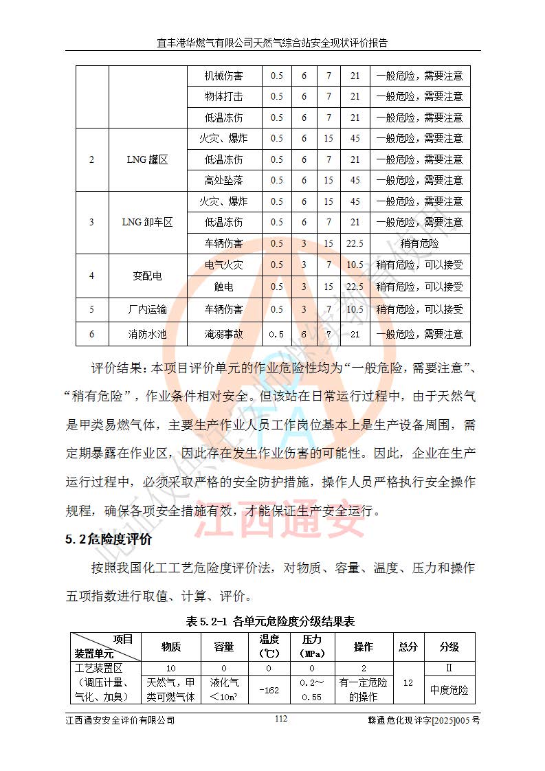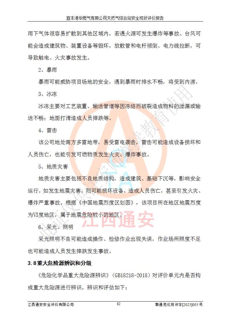 1、主要危險、危害因素辨識結(jié)果 宜豐港華燃氣有限公司天然氣綜合站在生產(chǎn)經(jīng)營過程中存在的主要危險有:火災(zāi)與爆炸、中毒窒息、觸電、機械傷害、物體打擊、**傷害、高處墜落、灼燙、低溫凍傷、容器爆炸、淹溺等,存在的主要危害因素有:化學(xué)因素、物理因素(噪聲、高溫等)等,同時存在人為失誤和管理缺陷。應(yīng)重點防范的主要危險為火災(zāi)與爆炸、容器爆炸。 2、危險化學(xué)品辨識結(jié)果 經(jīng)辨識,該儲配站涉及的天然氣、四氫噻吩及柴油屬于危險化學(xué)品,天然氣屬于重點監(jiān)管的危險化學(xué)品和特別管控危險化學(xué)品,不涉及監(jiān)控化學(xué)品、易制毒化學(xué)品、易制爆危險化學(xué)品、劇毒化學(xué)品和高毒物品等危險化學(xué)品。 3、危險化學(xué)品重大危險源辨識結(jié)果 根據(jù)《危險化學(xué)品重大危險源辨識》(GB18218-2018)和《危險化學(xué)品重大危險源監(jiān)督管理暫行規(guī)定》(2011)(40號令)(2015年 **安監(jiān)總局令第79號修訂)得出結(jié)論如下:該公司LNG儲罐區(qū)構(gòu)成三級重大危險源,其余生產(chǎn)單元及儲存單元不構(gòu)成危險化學(xué)品重大危險源。 4、重點監(jiān)管危險化工工藝辨識結(jié)果 根據(jù)《**安全監(jiān)管總局關(guān)于公布首批重點監(jiān)管的危險化學(xué)品名錄的通知》安監(jiān)總管三[2011]95號、《**安全監(jiān)管總局關(guān)于公布第二批重點監(jiān)管危險化學(xué)品名錄的通知》安監(jiān)總管三[2013]12號進行辨識,該天然氣儲配站不涉及重點監(jiān)管的危險化工工藝。 5、作業(yè)條件危險性分析結(jié)果: 液化天然氣的儲罐區(qū)、調(diào)壓計量氣化加臭區(qū)、卸車區(qū)、變配電、廠內(nèi)運輸、消防水池作業(yè)等單元。等單元危險程度均為“一般危險,需要注意”或“稍有危險,可以接受”級別。作業(yè)條件相對安全。 6、危險度評價結(jié)果:工藝裝置區(qū)等級為Ⅱ級,危險程度為中度危險。LNG儲罐區(qū)等級為Ⅰ級,危險程度為**危險。 7、事故后果預(yù)測結(jié)果:本報告采用中國安全生產(chǎn)科學(xué)研究院研發(fā)的重大危險源區(qū)域定量風(fēng)險評價(CASST-QRA)軟件對可能發(fā)生的危險化學(xué)品事故進行預(yù)測,宜豐港華燃氣有限公司天然氣綜合站LNG儲罐容器整體破裂,發(fā)生BLEVE災(zāi)害模式后果*大,*大死亡半徑為181m,重傷半徑為243m,輕傷半徑為448m。 8、多米諾效應(yīng)分析結(jié)果:該公司LNG儲罐發(fā)生容器整體破裂引發(fā)的BLEVE事故的多米諾半徑*大,為141m。 9、采用安全檢查表評價法對該儲配站周邊環(huán)境、總平面布置、站內(nèi)建構(gòu)筑物防火間距、站內(nèi)交通、LNG卸車、儲罐、氣化裝置、加臭裝置、調(diào)壓裝置、安全附件、工藝設(shè)備、管道、自動化控制等供配電、給排水、消防設(shè)施、供熱裝置、安全管理、“兩重點一重大”安全措施及安全管理進行定性評價,不符合項共2項,其他均符合**法律、法規(guī)、標準、規(guī)范的要求。 (1)企業(yè)對不符合項整改完成后,安全條件符合燃氣儲存經(jīng)營的安全要求。 (2)該儲配站涉及“兩重點一重大”,采取了首批重點監(jiān)管的危險化學(xué)品安全措施和應(yīng)急處置措施,站內(nèi)LNG罐區(qū)構(gòu)成三級重大危險源,采取的重大危險源安全技術(shù)和監(jiān)控措施符合相關(guān)要求。 (3)根據(jù)《燃氣經(jīng)營許可管理辦法》(建城〔2014〕167號發(fā)布,建城規(guī)〔2019〕2號修改)制成安全檢查表對該單位的經(jīng)營條件逐一檢查,檢查結(jié)果符合要求。 (4)根據(jù)《住房城鄉(xiāng)建設(shè)部關(guān)于印發(fā)《城鎮(zhèn)燃氣經(jīng)營安全重大隱患判定標準》的通知》(建城規(guī)[2023]4號)要求,對該項目重大隱患情況進行檢查,該站LNG罐完成整改后不涉及重大隱患。 評價結(jié)論 綜上所述,宜豐港華燃氣有限公司天然氣綜合站選址和總平面布置合理,建構(gòu)筑物間的防火間距、耐火等級等符合標準規(guī)范的要求,LNG卸車、儲存、加臭、氣化調(diào)壓計量等裝置采用成熟的工藝和設(shè)備,本質(zhì)安全程度較高;公司制定了安全管理制度和操作規(guī)程,人員經(jīng)培訓(xùn)合格后上崗,主要負責(zé)人、安全管理人員及特種作業(yè)人員均取得了相應(yīng)的考核合格資格證書,能按照法律法規(guī)要求開展安全生產(chǎn)管理工作。公司對現(xiàn)場存在事故危險的設(shè)施和場所采取了合理可行的防護措施和科學(xué)的管理,使生產(chǎn)過程中的危險有害因素能得到**控制。該項目安全設(shè)施符合**現(xiàn)行有關(guān)法律、法規(guī)、標準的要求。企業(yè)對現(xiàn)場存在的安全問題進行了整改,主要的安全缺陷消除。 綜合結(jié)論:宜豐港華燃氣有限公司天然氣綜合站的安全條件符合燃氣安全運行要求。 |