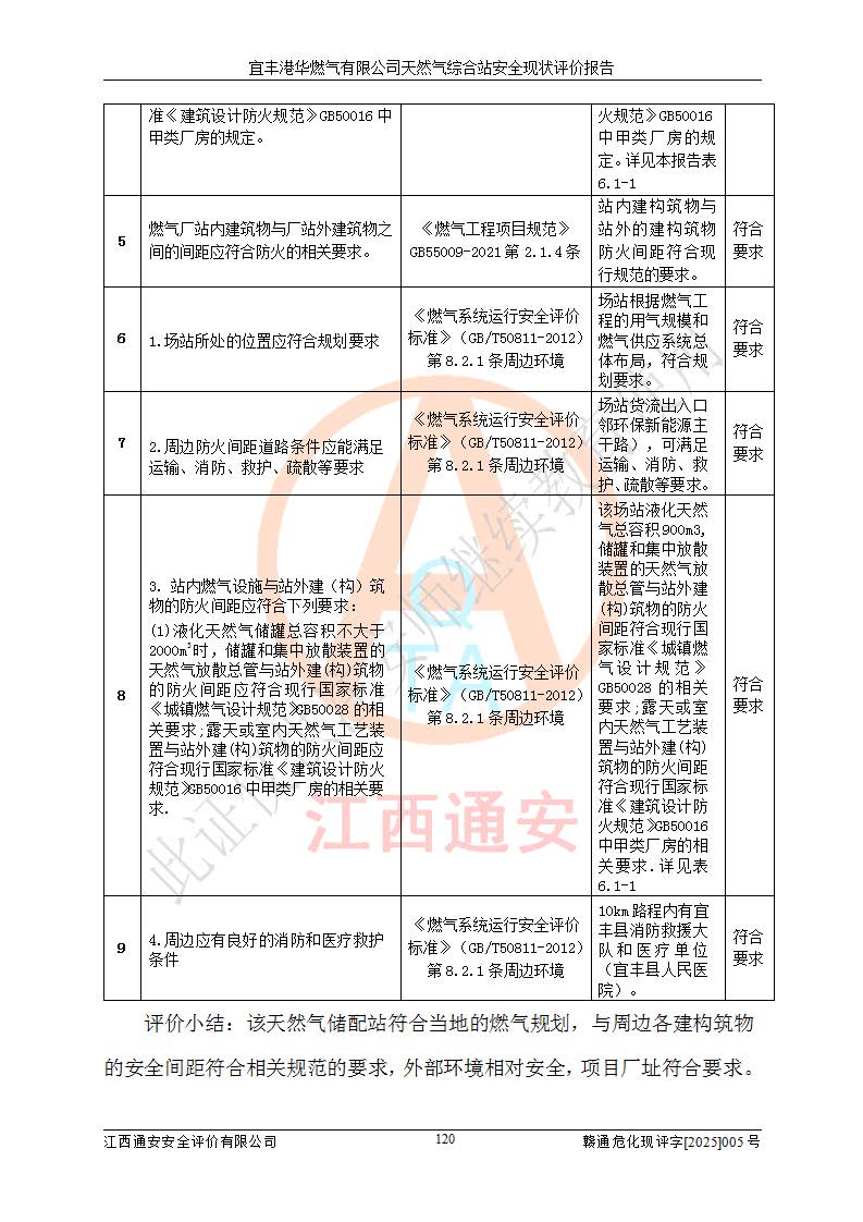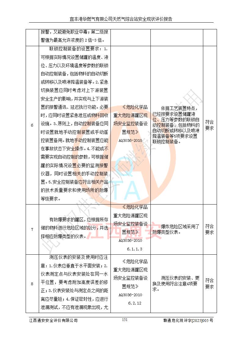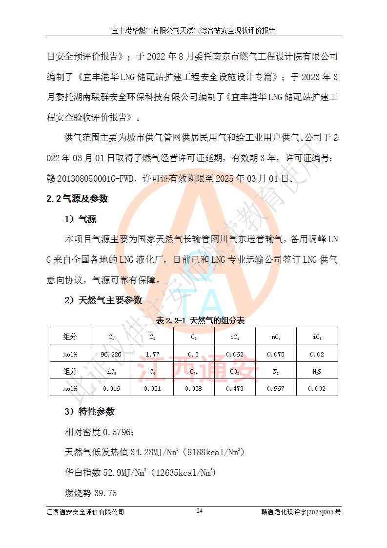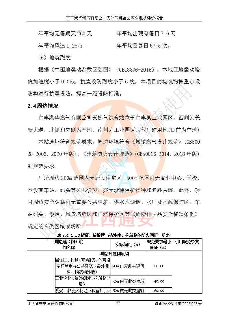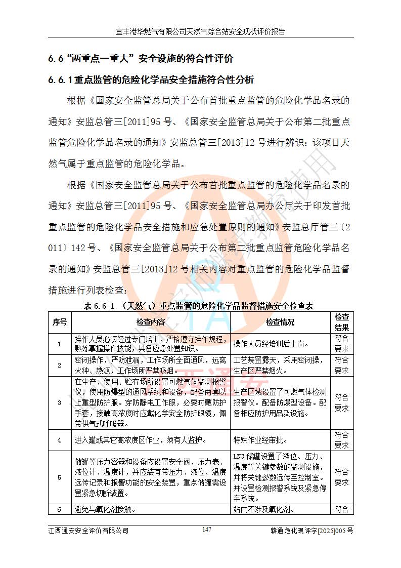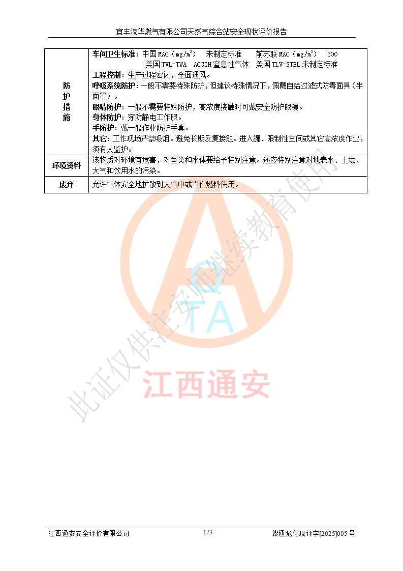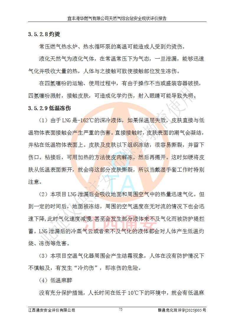 1、主要危險、危害因素辨識結(jié)果 宜豐港華燃氣有限公司天然氣綜合站在生產(chǎn)經(jīng)營過程中存在的主要危險有:火災(zāi)與爆炸、中毒窒息、觸電、機械傷害、物體打擊、**傷害、高處墜落、灼燙、低溫凍傷、容器爆炸、淹溺等,存在的主要危害因素有:化學(xué)因素、物理因素(噪聲、高溫等)等,同時存在人為失誤和管理缺陷。應(yīng)重點防范的主要危險為火災(zāi)與爆炸、容器爆炸。 2、危險化學(xué)品辨識結(jié)果 經(jīng)辨識,該儲配站涉及的天然氣、四氫噻吩及柴油屬于危險化學(xué)品,天然氣屬于重點監(jiān)管的危險化學(xué)品和特別管控危險化學(xué)品,不涉及監(jiān)控化學(xué)品、易制毒化學(xué)品、易制爆危險化學(xué)品、劇毒化學(xué)品和高毒物品等危險化學(xué)品。 3、危險化學(xué)品重大危險源辨識結(jié)果 根據(jù)《危險化學(xué)品重大危險源辨識》(GB18218-2018)和《危險化學(xué)品重大危險源監(jiān)督管理暫行規(guī)定》(2011)(40號令)(2015年 **安監(jiān)總局令第79號修訂)得出結(jié)論如下:該公司LNG儲罐區(qū)構(gòu)成三級重大危險源,其余生產(chǎn)單元及儲存單元不構(gòu)成危險化學(xué)品重大危險源。 4、重點監(jiān)管危險化工工藝辨識結(jié)果 根據(jù)《**安全監(jiān)管總局關(guān)于公布首批重點監(jiān)管的危險化學(xué)品名錄的通知》安監(jiān)總管三[2011]95號、《**安全監(jiān)管總局關(guān)于公布第二批重點監(jiān)管危險化學(xué)品名錄的通知》安監(jiān)總管三[2013]12號進行辨識,該天然氣儲配站不涉及重點監(jiān)管的危險化工工藝。 5、作業(yè)條件危險性分析結(jié)果: 液化天然氣的儲罐區(qū)、調(diào)壓計量氣化加臭區(qū)、卸車區(qū)、變配電、廠內(nèi)運輸、消防水池作業(yè)等單元。等單元危險程度均為“一般危險,需要注意”或“稍有危險,可以接受”級別。作業(yè)條件相對安全。 6、危險度評價結(jié)果:工藝裝置區(qū)等級為Ⅱ級,危險程度為中度危險。LNG儲罐區(qū)等級為Ⅰ級,危險程度為**危險。 7、事故后果預(yù)測結(jié)果:本報告采用中國安全生產(chǎn)科學(xué)研究院研發(fā)的重大危險源區(qū)域定量風(fēng)險評價(CASST-QRA)軟件對可能發(fā)生的危險化學(xué)品事故進行預(yù)測,宜豐港華燃氣有限公司天然氣綜合站LNG儲罐容器整體破裂,發(fā)生BLEVE災(zāi)害模式后果*大,*大死亡半徑為181m,重傷半徑為243m,輕傷半徑為448m。 8、多米諾效應(yīng)分析結(jié)果:該公司LNG儲罐發(fā)生容器整體破裂引發(fā)的BLEVE事故的多米諾半徑*大,為141m。 9、采用安全檢查表評價法對該儲配站周邊環(huán)境、總平面布置、站內(nèi)建構(gòu)筑物防火間距、站內(nèi)交通、LNG卸車、儲罐、氣化裝置、加臭裝置、調(diào)壓裝置、安全附件、工藝設(shè)備、管道、自動化控制等供配電、給排水、消防設(shè)施、供熱裝置、安全管理、“兩重點一重大”安全措施及安全管理進行定性評價,不符合項共2項,其他均符合**法律、法規(guī)、標準、規(guī)范的要求。 (1)企業(yè)對不符合項整改完成后,安全條件符合燃氣儲存經(jīng)營的安全要求。 (2)該儲配站涉及“兩重點一重大”,采取了首批重點監(jiān)管的危險化學(xué)品安全措施和應(yīng)急處置措施,站內(nèi)LNG罐區(qū)構(gòu)成三級重大危險源,采取的重大危險源安全技術(shù)和監(jiān)控措施符合相關(guān)要求。 (3)根據(jù)《燃氣經(jīng)營許可管理辦法》(建城〔2014〕167號發(fā)布,建城規(guī)〔2019〕2號修改)制成安全檢查表對該單位的經(jīng)營條件逐一檢查,檢查結(jié)果符合要求。 (4)根據(jù)《住房城鄉(xiāng)建設(shè)部關(guān)于印發(fā)《城鎮(zhèn)燃氣經(jīng)營安全重大隱患判定標準》的通知》(建城規(guī)[2023]4號)要求,對該項目重大隱患情況進行檢查,該站LNG罐完成整改后不涉及重大隱患。 評價結(jié)論 綜上所述,宜豐港華燃氣有限公司天然氣綜合站選址和總平面布置合理,建構(gòu)筑物間的防火間距、耐火等級等符合標準規(guī)范的要求,LNG卸車、儲存、加臭、氣化調(diào)壓計量等裝置采用成熟的工藝和設(shè)備,本質(zhì)安全程度較高;公司制定了安全管理制度和操作規(guī)程,人員經(jīng)培訓(xùn)合格后上崗,主要負責(zé)人、安全管理人員及特種作業(yè)人員均取得了相應(yīng)的考核合格資格證書,能按照法律法規(guī)要求開展安全生產(chǎn)管理工作。公司對現(xiàn)場存在事故危險的設(shè)施和場所采取了合理可行的防護措施和科學(xué)的管理,使生產(chǎn)過程中的危險有害因素能得到**控制。該項目安全設(shè)施符合**現(xiàn)行有關(guān)法律、法規(guī)、標準的要求。企業(yè)對現(xiàn)場存在的安全問題進行了整改,主要的安全缺陷消除。 綜合結(jié)論:宜豐港華燃氣有限公司天然氣綜合站的安全條件符合燃氣安全運行要求。 |