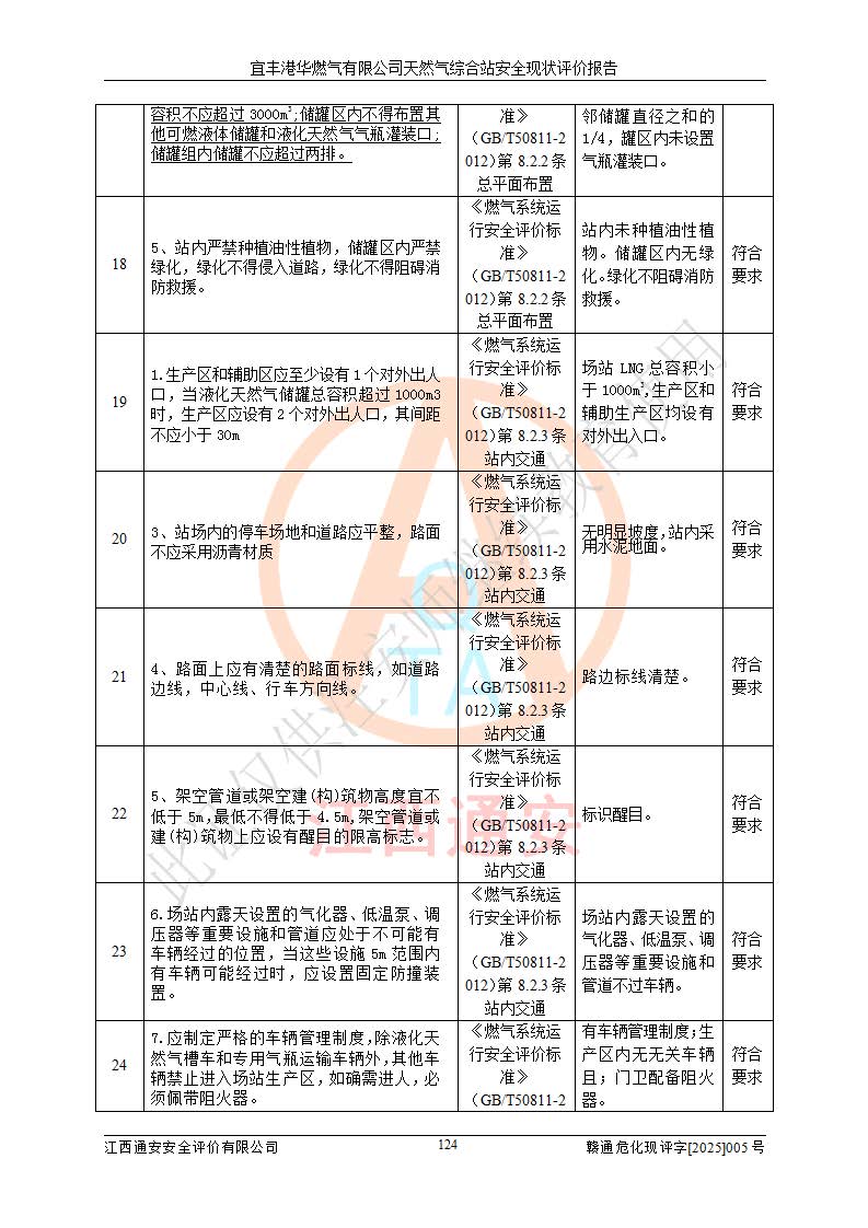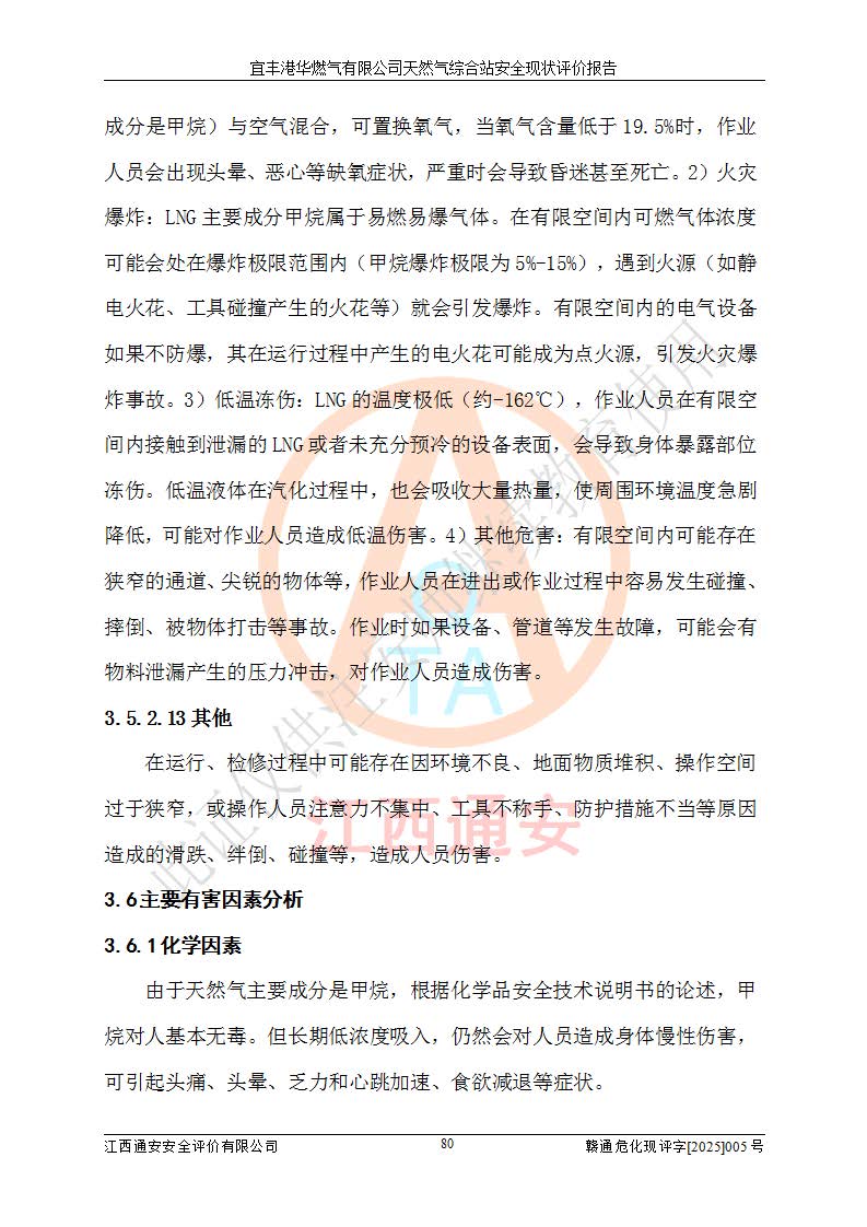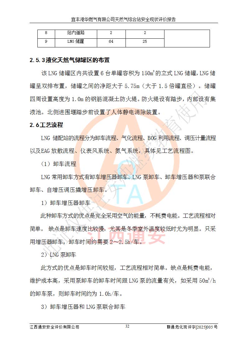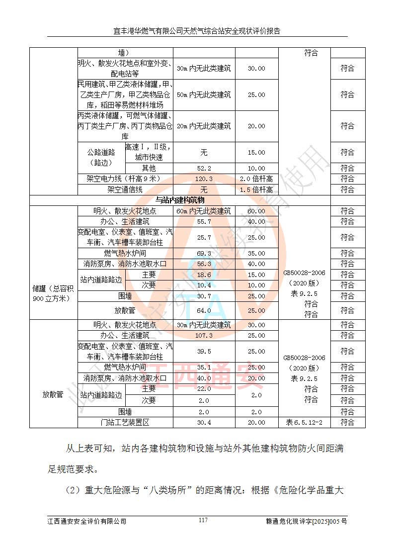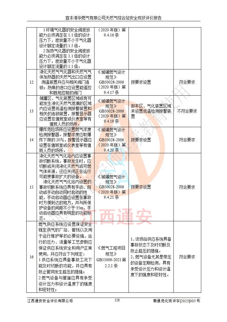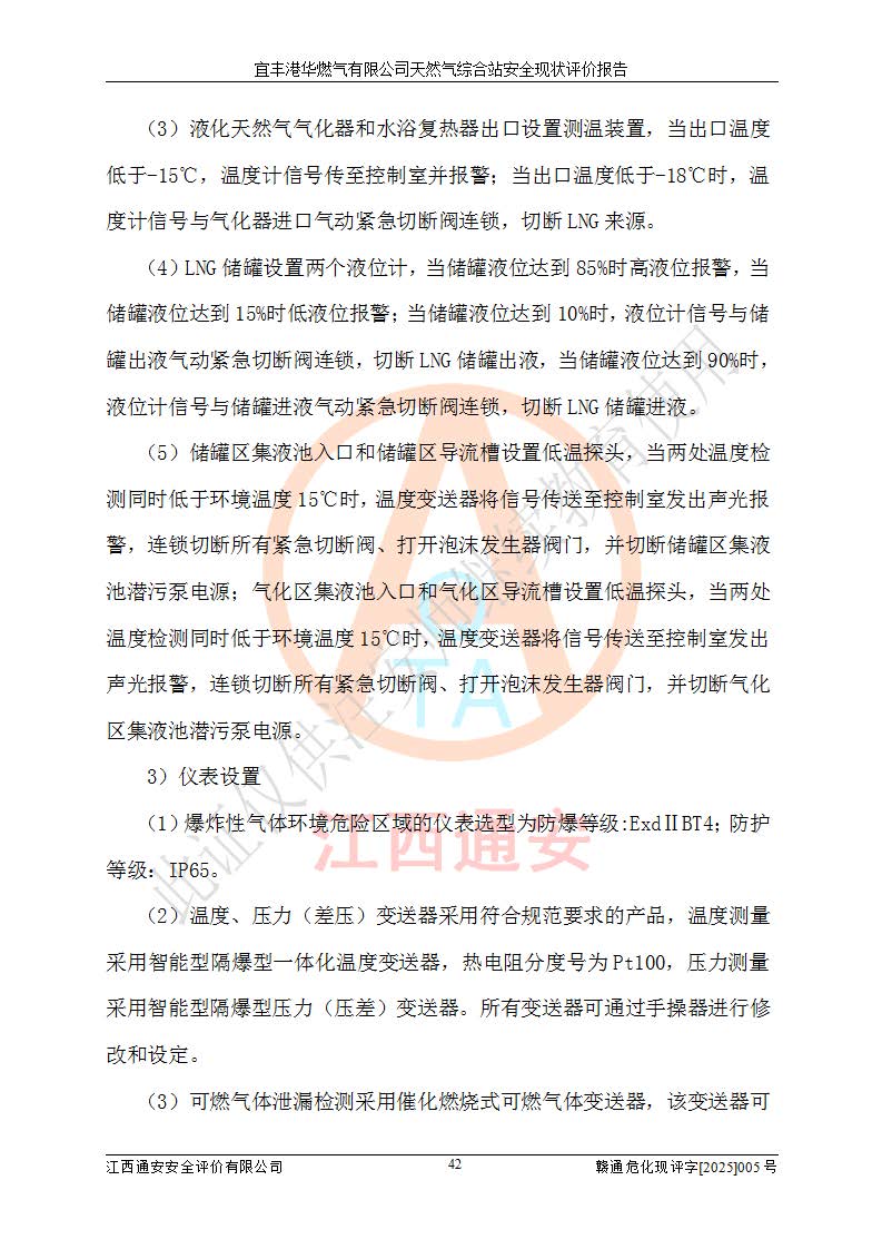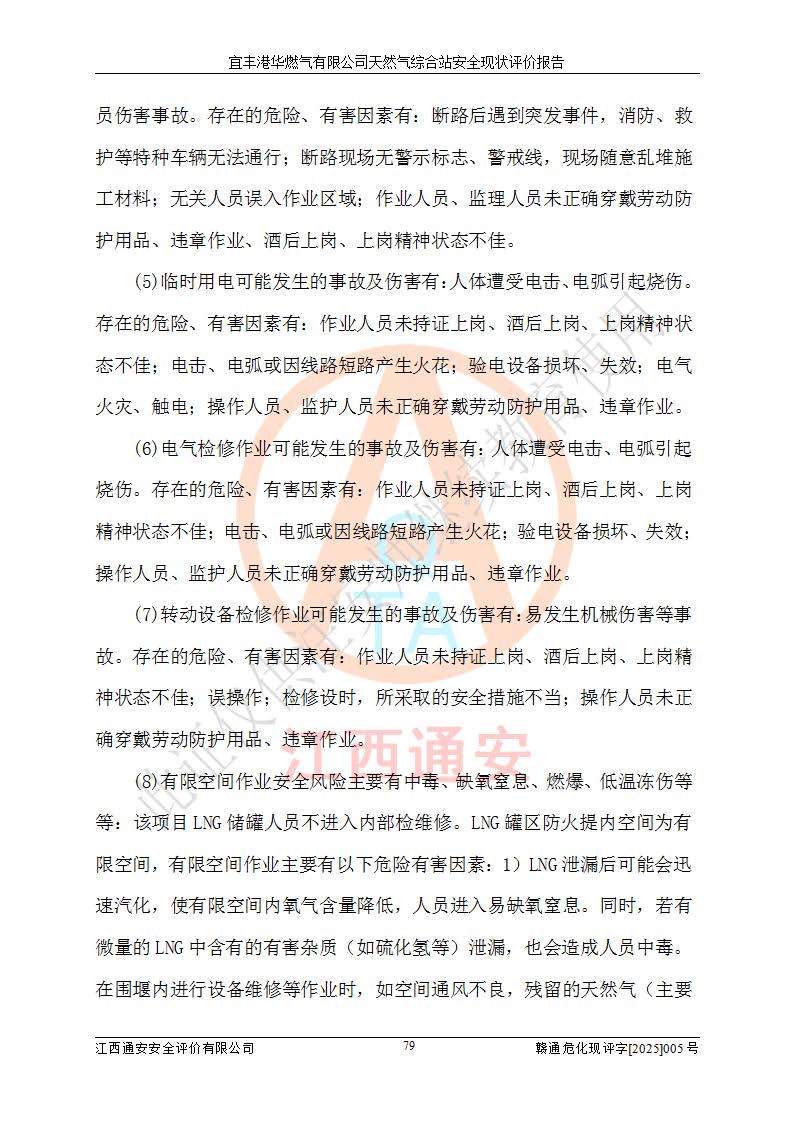 1、主要危險、危害因素辨識結(jié)果 宜豐港華燃氣有限公司天然氣綜合站在生產(chǎn)經(jīng)營過程中存在的主要危險有:火災(zāi)與爆炸、中毒窒息、觸電、機械傷害、物體打擊、**傷害、高處墜落、灼燙、低溫凍傷、容器爆炸、淹溺等,存在的主要危害因素有:化學(xué)因素、物理因素(噪聲、高溫等)等,同時存在人為失誤和管理缺陷。應(yīng)重點防范的主要危險為火災(zāi)與爆炸、容器爆炸。 2、危險化學(xué)品辨識結(jié)果 經(jīng)辨識,該儲配站涉及的天然氣、四氫噻吩及柴油屬于危險化學(xué)品,天然氣屬于重點監(jiān)管的危險化學(xué)品和特別管控危險化學(xué)品,不涉及監(jiān)控化學(xué)品、易制毒化學(xué)品、易制爆危險化學(xué)品、劇毒化學(xué)品和高毒物品等危險化學(xué)品。 3、危險化學(xué)品重大危險源辨識結(jié)果 根據(jù)《危險化學(xué)品重大危險源辨識》(GB18218-2018)和《危險化學(xué)品重大危險源監(jiān)督管理暫行規(guī)定》(2011)(40號令)(2015年 **安監(jiān)總局令第79號修訂)得出結(jié)論如下:該公司LNG儲罐區(qū)構(gòu)成三級重大危險源,其余生產(chǎn)單元及儲存單元不構(gòu)成危險化學(xué)品重大危險源。 4、重點監(jiān)管危險化工工藝辨識結(jié)果 根據(jù)《**安全監(jiān)管總局關(guān)于公布首批重點監(jiān)管的危險化學(xué)品名錄的通知》安監(jiān)總管三[2011]95號、《**安全監(jiān)管總局關(guān)于公布第二批重點監(jiān)管危險化學(xué)品名錄的通知》安監(jiān)總管三[2013]12號進行辨識,該天然氣儲配站不涉及重點監(jiān)管的危險化工工藝。 5、作業(yè)條件危險性分析結(jié)果: 液化天然氣的儲罐區(qū)、調(diào)壓計量氣化加臭區(qū)、卸車區(qū)、變配電、廠內(nèi)運輸、消防水池作業(yè)等單元。等單元危險程度均為“一般危險,需要注意”或“稍有危險,可以接受”級別。作業(yè)條件相對安全。 6、危險度評價結(jié)果:工藝裝置區(qū)等級為Ⅱ級,危險程度為中度危險。LNG儲罐區(qū)等級為Ⅰ級,危險程度為**危險。 7、事故后果預(yù)測結(jié)果:本報告采用中國安全生產(chǎn)科學(xué)研究院研發(fā)的重大危險源區(qū)域定量風(fēng)險評價(CASST-QRA)軟件對可能發(fā)生的危險化學(xué)品事故進行預(yù)測,宜豐港華燃氣有限公司天然氣綜合站LNG儲罐容器整體破裂,發(fā)生BLEVE災(zāi)害模式后果*大,*大死亡半徑為181m,重傷半徑為243m,輕傷半徑為448m。 8、多米諾效應(yīng)分析結(jié)果:該公司LNG儲罐發(fā)生容器整體破裂引發(fā)的BLEVE事故的多米諾半徑*大,為141m。 9、采用安全檢查表評價法對該儲配站周邊環(huán)境、總平面布置、站內(nèi)建構(gòu)筑物防火間距、站內(nèi)交通、LNG卸車、儲罐、氣化裝置、加臭裝置、調(diào)壓裝置、安全附件、工藝設(shè)備、管道、自動化控制等供配電、給排水、消防設(shè)施、供熱裝置、安全管理、“兩重點一重大”安全措施及安全管理進行定性評價,不符合項共2項,其他均符合**法律、法規(guī)、標準、規(guī)范的要求。 (1)企業(yè)對不符合項整改完成后,安全條件符合燃氣儲存經(jīng)營的安全要求。 (2)該儲配站涉及“兩重點一重大”,采取了首批重點監(jiān)管的危險化學(xué)品安全措施和應(yīng)急處置措施,站內(nèi)LNG罐區(qū)構(gòu)成三級重大危險源,采取的重大危險源安全技術(shù)和監(jiān)控措施符合相關(guān)要求。 (3)根據(jù)《燃氣經(jīng)營許可管理辦法》(建城〔2014〕167號發(fā)布,建城規(guī)〔2019〕2號修改)制成安全檢查表對該單位的經(jīng)營條件逐一檢查,檢查結(jié)果符合要求。 (4)根據(jù)《住房城鄉(xiāng)建設(shè)部關(guān)于印發(fā)《城鎮(zhèn)燃氣經(jīng)營安全重大隱患判定標準》的通知》(建城規(guī)[2023]4號)要求,對該項目重大隱患情況進行檢查,該站LNG罐完成整改后不涉及重大隱患。 評價結(jié)論 綜上所述,宜豐港華燃氣有限公司天然氣綜合站選址和總平面布置合理,建構(gòu)筑物間的防火間距、耐火等級等符合標準規(guī)范的要求,LNG卸車、儲存、加臭、氣化調(diào)壓計量等裝置采用成熟的工藝和設(shè)備,本質(zhì)安全程度較高;公司制定了安全管理制度和操作規(guī)程,人員經(jīng)培訓(xùn)合格后上崗,主要負責(zé)人、安全管理人員及特種作業(yè)人員均取得了相應(yīng)的考核合格資格證書,能按照法律法規(guī)要求開展安全生產(chǎn)管理工作。公司對現(xiàn)場存在事故危險的設(shè)施和場所采取了合理可行的防護措施和科學(xué)的管理,使生產(chǎn)過程中的危險有害因素能得到**控制。該項目安全設(shè)施符合**現(xiàn)行有關(guān)法律、法規(guī)、標準的要求。企業(yè)對現(xiàn)場存在的安全問題進行了整改,主要的安全缺陷消除。 綜合結(jié)論:宜豐港華燃氣有限公司天然氣綜合站的安全條件符合燃氣安全運行要求。 |
