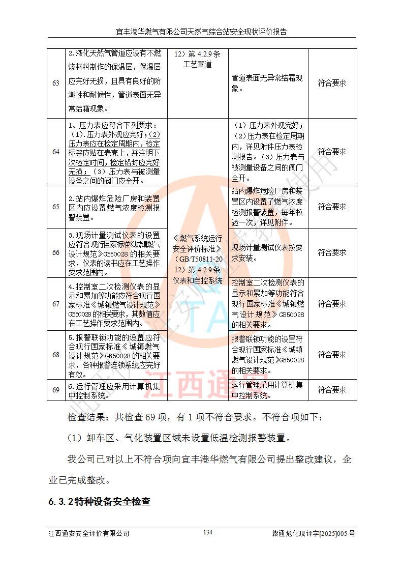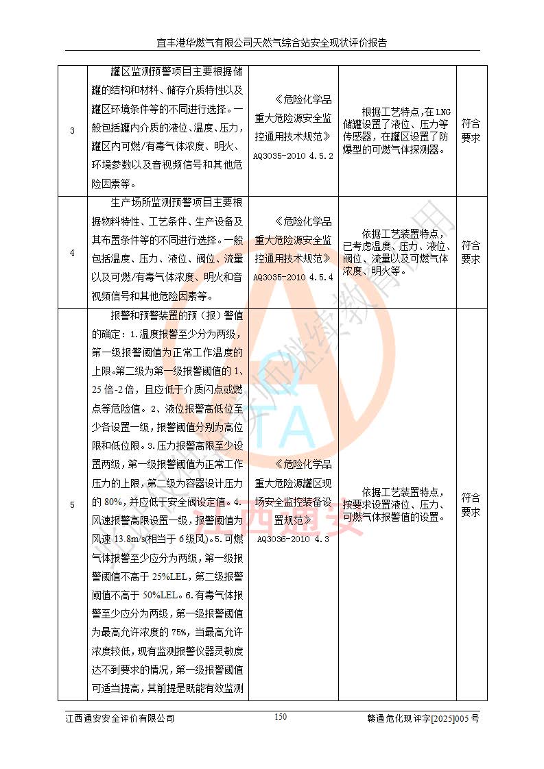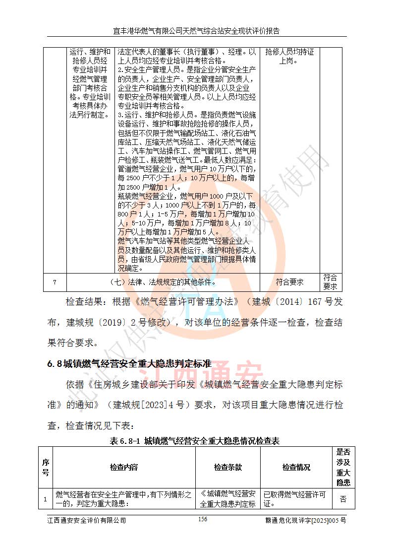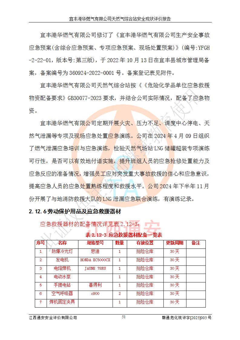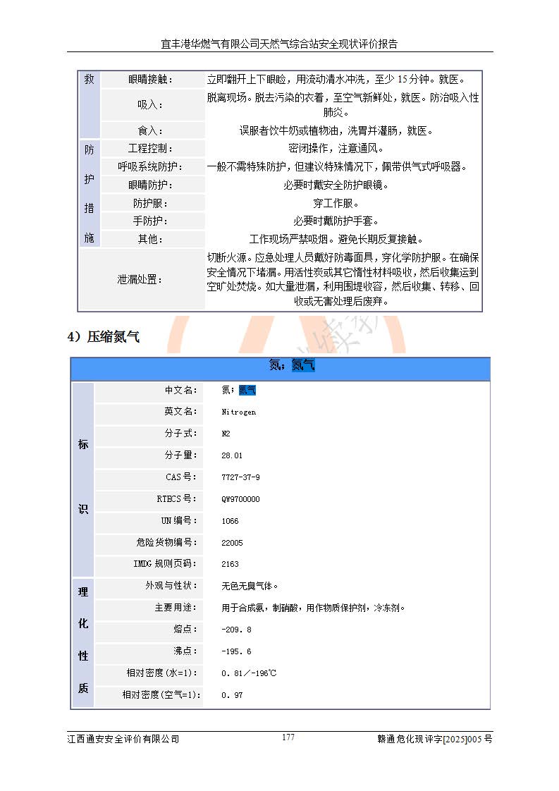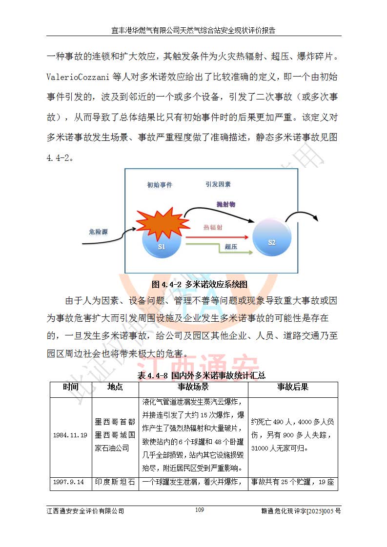 1、主要危險、危害因素辨識結(jié)果 宜豐港華燃氣有限公司天然氣綜合站在生產(chǎn)經(jīng)營過程中存在的主要危險有:火災(zāi)與爆炸、中毒窒息、觸電、機械傷害、物體打擊、**傷害、高處墜落、灼燙、低溫凍傷、容器爆炸、淹溺等,存在的主要危害因素有:化學(xué)因素、物理因素(噪聲、高溫等)等,同時存在人為失誤和管理缺陷。應(yīng)重點防范的主要危險為火災(zāi)與爆炸、容器爆炸。 2、危險化學(xué)品辨識結(jié)果 經(jīng)辨識,該儲配站涉及的天然氣、四氫噻吩及柴油屬于危險化學(xué)品,天然氣屬于重點監(jiān)管的危險化學(xué)品和特別管控危險化學(xué)品,不涉及監(jiān)控化學(xué)品、易制毒化學(xué)品、易制爆危險化學(xué)品、劇毒化學(xué)品和高毒物品等危險化學(xué)品。 3、危險化學(xué)品重大危險源辨識結(jié)果 根據(jù)《危險化學(xué)品重大危險源辨識》(GB18218-2018)和《危險化學(xué)品重大危險源監(jiān)督管理暫行規(guī)定》(2011)(40號令)(2015年 **安監(jiān)總局令第79號修訂)得出結(jié)論如下:該公司LNG儲罐區(qū)構(gòu)成三級重大危險源,其余生產(chǎn)單元及儲存單元不構(gòu)成危險化學(xué)品重大危險源。 4、重點監(jiān)管危險化工工藝辨識結(jié)果 根據(jù)《**安全監(jiān)管總局關(guān)于公布首批重點監(jiān)管的危險化學(xué)品名錄的通知》安監(jiān)總管三[2011]95號、《**安全監(jiān)管總局關(guān)于公布第二批重點監(jiān)管危險化學(xué)品名錄的通知》安監(jiān)總管三[2013]12號進行辨識,該天然氣儲配站不涉及重點監(jiān)管的危險化工工藝。 5、作業(yè)條件危險性分析結(jié)果: 液化天然氣的儲罐區(qū)、調(diào)壓計量氣化加臭區(qū)、卸車區(qū)、變配電、廠內(nèi)運輸、消防水池作業(yè)等單元。等單元危險程度均為“一般危險,需要注意”或“稍有危險,可以接受”級別。作業(yè)條件相對安全。 6、危險度評價結(jié)果:工藝裝置區(qū)等級為Ⅱ級,危險程度為中度危險。LNG儲罐區(qū)等級為Ⅰ級,危險程度為**危險。 7、事故后果預(yù)測結(jié)果:本報告采用中國安全生產(chǎn)科學(xué)研究院研發(fā)的重大危險源區(qū)域定量風(fēng)險評價(CASST-QRA)軟件對可能發(fā)生的危險化學(xué)品事故進行預(yù)測,宜豐港華燃氣有限公司天然氣綜合站LNG儲罐容器整體破裂,發(fā)生BLEVE災(zāi)害模式后果*大,*大死亡半徑為181m,重傷半徑為243m,輕傷半徑為448m。 8、多米諾效應(yīng)分析結(jié)果:該公司LNG儲罐發(fā)生容器整體破裂引發(fā)的BLEVE事故的多米諾半徑*大,為141m。 9、采用安全檢查表評價法對該儲配站周邊環(huán)境、總平面布置、站內(nèi)建構(gòu)筑物防火間距、站內(nèi)交通、LNG卸車、儲罐、氣化裝置、加臭裝置、調(diào)壓裝置、安全附件、工藝設(shè)備、管道、自動化控制等供配電、給排水、消防設(shè)施、供熱裝置、安全管理、“兩重點一重大”安全措施及安全管理進行定性評價,不符合項共2項,其他均符合**法律、法規(guī)、標準、規(guī)范的要求。 (1)企業(yè)對不符合項整改完成后,安全條件符合燃氣儲存經(jīng)營的安全要求。 (2)該儲配站涉及“兩重點一重大”,采取了首批重點監(jiān)管的危險化學(xué)品安全措施和應(yīng)急處置措施,站內(nèi)LNG罐區(qū)構(gòu)成三級重大危險源,采取的重大危險源安全技術(shù)和監(jiān)控措施符合相關(guān)要求。 (3)根據(jù)《燃氣經(jīng)營許可管理辦法》(建城〔2014〕167號發(fā)布,建城規(guī)〔2019〕2號修改)制成安全檢查表對該單位的經(jīng)營條件逐一檢查,檢查結(jié)果符合要求。 (4)根據(jù)《住房城鄉(xiāng)建設(shè)部關(guān)于印發(fā)《城鎮(zhèn)燃氣經(jīng)營安全重大隱患判定標準》的通知》(建城規(guī)[2023]4號)要求,對該項目重大隱患情況進行檢查,該站LNG罐完成整改后不涉及重大隱患。 評價結(jié)論 綜上所述,宜豐港華燃氣有限公司天然氣綜合站選址和總平面布置合理,建構(gòu)筑物間的防火間距、耐火等級等符合標準規(guī)范的要求,LNG卸車、儲存、加臭、氣化調(diào)壓計量等裝置采用成熟的工藝和設(shè)備,本質(zhì)安全程度較高;公司制定了安全管理制度和操作規(guī)程,人員經(jīng)培訓(xùn)合格后上崗,主要負責(zé)人、安全管理人員及特種作業(yè)人員均取得了相應(yīng)的考核合格資格證書,能按照法律法規(guī)要求開展安全生產(chǎn)管理工作。公司對現(xiàn)場存在事故危險的設(shè)施和場所采取了合理可行的防護措施和科學(xué)的管理,使生產(chǎn)過程中的危險有害因素能得到**控制。該項目安全設(shè)施符合**現(xiàn)行有關(guān)法律、法規(guī)、標準的要求。企業(yè)對現(xiàn)場存在的安全問題進行了整改,主要的安全缺陷消除。 綜合結(jié)論:宜豐港華燃氣有限公司天然氣綜合站的安全條件符合燃氣安全運行要求。 |