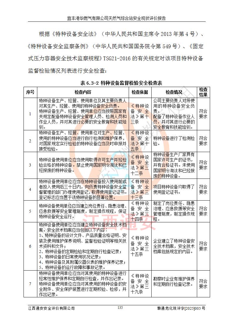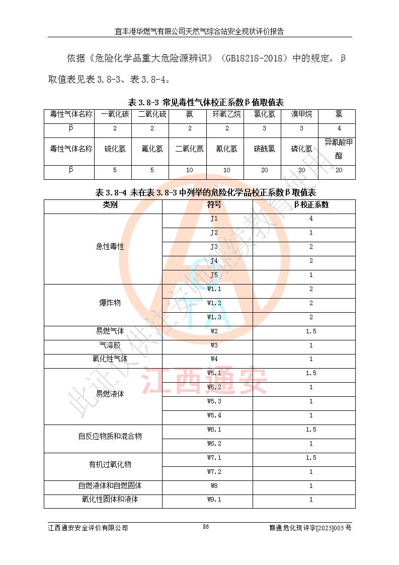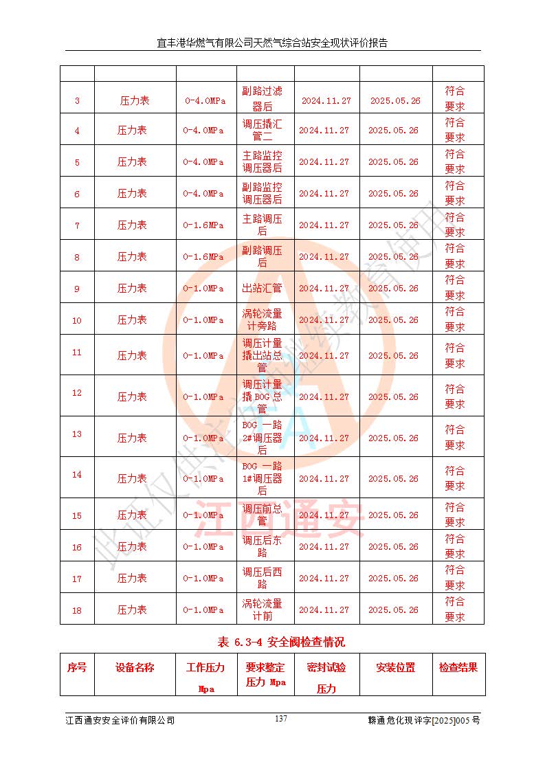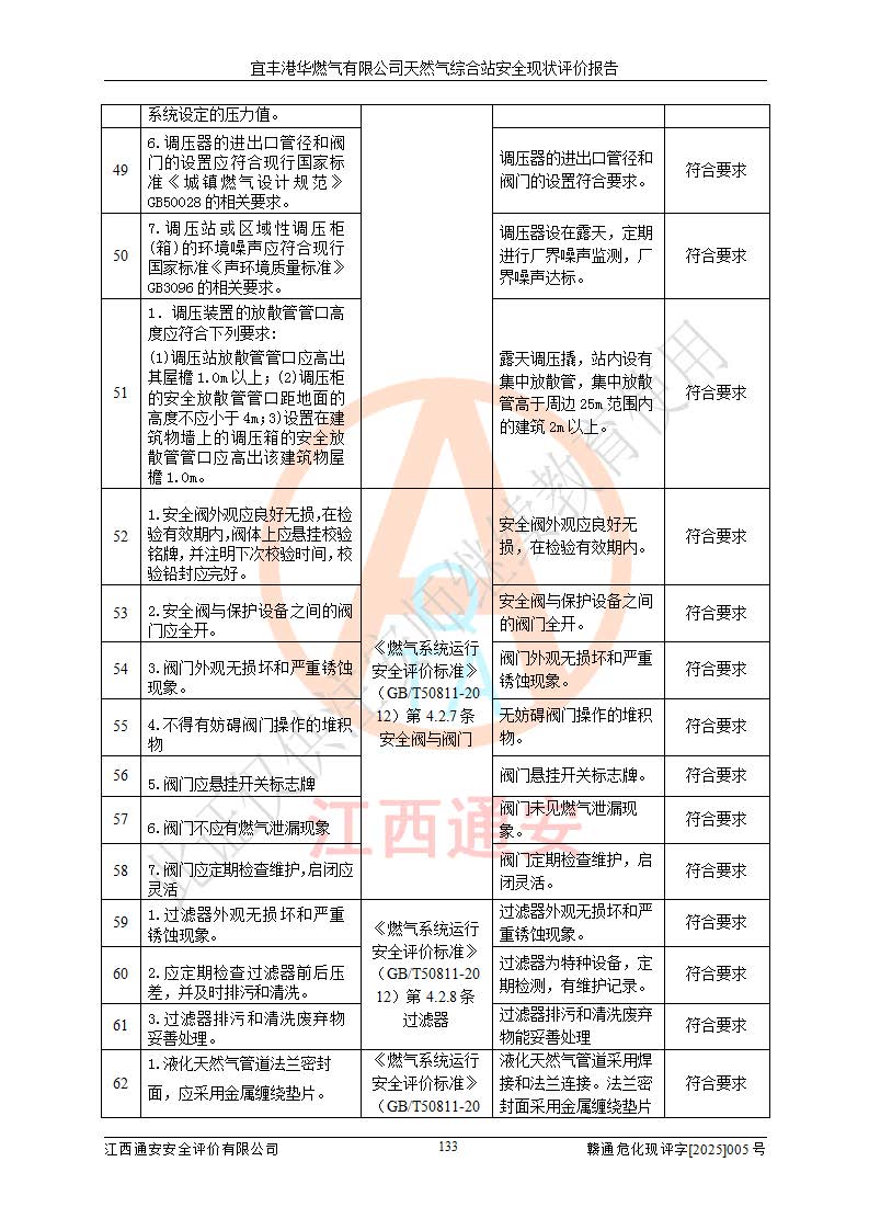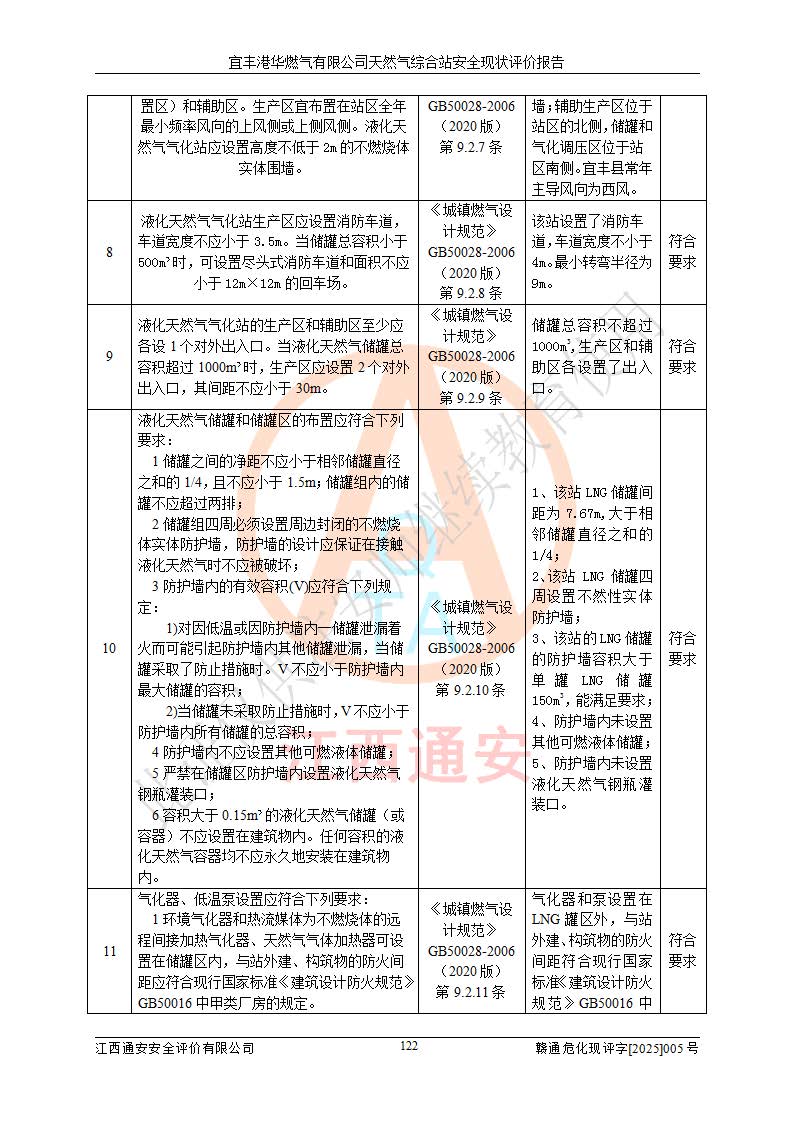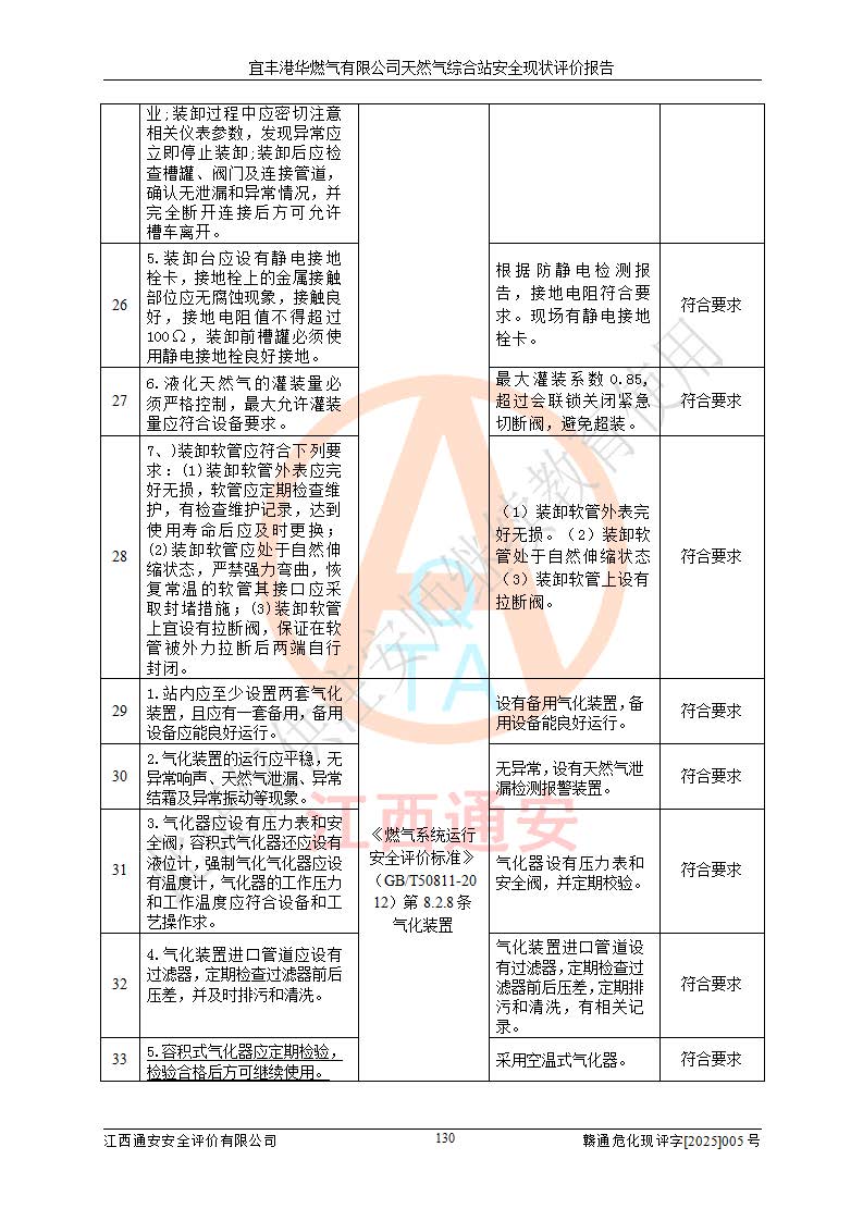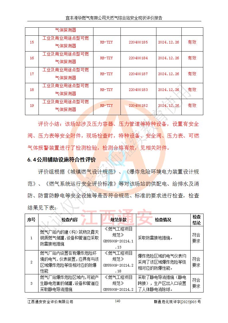 1、主要危險、危害因素辨識結(jié)果 宜豐港華燃氣有限公司天然氣綜合站在生產(chǎn)經(jīng)營過程中存在的主要危險有:火災(zāi)與爆炸、中毒窒息、觸電、機械傷害、物體打擊、**傷害、高處墜落、灼燙、低溫凍傷、容器爆炸、淹溺等,存在的主要危害因素有:化學(xué)因素、物理因素(噪聲、高溫等)等,同時存在人為失誤和管理缺陷。應(yīng)重點防范的主要危險為火災(zāi)與爆炸、容器爆炸。 2、危險化學(xué)品辨識結(jié)果 經(jīng)辨識,該儲配站涉及的天然氣、四氫噻吩及柴油屬于危險化學(xué)品,天然氣屬于重點監(jiān)管的危險化學(xué)品和特別管控危險化學(xué)品,不涉及監(jiān)控化學(xué)品、易制毒化學(xué)品、易制爆危險化學(xué)品、劇毒化學(xué)品和高毒物品等危險化學(xué)品。 3、危險化學(xué)品重大危險源辨識結(jié)果 根據(jù)《危險化學(xué)品重大危險源辨識》(GB18218-2018)和《危險化學(xué)品重大危險源監(jiān)督管理暫行規(guī)定》(2011)(40號令)(2015年 **安監(jiān)總局令第79號修訂)得出結(jié)論如下:該公司LNG儲罐區(qū)構(gòu)成三級重大危險源,其余生產(chǎn)單元及儲存單元不構(gòu)成危險化學(xué)品重大危險源。 4、重點監(jiān)管危險化工工藝辨識結(jié)果 根據(jù)《**安全監(jiān)管總局關(guān)于公布首批重點監(jiān)管的危險化學(xué)品名錄的通知》安監(jiān)總管三[2011]95號、《**安全監(jiān)管總局關(guān)于公布第二批重點監(jiān)管危險化學(xué)品名錄的通知》安監(jiān)總管三[2013]12號進行辨識,該天然氣儲配站不涉及重點監(jiān)管的危險化工工藝。 5、作業(yè)條件危險性分析結(jié)果: 液化天然氣的儲罐區(qū)、調(diào)壓計量氣化加臭區(qū)、卸車區(qū)、變配電、廠內(nèi)運輸、消防水池作業(yè)等單元。等單元危險程度均為“一般危險,需要注意”或“稍有危險,可以接受”級別。作業(yè)條件相對安全。 6、危險度評價結(jié)果:工藝裝置區(qū)等級為Ⅱ級,危險程度為中度危險。LNG儲罐區(qū)等級為Ⅰ級,危險程度為**危險。 7、事故后果預(yù)測結(jié)果:本報告采用中國安全生產(chǎn)科學(xué)研究院研發(fā)的重大危險源區(qū)域定量風(fēng)險評價(CASST-QRA)軟件對可能發(fā)生的危險化學(xué)品事故進行預(yù)測,宜豐港華燃氣有限公司天然氣綜合站LNG儲罐容器整體破裂,發(fā)生BLEVE災(zāi)害模式后果*大,*大死亡半徑為181m,重傷半徑為243m,輕傷半徑為448m。 8、多米諾效應(yīng)分析結(jié)果:該公司LNG儲罐發(fā)生容器整體破裂引發(fā)的BLEVE事故的多米諾半徑*大,為141m。 9、采用安全檢查表評價法對該儲配站周邊環(huán)境、總平面布置、站內(nèi)建構(gòu)筑物防火間距、站內(nèi)交通、LNG卸車、儲罐、氣化裝置、加臭裝置、調(diào)壓裝置、安全附件、工藝設(shè)備、管道、自動化控制等供配電、給排水、消防設(shè)施、供熱裝置、安全管理、“兩重點一重大”安全措施及安全管理進行定性評價,不符合項共2項,其他均符合**法律、法規(guī)、標準、規(guī)范的要求。 (1)企業(yè)對不符合項整改完成后,安全條件符合燃氣儲存經(jīng)營的安全要求。 (2)該儲配站涉及“兩重點一重大”,采取了首批重點監(jiān)管的危險化學(xué)品安全措施和應(yīng)急處置措施,站內(nèi)LNG罐區(qū)構(gòu)成三級重大危險源,采取的重大危險源安全技術(shù)和監(jiān)控措施符合相關(guān)要求。 (3)根據(jù)《燃氣經(jīng)營許可管理辦法》(建城〔2014〕167號發(fā)布,建城規(guī)〔2019〕2號修改)制成安全檢查表對該單位的經(jīng)營條件逐一檢查,檢查結(jié)果符合要求。 (4)根據(jù)《住房城鄉(xiāng)建設(shè)部關(guān)于印發(fā)《城鎮(zhèn)燃氣經(jīng)營安全重大隱患判定標準》的通知》(建城規(guī)[2023]4號)要求,對該項目重大隱患情況進行檢查,該站LNG罐完成整改后不涉及重大隱患。 評價結(jié)論 綜上所述,宜豐港華燃氣有限公司天然氣綜合站選址和總平面布置合理,建構(gòu)筑物間的防火間距、耐火等級等符合標準規(guī)范的要求,LNG卸車、儲存、加臭、氣化調(diào)壓計量等裝置采用成熟的工藝和設(shè)備,本質(zhì)安全程度較高;公司制定了安全管理制度和操作規(guī)程,人員經(jīng)培訓(xùn)合格后上崗,主要負責(zé)人、安全管理人員及特種作業(yè)人員均取得了相應(yīng)的考核合格資格證書,能按照法律法規(guī)要求開展安全生產(chǎn)管理工作。公司對現(xiàn)場存在事故危險的設(shè)施和場所采取了合理可行的防護措施和科學(xué)的管理,使生產(chǎn)過程中的危險有害因素能得到**控制。該項目安全設(shè)施符合**現(xiàn)行有關(guān)法律、法規(guī)、標準的要求。企業(yè)對現(xiàn)場存在的安全問題進行了整改,主要的安全缺陷消除。 綜合結(jié)論:宜豐港華燃氣有限公司天然氣綜合站的安全條件符合燃氣安全運行要求。 |