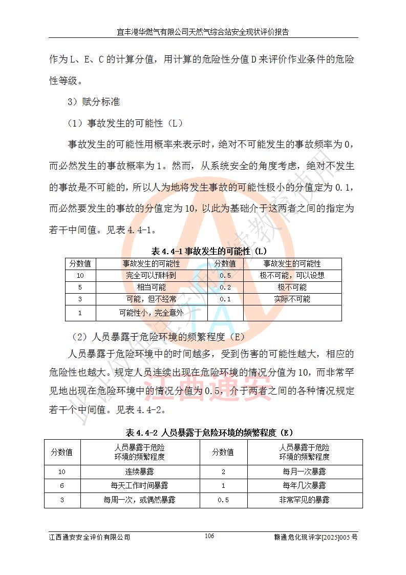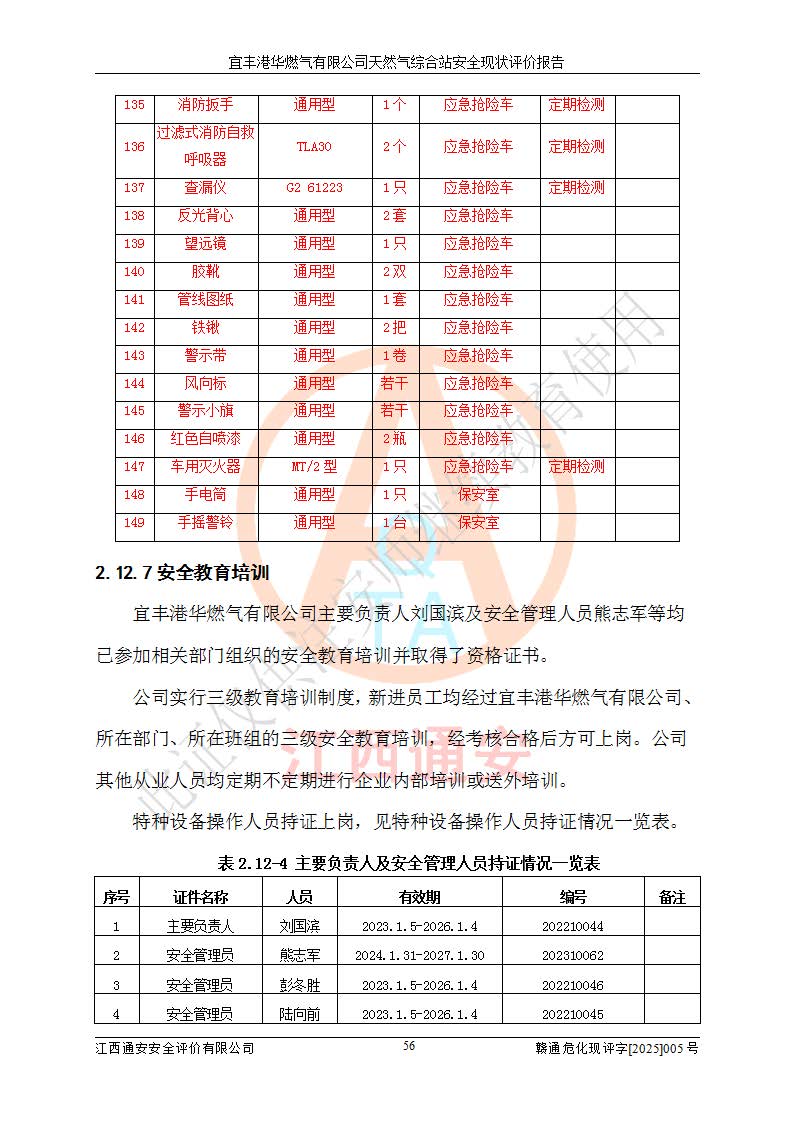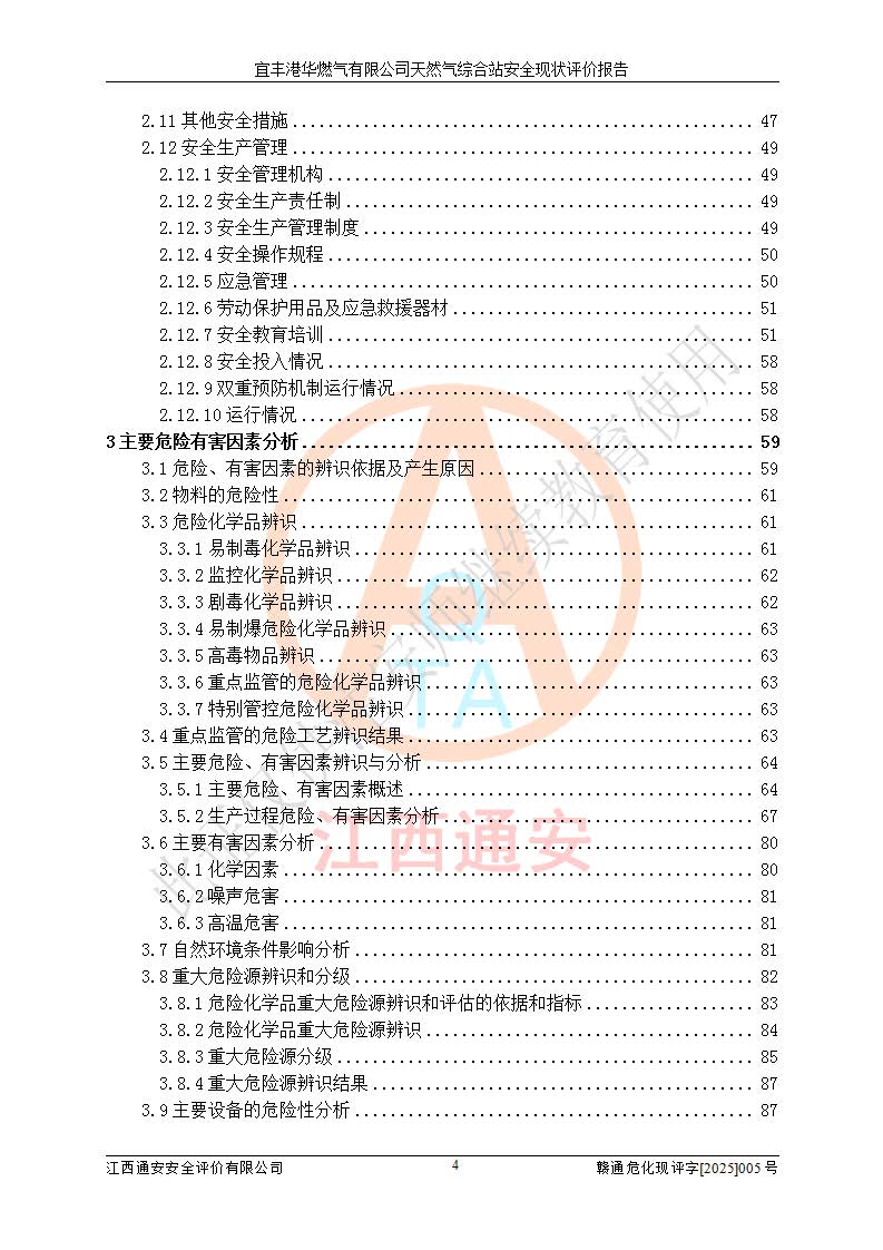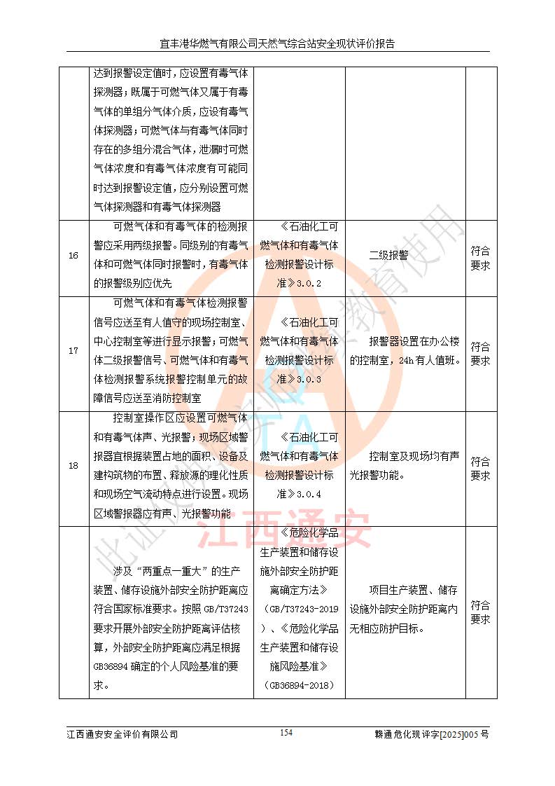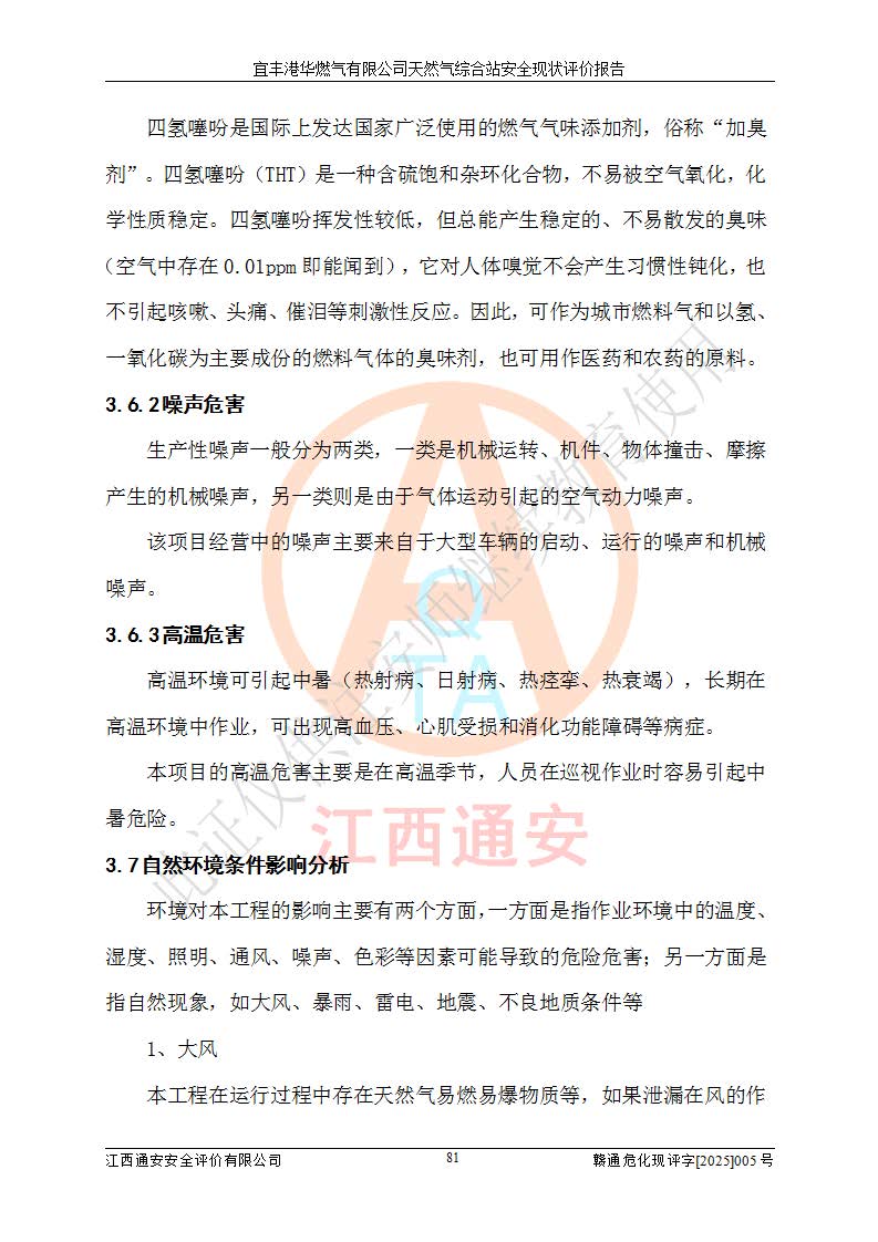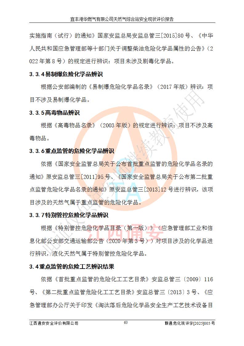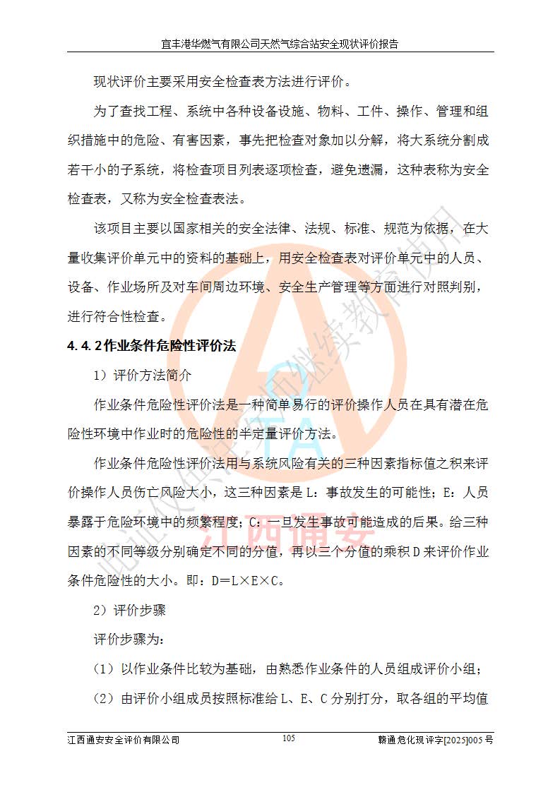 1、主要危險、危害因素辨識結(jié)果 宜豐港華燃氣有限公司天然氣綜合站在生產(chǎn)經(jīng)營過程中存在的主要危險有:火災(zāi)與爆炸、中毒窒息、觸電、機械傷害、物體打擊、**傷害、高處墜落、灼燙、低溫凍傷、容器爆炸、淹溺等,存在的主要危害因素有:化學(xué)因素、物理因素(噪聲、高溫等)等,同時存在人為失誤和管理缺陷。應(yīng)重點防范的主要危險為火災(zāi)與爆炸、容器爆炸。 2、危險化學(xué)品辨識結(jié)果 經(jīng)辨識,該儲配站涉及的天然氣、四氫噻吩及柴油屬于危險化學(xué)品,天然氣屬于重點監(jiān)管的危險化學(xué)品和特別管控危險化學(xué)品,不涉及監(jiān)控化學(xué)品、易制毒化學(xué)品、易制爆危險化學(xué)品、劇毒化學(xué)品和高毒物品等危險化學(xué)品。 3、危險化學(xué)品重大危險源辨識結(jié)果 根據(jù)《危險化學(xué)品重大危險源辨識》(GB18218-2018)和《危險化學(xué)品重大危險源監(jiān)督管理暫行規(guī)定》(2011)(40號令)(2015年 **安監(jiān)總局令第79號修訂)得出結(jié)論如下:該公司LNG儲罐區(qū)構(gòu)成三級重大危險源,其余生產(chǎn)單元及儲存單元不構(gòu)成危險化學(xué)品重大危險源。 4、重點監(jiān)管危險化工工藝辨識結(jié)果 根據(jù)《**安全監(jiān)管總局關(guān)于公布首批重點監(jiān)管的危險化學(xué)品名錄的通知》安監(jiān)總管三[2011]95號、《**安全監(jiān)管總局關(guān)于公布第二批重點監(jiān)管危險化學(xué)品名錄的通知》安監(jiān)總管三[2013]12號進行辨識,該天然氣儲配站不涉及重點監(jiān)管的危險化工工藝。 5、作業(yè)條件危險性分析結(jié)果: 液化天然氣的儲罐區(qū)、調(diào)壓計量氣化加臭區(qū)、卸車區(qū)、變配電、廠內(nèi)運輸、消防水池作業(yè)等單元。等單元危險程度均為“一般危險,需要注意”或“稍有危險,可以接受”級別。作業(yè)條件相對安全。 6、危險度評價結(jié)果:工藝裝置區(qū)等級為Ⅱ級,危險程度為中度危險。LNG儲罐區(qū)等級為Ⅰ級,危險程度為**危險。 7、事故后果預(yù)測結(jié)果:本報告采用中國安全生產(chǎn)科學(xué)研究院研發(fā)的重大危險源區(qū)域定量風(fēng)險評價(CASST-QRA)軟件對可能發(fā)生的危險化學(xué)品事故進行預(yù)測,宜豐港華燃氣有限公司天然氣綜合站LNG儲罐容器整體破裂,發(fā)生BLEVE災(zāi)害模式后果*大,*大死亡半徑為181m,重傷半徑為243m,輕傷半徑為448m。 8、多米諾效應(yīng)分析結(jié)果:該公司LNG儲罐發(fā)生容器整體破裂引發(fā)的BLEVE事故的多米諾半徑*大,為141m。 9、采用安全檢查表評價法對該儲配站周邊環(huán)境、總平面布置、站內(nèi)建構(gòu)筑物防火間距、站內(nèi)交通、LNG卸車、儲罐、氣化裝置、加臭裝置、調(diào)壓裝置、安全附件、工藝設(shè)備、管道、自動化控制等供配電、給排水、消防設(shè)施、供熱裝置、安全管理、“兩重點一重大”安全措施及安全管理進行定性評價,不符合項共2項,其他均符合**法律、法規(guī)、標準、規(guī)范的要求。 (1)企業(yè)對不符合項整改完成后,安全條件符合燃氣儲存經(jīng)營的安全要求。 (2)該儲配站涉及“兩重點一重大”,采取了首批重點監(jiān)管的危險化學(xué)品安全措施和應(yīng)急處置措施,站內(nèi)LNG罐區(qū)構(gòu)成三級重大危險源,采取的重大危險源安全技術(shù)和監(jiān)控措施符合相關(guān)要求。 (3)根據(jù)《燃氣經(jīng)營許可管理辦法》(建城〔2014〕167號發(fā)布,建城規(guī)〔2019〕2號修改)制成安全檢查表對該單位的經(jīng)營條件逐一檢查,檢查結(jié)果符合要求。 (4)根據(jù)《住房城鄉(xiāng)建設(shè)部關(guān)于印發(fā)《城鎮(zhèn)燃氣經(jīng)營安全重大隱患判定標準》的通知》(建城規(guī)[2023]4號)要求,對該項目重大隱患情況進行檢查,該站LNG罐完成整改后不涉及重大隱患。 評價結(jié)論 綜上所述,宜豐港華燃氣有限公司天然氣綜合站選址和總平面布置合理,建構(gòu)筑物間的防火間距、耐火等級等符合標準規(guī)范的要求,LNG卸車、儲存、加臭、氣化調(diào)壓計量等裝置采用成熟的工藝和設(shè)備,本質(zhì)安全程度較高;公司制定了安全管理制度和操作規(guī)程,人員經(jīng)培訓(xùn)合格后上崗,主要負責(zé)人、安全管理人員及特種作業(yè)人員均取得了相應(yīng)的考核合格資格證書,能按照法律法規(guī)要求開展安全生產(chǎn)管理工作。公司對現(xiàn)場存在事故危險的設(shè)施和場所采取了合理可行的防護措施和科學(xué)的管理,使生產(chǎn)過程中的危險有害因素能得到**控制。該項目安全設(shè)施符合**現(xiàn)行有關(guān)法律、法規(guī)、標準的要求。企業(yè)對現(xiàn)場存在的安全問題進行了整改,主要的安全缺陷消除。 綜合結(jié)論:宜豐港華燃氣有限公司天然氣綜合站的安全條件符合燃氣安全運行要求。 |