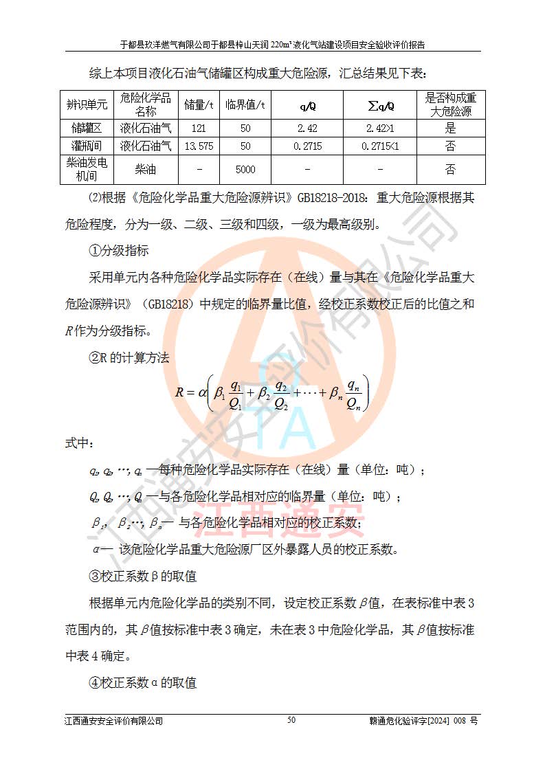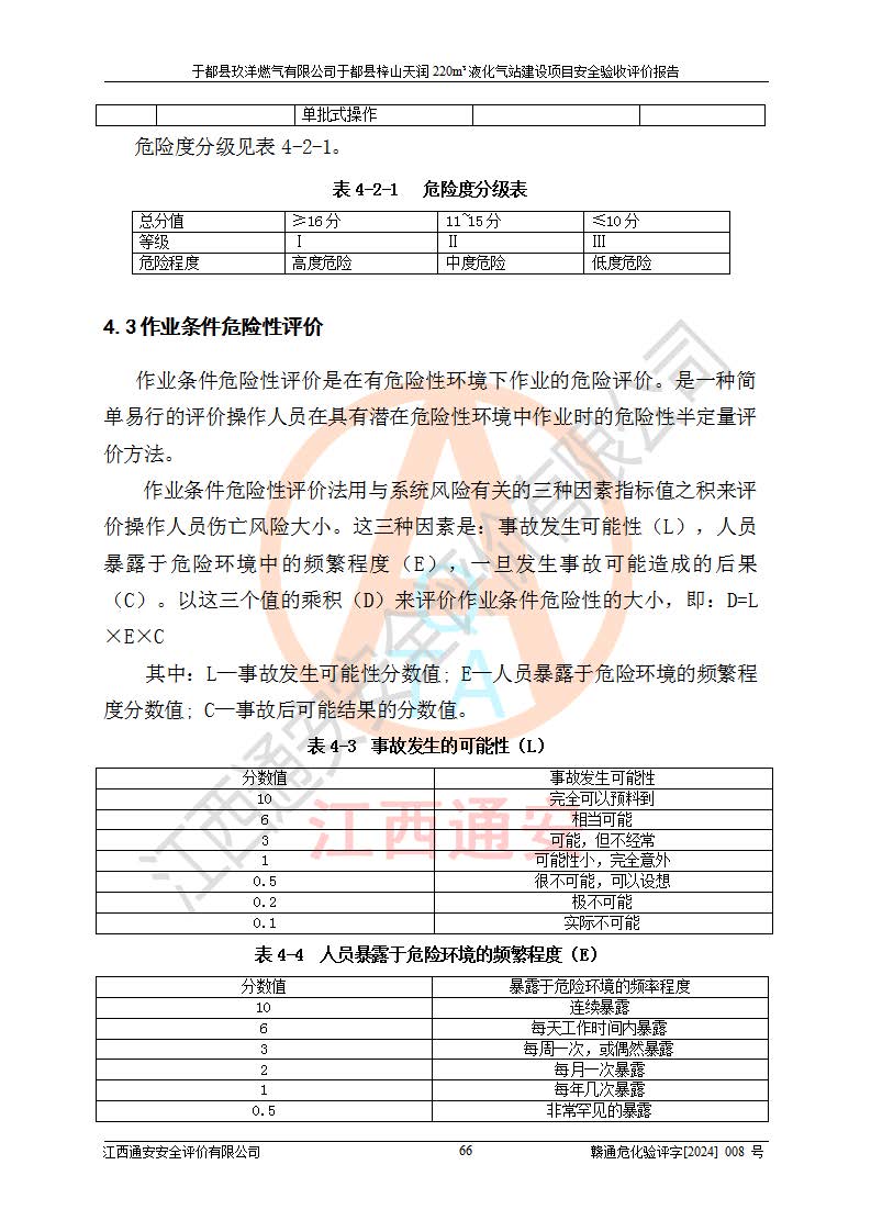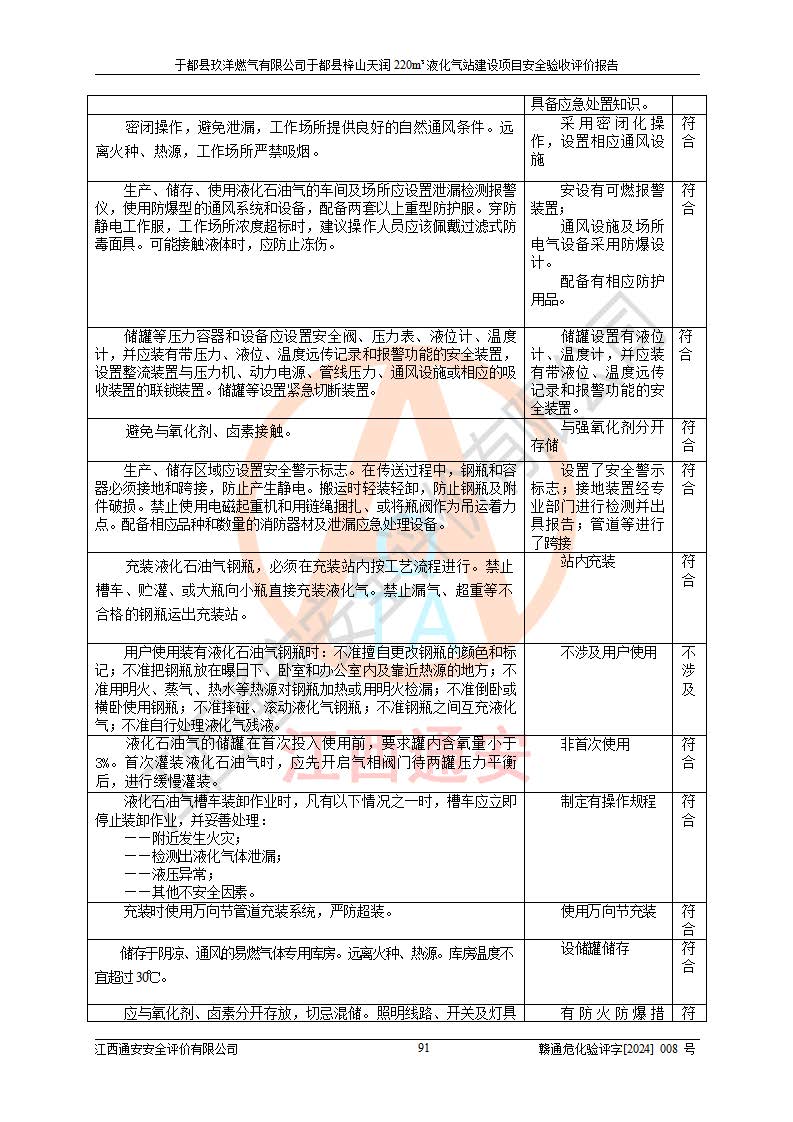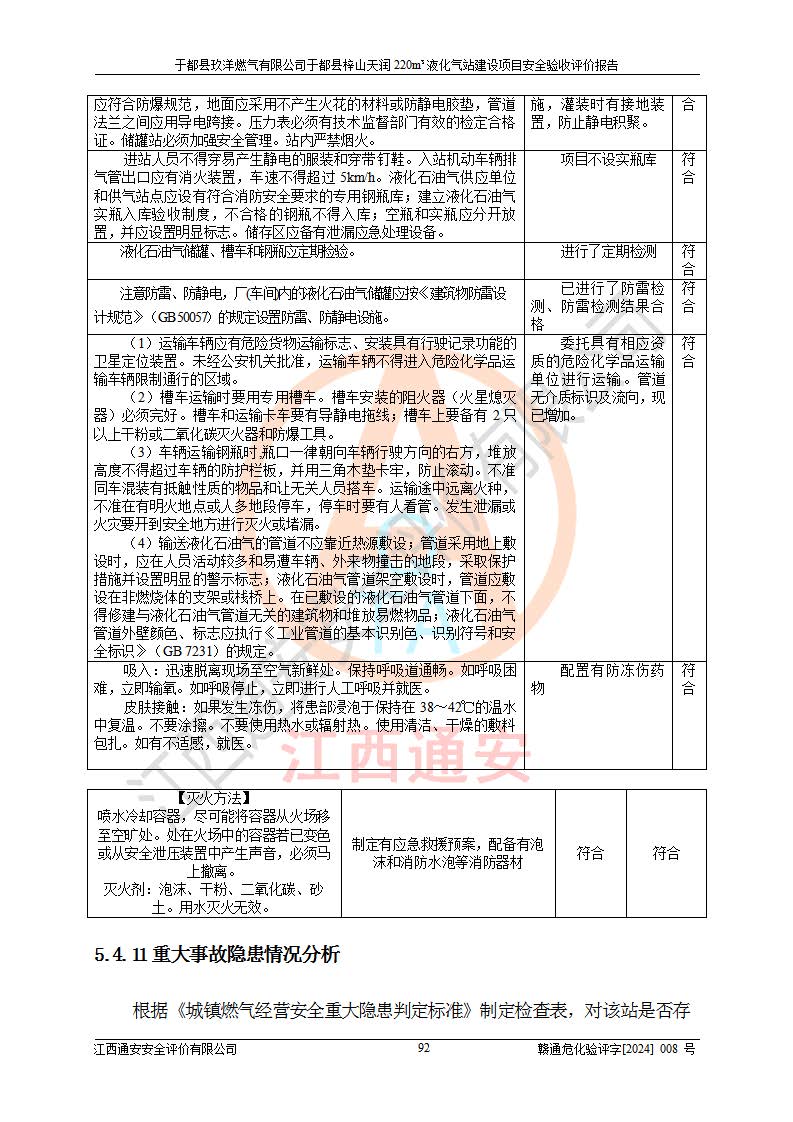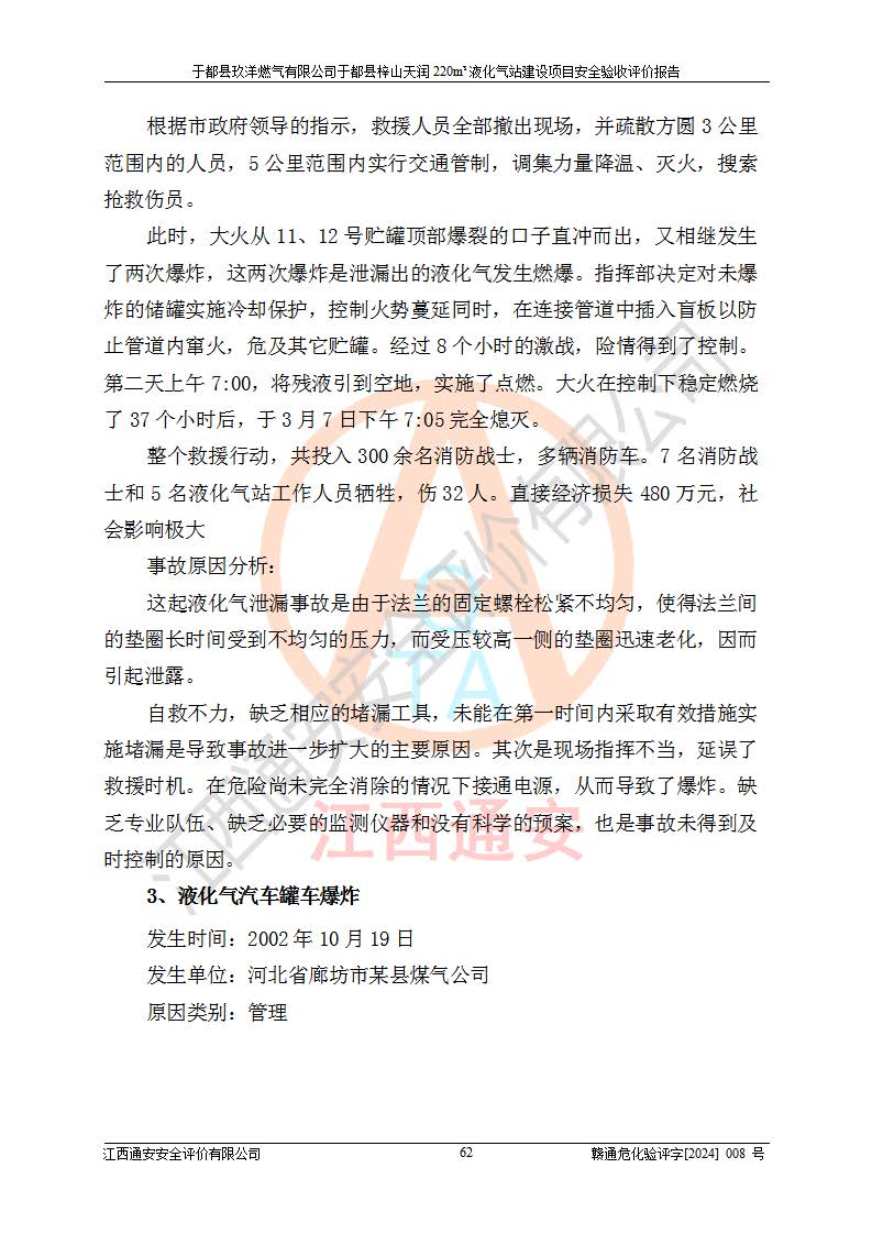 其它 | 根據(jù)**有關(guān)城市燃?xì)夤芾矸煞ㄒ?guī)、規(guī)章、標(biāo)準(zhǔn)、規(guī)范及于都縣玖洋燃?xì)庥邢薰咎峁┑挠嘘P(guān)資料,通過對該液化氣站的現(xiàn)場勘察,對液化氣站的主要危險(xiǎn)危害因素的分析,采用危險(xiǎn)度評價(jià)法、作業(yè)條件危險(xiǎn)性分析法等評價(jià)方法,對該液化氣站進(jìn)行安全驗(yàn)收評價(jià),總結(jié)如下: ⑴于都縣梓山天潤220m3液化氣站周邊100m范圍內(nèi)無公共設(shè)施、學(xué)校、醫(yī)院及文物保護(hù)單位。該液化氣站選址和平面布置經(jīng)實(shí)測對照《液化石油氣供應(yīng)工程設(shè)計(jì)規(guī)范》(GB51142-2015)的要求,符合**和行業(yè)相關(guān)標(biāo)準(zhǔn)。 ⑵該液化氣站的主要危險(xiǎn)、有害因素是火災(zāi)、爆炸,容器爆炸,其次是觸電、機(jī)械傷害、物體打擊、高處墜落、**傷害、凍傷、中毒等。 ⑶該液化氣站儲(chǔ)存的LPG構(gòu)成了重大危險(xiǎn)源。LPG是易燃易爆的甲類氣體。制定的應(yīng)急救援預(yù)案應(yīng)加強(qiáng)演練,不斷完善應(yīng)急救援預(yù)案內(nèi)容。 ⑷危險(xiǎn)度評價(jià)中液化氣儲(chǔ)罐區(qū)為“I”級(jí),屬**危險(xiǎn);作業(yè)條件危險(xiǎn)性評價(jià)中LPG卸料單元為“比較危險(xiǎn),需要注意”、鋼瓶充裝單元為“比較危險(xiǎn),需要注意”;現(xiàn)場檢查表中,有應(yīng)急救援預(yù)案, 有應(yīng)急演練圖片記錄,符合《液化石油氣供應(yīng)工程設(shè)計(jì)規(guī)范》(GB51142-2015)的安全要求。 ⑸該液化氣站對儲(chǔ)罐、管道等設(shè)備等設(shè)施都進(jìn)行了檢驗(yàn)檢測;消防、安全設(shè)施已完善,進(jìn)一步提高了設(shè)備和設(shè)施的完好性、可靠性。 ⑹該液化氣站有比較健全的安全管理制度、安全操作規(guī)程;有關(guān)人員經(jīng)過有關(guān)**主管部門培訓(xùn),設(shè)立了專職安全負(fù)責(zé)人,從組織機(jī)構(gòu)、安全生產(chǎn)管理上**了安全措施的基本落實(shí)。 綜上所述,本評價(jià)認(rèn)為于都縣玖洋燃?xì)庥邢薰居诙伎h梓山天潤220m3液化氣站符合**有關(guān)城市燃?xì)夤芾矸煞ㄒ?guī)、規(guī)章、標(biāo)準(zhǔn)、規(guī)范的安全要求,滿足安全生產(chǎn)的需要。 該公司針對主要危險(xiǎn)、危害因素在設(shè)計(jì)和實(shí)施過程中采取了相應(yīng)的安全設(shè)施和技術(shù)措施,并做到了與主體工程同時(shí)設(shè)計(jì)、同時(shí)建設(shè)、同時(shí)投入使用。項(xiàng)目建立了安全生產(chǎn)管理體系以及各項(xiàng)安全生產(chǎn)管理制度,安全設(shè)施齊備并**,安全生產(chǎn)狀況良好,現(xiàn)場與設(shè)計(jì)圖紙一致,人員配置符合要求,特種作業(yè)人員持證上崗,隱患排查治理及時(shí),未發(fā)生人員傷亡及設(shè)備事故。該項(xiàng)目安全條件符合相關(guān)的安全法律、法規(guī)和標(biāo)準(zhǔn)規(guī)范的要求,滿足安全生產(chǎn)條件,符合安全經(jīng)營要求。 | ||||