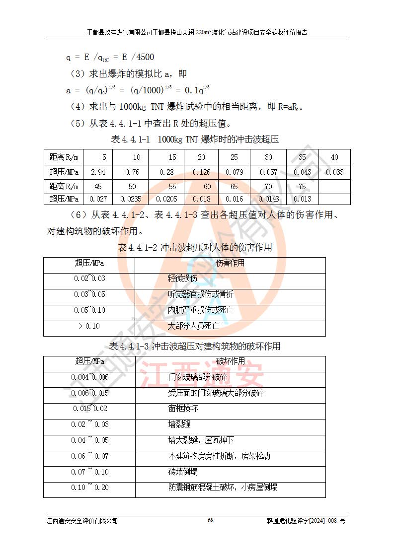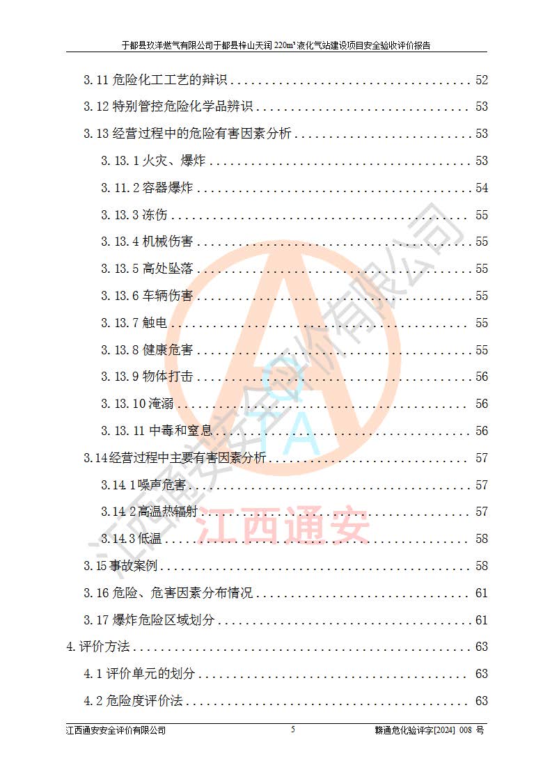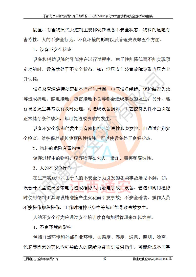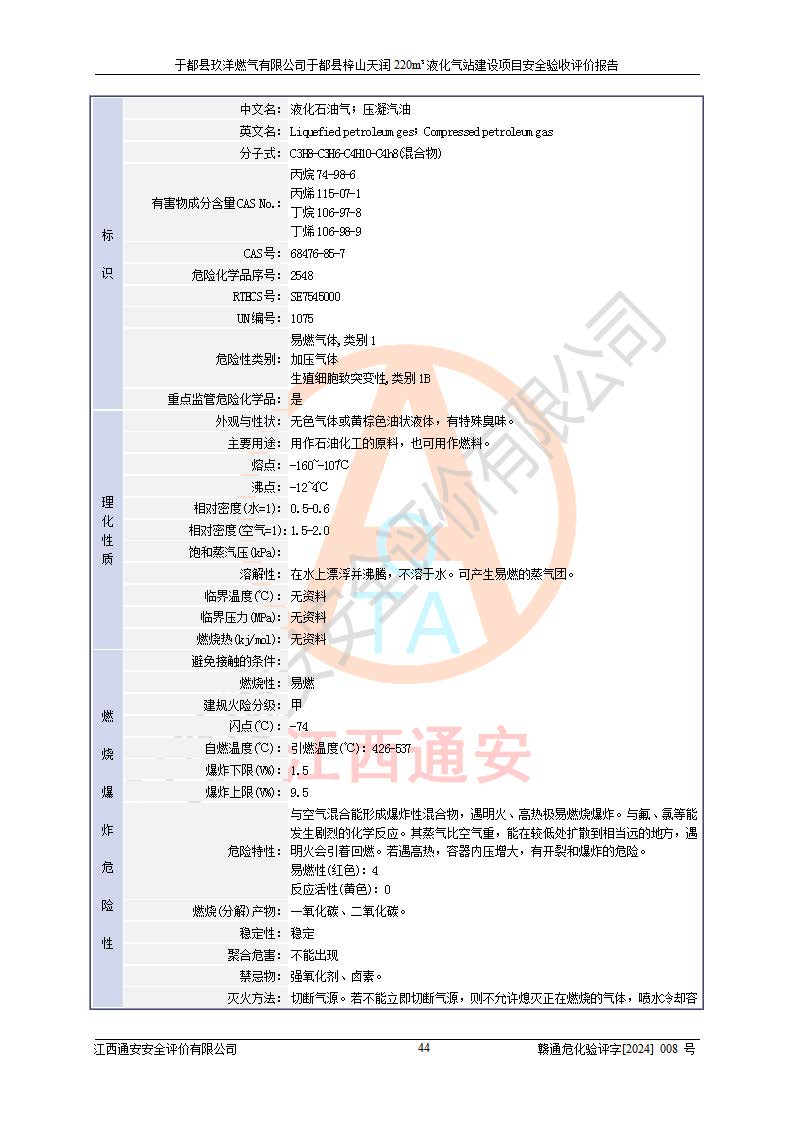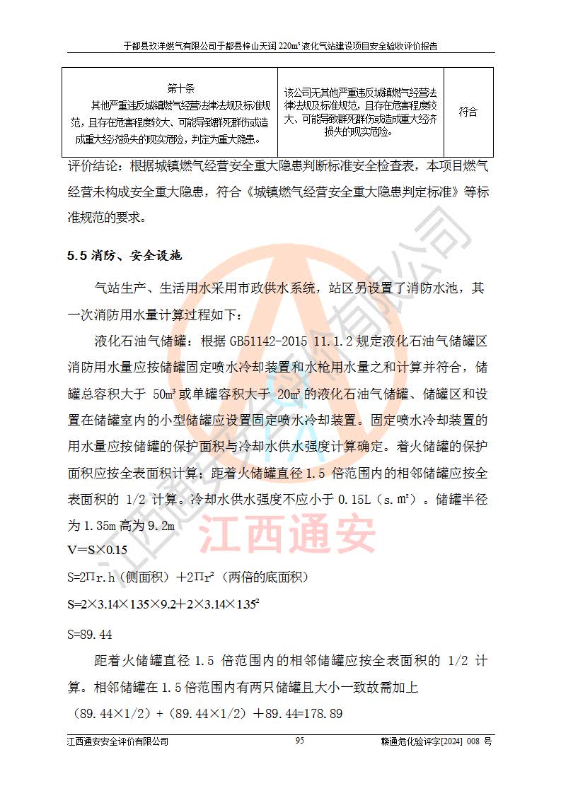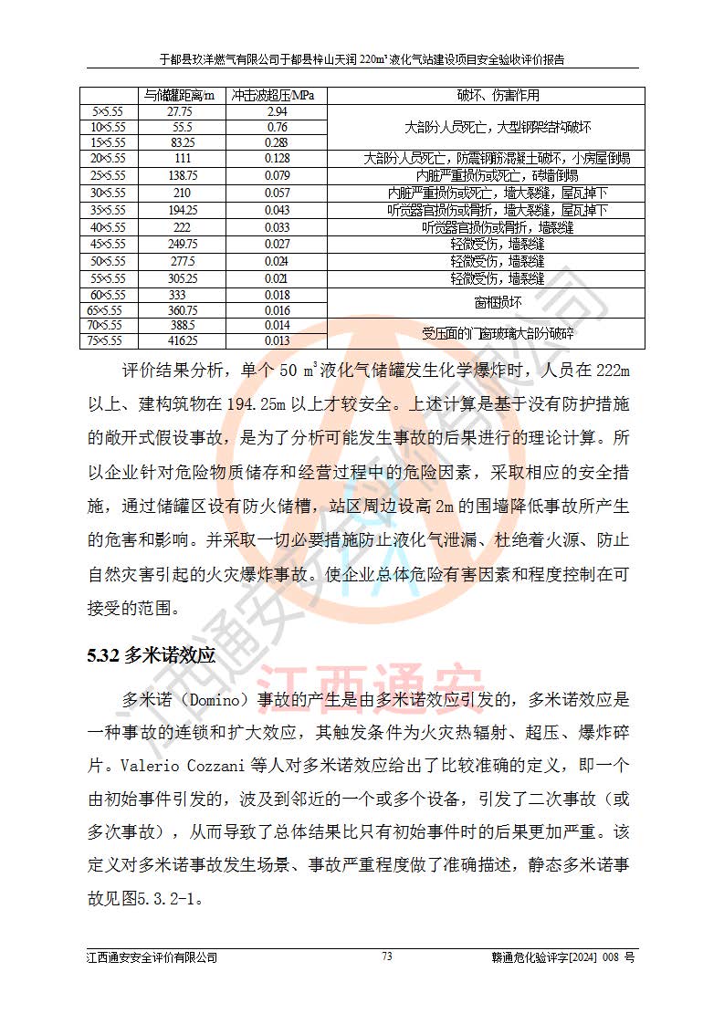 其它 | 根據(jù)**有關(guān)城市燃?xì)夤芾矸煞ㄒ?guī)、規(guī)章、標(biāo)準(zhǔn)、規(guī)范及于都縣玖洋燃?xì)庥邢薰咎峁┑挠嘘P(guān)資料,通過對該液化氣站的現(xiàn)場勘察,對液化氣站的主要危險(xiǎn)危害因素的分析,采用危險(xiǎn)度評價(jià)法、作業(yè)條件危險(xiǎn)性分析法等評價(jià)方法,對該液化氣站進(jìn)行安全驗(yàn)收評價(jià),總結(jié)如下: ⑴于都縣梓山天潤220m3液化氣站周邊100m范圍內(nèi)無公共設(shè)施、學(xué)校、醫(yī)院及文物保護(hù)單位。該液化氣站選址和平面布置經(jīng)實(shí)測對照《液化石油氣供應(yīng)工程設(shè)計(jì)規(guī)范》(GB51142-2015)的要求,符合**和行業(yè)相關(guān)標(biāo)準(zhǔn)。 ⑵該液化氣站的主要危險(xiǎn)、有害因素是火災(zāi)、爆炸,容器爆炸,其次是觸電、機(jī)械傷害、物體打擊、高處墜落、**傷害、凍傷、中毒等。 ⑶該液化氣站儲(chǔ)存的LPG構(gòu)成了重大危險(xiǎn)源。LPG是易燃易爆的甲類氣體。制定的應(yīng)急救援預(yù)案應(yīng)加強(qiáng)演練,不斷完善應(yīng)急救援預(yù)案內(nèi)容。 ⑷危險(xiǎn)度評價(jià)中液化氣儲(chǔ)罐區(qū)為“I”級(jí),屬**危險(xiǎn);作業(yè)條件危險(xiǎn)性評價(jià)中LPG卸料單元為“比較危險(xiǎn),需要注意”、鋼瓶充裝單元為“比較危險(xiǎn),需要注意”;現(xiàn)場檢查表中,有應(yīng)急救援預(yù)案, 有應(yīng)急演練圖片記錄,符合《液化石油氣供應(yīng)工程設(shè)計(jì)規(guī)范》(GB51142-2015)的安全要求。 ⑸該液化氣站對儲(chǔ)罐、管道等設(shè)備等設(shè)施都進(jìn)行了檢驗(yàn)檢測;消防、安全設(shè)施已完善,進(jìn)一步提高了設(shè)備和設(shè)施的完好性、可靠性。 ⑹該液化氣站有比較健全的安全管理制度、安全操作規(guī)程;有關(guān)人員經(jīng)過有關(guān)**主管部門培訓(xùn),設(shè)立了專職安全負(fù)責(zé)人,從組織機(jī)構(gòu)、安全生產(chǎn)管理上**了安全措施的基本落實(shí)。 綜上所述,本評價(jià)認(rèn)為于都縣玖洋燃?xì)庥邢薰居诙伎h梓山天潤220m3液化氣站符合**有關(guān)城市燃?xì)夤芾矸煞ㄒ?guī)、規(guī)章、標(biāo)準(zhǔn)、規(guī)范的安全要求,滿足安全生產(chǎn)的需要。 該公司針對主要危險(xiǎn)、危害因素在設(shè)計(jì)和實(shí)施過程中采取了相應(yīng)的安全設(shè)施和技術(shù)措施,并做到了與主體工程同時(shí)設(shè)計(jì)、同時(shí)建設(shè)、同時(shí)投入使用。項(xiàng)目建立了安全生產(chǎn)管理體系以及各項(xiàng)安全生產(chǎn)管理制度,安全設(shè)施齊備并**,安全生產(chǎn)狀況良好,現(xiàn)場與設(shè)計(jì)圖紙一致,人員配置符合要求,特種作業(yè)人員持證上崗,隱患排查治理及時(shí),未發(fā)生人員傷亡及設(shè)備事故。該項(xiàng)目安全條件符合相關(guān)的安全法律、法規(guī)和標(biāo)準(zhǔn)規(guī)范的要求,滿足安全生產(chǎn)條件,符合安全經(jīng)營要求。 | ||||
