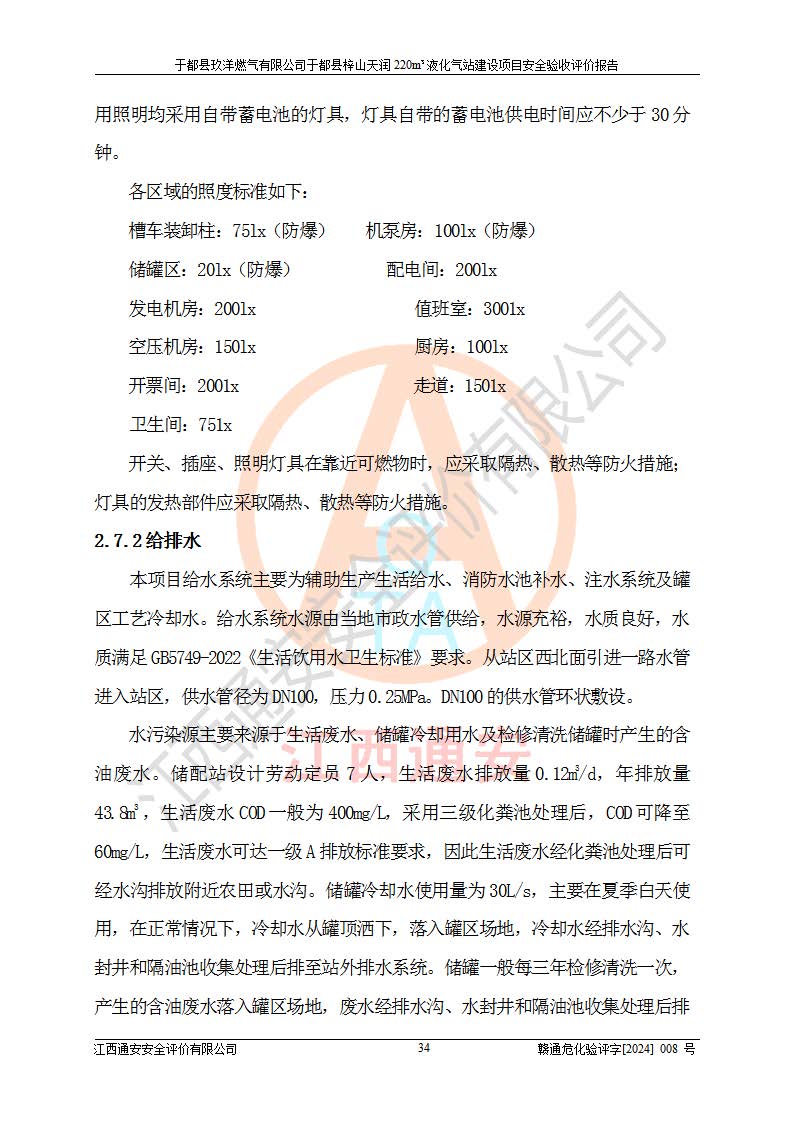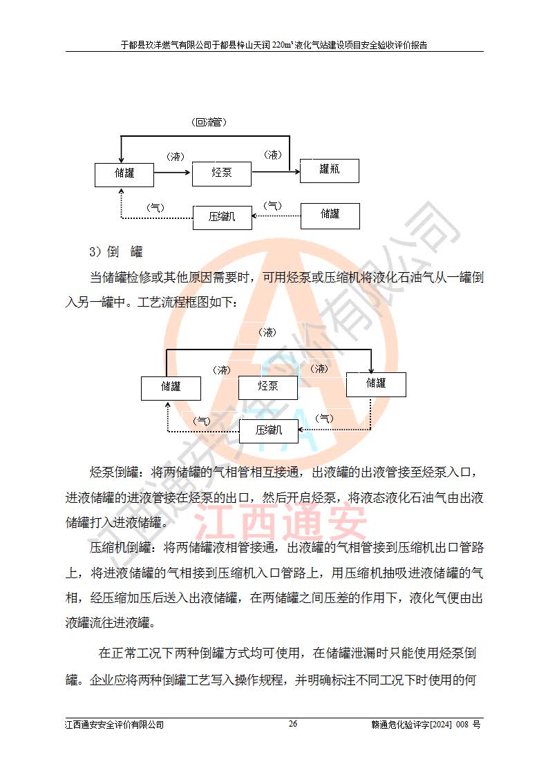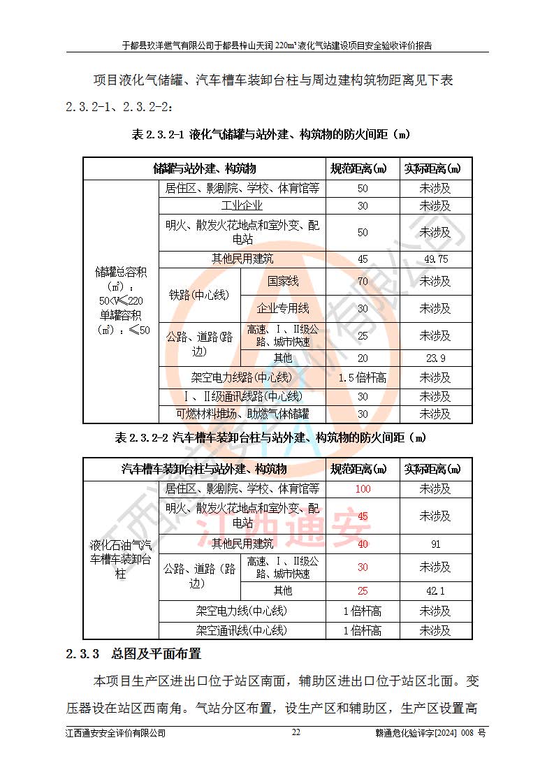 項(xiàng)目簡介 | 于都縣玖洋燃?xì)庥邢薰臼浅闪⒂?/span>2022年03月04日,是從事燃?xì)饨?jīng)營(憑**燃?xì)饨?jīng)營許可證經(jīng)營)、燃?xì)馄骶呒芭浼N售的自然人獨(dú)資的有限責(zé)任公司。于都縣玖洋燃?xì)庥邢薰居诙伎h梓山天潤220m3液化氣站位于江西省贛州市于都縣梓山鎮(zhèn)永豐村王屋組。用地面積為6884.2㎡(項(xiàng)目用地面積紅線面積5737.44㎡,租賃用地面積1148.78㎡,租賃用地只用于輔助工程建設(shè),不用于燃?xì)獾膬?chǔ)存及充裝相關(guān)建(構(gòu))筑物建設(shè))。該站設(shè)有4個(gè)50m3地上液化石油氣儲(chǔ)罐及1個(gè)20m3臥式殘液罐,總?cè)萘?/span>220m3,根據(jù)《液化石油氣供應(yīng)工程設(shè)計(jì)規(guī)范》GB51142-2015表 3.0.12對液化石油氣供應(yīng)站等級(jí)的劃分,該站為六級(jí)液化石油氣供應(yīng)站。主要經(jīng)營的鋼瓶液化氣供應(yīng)于都縣附近居民,月平均日灌瓶量小于700瓶(10t/d)。 于都縣玖洋燃?xì)庥邢薰居诙伎h梓山天潤220m3液化氣站位于江西省贛州市于都縣梓山鎮(zhèn)永豐村王屋組,法人**為藍(lán)建強(qiáng),注冊資本貳**元整,成立時(shí)間2022年03月04日,許可項(xiàng)目:燃?xì)饨?jīng)營,于2022年08月30日已取得贛州市行政審批局出具的《關(guān)于核準(zhǔn)于都縣梓山天潤220m3液化氣站建設(shè)項(xiàng)目的批復(fù)》(項(xiàng)目代碼為:2208-360700-04-01-805994)。項(xiàng)目于2023年7月已委托江西省化學(xué)工業(yè)設(shè)計(jì)院出具的《安全設(shè)施設(shè)計(jì)》,于2023年9月8 日完成土建施工以及設(shè)備安裝,《氣瓶充裝許可證》已與2024年01月16日取得,由江西省市場監(jiān)督管理局發(fā)證。編號(hào)為TS4236291-2028,《燃?xì)饨?jīng)營許可證》待驗(yàn)收達(dá)標(biāo)后方可辦理。 根據(jù)《中華人民共和國安全生產(chǎn)法》(中華人民共和國主席令第13號(hào),第88號(hào)修改[2021修訂])、《城鎮(zhèn)燃?xì)夤芾項(xiàng)l例》(***令第583號(hào))、《江西省城鎮(zhèn)燃?xì)饨?jīng)營許可證管理辦法》( 2003年8月31日江西省人民**令第123號(hào)公布 2014年1月30日江西省人民**令第210號(hào)**次修正 2019年11月27日江西省人民**令第242號(hào)第二次修正)及《建設(shè)項(xiàng)目安全設(shè)施“三同時(shí)”監(jiān)督管理辦法》(**安監(jiān)總局令第36號(hào),77號(hào)令修訂)的要求,新建、改建、遷建、擴(kuò)建的城鎮(zhèn)燃?xì)饨ㄔO(shè)項(xiàng)目應(yīng)當(dāng)進(jìn)行進(jìn)行安全評價(jià)。 受于都縣玖洋燃?xì)庥邢薰镜奈?/span>, 江西通安安全評價(jià)有限公司承擔(dān)于都縣玖洋燃?xì)庥邢薰居诙伎h梓山天潤220m3液化氣站建設(shè)項(xiàng)目的安全驗(yàn)收評價(jià)工作,于2023年11月13日,組成評價(jià)小組到于都縣梓山天潤220m3液化氣站進(jìn)行了現(xiàn)場檢查。本次安全評價(jià),主要針對相關(guān)液化氣儲(chǔ)存、充裝項(xiàng)目進(jìn)行了類比調(diào)研后,依據(jù)**法律法規(guī)、標(biāo)準(zhǔn)規(guī)范及相關(guān)文件進(jìn)行安全驗(yàn)收評價(jià)。依據(jù)《安全評價(jià)通則》(AQ8001-2007)和《安全驗(yàn)收評價(jià)導(dǎo)則》(AQ8003-2007)編制本《安全驗(yàn)收評價(jià)報(bào)告》,并于形成評價(jià)報(bào)告,供建設(shè)單位、**部門參考。 | ||||