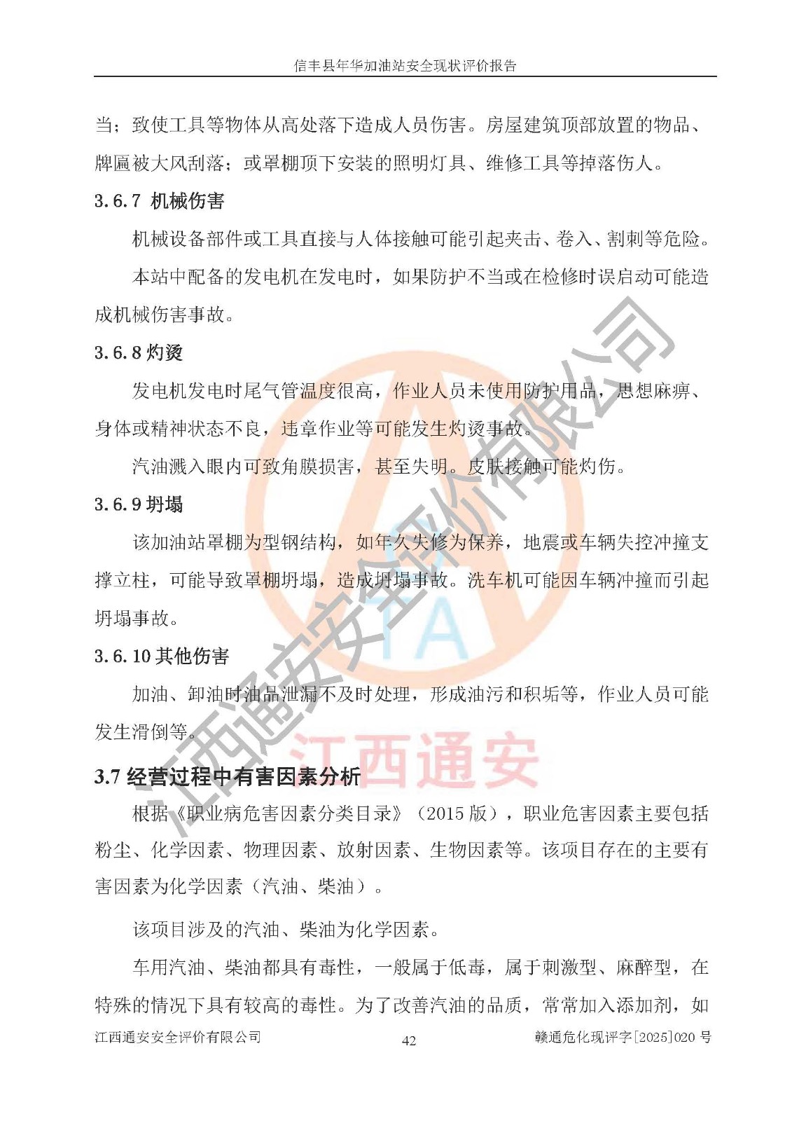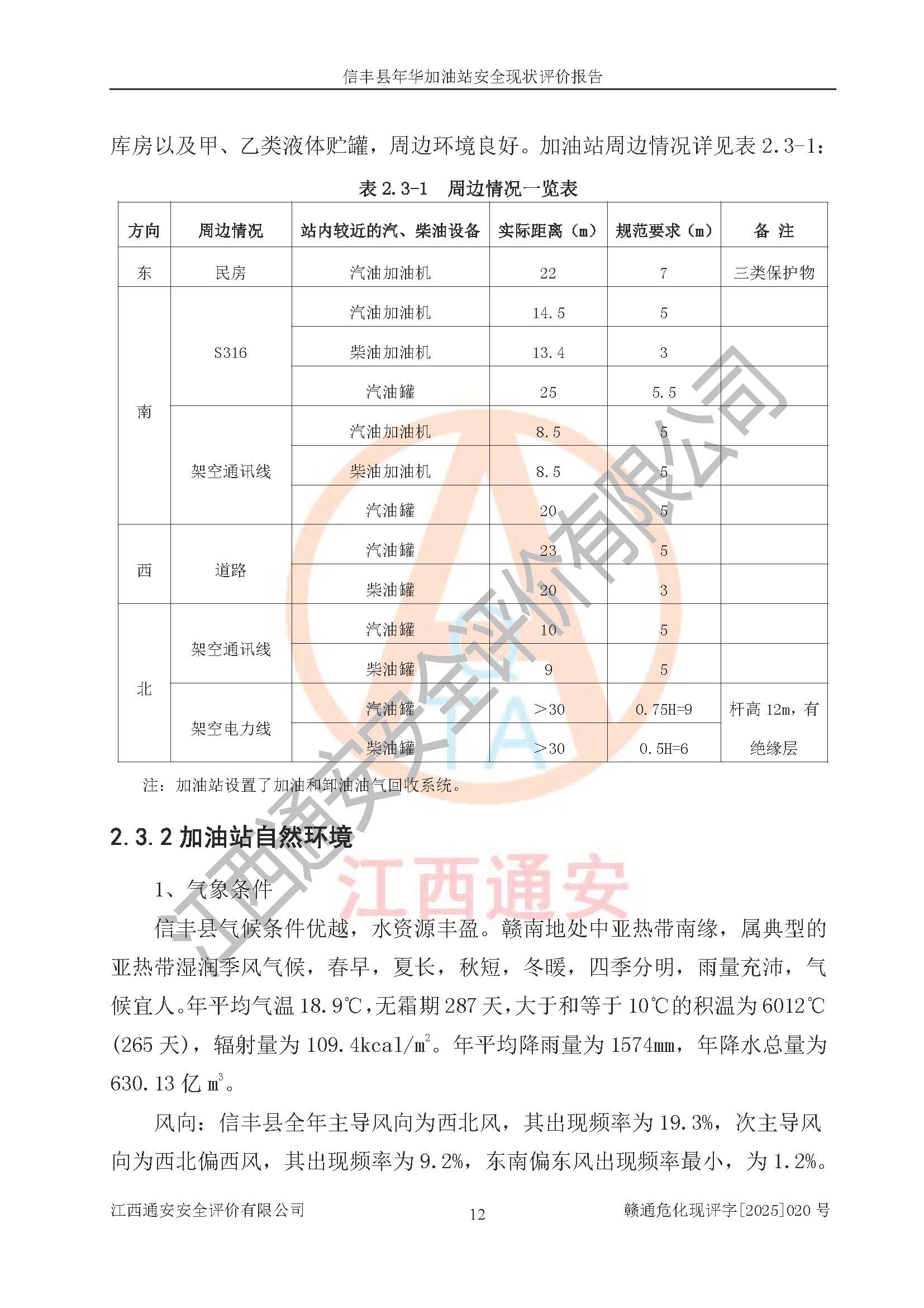 項(xiàng)目簡(jiǎn)介 | 信豐縣年華加油站位于贛州市信豐縣大阿鎮(zhèn)大阿圩,投資人為肖斌,現(xiàn)有員工4人,其中安全管理人員1人。該加油站2022年03月28日取得了危險(xiǎn)化學(xué)品經(jīng)營(yíng)許可證,登記編號(hào)為(贛)信行審危許字[2022]007號(hào),經(jīng)營(yíng)方式為零售,許可范圍為汽油、柴油,**期限為2022年05月15日至2025年05月14日。該加油站2022年04月02日取得了成品油零售經(jīng)營(yíng)批準(zhǔn)證書(shū),編號(hào)為油零售證書(shū)第虔0212號(hào),**期限為2022年03月21日至2027年03月20日。加油站設(shè)有3臺(tái)埋地油罐,分別為1臺(tái)50m30#柴油臥式隔倉(cāng)儲(chǔ)罐(分為20m3和30m3,其中20m3柴油為預(yù)留)、1臺(tái)50m392#汽油臥式油罐和1臺(tái)50m392#/95#汽油臥式油罐(其中20m392#汽油,30m395#汽油),總儲(chǔ)存能力為115m3(柴油折半),為二級(jí)加油站。加油區(qū)設(shè)有2臺(tái)雙槍加油機(jī)和1臺(tái)四槍加油機(jī)。該加油站目前運(yùn)行正常。 | |||